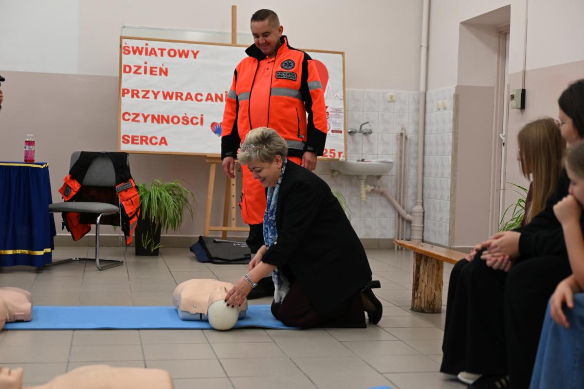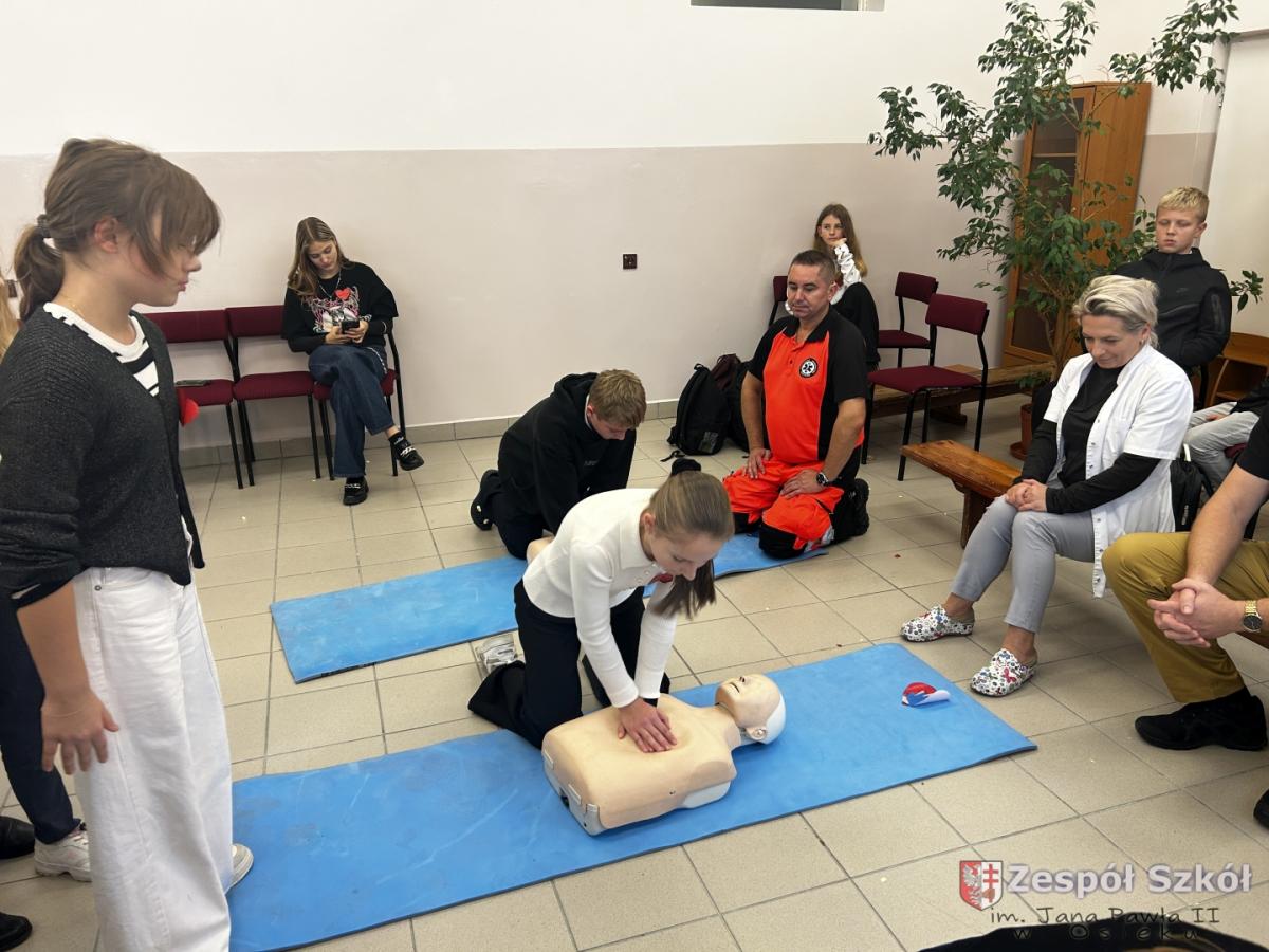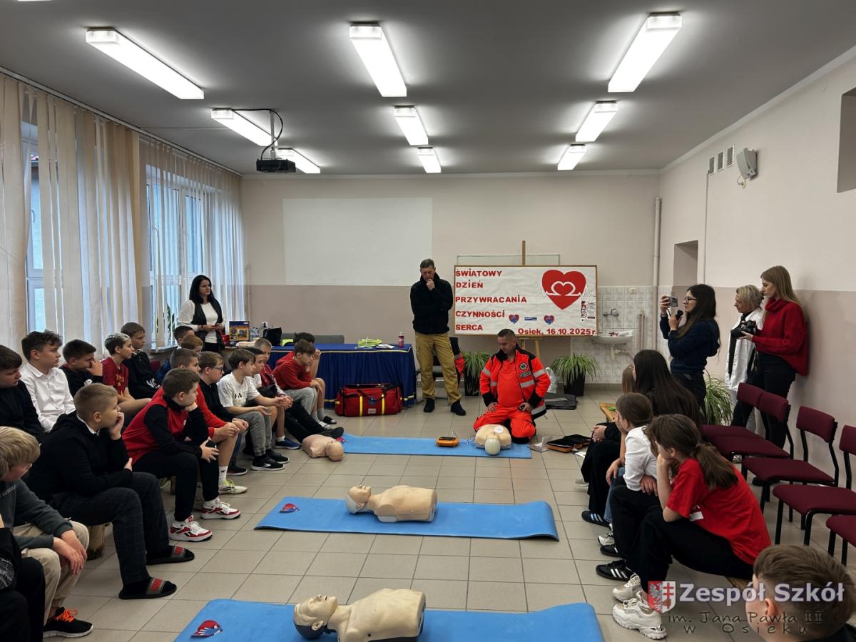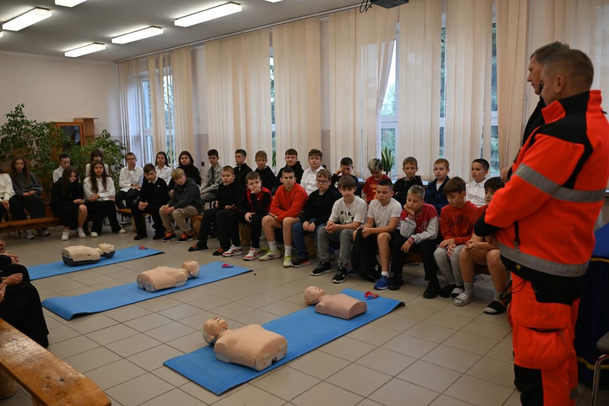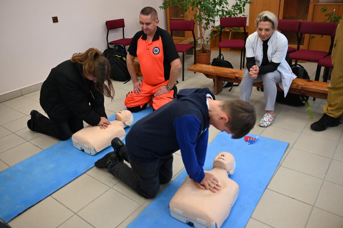 Podczas zajęć uczniowie – zarówno młodsi, jak i starsi – z ogromnym zaangażowaniem ćwiczyli resuscytację krążeniowo-oddechową (RKO) oraz prawidłowe użycie defibrylatora AED. Przypomnieli sobie, jak ważna jest pomoc drugiemu człowiekowi i że od ich reakcji może zależeć czyjeś życie.