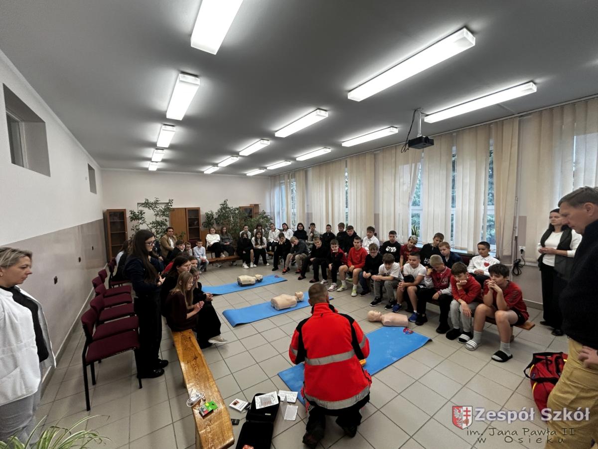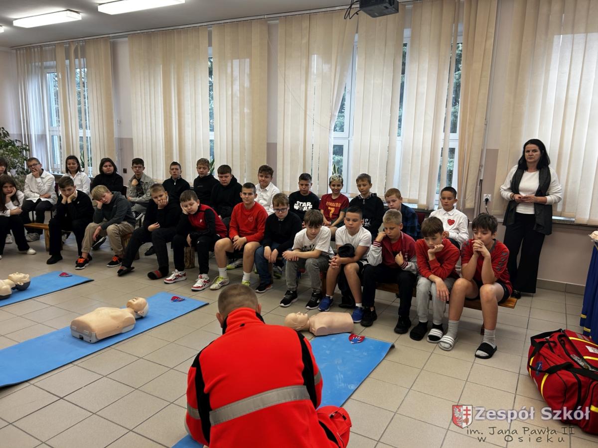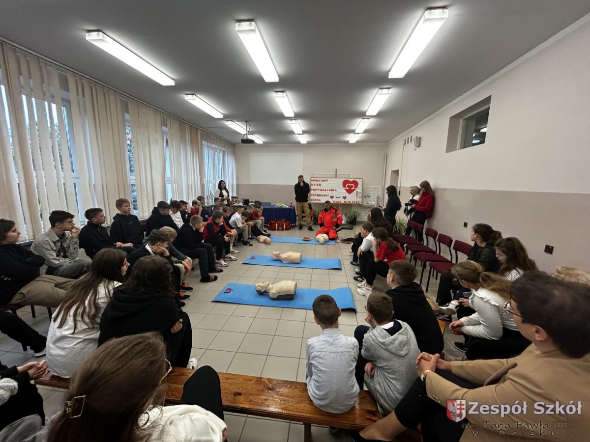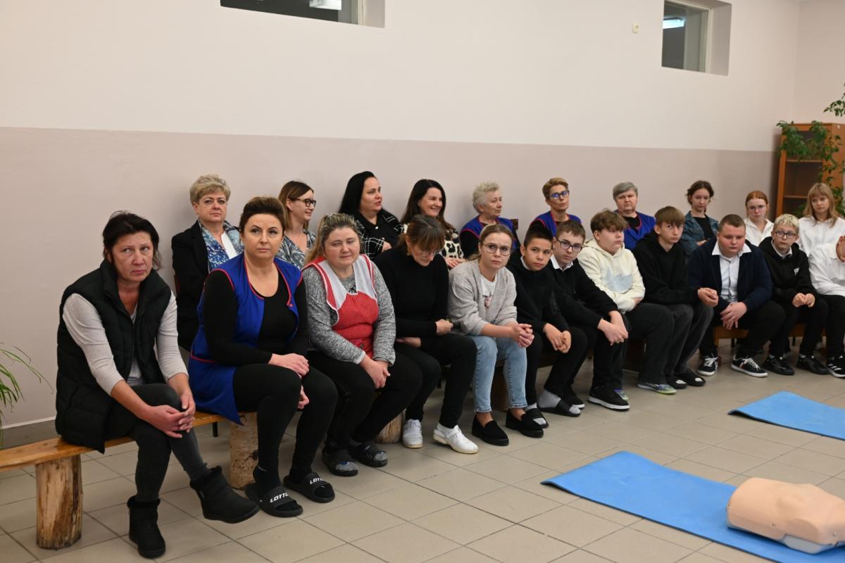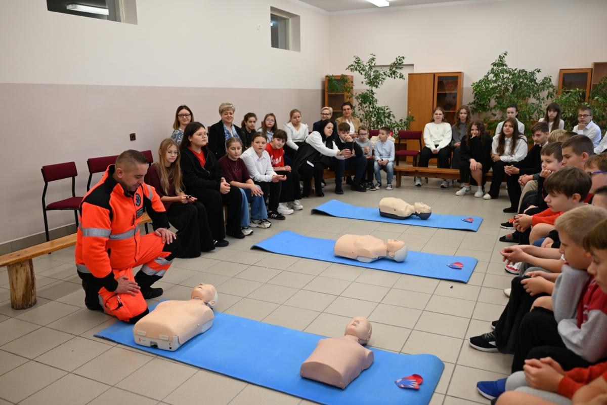 Podczas zajęć uczniowie – zarówno młodsi, jak i starsi – z ogromnym zaangażowaniem ćwiczyli resuscytację krążeniowo-oddechową (RKO) oraz prawidłowe użycie defibrylatora AED. Przypomnieli sobie, jak ważna jest pomoc drugiemu człowiekowi i że od ich reakcji może zależeć czyjeś życie.