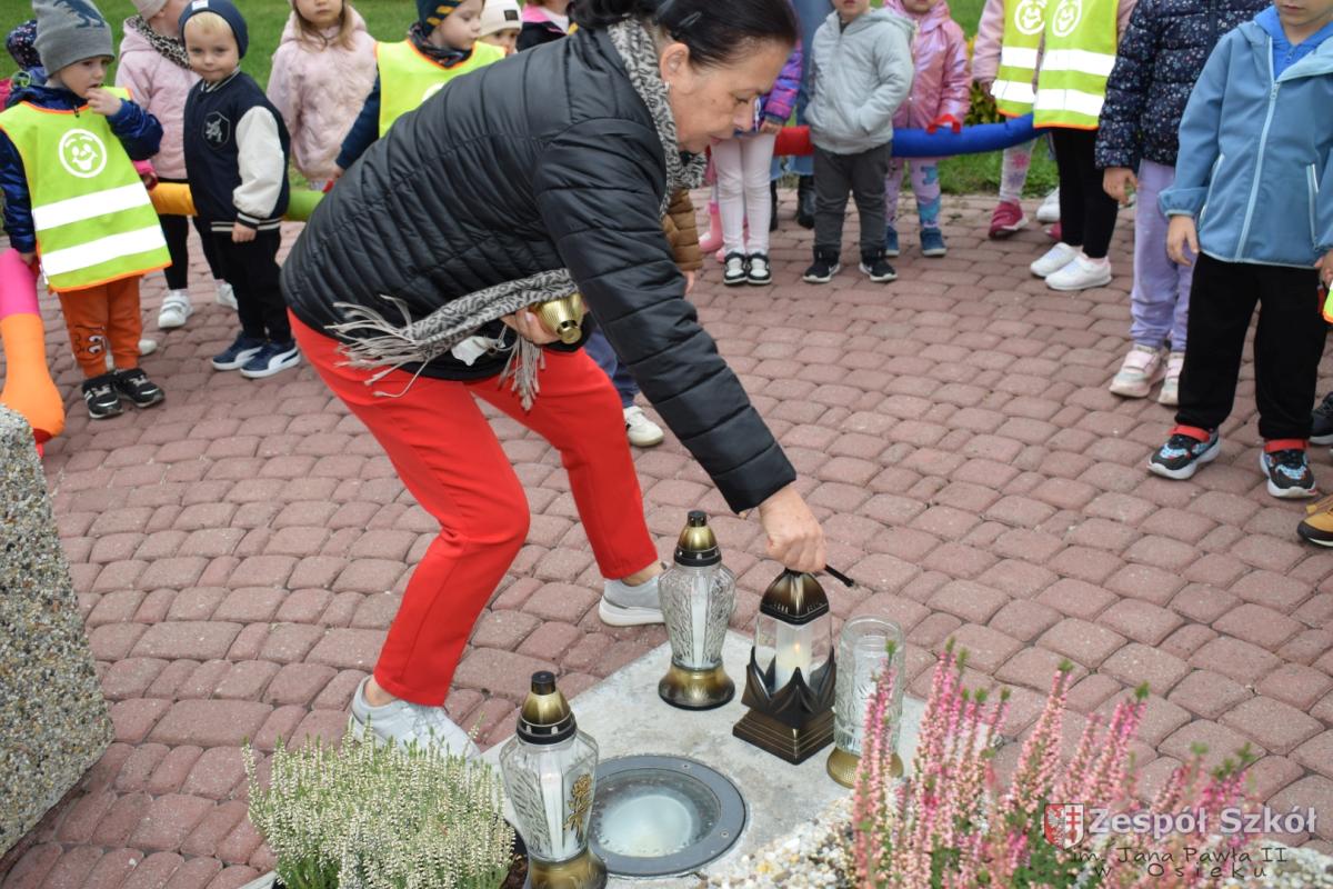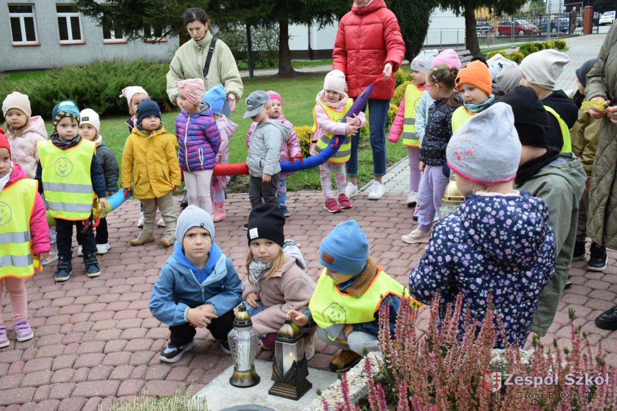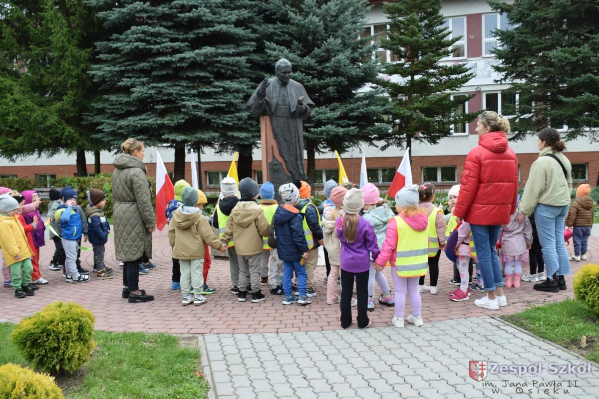 W dniu 16.10.2025 r. dzieci z grup 3,4,5- latków wraz z wychowawczyniami, złożyły znicze pod pomnikiem patrona naszej szkoły – świętego Jana Pawła II.