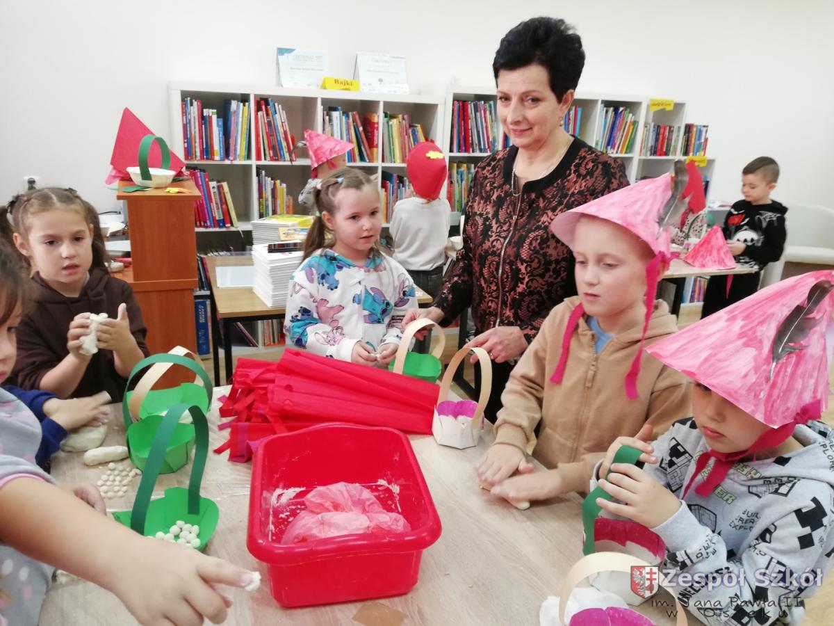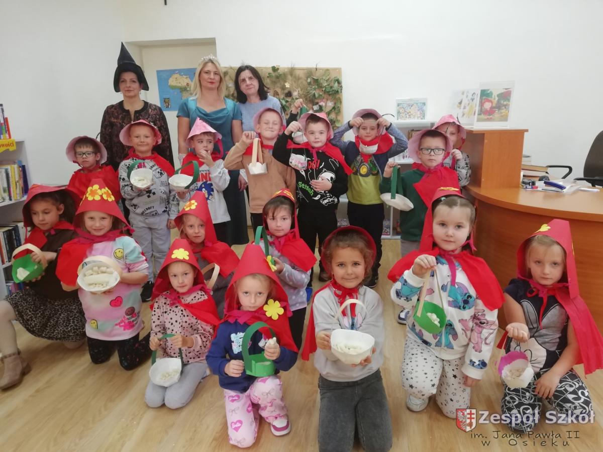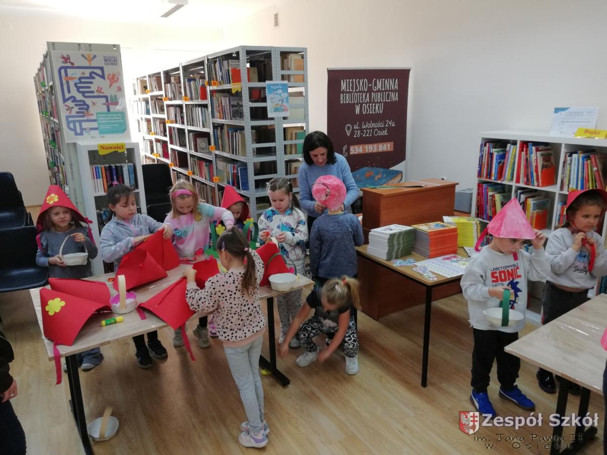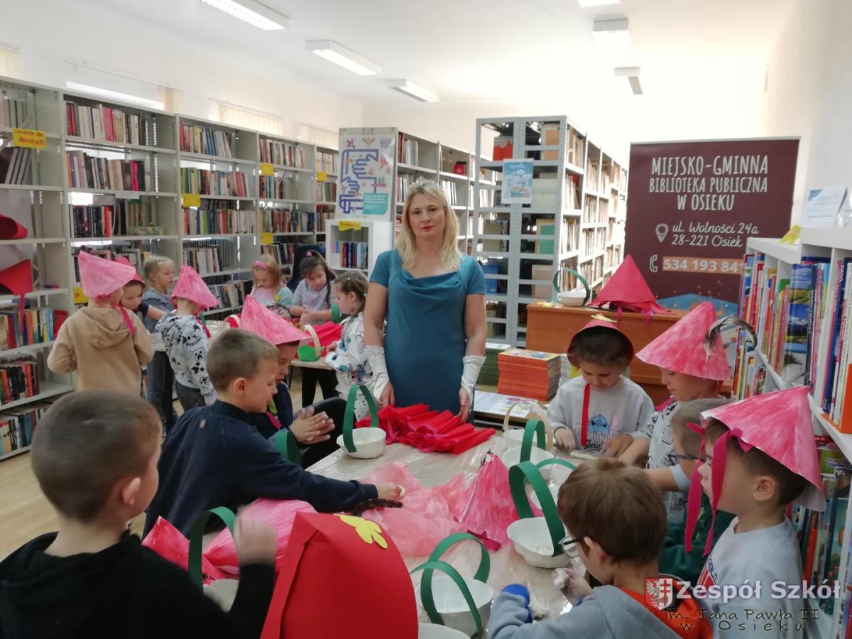 Z okazji Światowego Dnia Postaci z Bajek dzieci z grupy 6-latki z Publicznego Przedszkola w Osieku w dniu 5 listopada odwiedziły Miejsko-Gminną Bibliotekę Publiczną W Osieku. Celem wycieczki było przypomnienie postaci z kultowych bajek jak również zwrócenie uwagi na rolę wychowawczą i edukacyjną bajki: rozróżnianie dobra od zła, kształtowanie prawidłowych zachowań wśród dzieci. Przedszkolaki uczestniczyły w konkursach i quizach, wysłuchały bajki,, Czerwony Kapturek " , a następnie wzięły udział w warsztatach: ozdabiały czapki kwiatkami i piórkami, sklejały przygotowane koszyczki i lepiły z masy solnej elementy do koszyczka.