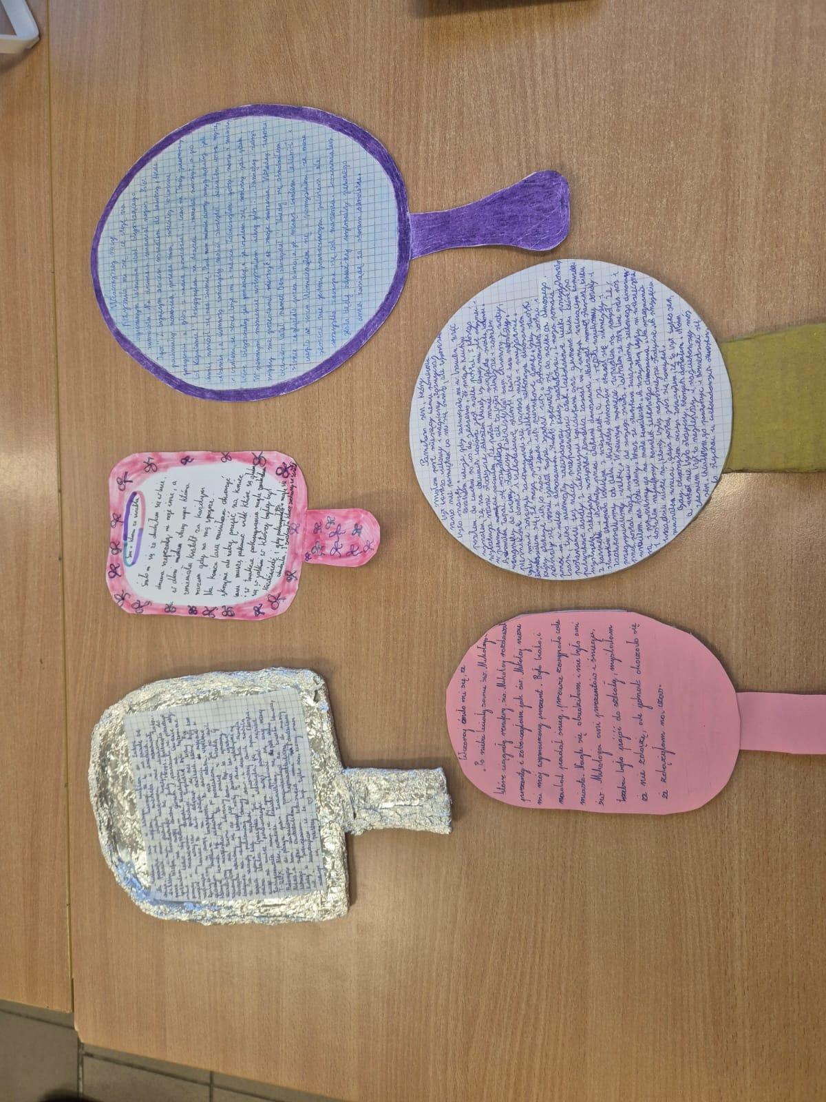 Zadaniem uczniów było przygotowanie lusterka i zapisanie ciekawego snu lub ciekawej historii. Następnie każdy mógł zaprezentować swoje „senne lusterko” na forum klasy. Uczniowie bardzo chętnie prezentowali swoje sny, które były bardzo ciekawe, pełne zaskakujących zwrotów akcji i wartkiej fabuły. Dzięki temu zyskali pewność siebie, otwartość na ewentualną krytykę lub też słowa pochwały, rozwijali tym samym kreatywność i twórcze myślenie.