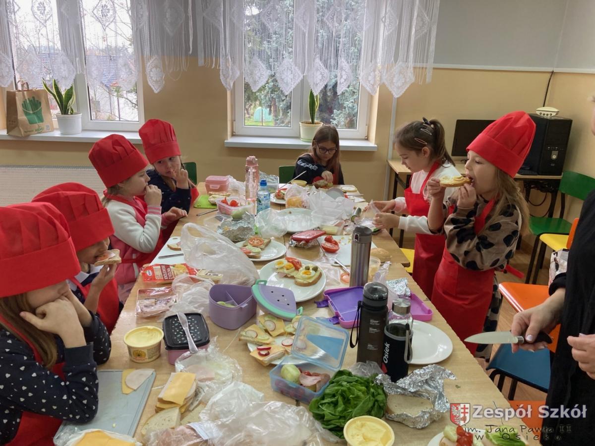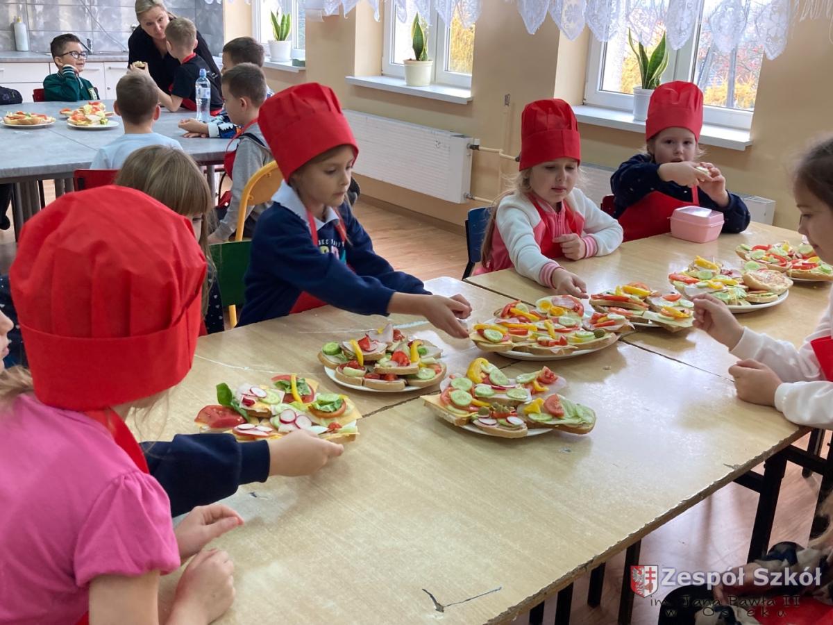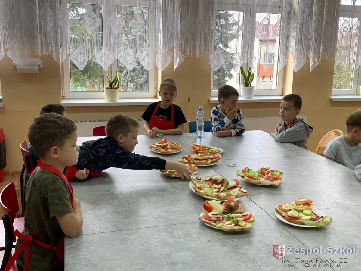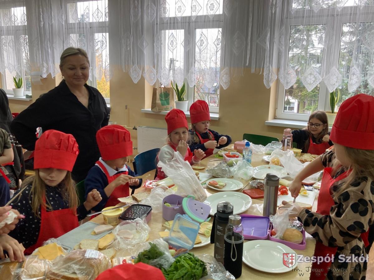 Pod czujnym okiem nauczycieli uczniowie rozmawiali o tym, dlaczego śniadanie jest najważniejszym posiłkiem dnia i jakie produkty warto wybierać, by mieć energię do nauki i zabawy. Następnie, w małych grupach, przygotowywali pyszne i kolorowe kanapki. Nie zabrakło świeżych warzyw, chrupiącego pieczywa, aromatycznego szczypiorku a nawet czosnku. Wspólne gotowanie sprawiło wszystkim mnóstwo radości. Dzieci z dumą prezentowały swoje kulinarne dzieła, a zapach świeżych potraw szybko wypełnił całą pracownię. Na zakończenie wszyscy zasiedli do wspólnego śniadania, które smakowało wyjątkowo – bo przygotowane własnoręcznie!