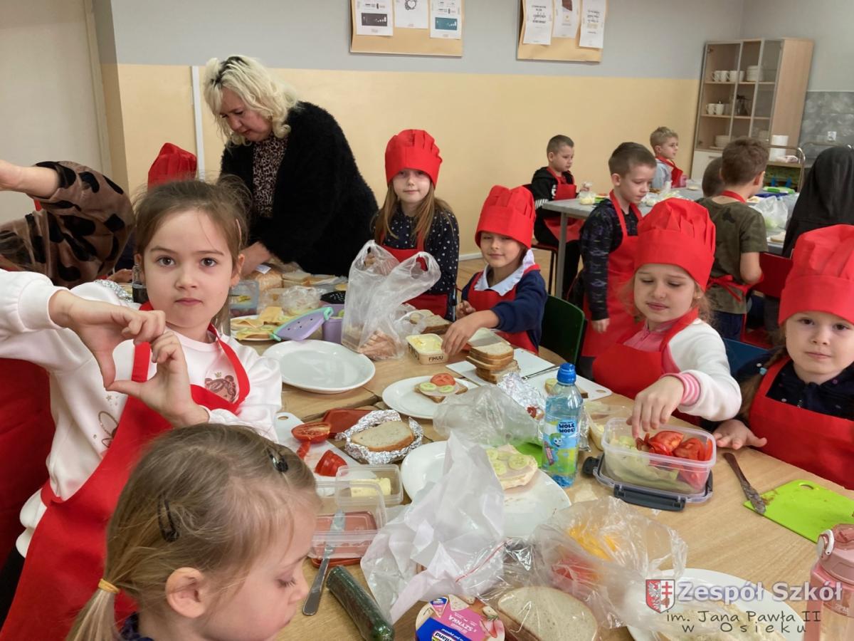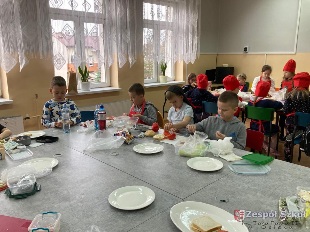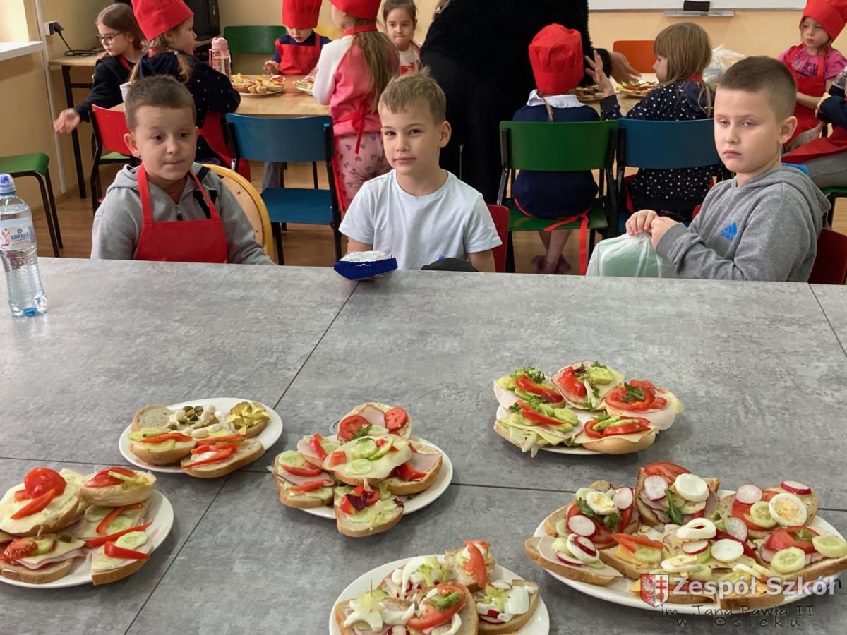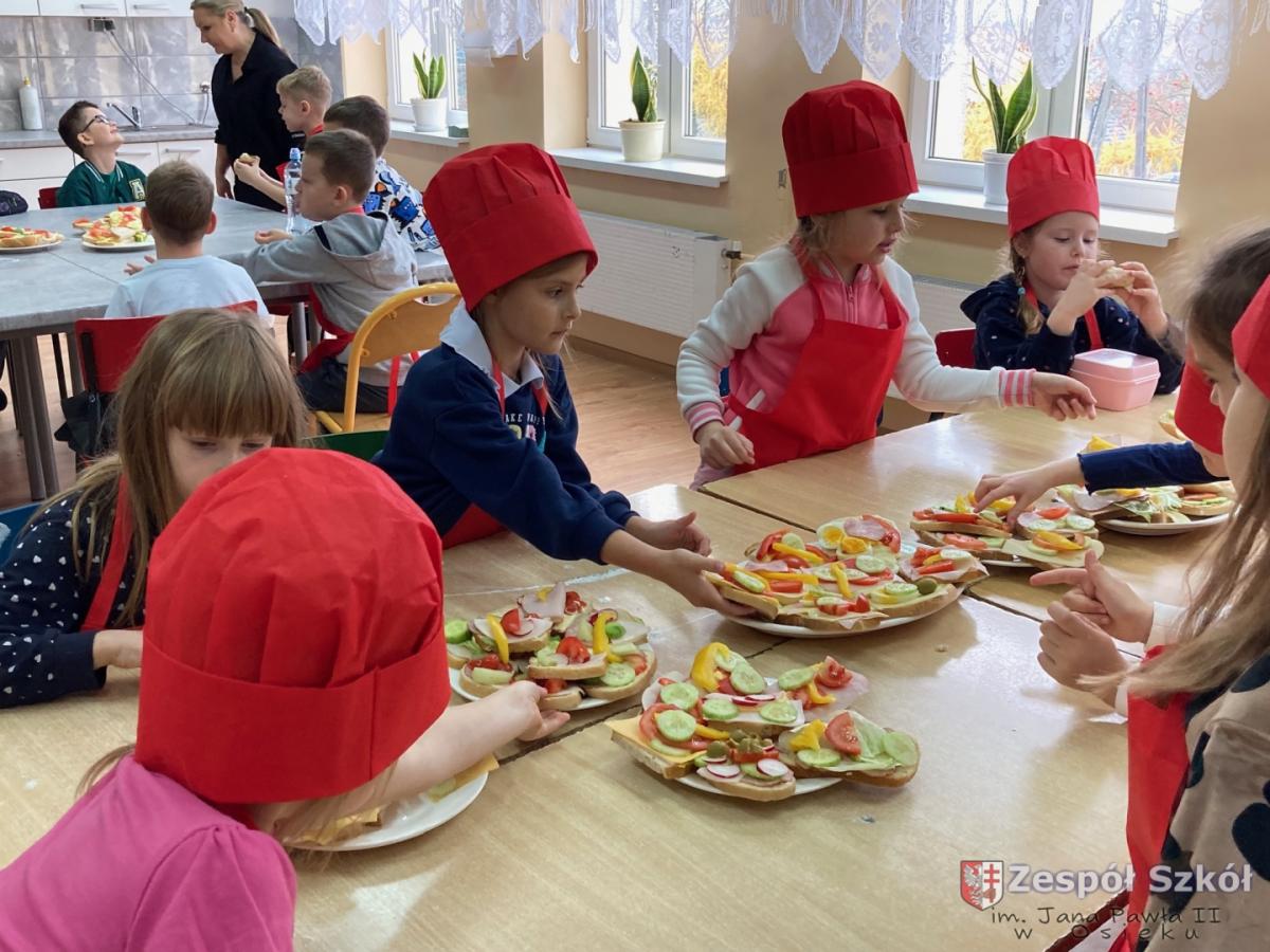 Pod czujnym okiem nauczycieli uczniowie rozmawiali o tym, dlaczego śniadanie jest najważniejszym posiłkiem dnia i jakie produkty warto wybierać, by mieć energię do nauki i zabawy. Następnie, w małych grupach, przygotowywali pyszne i kolorowe kanapki. Nie zabrakło świeżych warzyw, chrupiącego pieczywa, aromatycznego szczypiorku a nawet czosnku. Wspólne gotowanie sprawiło wszystkim mnóstwo radości. Dzieci z dumą prezentowały swoje kulinarne dzieła, a zapach świeżych potraw szybko wypełnił całą pracownię. Na zakończenie wszyscy zasiedli do wspólnego śniadania, które smakowało wyjątkowo – bo przygotowane własnoręcznie!
