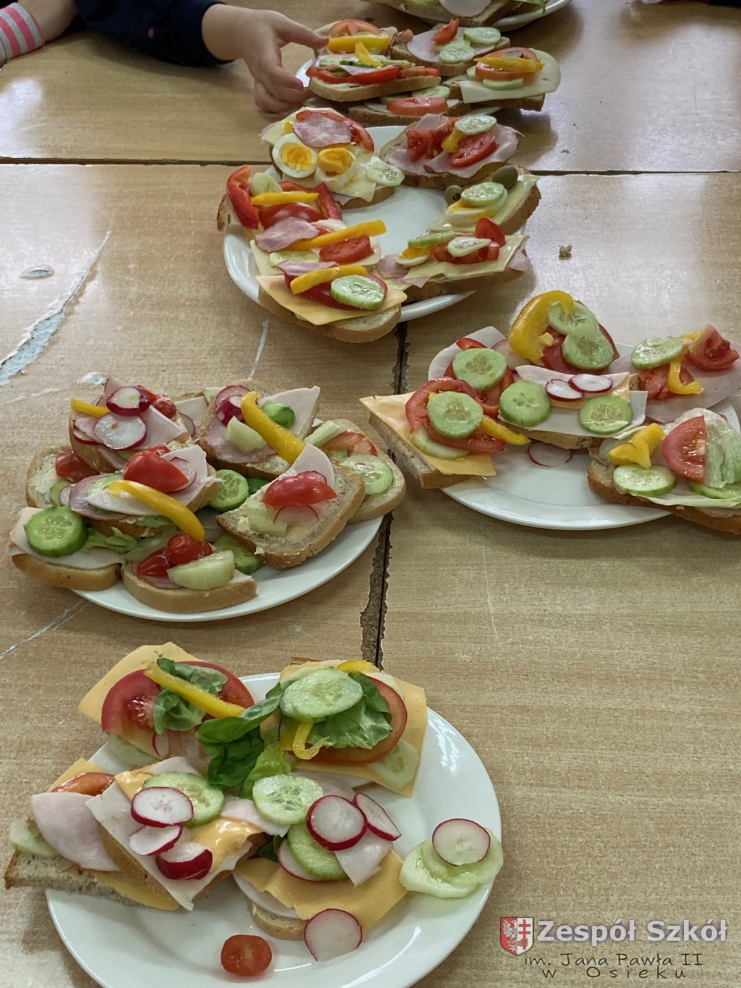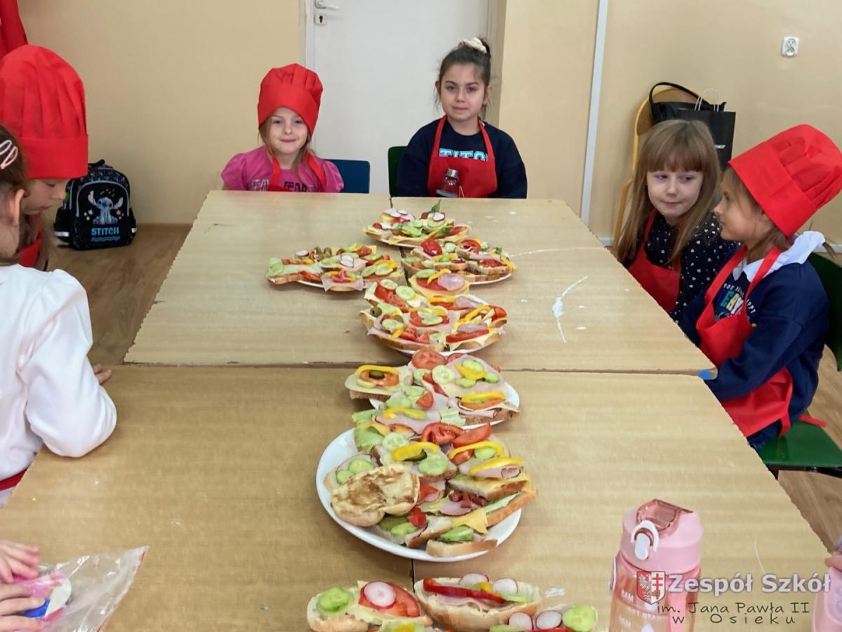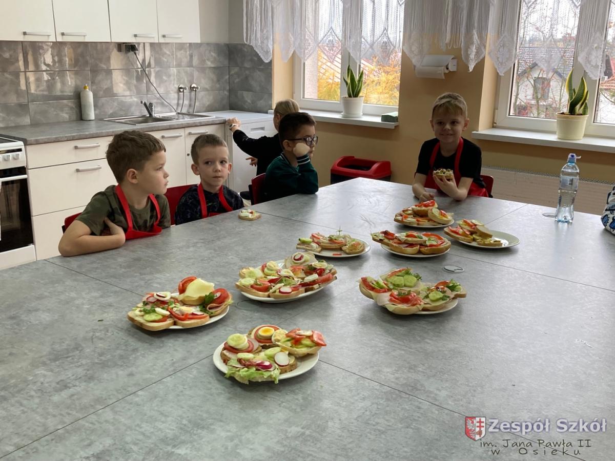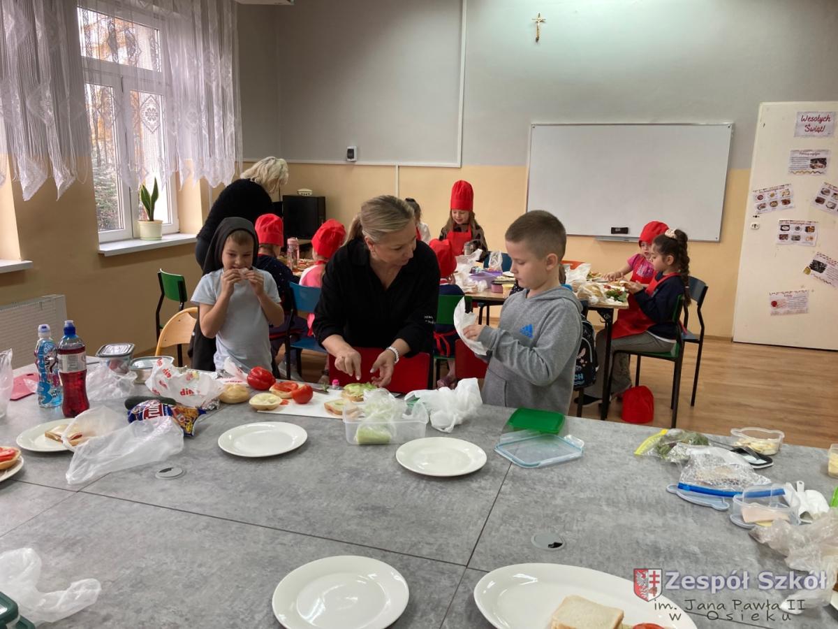 Pod czujnym okiem nauczycieli uczniowie rozmawiali o tym, dlaczego śniadanie jest najważniejszym posiłkiem dnia i jakie produkty warto wybierać, by mieć energię do nauki i zabawy. Następnie, w małych grupach, przygotowywali pyszne i kolorowe kanapki. Nie zabrakło świeżych warzyw, chrupiącego pieczywa, aromatycznego szczypiorku a nawet czosnku. Wspólne gotowanie sprawiło wszystkim mnóstwo radości. Dzieci z dumą prezentowały swoje kulinarne dzieła, a zapach świeżych potraw szybko wypełnił całą pracownię. Na zakończenie wszyscy zasiedli do wspólnego śniadania, które smakowało wyjątkowo – bo przygotowane własnoręcznie!