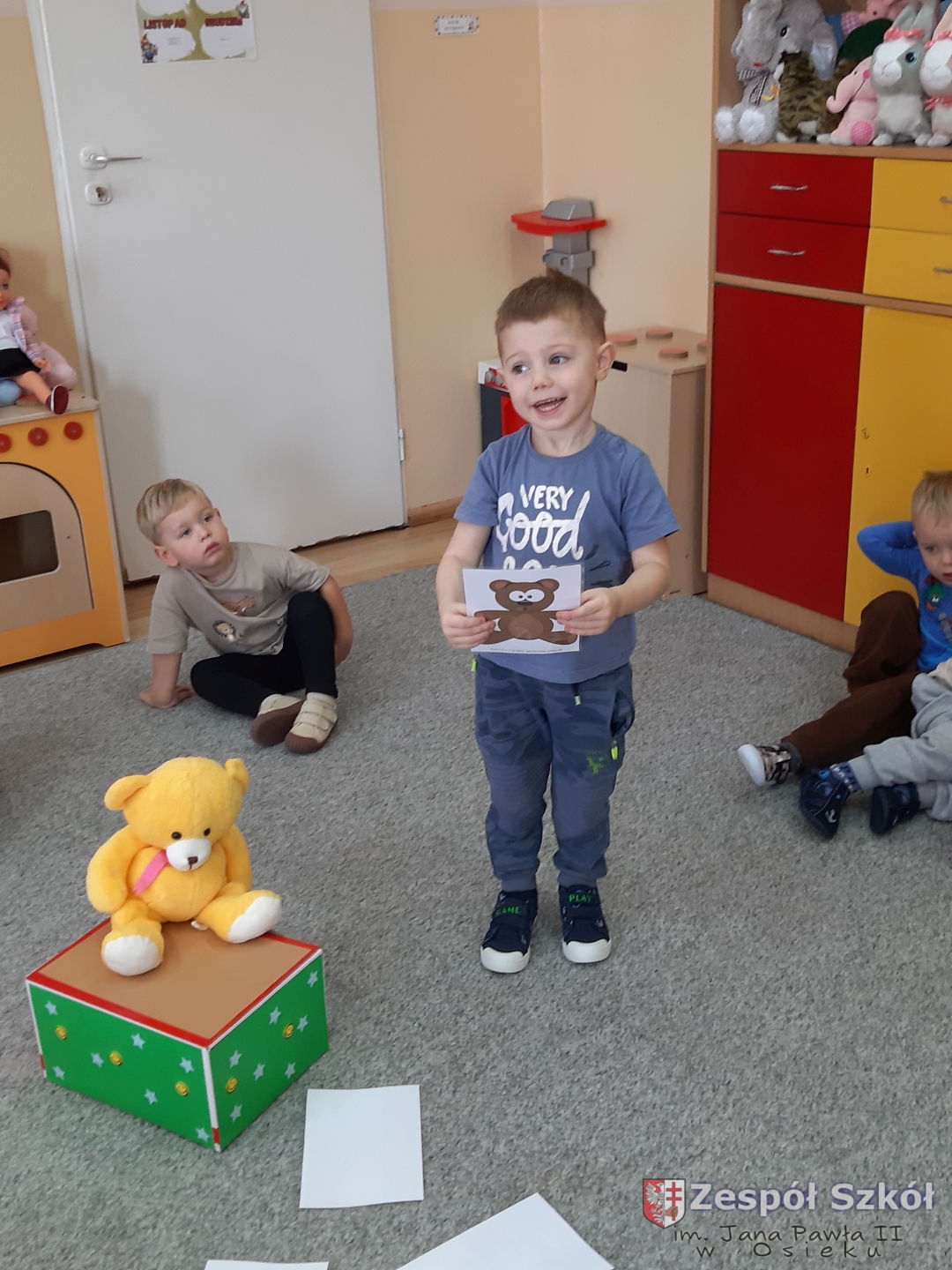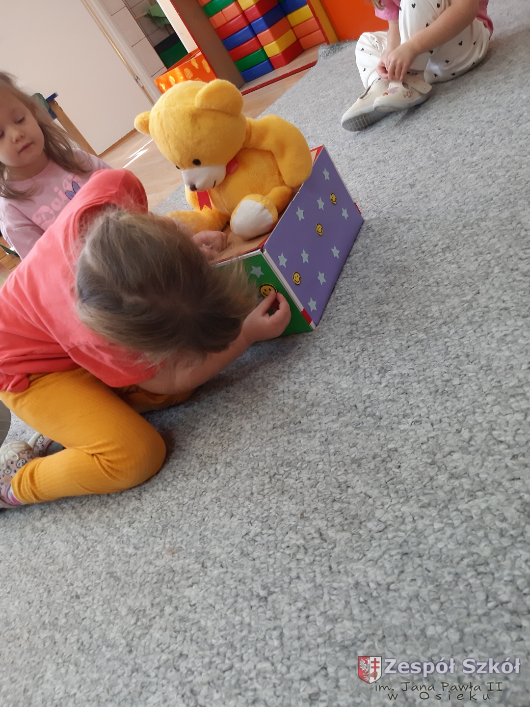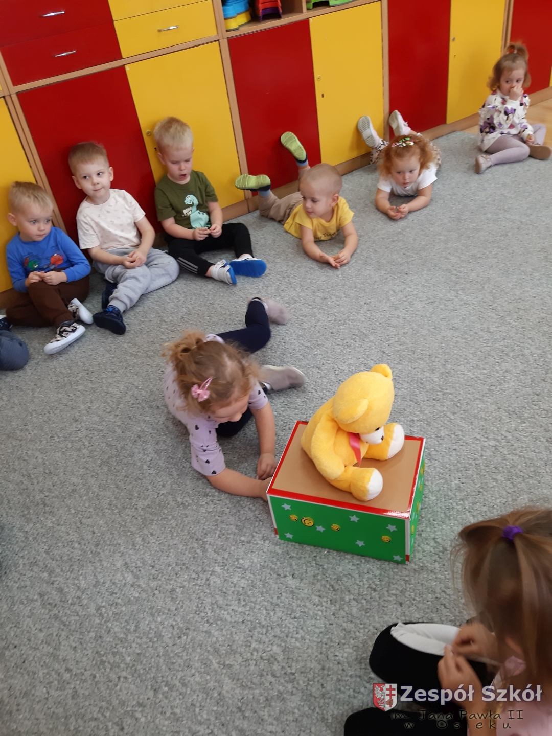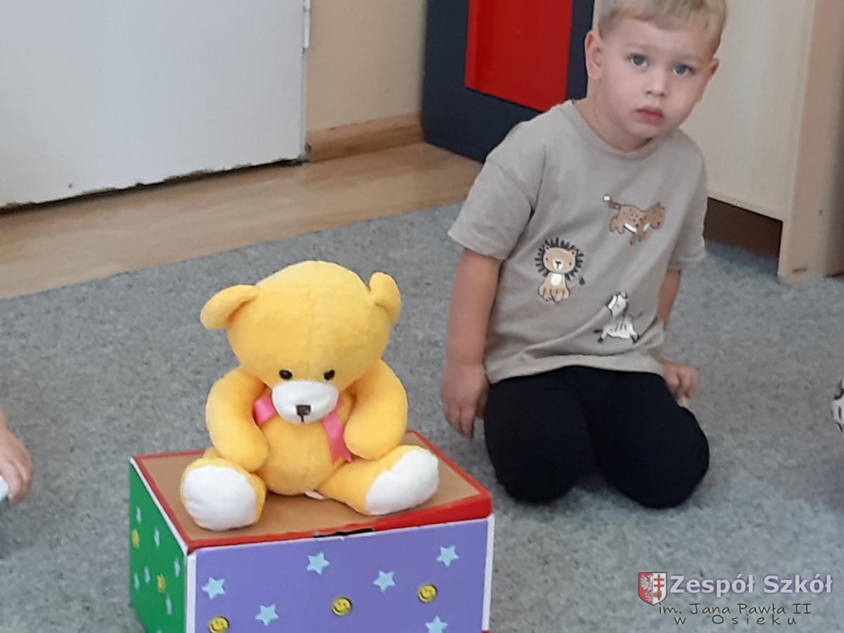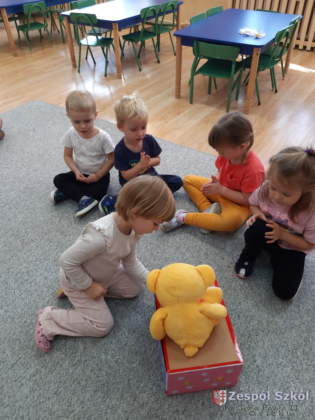Grupa trzylatków 13 listopada rozpoczęła realizację kolejnego modułu Projektu Edukacyjnego „Mały Miś w Świecie Wielkiej Literatury”. Moduł II – „Mały Miś w Świecie Emocji” rozpoczął się od rozwijanie wyobraźni u dzieci za pośrednictwem tajemniczego gościa ukrytego w pudełku. Było to wprowadzenie w tematykę emocji. Tajemniczym gościem okazał się Miś, który bał się, dlatego ukrył się w pudełku. Dzieci opowiadały jak one czuły się w pierwszym dniu w przedszkolu, nazywały emocje podczas zabawy z kartami emocji. Przedszkolaki wybrały imię dla swojego gościa i teraz Miś Bary będzie „mieszkał” na półeczce w przedszkolnej sali Krasnalków i obserwował dzieci. W trakcie zajęć dzieci dowiedziały się, że wszystkie emocje są ważne np. złość pozwala nam ustalić granice i potrzeby, ale trzeba umieć sobie z nią radzić. Smutek pozwala dostrzec, co jest dla nas naprawdę cenne. Strach chroni przed zagrożeniem i przypomina o ostrożności. Radość daje energie i motywuje do działania. Na koniec zajęć dzieci stworzyły pudełko emocji, w którym będą gromadzone przedmioty służące poznawaniu emocji i radzenia sobie z nimi w społecznie akceptowalny sposób.