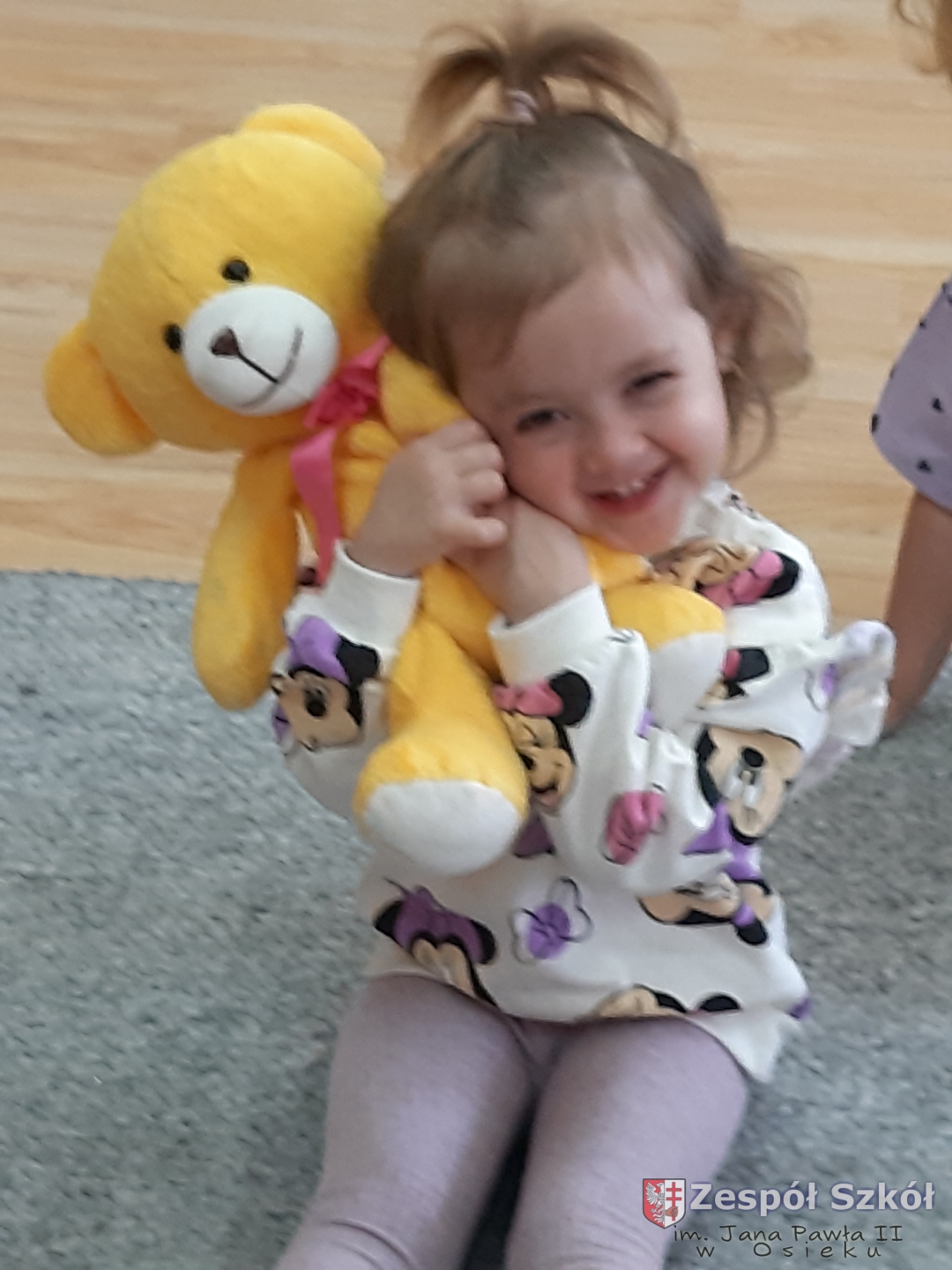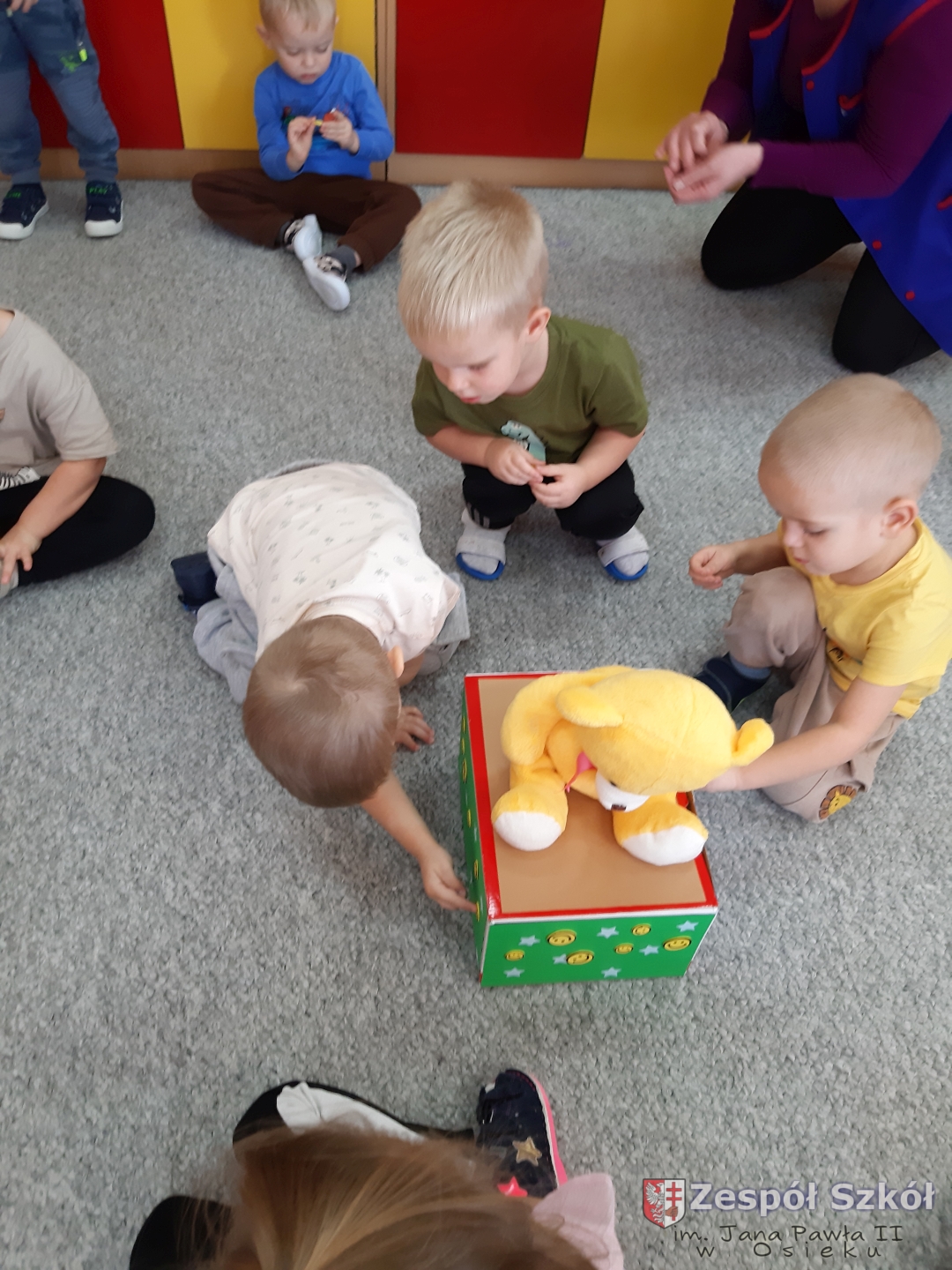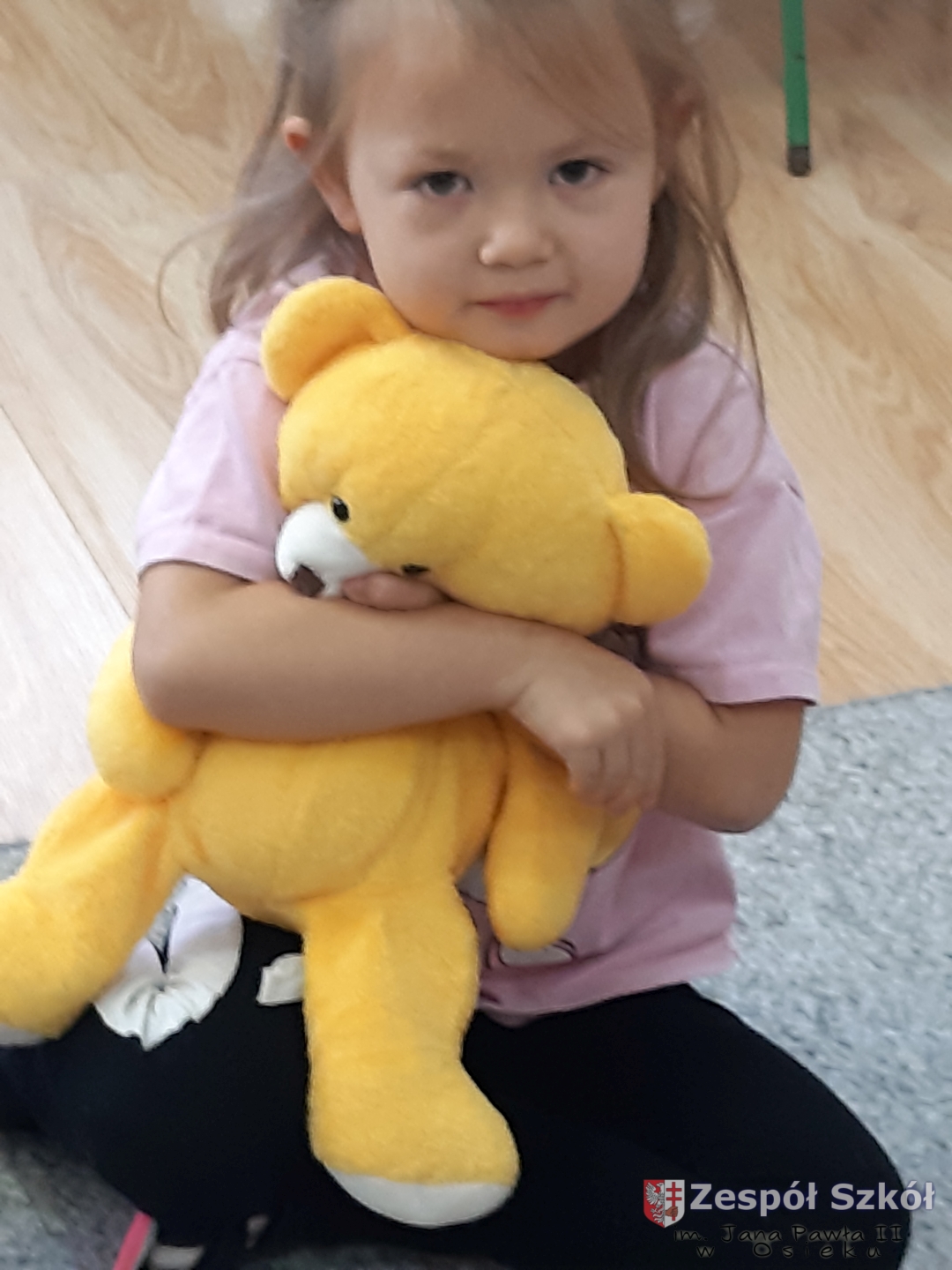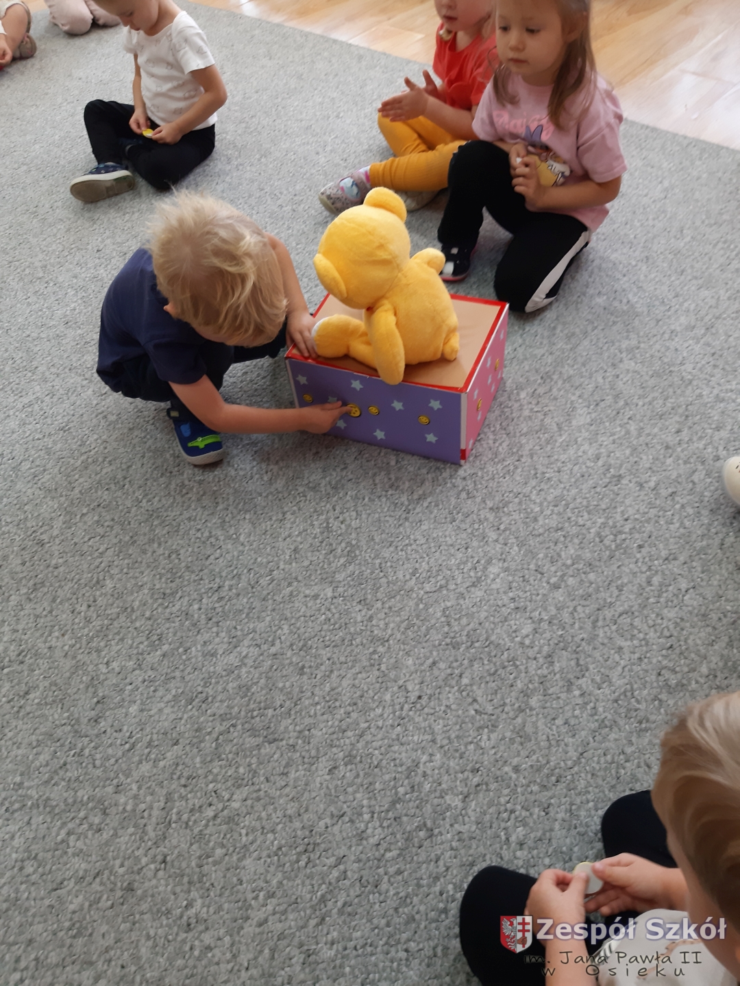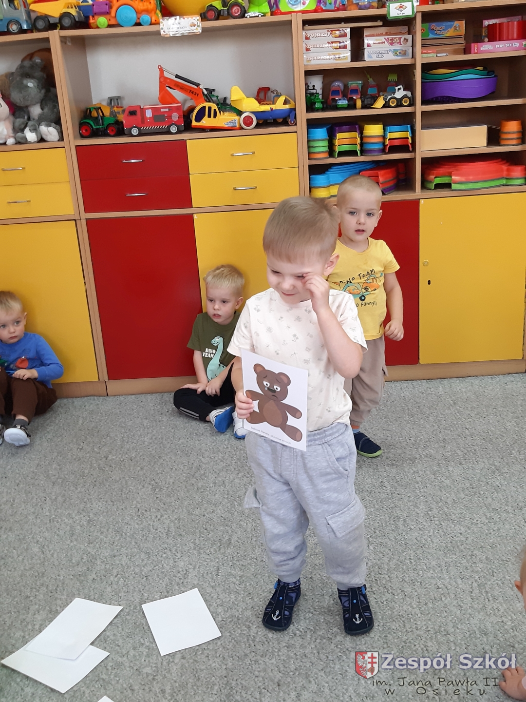 Grupa trzylatków 13 listopada rozpoczęła realizację kolejnego modułu Projektu Edukacyjnego „Mały Miś w Świecie Wielkiej Literatury”. Moduł II – „Mały Miś w Świecie Emocji” rozpoczął się od rozwijanie wyobraźni u dzieci za pośrednictwem tajemniczego gościa ukrytego w pudełku. Było to wprowadzenie w tematykę emocji. Tajemniczym gościem okazał się Miś, który bał się, dlatego ukrył się w pudełku. Dzieci opowiadały jak one czuły się w pierwszym dniu w przedszkolu, nazywały emocje podczas zabawy z kartami emocji. Przedszkolaki wybrały imię dla swojego gościa i teraz Miś Bary będzie „mieszkał” na półeczce w przedszkolnej sali Krasnalków i obserwował dzieci. W trakcie zajęć dzieci dowiedziały się, że wszystkie emocje są ważne np. złość pozwala nam ustalić granice i potrzeby, ale trzeba umieć sobie z nią radzić. Smutek pozwala dostrzec, co jest dla nas naprawdę cenne. Strach chroni przed zagrożeniem i przypomina o ostrożności. Radość daje energie i motywuje do działania. Na koniec zajęć dzieci stworzyły pudełko emocji, w którym będą gromadzone przedmioty służące poznawaniu emocji i radzenia sobie z nimi w społecznie akceptowalny sposób.