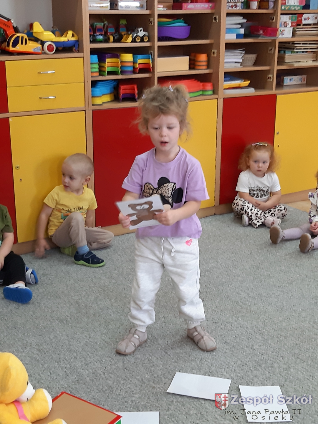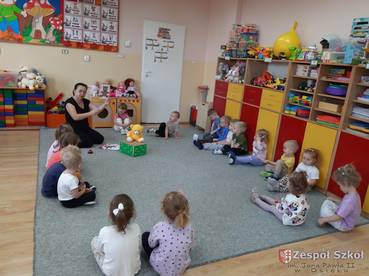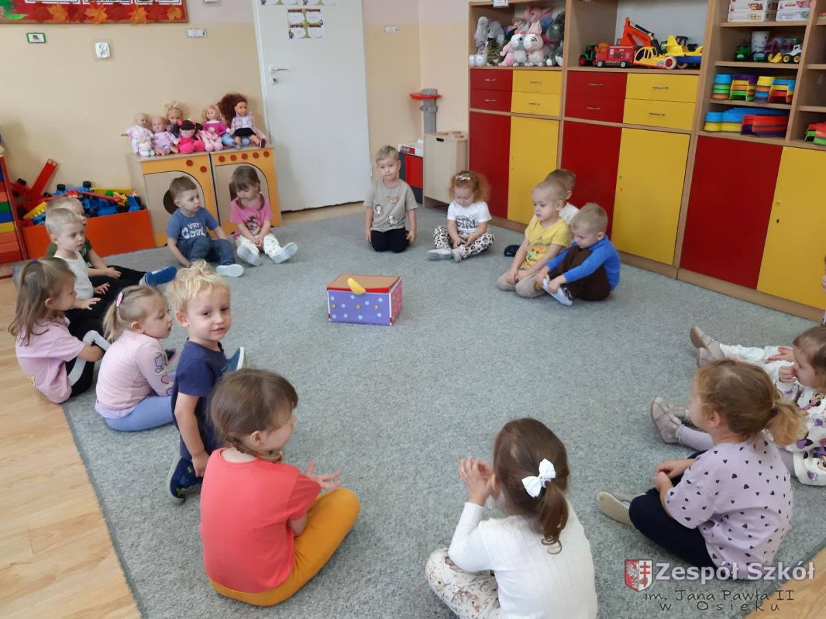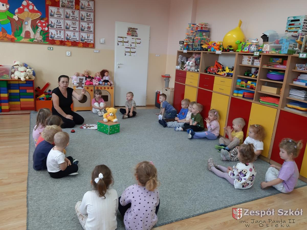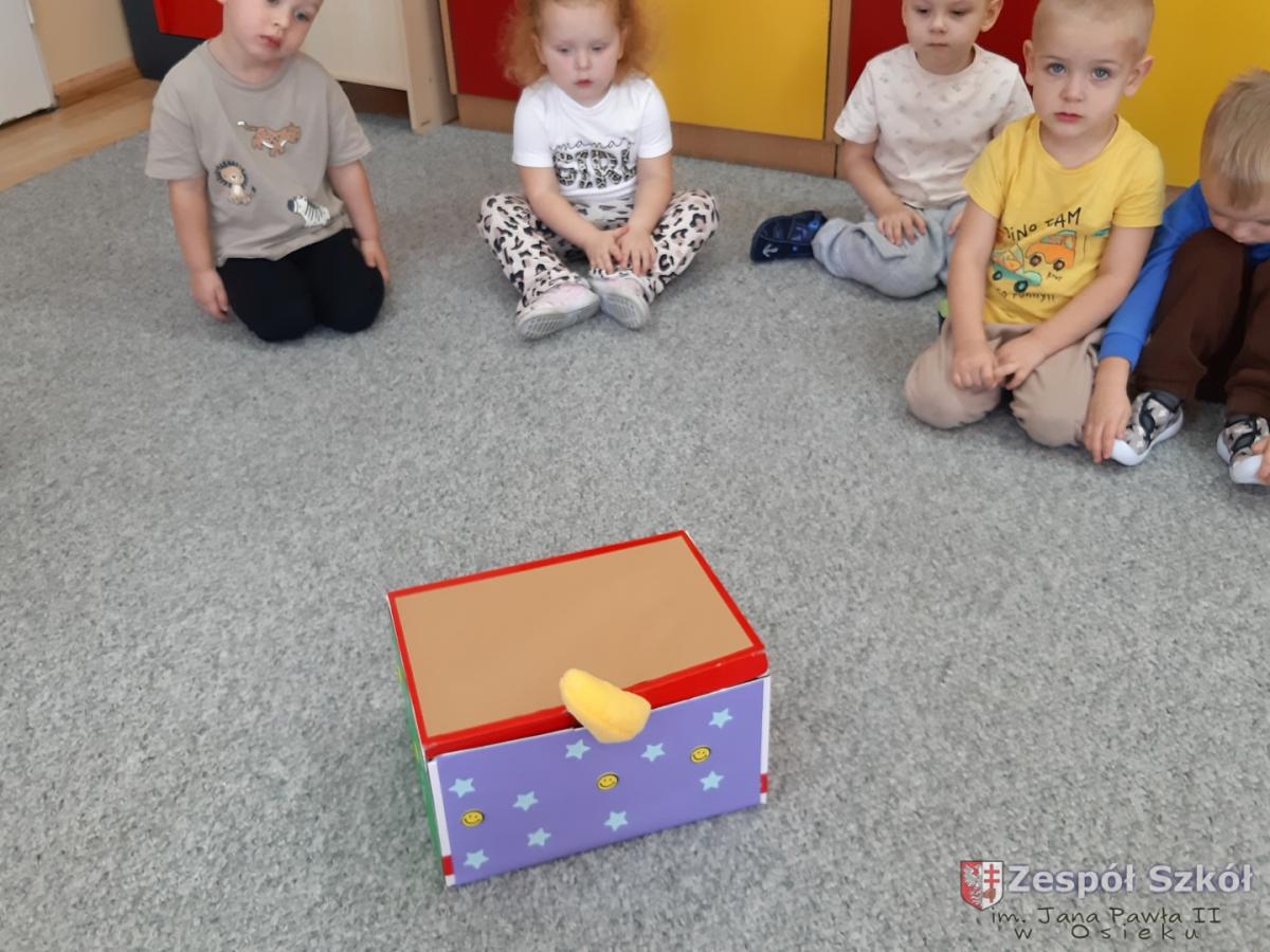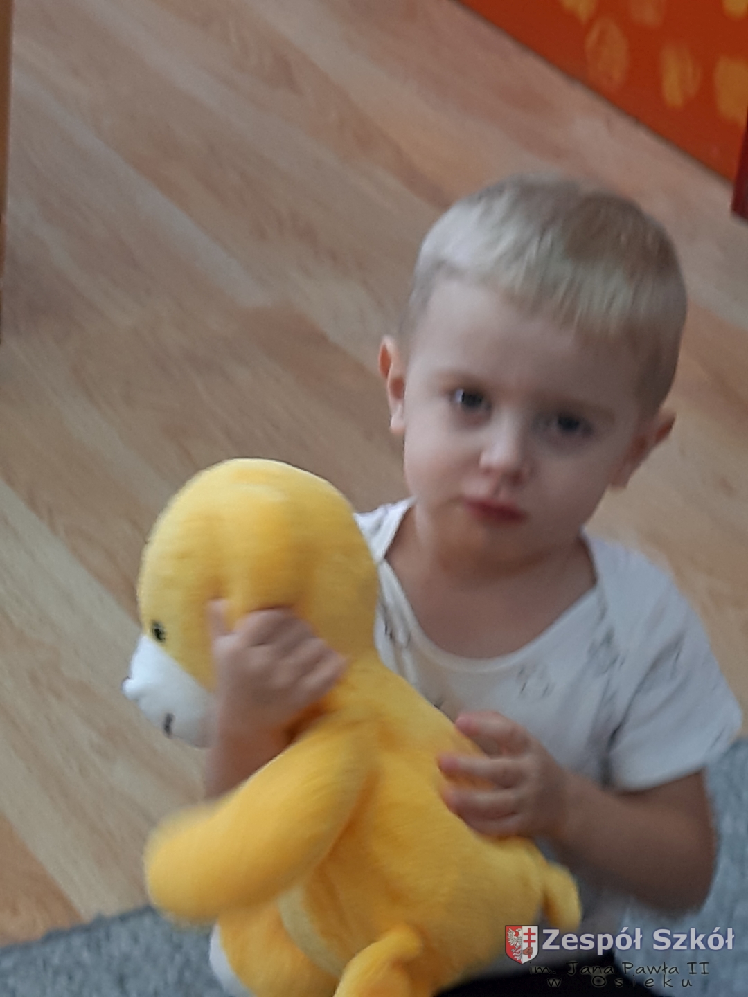 Grupa trzylatków 13 listopada rozpoczęła realizację kolejnego modułu Projektu Edukacyjnego „Mały Miś w Świecie Wielkiej Literatury”. Moduł II – „Mały Miś w Świecie Emocji” rozpoczął się od rozwijanie wyobraźni u dzieci za pośrednictwem tajemniczego gościa ukrytego w pudełku. Było to wprowadzenie w tematykę emocji. Tajemniczym gościem okazał się Miś, który bał się, dlatego ukrył się w pudełku. Dzieci opowiadały jak one czuły się w pierwszym dniu w przedszkolu, nazywały emocje podczas zabawy z kartami emocji. Przedszkolaki wybrały imię dla swojego gościa i teraz Miś Bary będzie „mieszkał” na półeczce w przedszkolnej sali Krasnalków i obserwował dzieci. W trakcie zajęć dzieci dowiedziały się, że wszystkie emocje są ważne np. złość pozwala nam ustalić granice i potrzeby, ale trzeba umieć sobie z nią radzić. Smutek pozwala dostrzec, co jest dla nas naprawdę cenne. Strach chroni przed zagrożeniem i przypomina o ostrożności. Radość daje energie i motywuje do działania. Na koniec zajęć dzieci stworzyły pudełko emocji, w którym będą gromadzone przedmioty służące poznawaniu emocji i radzenia sobie z nimi w społecznie akceptowalny sposób.