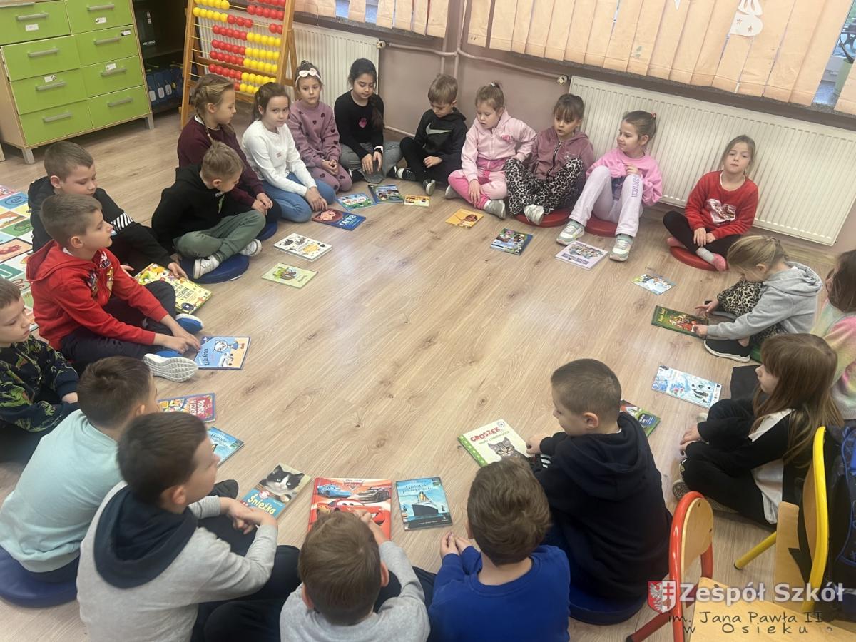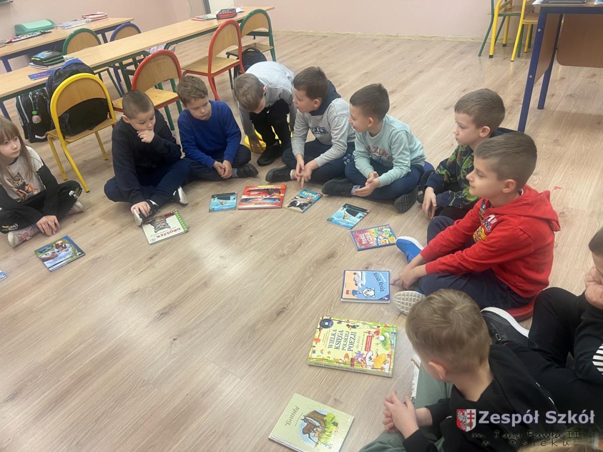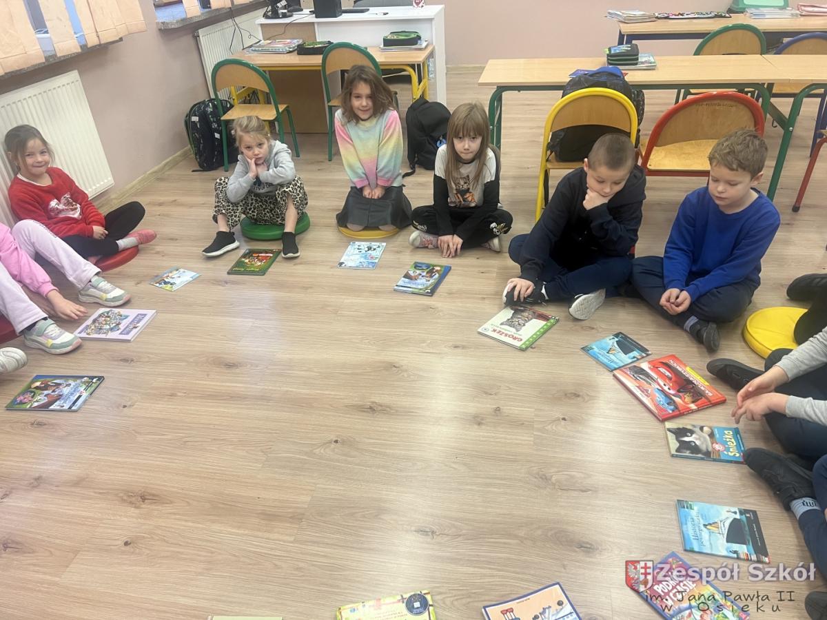 Zajęcia rozpoczęły się rozmową kierowaną na temat ulubionych książek uczniów. Rozmowa była okazją do poznania preferencji czytelniczych uczniów oraz do zachęcenia ich do korzystania z biblioteki szkolnej. Wspólnie z uczniami przeprowadzono burzę mózgów dotyczącą znaczenia czytania. W kolejnej części lekcji uczniowie zastanawiali się, jak wyglądałby świat, gdyby nie było w nim książek. Wspólnie tworzyli wizję takiego świata, wskazując, co mogłoby zostać utracone: wiedza, rozrywka, możliwość rozwijania wyobraźni, poznawania przygód bohaterów literackich. Uczniowie uczestniczyli w krótkiej inscenizacji znanej bajki „Czerwony Kapturek”. Po podziale ról dzieci mogły odgrywać postacie z bajki, wykorzystując swoją wyobraźnię i ekspresję artystyczną. Ćwiczenie sprzyjało rozwijaniu umiejętności dramowych, współpracy oraz śmiałości w wystąpieniach przed grupą. Na zakończenie zajęć dzieci wykonały prace plastyczne przedstawiające ich ulubione książeczki. Prace były kolorowe i kreatywne, a uczniowie z zaangażowaniem opowiadali, dlaczego właśnie tę książkę wybrali.