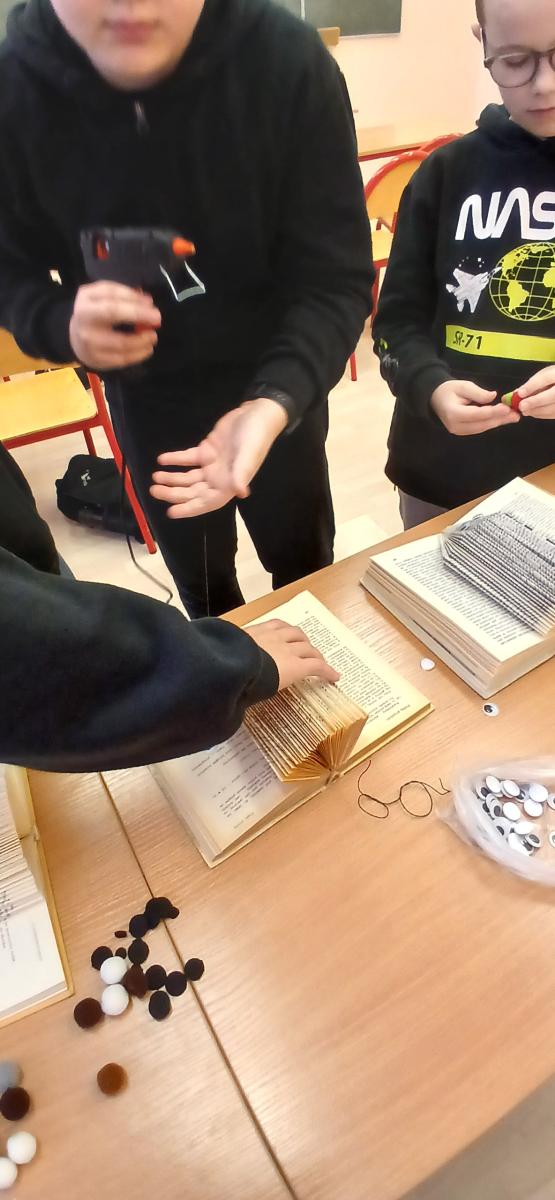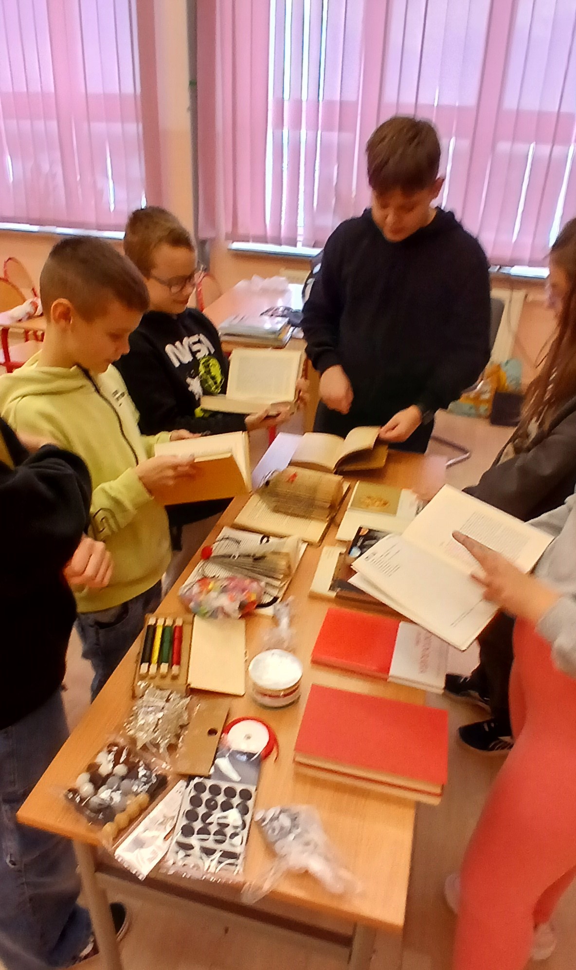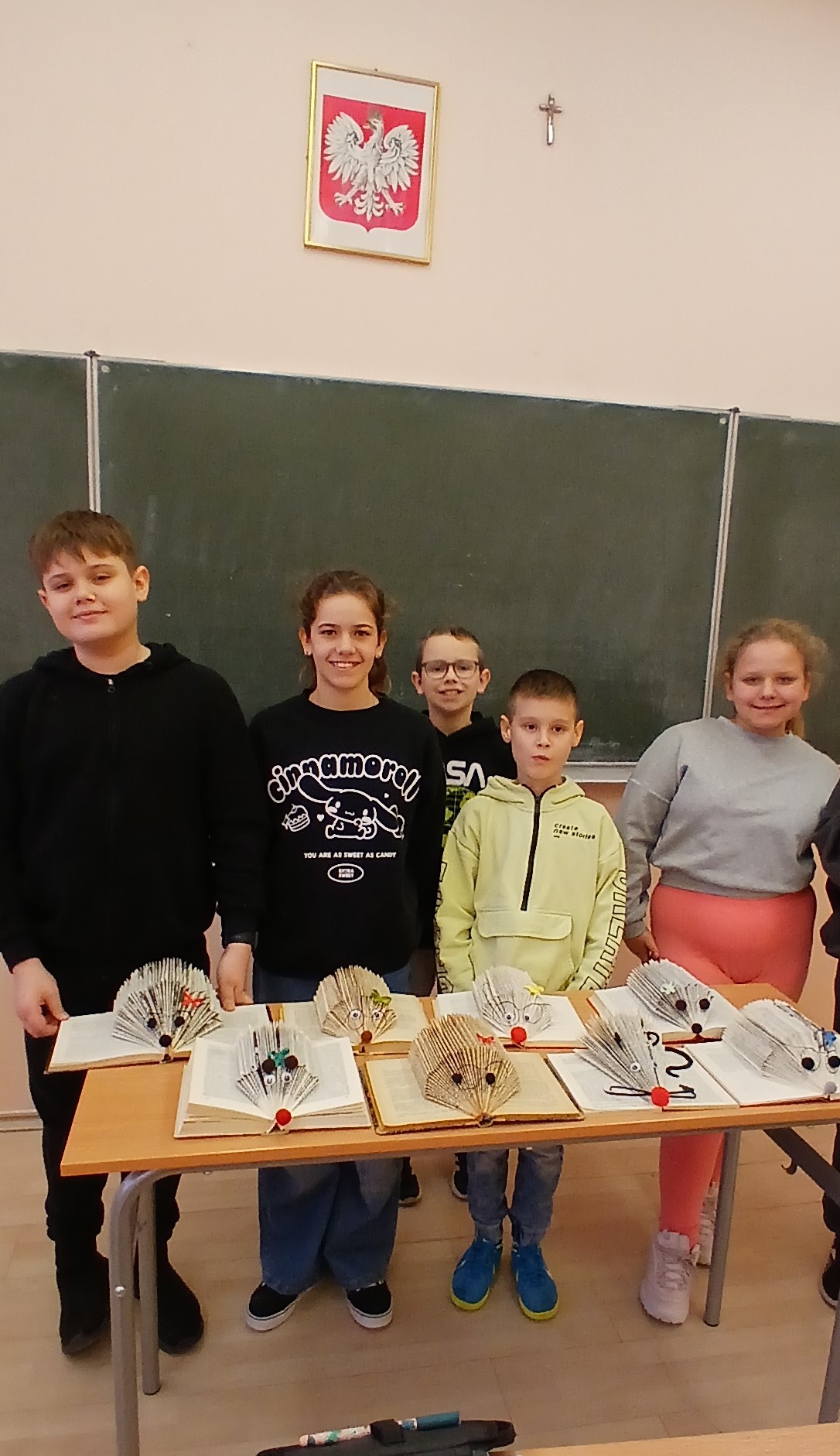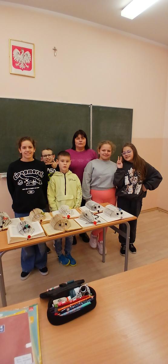 W dniu 24 listopada 2025r. Uczniowie klasy V b mogli spróbować swoich sił w book foldingu. Book folding to tworzenie rzeźb ze starych książek polegające na zaginaniu kartek. W efekcie powstają trójwymiarowe kompozycje. Dzieci pracowały w pełnej skupienia, twórczej atmosferze. Prowadząca warsztaty Pani Dorota Wójcik z Pedagogicznej Biblioteki Wojewódzkiej im. Gustawa Herlinga Grudzińskiego w Kielcach – Filia w Staszowie wyjaśniła również, że tego typu zajęcia kształtują umiejętności artystyczne, pobudzają wyobraźnię i rozwijają świadomość ekologiczną.