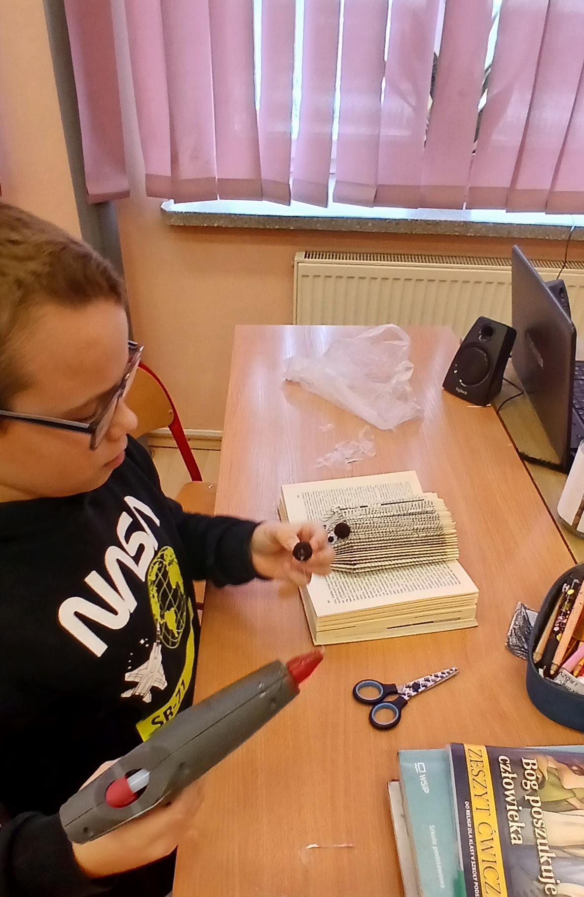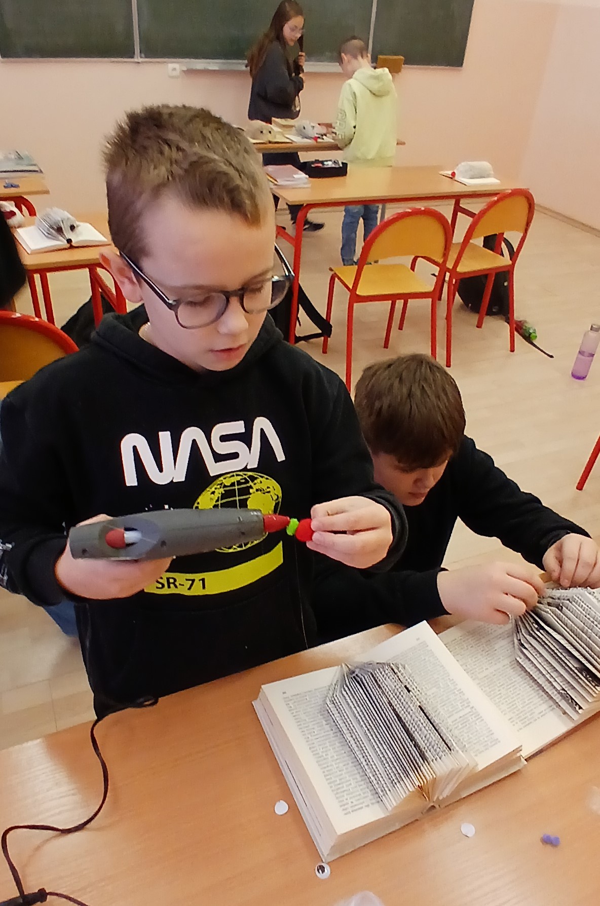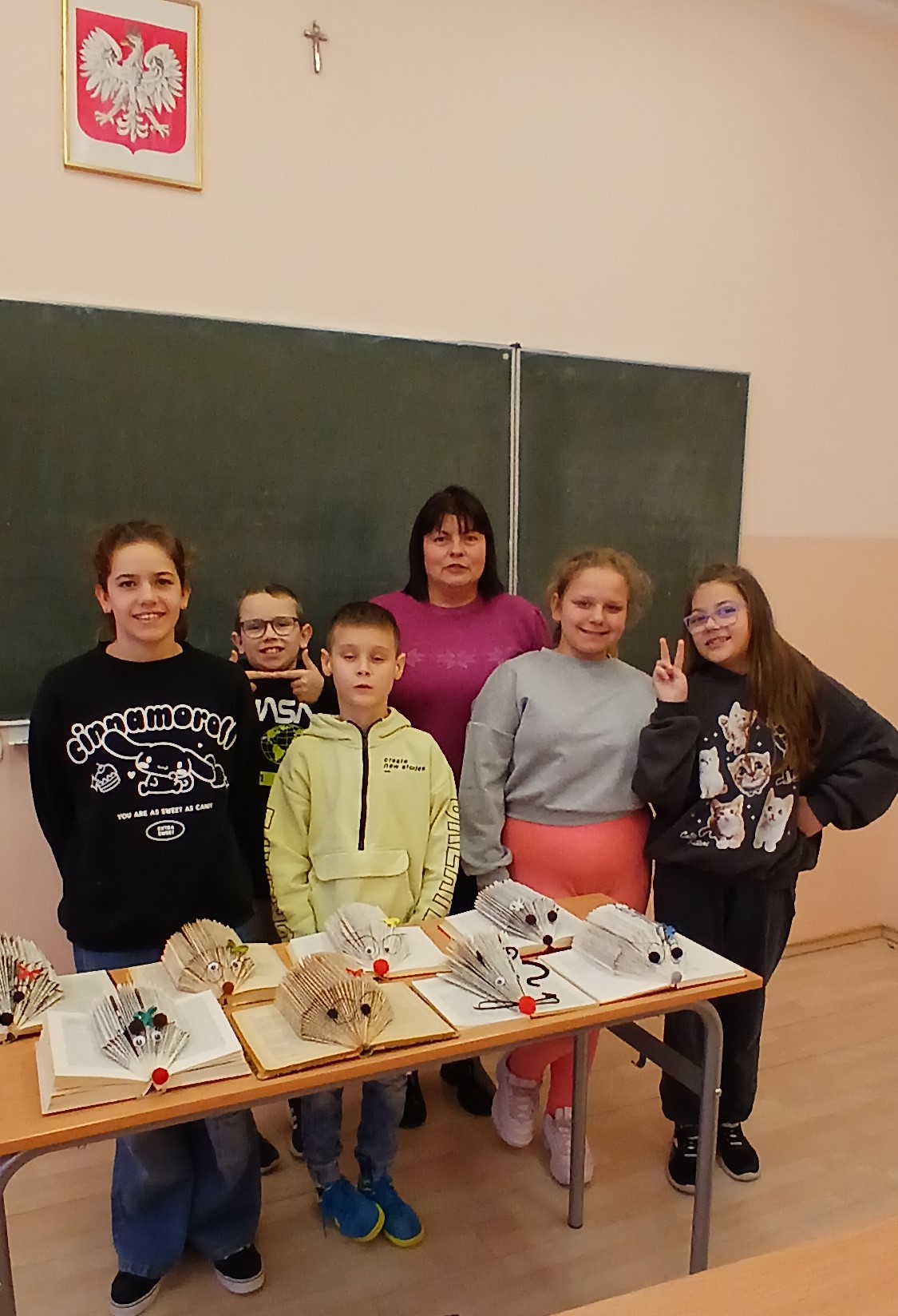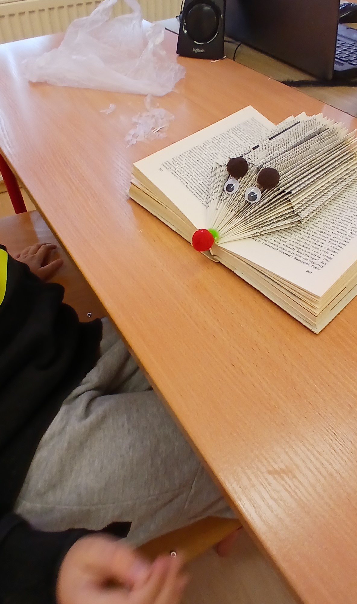 W dniu 24 listopada 2025r. Uczniowie klasy V b mogli spróbować swoich sił w book foldingu. Book folding to tworzenie rzeźb ze starych książek polegające na zaginaniu kartek. W efekcie powstają trójwymiarowe kompozycje. Dzieci pracowały w pełnej skupienia, twórczej atmosferze. Prowadząca warsztaty Pani Dorota Wójcik z Pedagogicznej Biblioteki Wojewódzkiej im. Gustawa Herlinga Grudzińskiego w Kielcach – Filia w Staszowie wyjaśniła również, że tego typu zajęcia kształtują umiejętności artystyczne, pobudzają wyobraźnię i rozwijają świadomość ekologiczną.