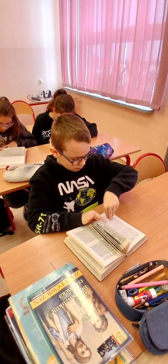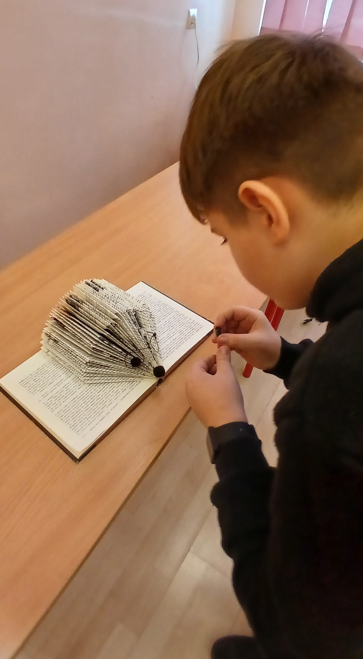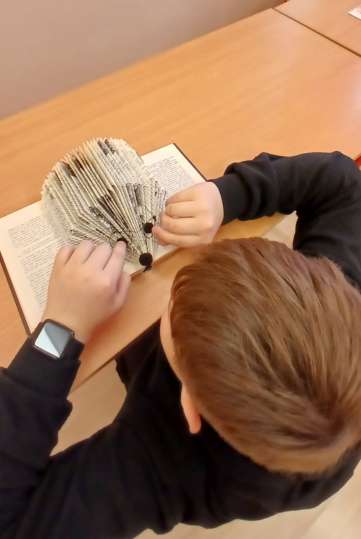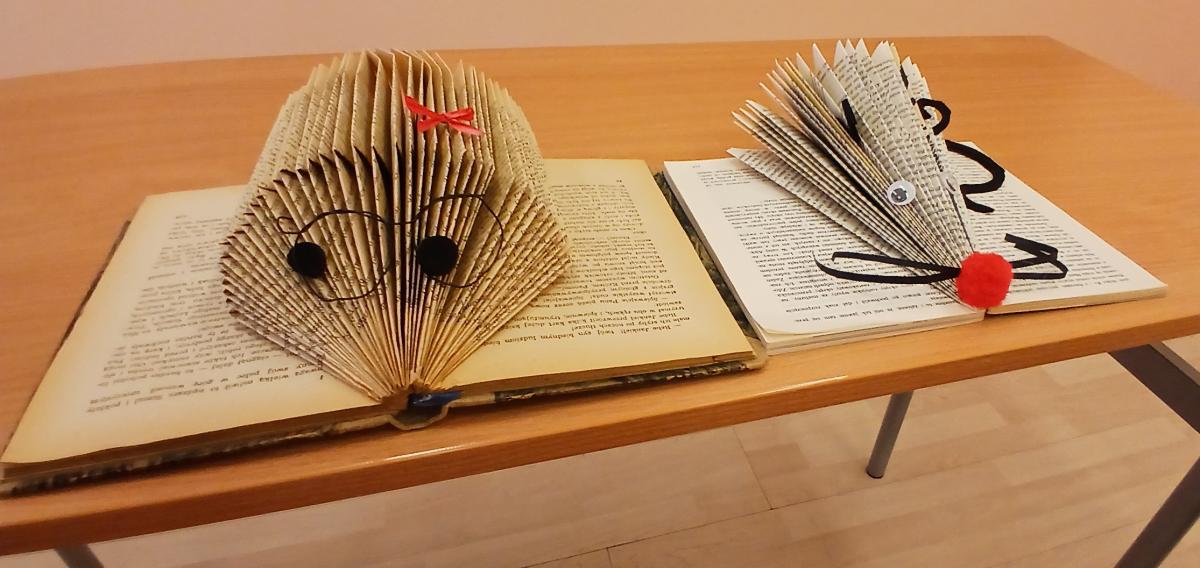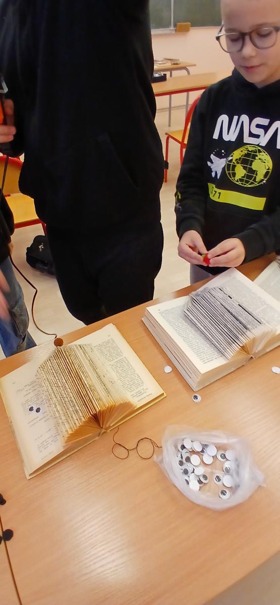 W dniu 24 listopada 2025r. Uczniowie klasy V b mogli spróbować swoich sił w book foldingu. Book folding to tworzenie rzeźb ze starych książek polegające na zaginaniu kartek. W efekcie powstają trójwymiarowe kompozycje. Dzieci pracowały w pełnej skupienia, twórczej atmosferze. Prowadząca warsztaty Pani Dorota Wójcik z Pedagogicznej Biblioteki Wojewódzkiej im. Gustawa Herlinga Grudzińskiego w Kielcach – Filia w Staszowie wyjaśniła również, że tego typu zajęcia kształtują umiejętności artystyczne, pobudzają wyobraźnię i rozwijają świadomość ekologiczną.