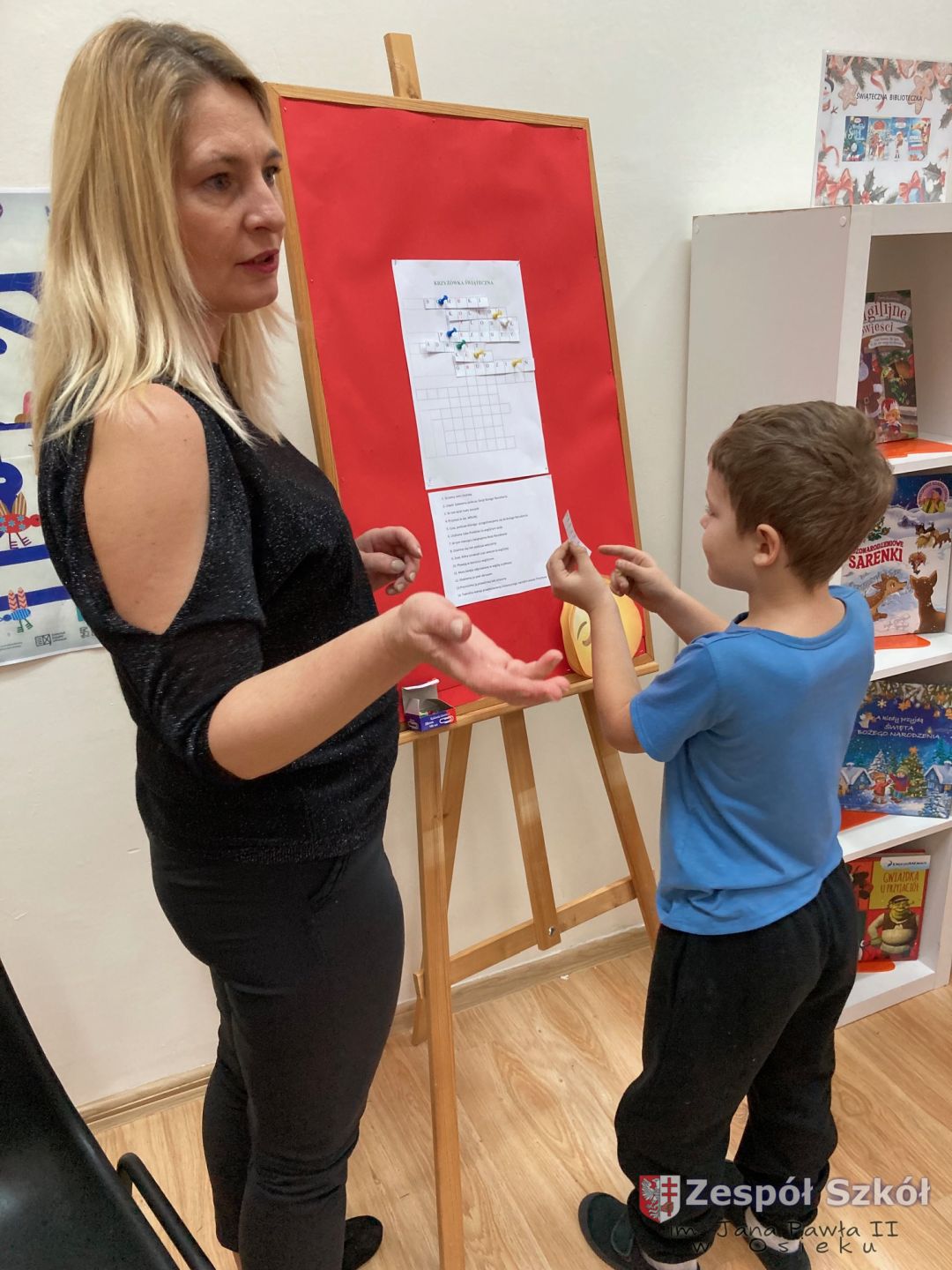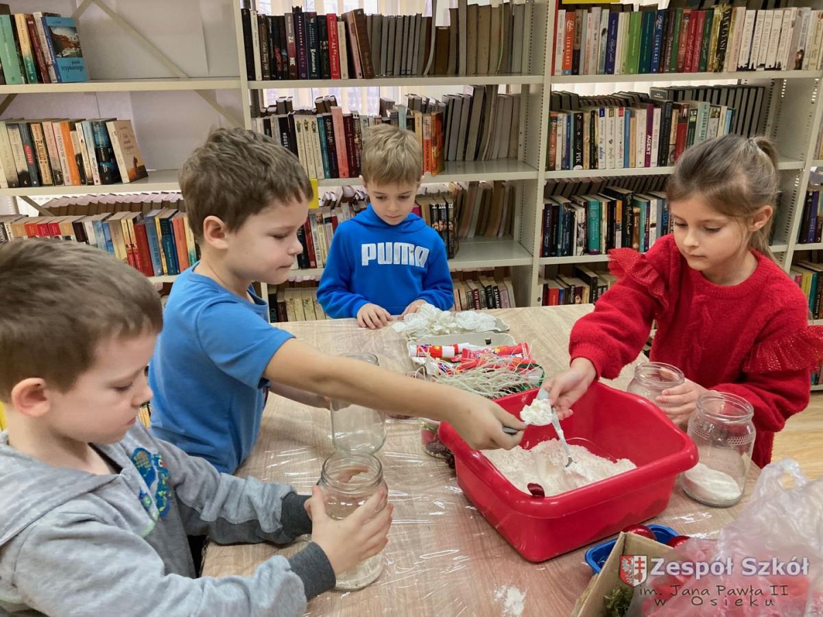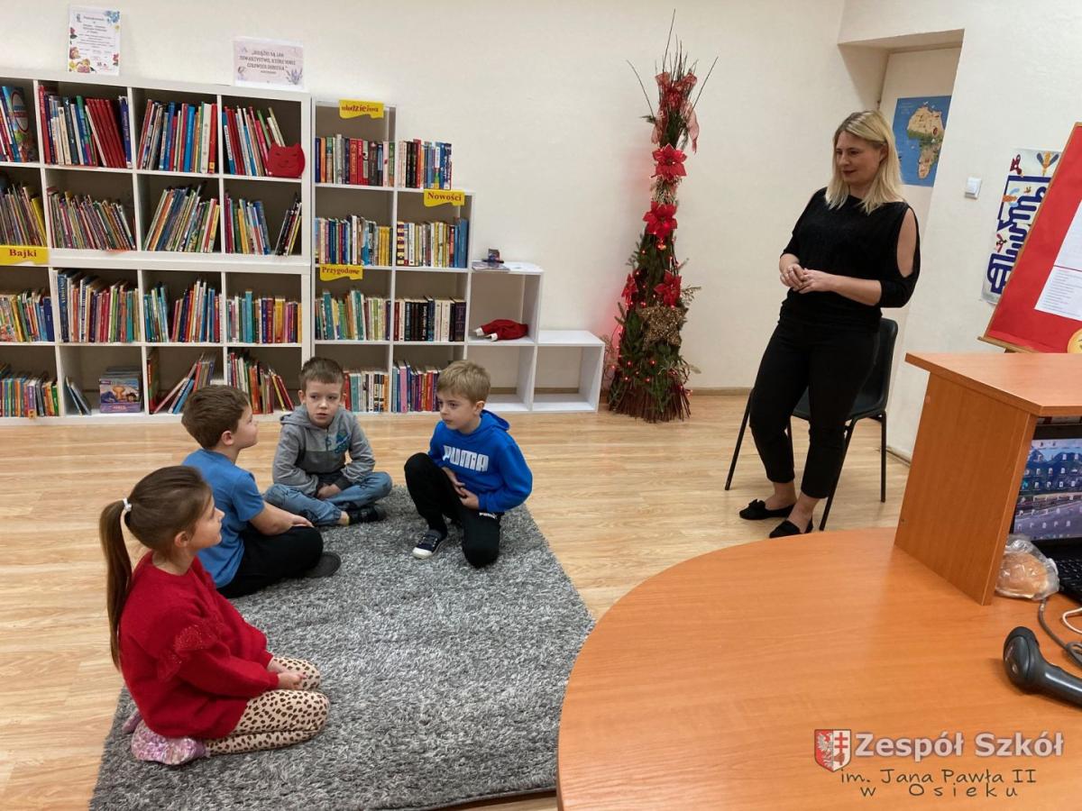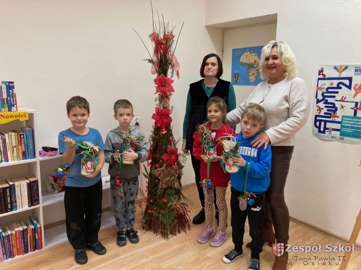 W dniu 11 grudnia uczniowie klasy I a wraz z opiekunami – p. Ewą Kruszewską i p. Anną Winiarską gościli w Miejsko-Gminnej Bibliotece Publicznej w Osieku. Uczniowie uczestniczyli w warsztatach literacko-plastycznych, na których poznali zwyczaje i tradycje bożonarodzeniowe. Podczas warsztatów rozwiązywali świąteczną krzyżówkę, wysłuchali opowiadania z książki pt. „24 historyjki w oczekiwaniu na Gwiazdkę”, rozwiązywali quiz bożonarodzeniowy, odpowiadali na pytania wylosowane z magicznego pudełka. Wzięli również udział w zabawach „Zaczarowany worek Świętego Mikołaja” i Świecące gwiazdki”, które dostarczyły im dużo radości. W drugiej części warsztatów dzieci wykonały piękne świąteczne stroiki.
