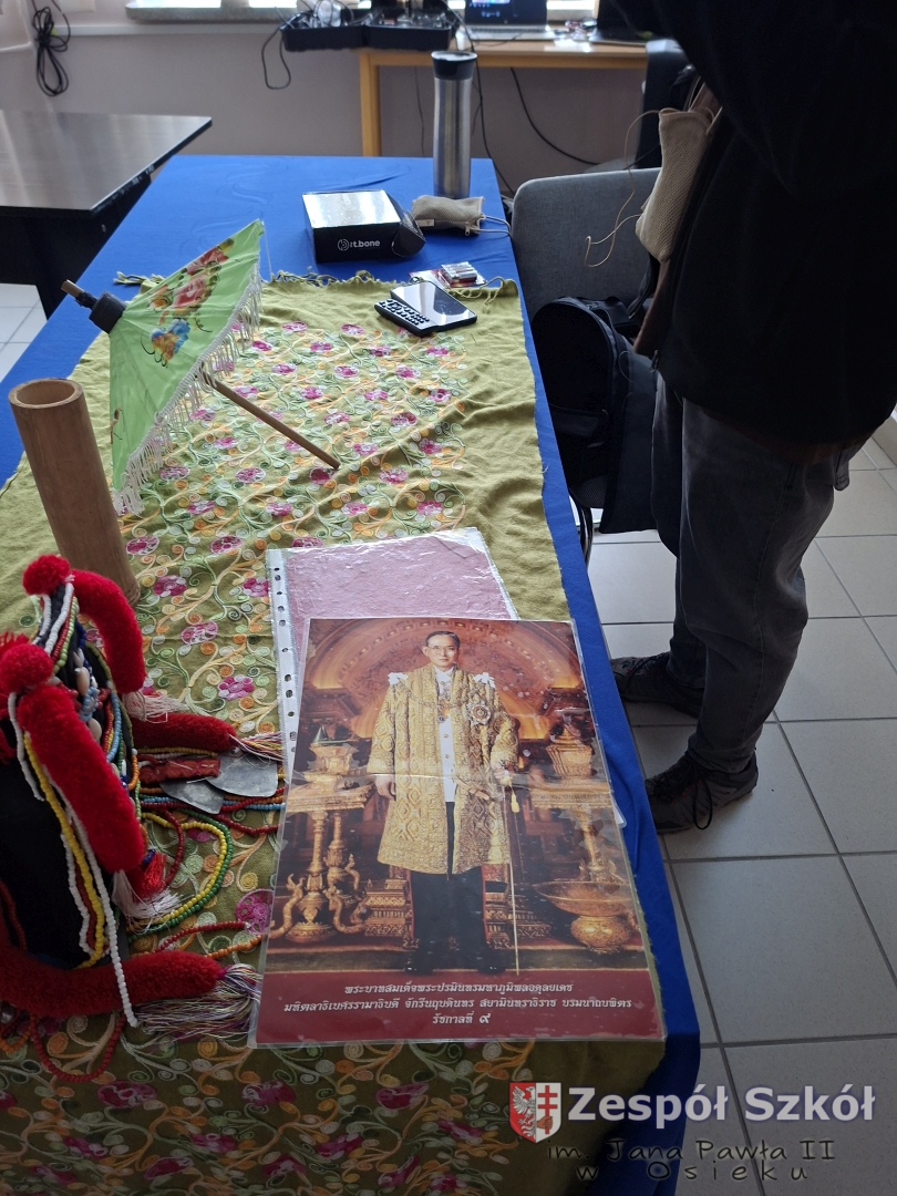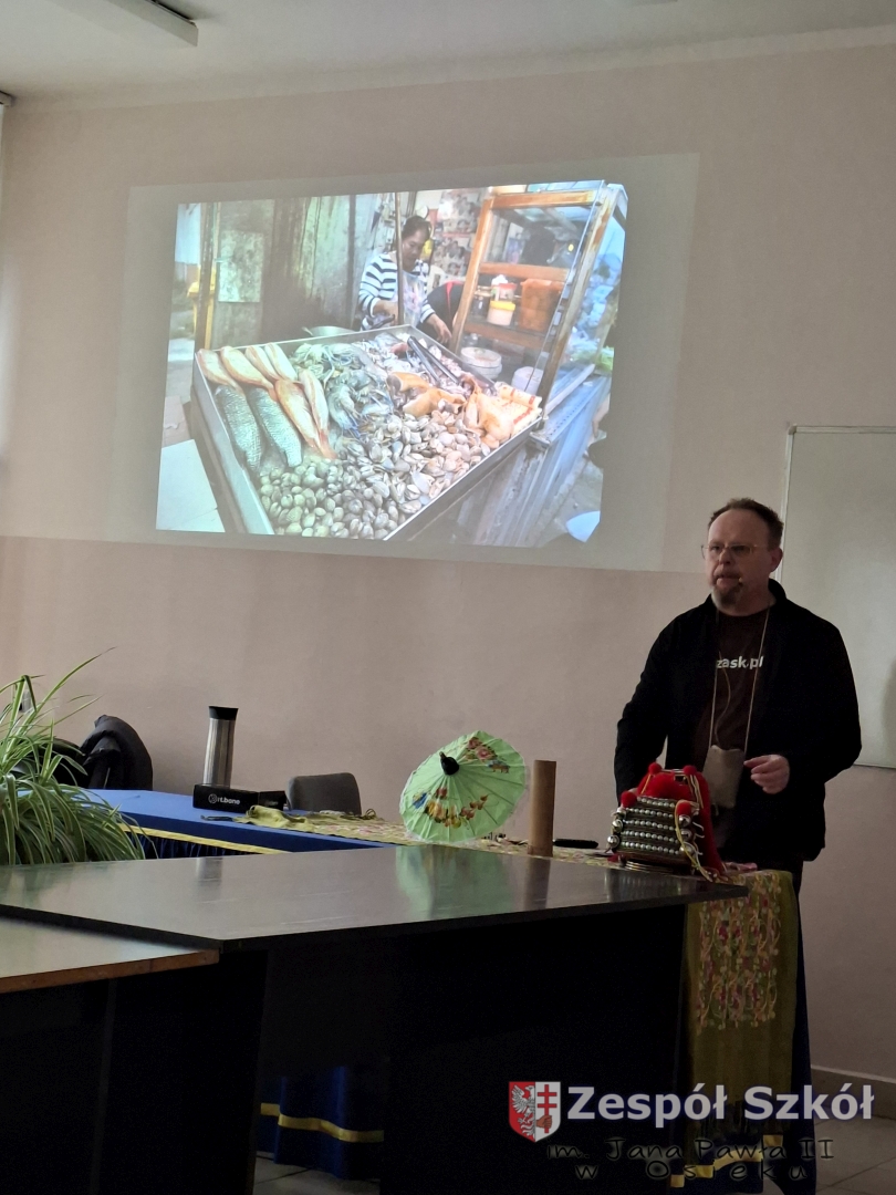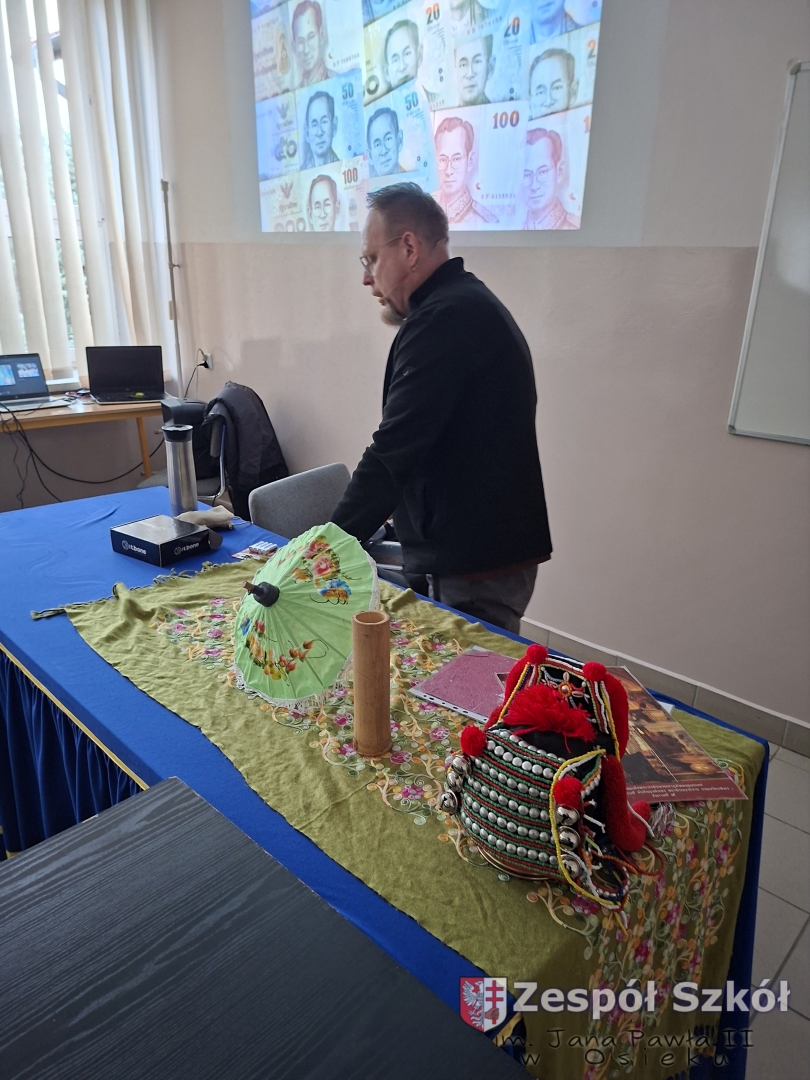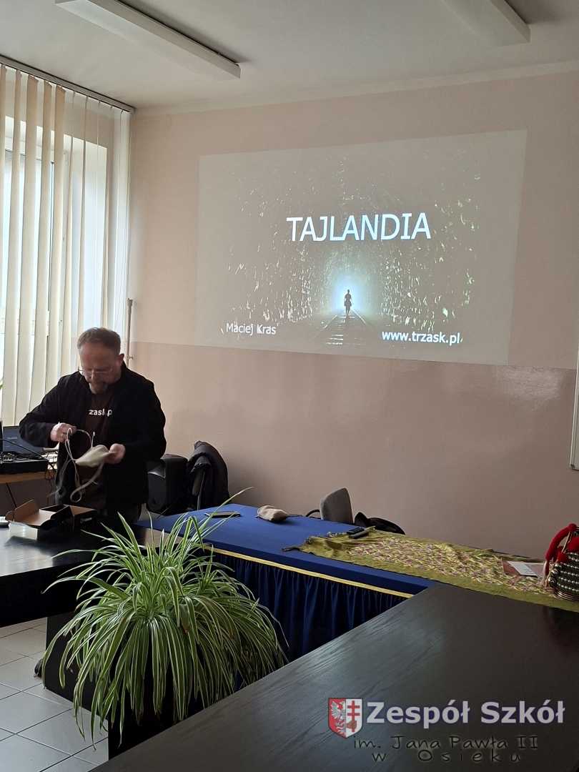 W dniu  01 kwietnia 2026 r. uczniowie naszej szkoły brali udział w spotkaniu z podróżnikiem Maciejem Krasem z grupy „trzask.pl”. Celem spotkania było przybliżenie uczniom kultury, obyczajów, przyrody i najważniejszych atrakcji Tajlandii poprzez żywą, angażującą prelekcję podróżniczą. Podróżnik przedstawił Tajlandię jako kraj kontrastów – od tętniącego życiem Bangkoku po rajskie plaże i góry północy. Bardzo dużym zainteresowaniem cieszył się wątek plemienia Padaung (Karen) – słynnych „kobiet-żyraf”. Prelegent przedstawił historię i kontekst kulturowy noszenia mosiężnych obręczy na szyi przez kobiety. Podkreślił również potrzebę odpowiedzialnego podróżowania i szacunku dla zwierząt, dlatego też wyraźnie odradzał jazdę na słoniach. Prelekcja łączyła w sobie walory edukacyjne, emocjonalne i rozrywkowe. Dzięki żywemu językowi prelegenta, osobistym anegdotom oraz licznym rekwizytom (oryginalne pamiątki, przedmioty codziennego użytku, elementy kultury materialnej) uczniowie nie tylko zdobyli solidną wiedzę o Tajlandii, ale także poczuli klimat tego wyjątkowego kraju.