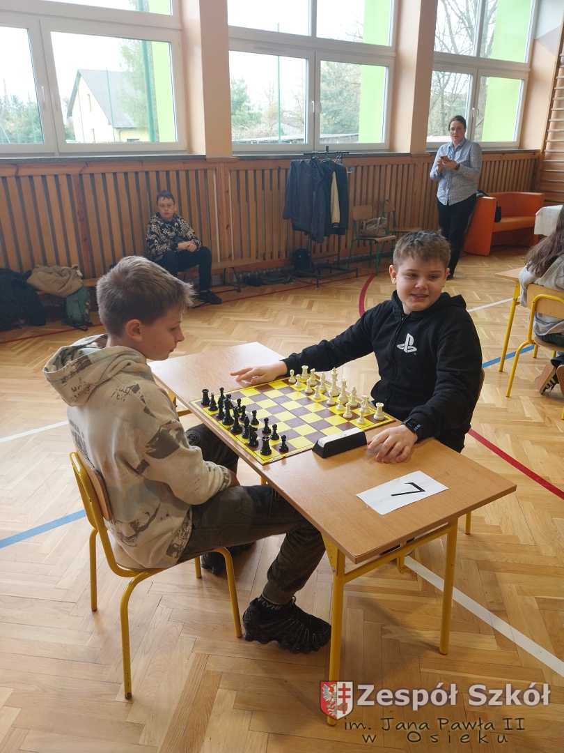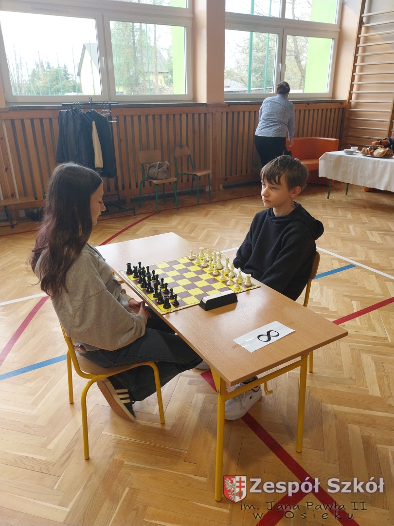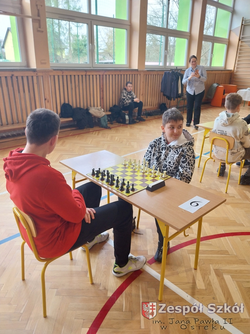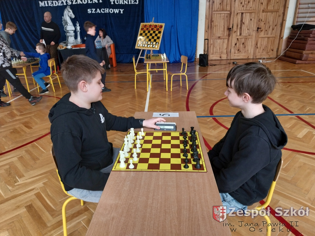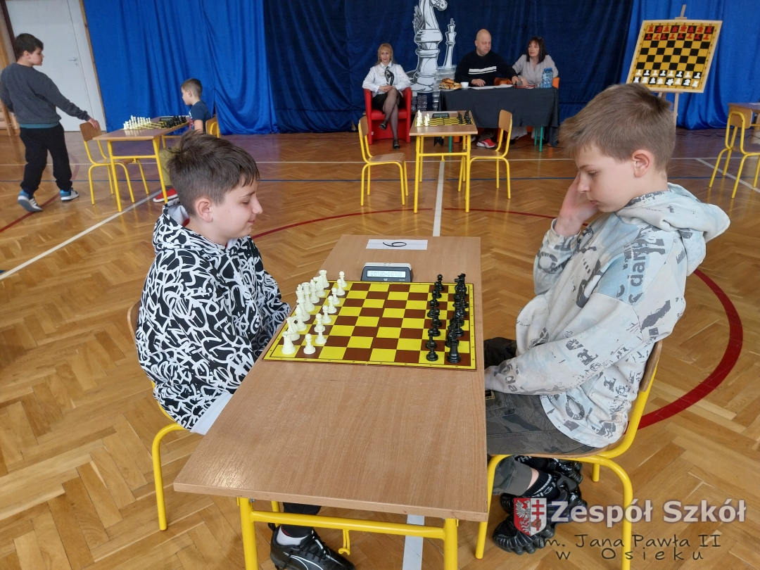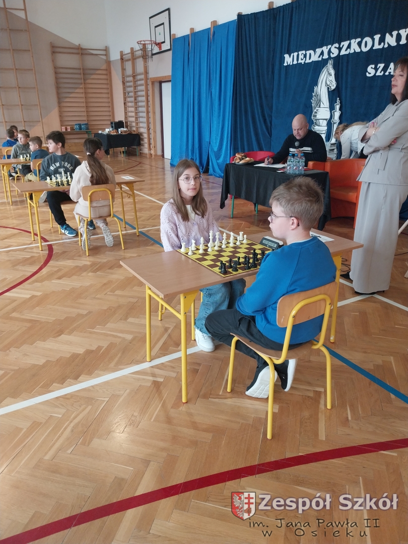 Dnia 15 kwietnia 2026 roku uczniowie klas IV, Va i Vb Zespołu Szkół im. Jana Pawła II w Osieku wzięli udział w Międzyszkolnym Turnieju Szachowym zorganizowanym przez Publiczną Szkołę Podstawą im. Heleny i Józefa Świątyńskich w Ossali. Wydarzenie zgromadziło wielu młodych pasjonatów królewskiej gry z różnych szkół z terenu naszej gminy. Zmagania rozegrano w dwóch kategoriach wiekowych – grupie młodszej oraz starczej. W obu kategoriach wiekowych uczniowie z naszej szkoły zajęli miejsca na podium.