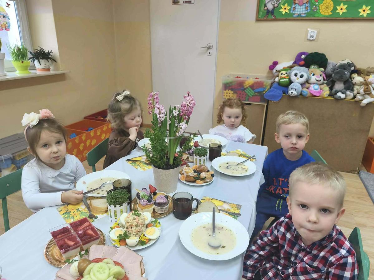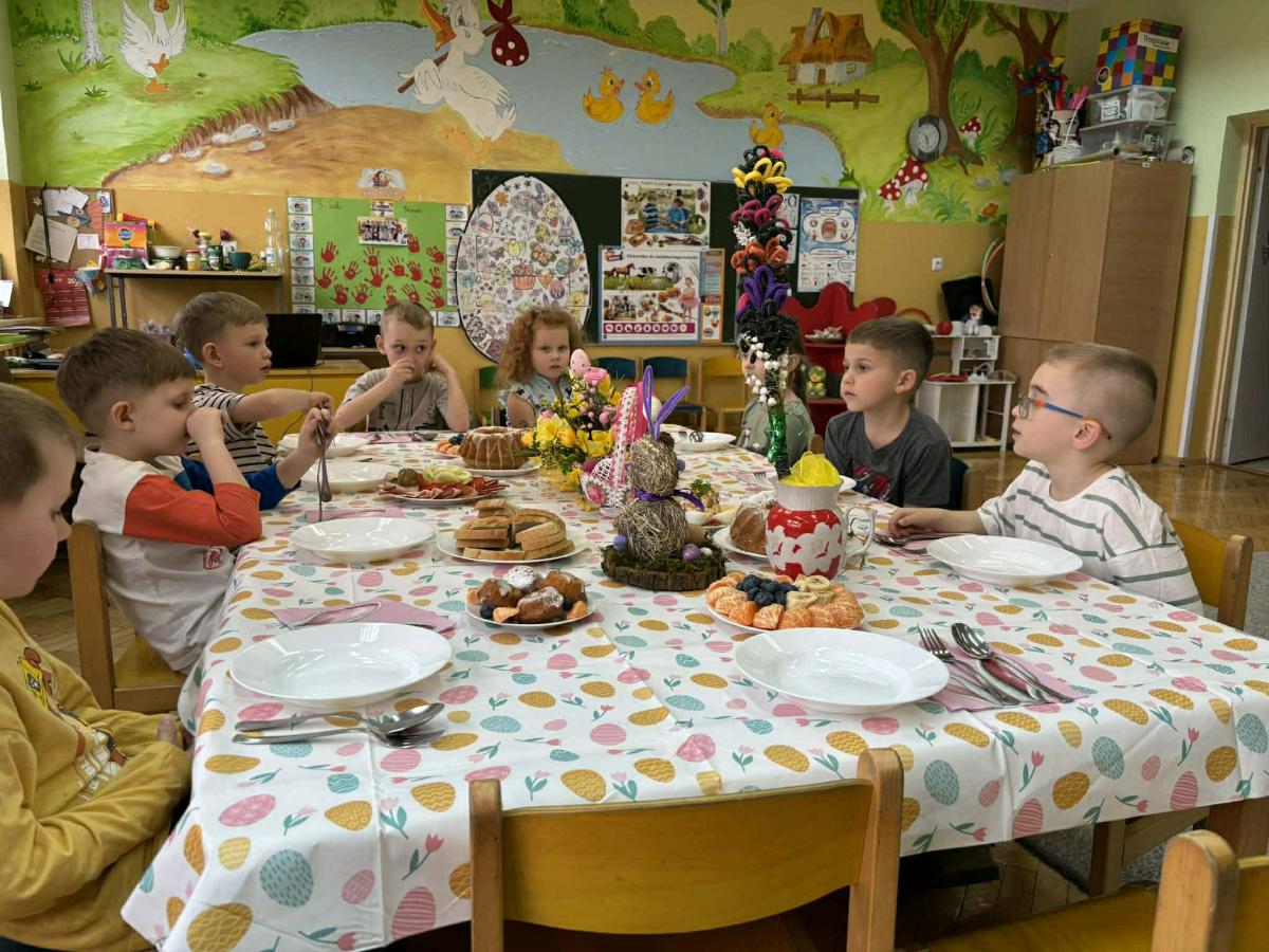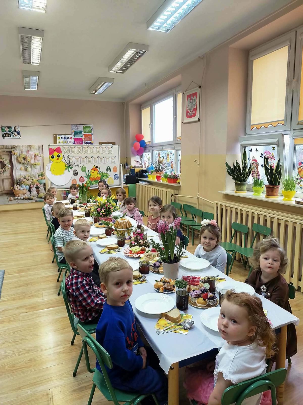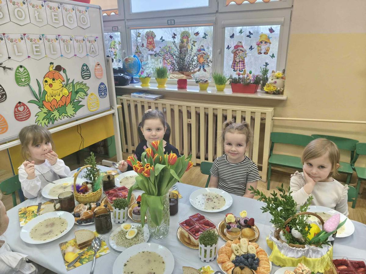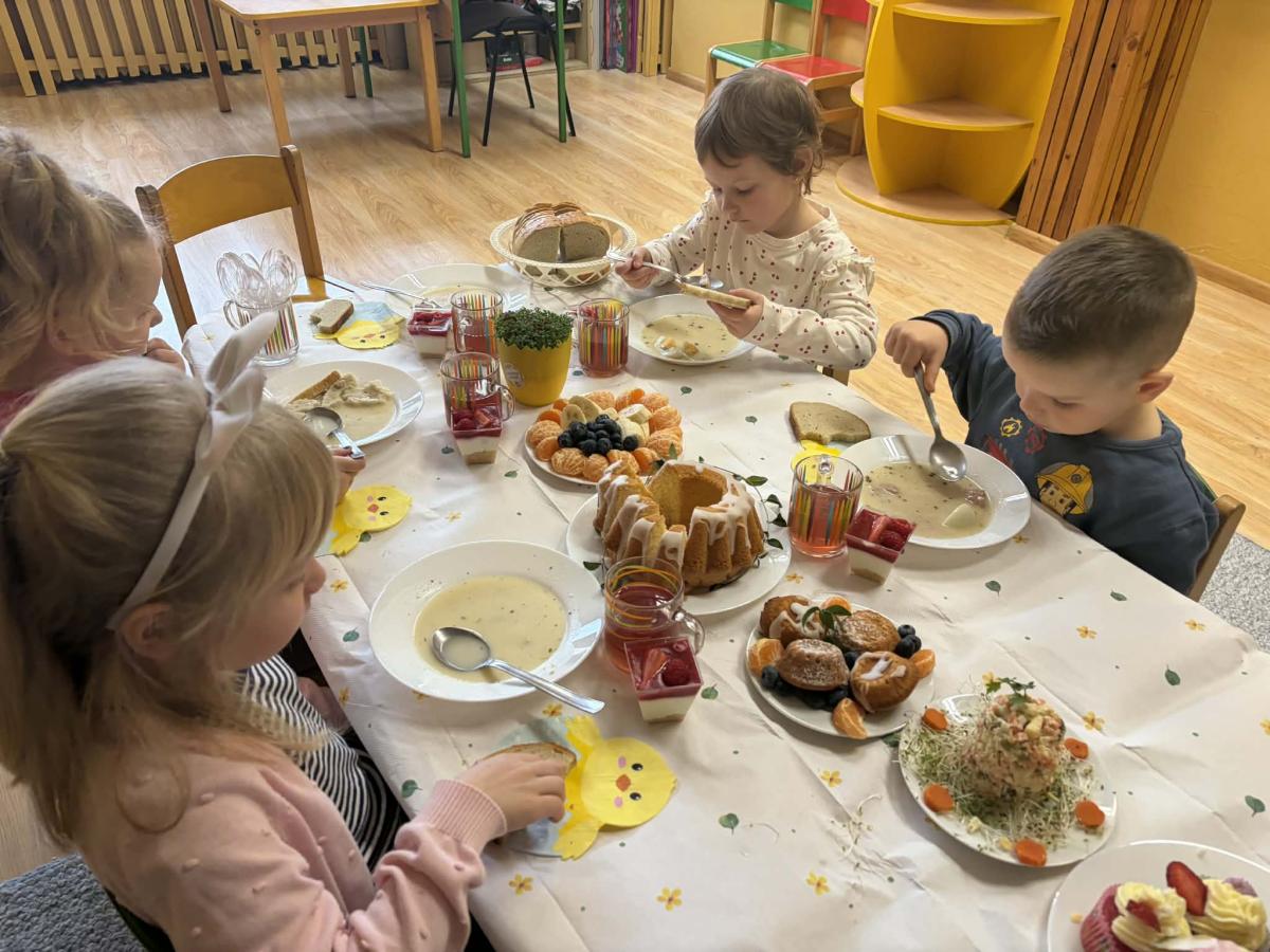 Tego dnia dzieci, nauczyciele przedszkola wspólnie zasiedli do pięknie udekorowanych stołów, pełnych tradycyjnych, wielkanocnych potraw m.in. barszczu białego z kiełbaską i jajkiem, pyszną sałatkę jarzynową, a także babkę wielkanocną i różnorodne słodkości.