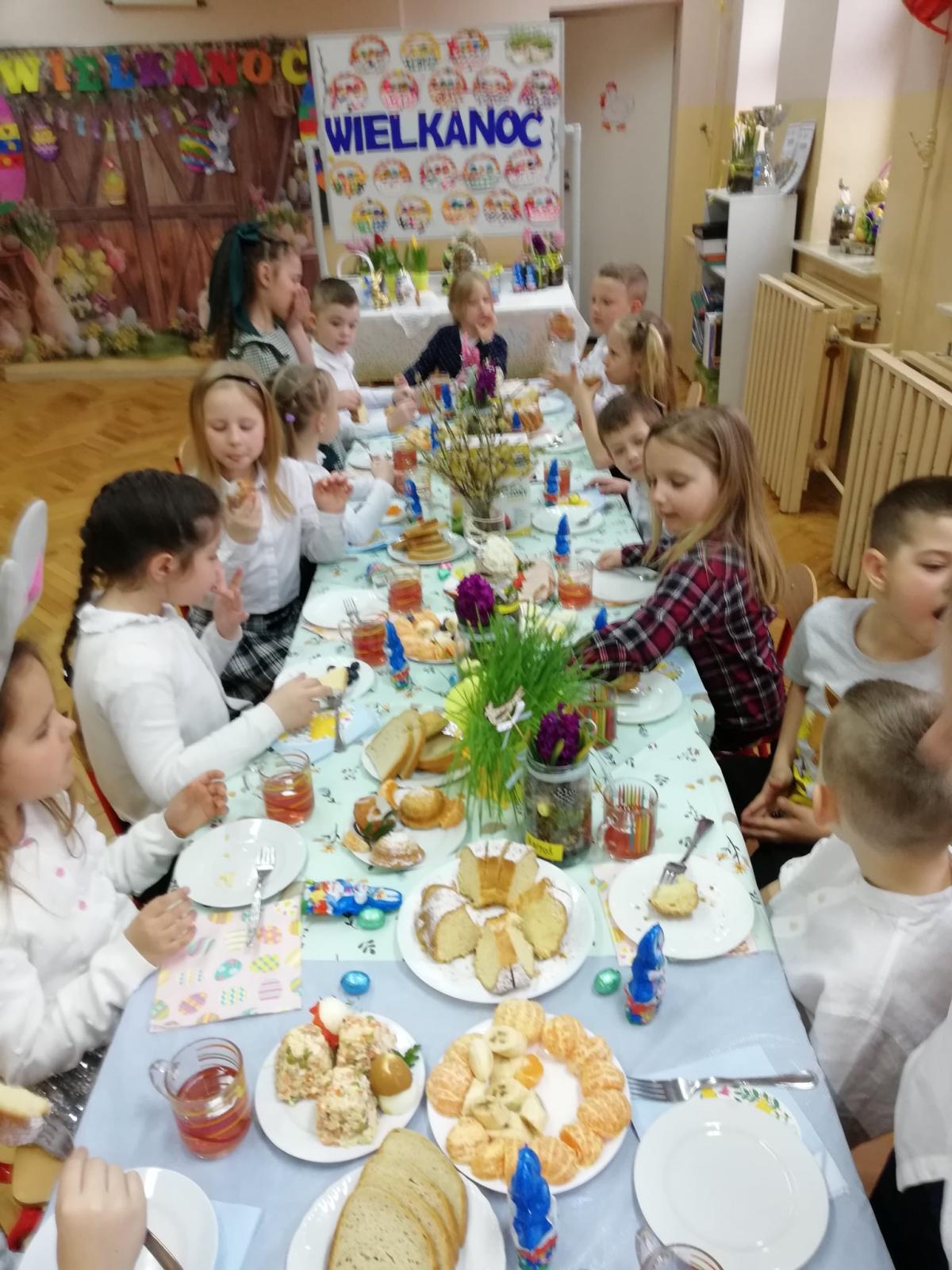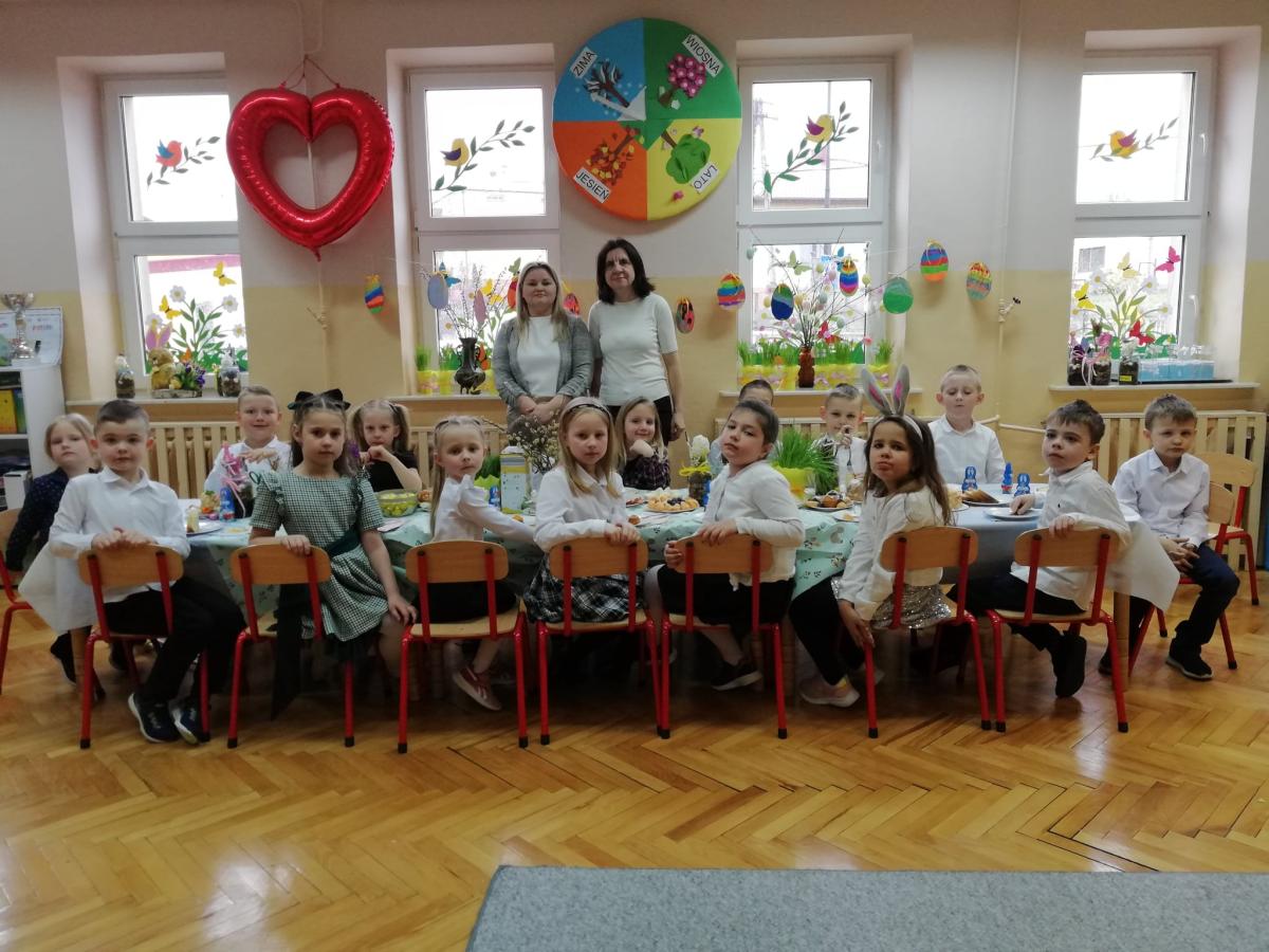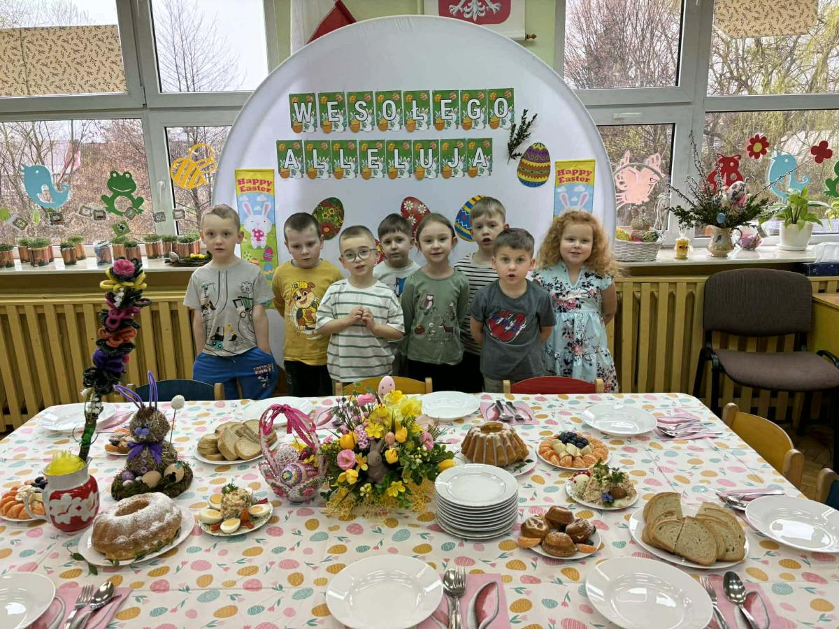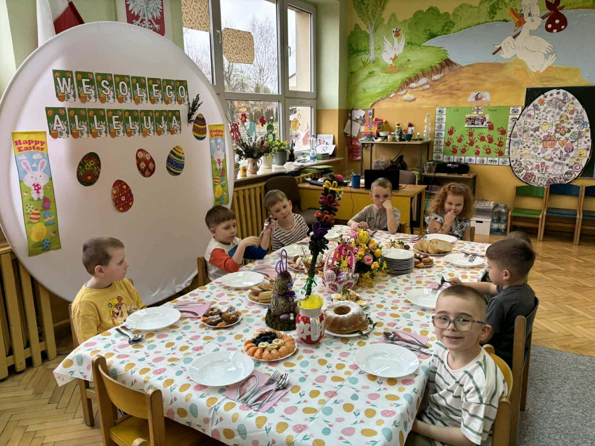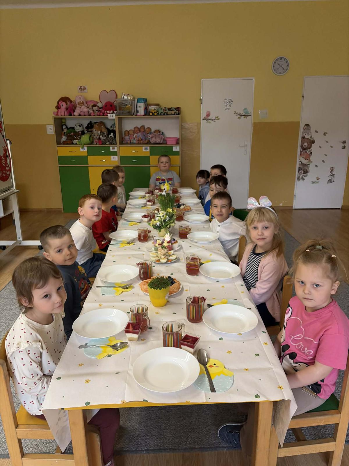 Tego dnia dzieci, nauczyciele przedszkola wspólnie zasiedli do pięknie udekorowanych stołów, pełnych tradycyjnych, wielkanocnych potraw m.in. barszczu białego z kiełbaską i jajkiem, pyszną sałatkę jarzynową, a także babkę wielkanocną i różnorodne słodkości.