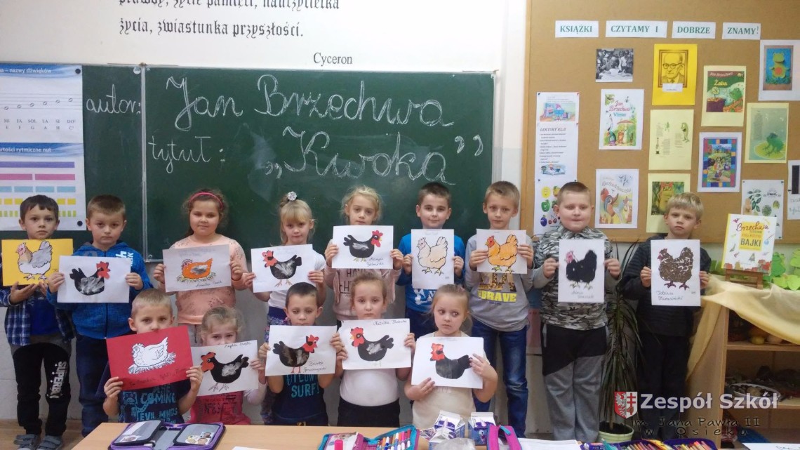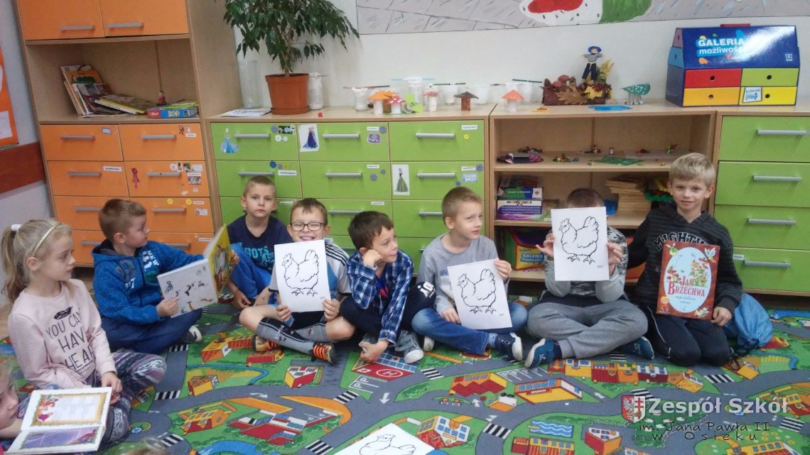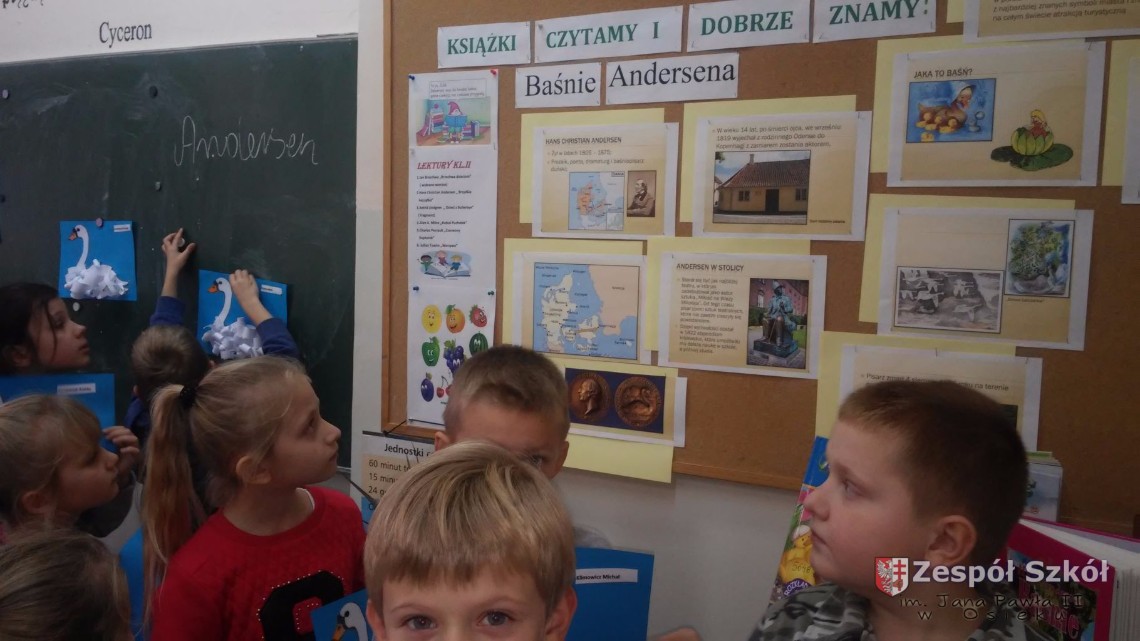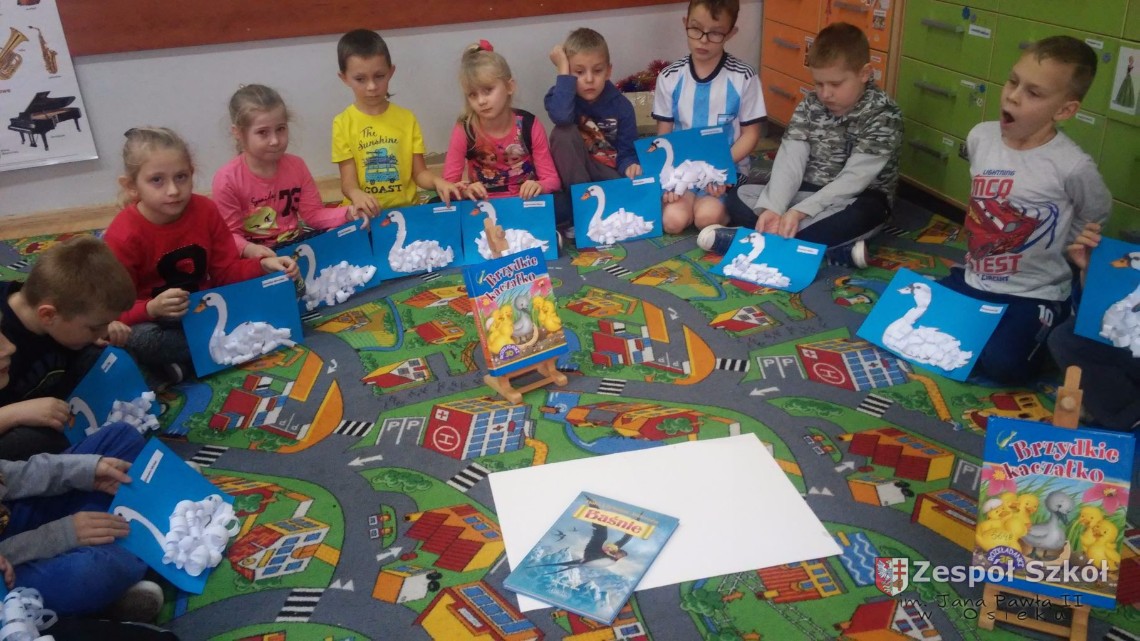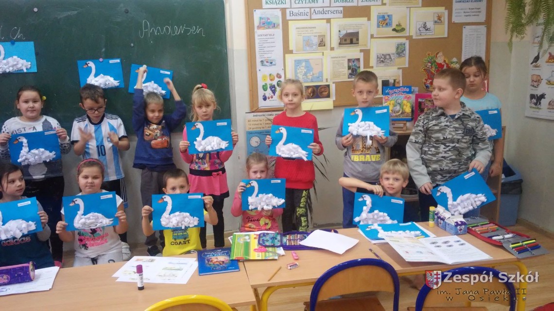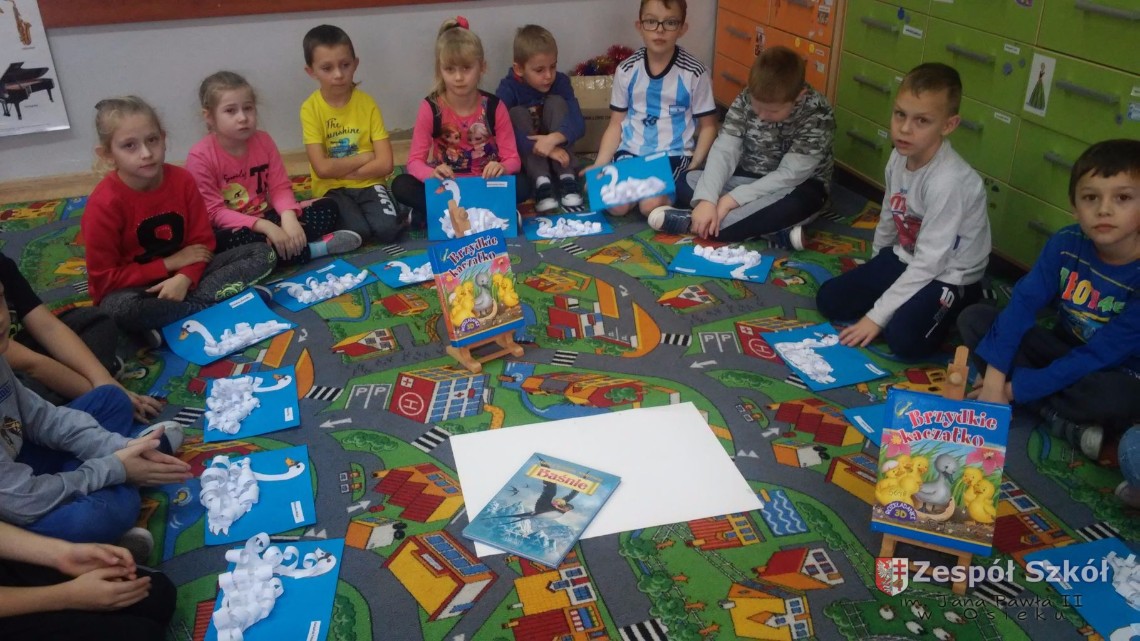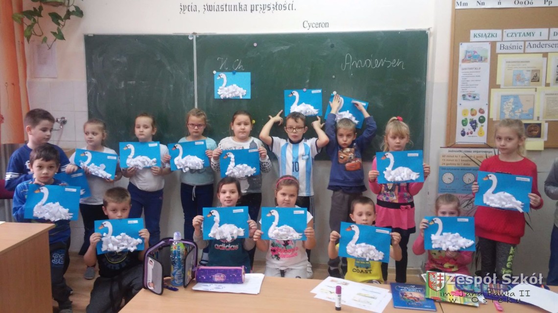 W ramach projektu „Upowszechnianie czytelnictwa i rozwijanie kompetencji czytelniczych wśród dzieci i młodzieży” klasa II A w miesiącu listopadzie czytała i omawiała kolejne wiersze Jana Brzechwy oraz lekturę H. Ch. Andersena pt. ,,Brzydkie kaczątko’’. Uczniowie chętnie wykonali pracę z papieru do wiersza pt. "Kwoka", a także wyklejali pięknego łabędzia do lektury "Brzydkie kaczątko". Projekt realizowany jest we współpracy z biblioteką szkolną.