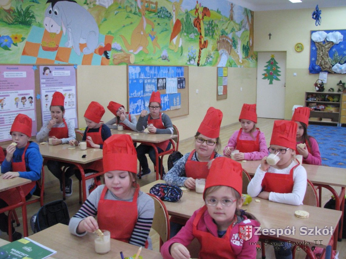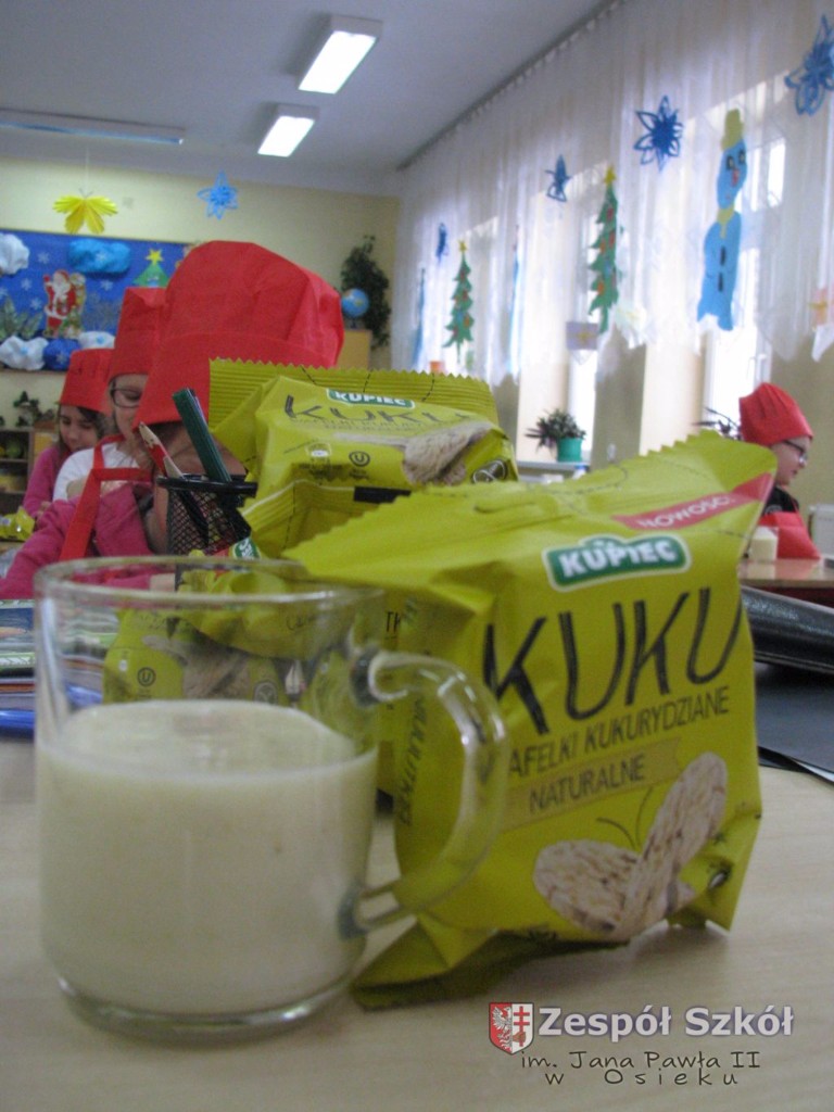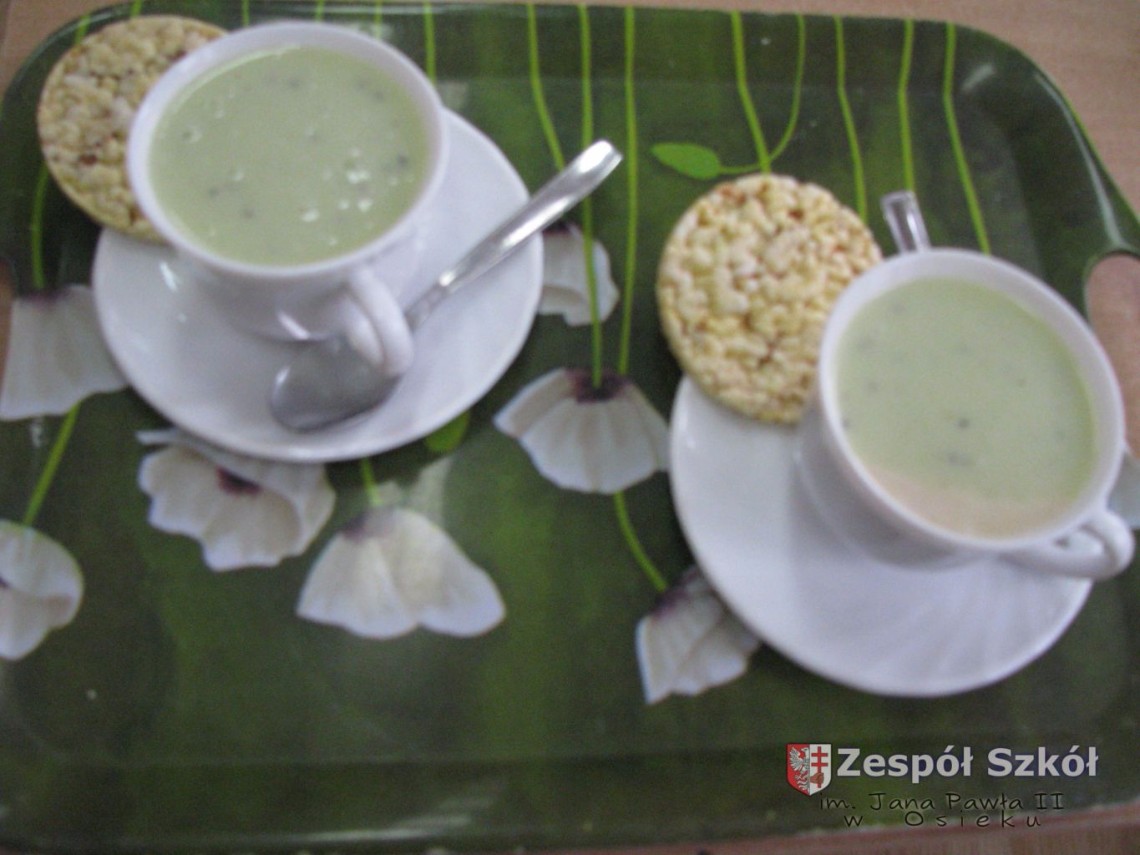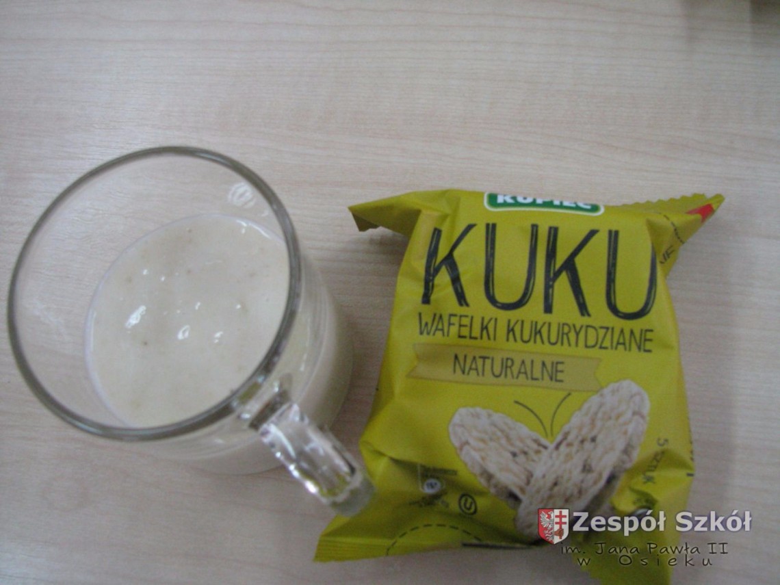 Po części teoretycznej uczniowie przystąpili do przygotowania zdrowego koktajlu na bazie maślanki naturalnej, kaszy jaglanej i świeżych owoców. Koktajl był bardzo dobry i zdrowy. Podany został z wafelkami kukurydzianymi KUKU.
