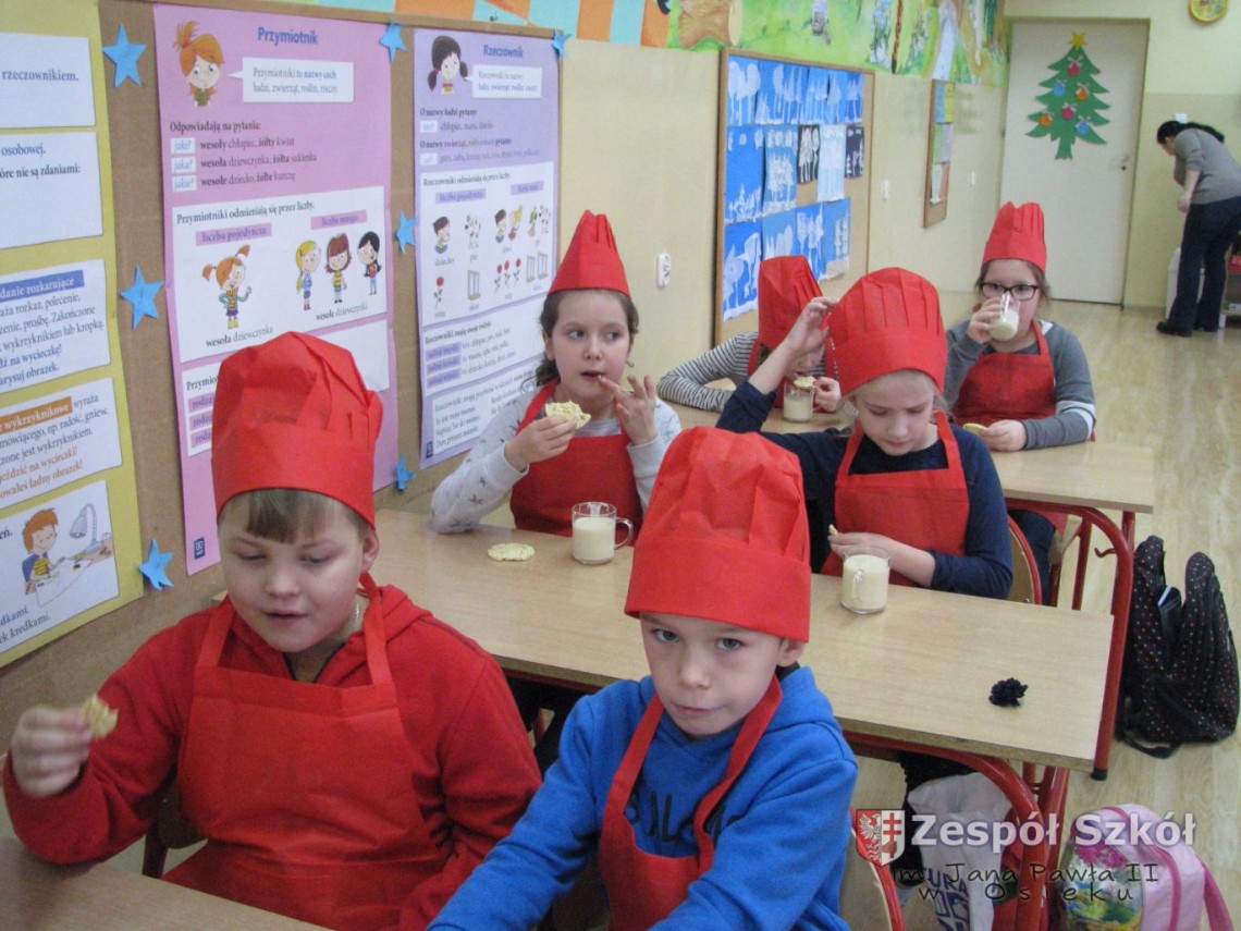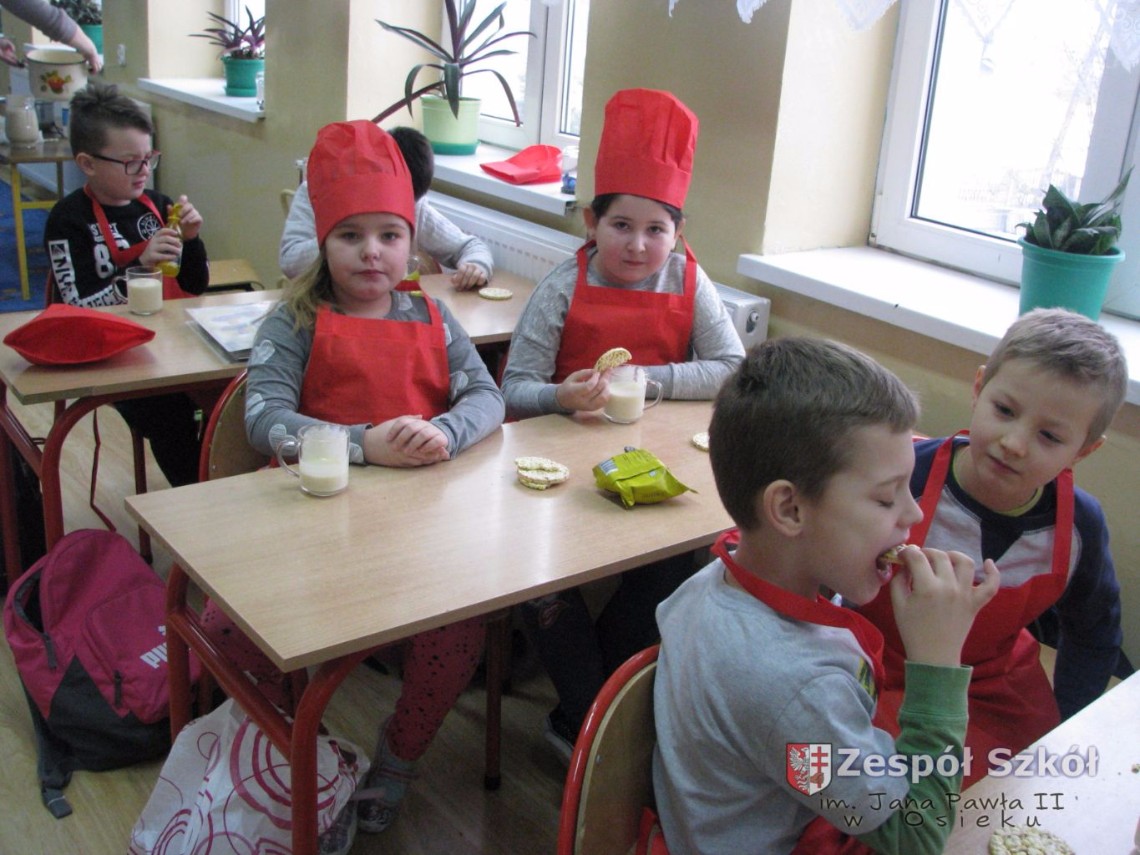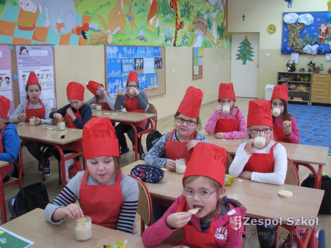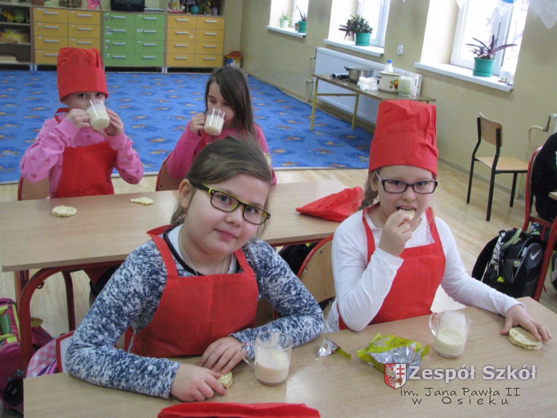 Po części teoretycznej uczniowie przystąpili do przygotowania zdrowego koktajlu na bazie maślanki naturalnej, kaszy jaglanej i świeżych owoców. Koktajl był bardzo dobry i zdrowy. Podany został z wafelkami kukurydzianymi KUKU.