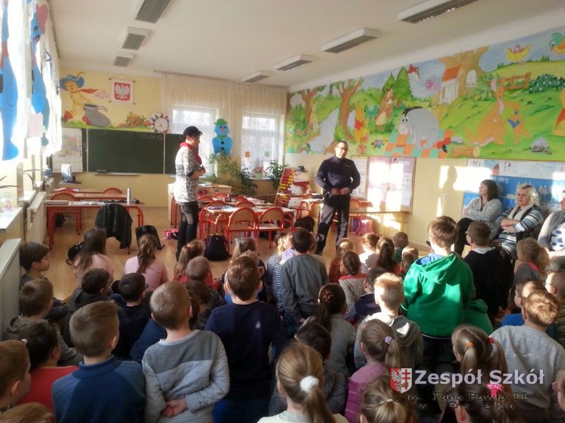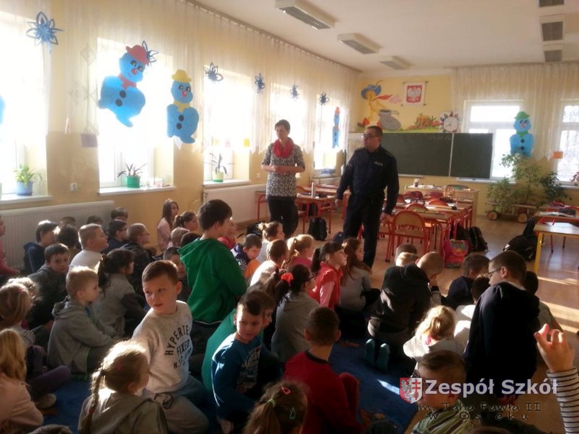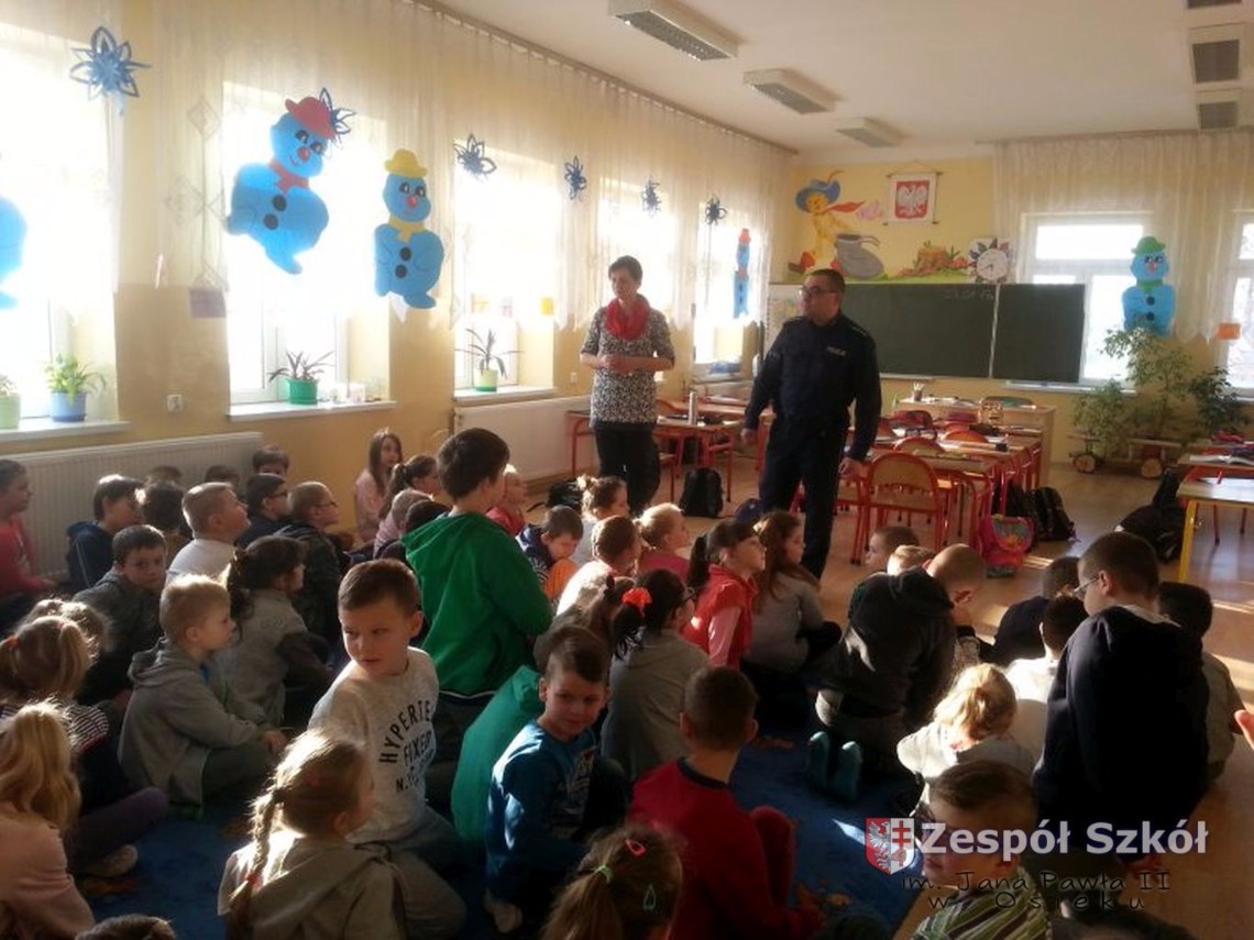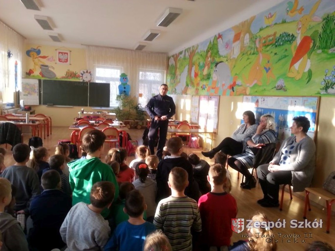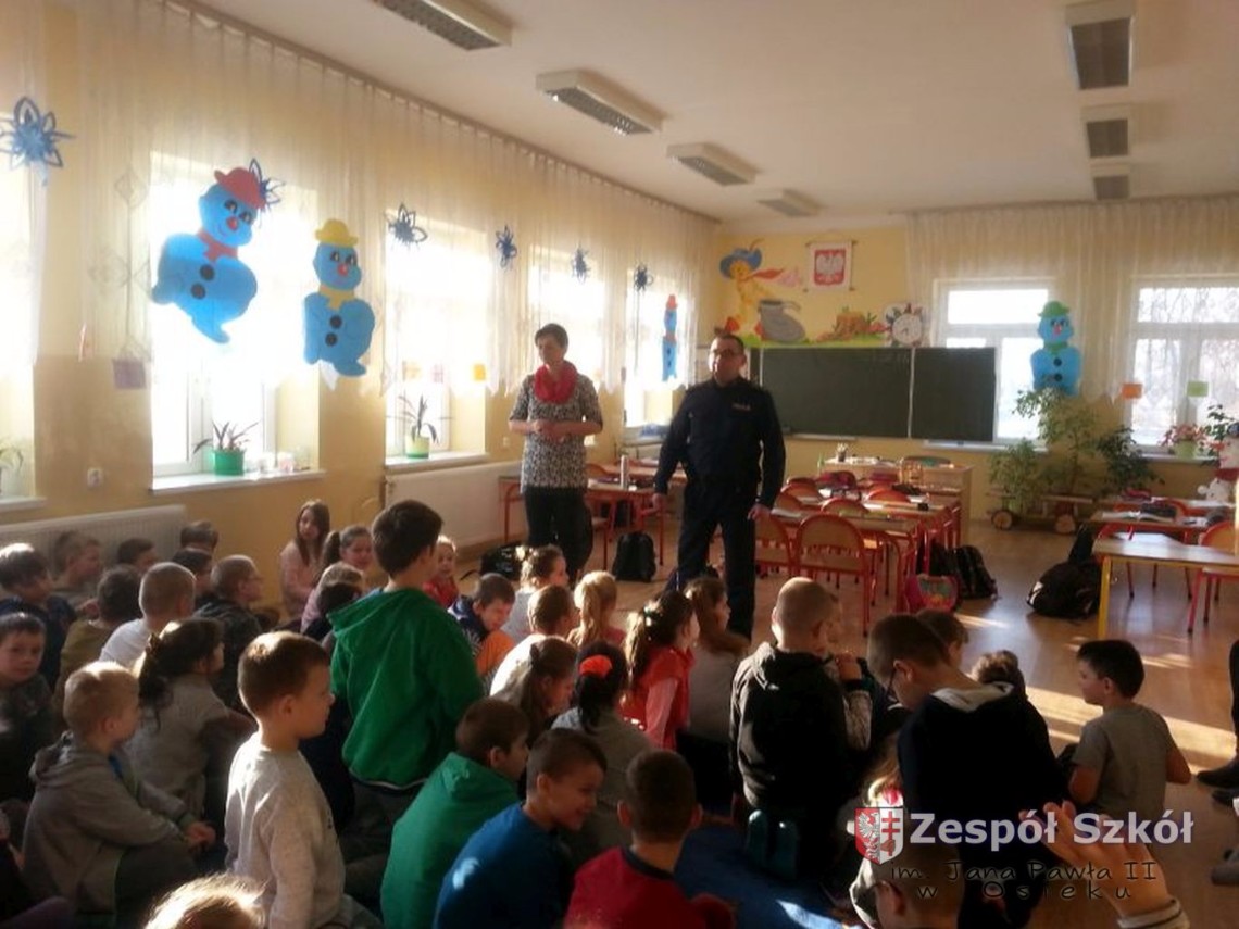 W dniu 27.01.2017 r. uczniowie z klas I-III uczestniczyli w spotkaniu z dzielnicowym asp. szt. Krzysztofem Kwiatkowskim. Głównym tematem pogadanki było bezpieczeństwo dzieci w czasie ferii zimowych m. in. zakaz korzystania z niestrzeżonych lodowisk, bezpieczny kulig, zabawa daleko od jezdni. Dzielnicowy przypomniał również dzieciom o noszeniu odblasków, ograniczeniu zaufania do nieznajomych i obowiązku przewożenia dzieci w foteliku. Jeżeli uczniowie będą pamiętali o powyższych zasadach ich ferie na pewno będą bezpieczne i udane.