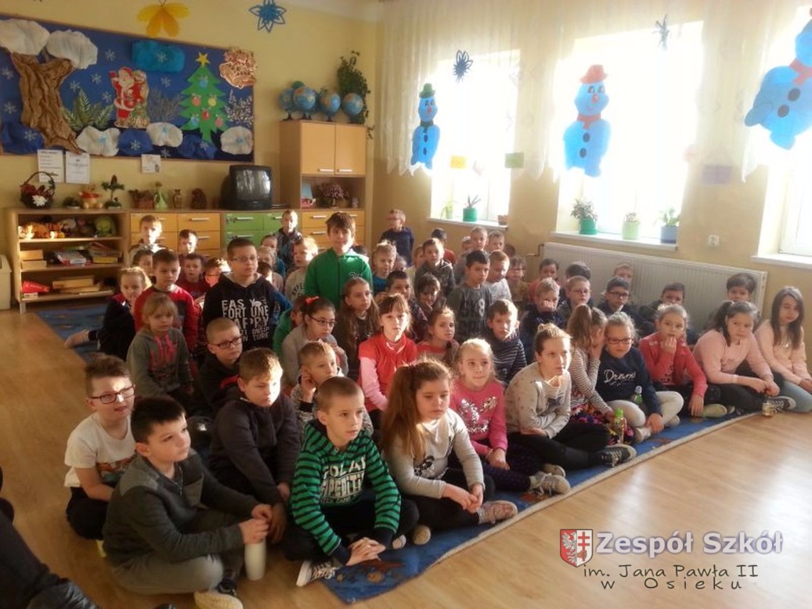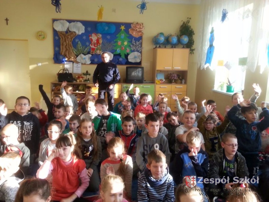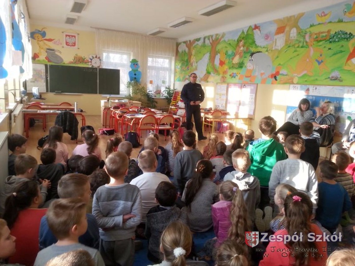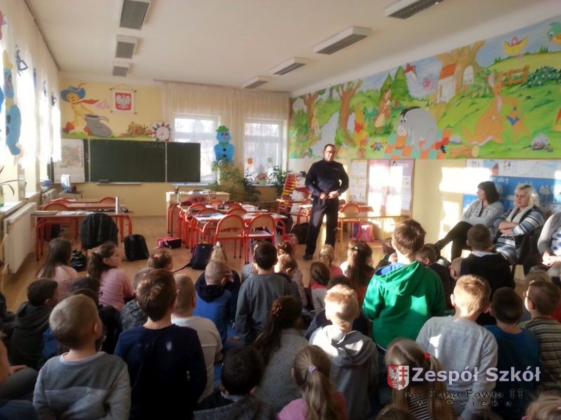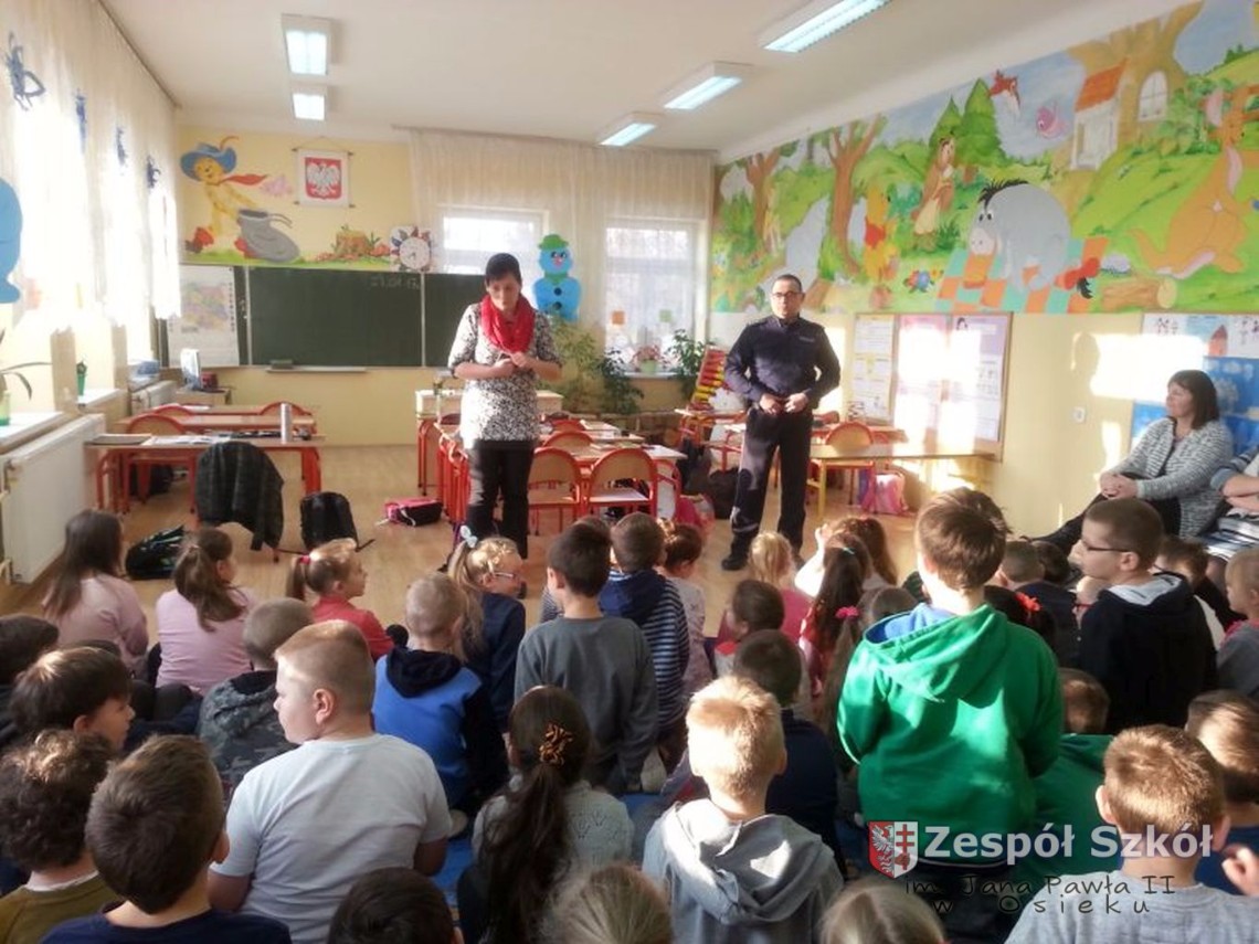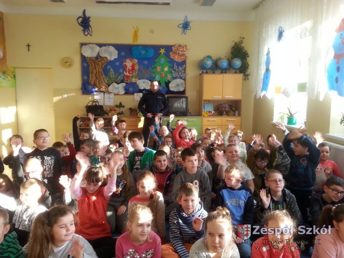 W dniu 27.01.2017 r. uczniowie z klas I-III uczestniczyli w spotkaniu z dzielnicowym asp. szt. Krzysztofem Kwiatkowskim. Głównym tematem pogadanki było bezpieczeństwo dzieci w czasie ferii zimowych m. in. zakaz korzystania z niestrzeżonych lodowisk, bezpieczny kulig, zabawa daleko od jezdni. Dzielnicowy przypomniał również dzieciom o noszeniu odblasków, ograniczeniu zaufania do nieznajomych i obowiązku przewożenia dzieci w foteliku. Jeżeli uczniowie będą pamiętali o powyższych zasadach ich ferie na pewno będą bezpieczne i udane.