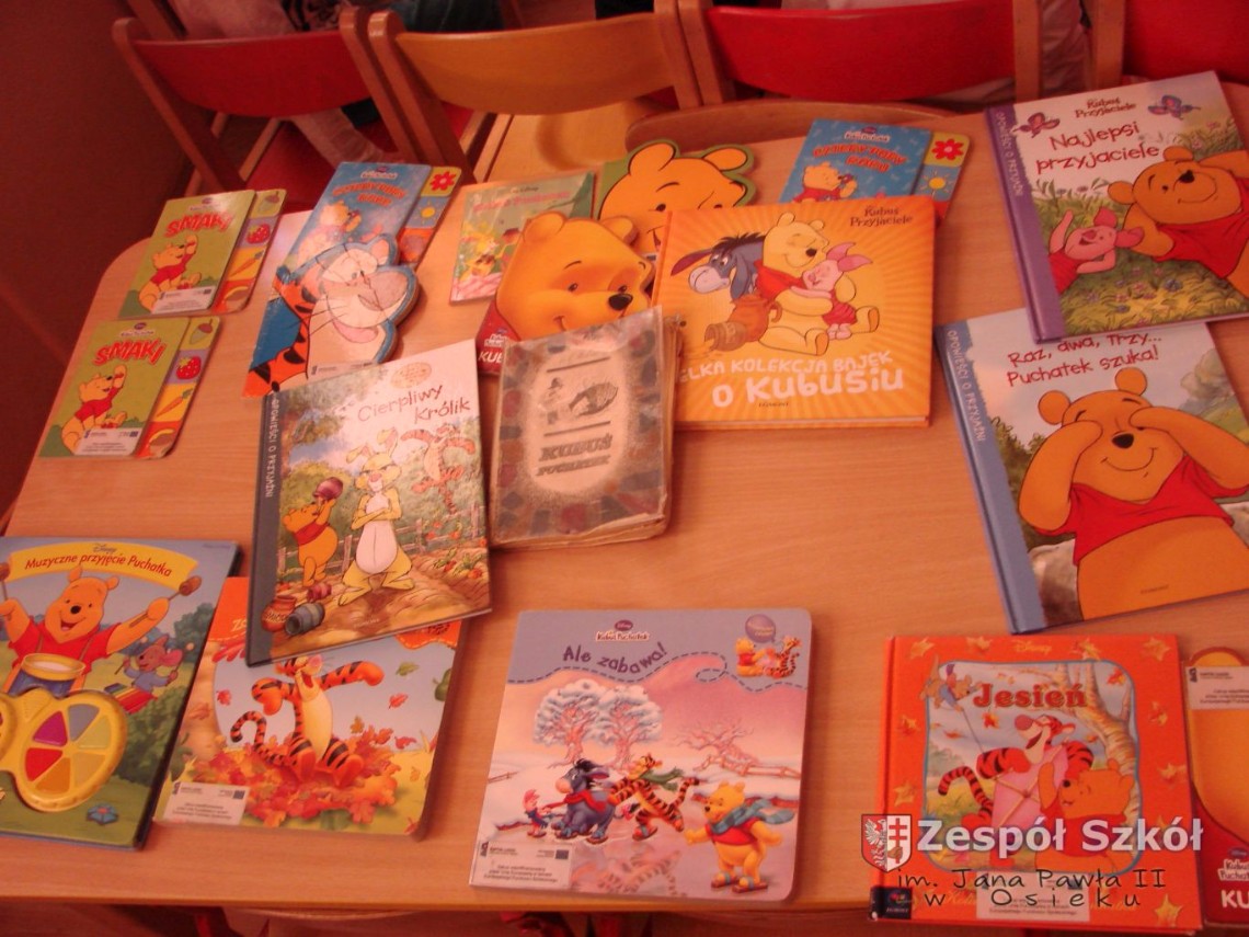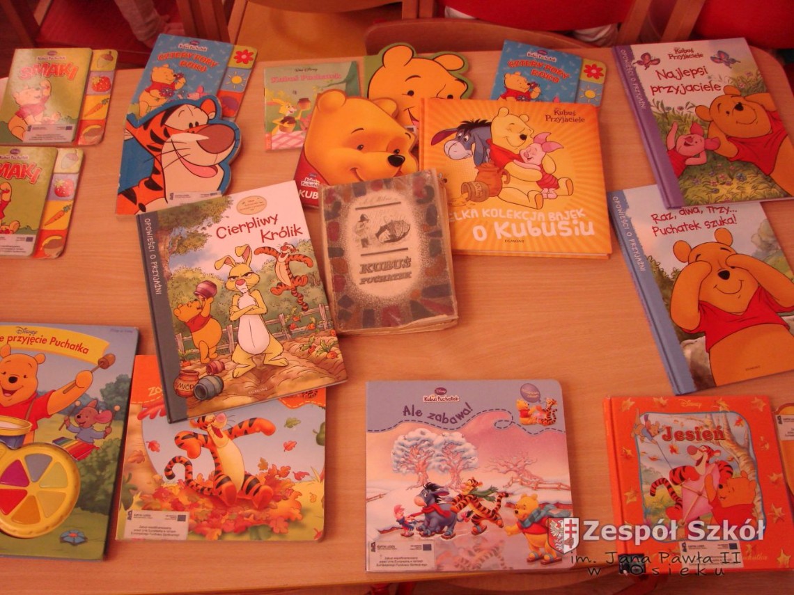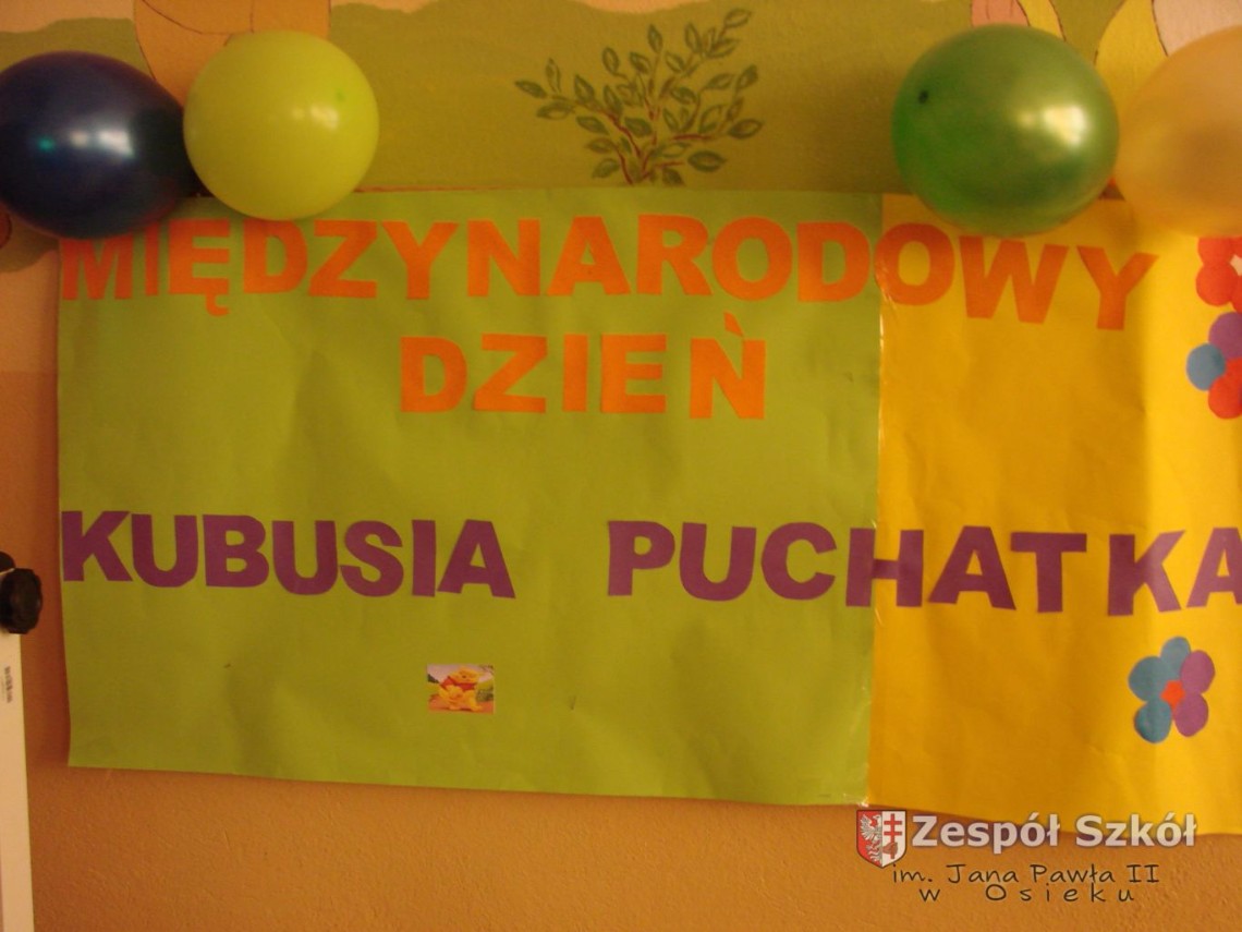 Dzieci przyniosły do Przedszkola pluszaki przedstawiające Kubusia Puchatka i jego przyjaciół. W tym dniu czekało na nich wiele ciekawych niespodzianek. Uczestniczyły w zajęciach pt: ,, Kubuś Puchatek - historia prawdziwej przyjaźni" przygotowanych i przeprowadzonych przez panią Małgorzatę Żyła. Nauczycielka zapoznała dzieci z prawdziwą historią powstania Kubusia Puchatka. Następnie zaprosiła dzieci do obejrzenia bajki z użyciem nowoczesnego sprzętu multimedialnego pt: ,, Kubuś Puchatek - prawdziwy przyjaciel" oraz do zabaw ruchowych przy piosence Kubusia Puchatka: ,, Kilku kumpli weź”.