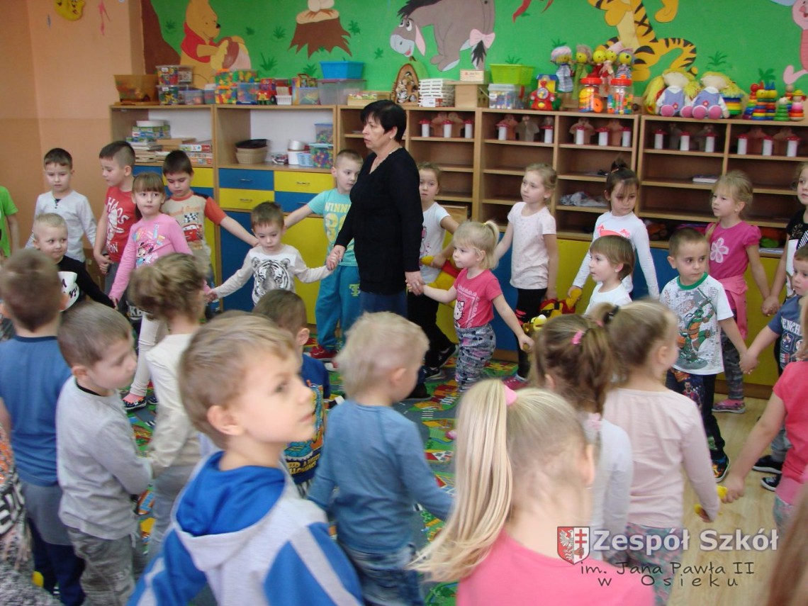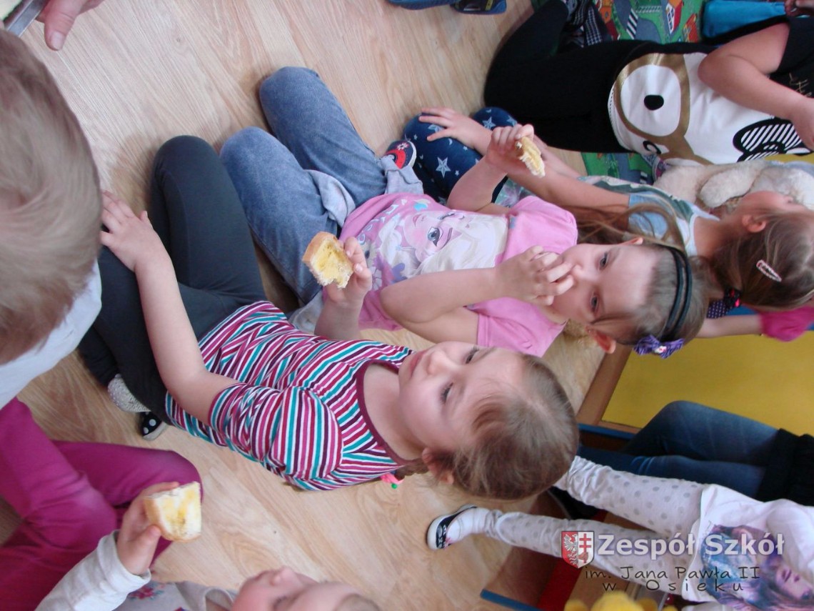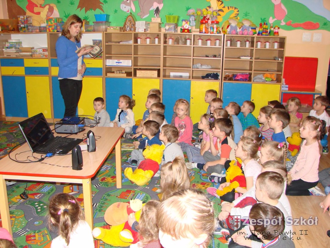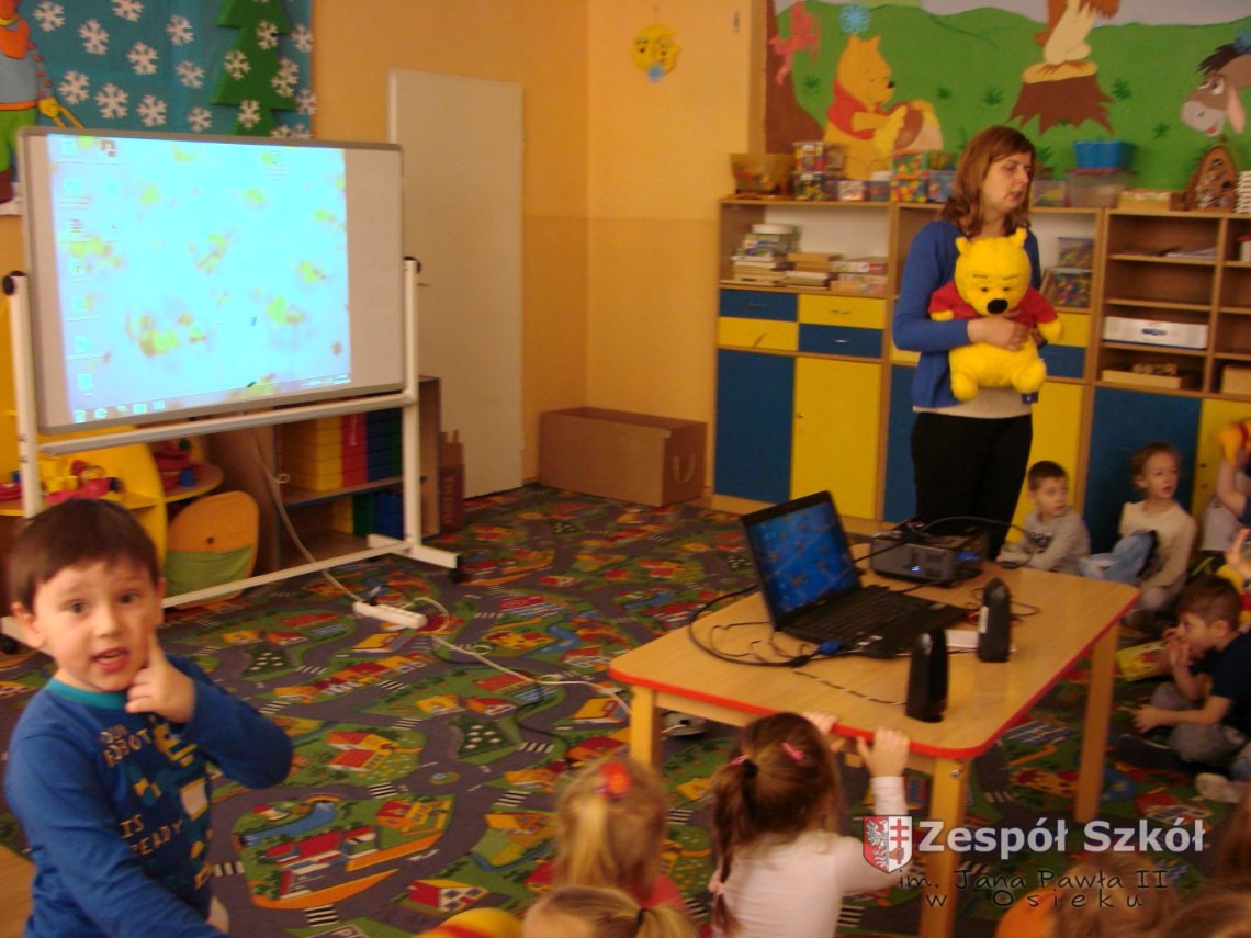 Dzieci przyniosły do Przedszkola pluszaki przedstawiające Kubusia Puchatka i jego przyjaciół. W tym dniu czekało na nich wiele ciekawych niespodzianek. Uczestniczyły w zajęciach pt: ,, Kubuś Puchatek - historia prawdziwej przyjaźni" przygotowanych i przeprowadzonych przez panią Małgorzatę Żyła. Nauczycielka zapoznała dzieci z prawdziwą historią powstania Kubusia Puchatka. Następnie zaprosiła dzieci do obejrzenia bajki z użyciem nowoczesnego sprzętu multimedialnego pt: ,, Kubuś Puchatek - prawdziwy przyjaciel" oraz do zabaw ruchowych przy piosence Kubusia Puchatka: ,, Kilku kumpli weź”.