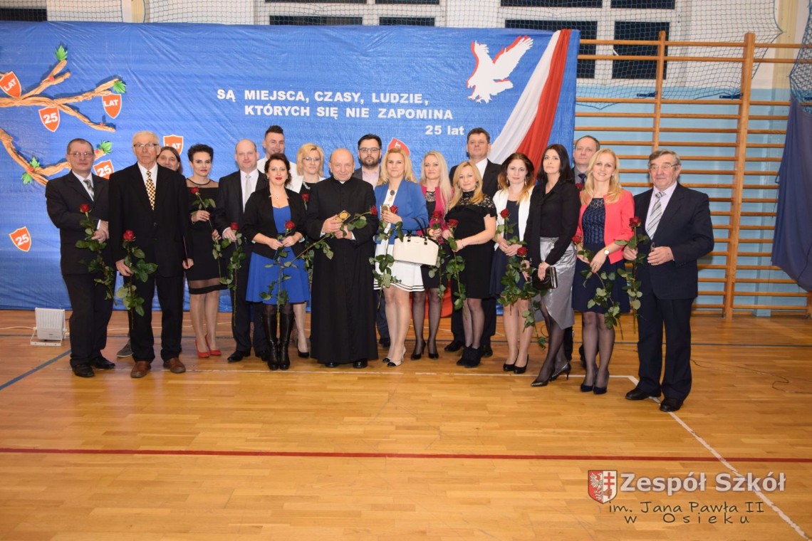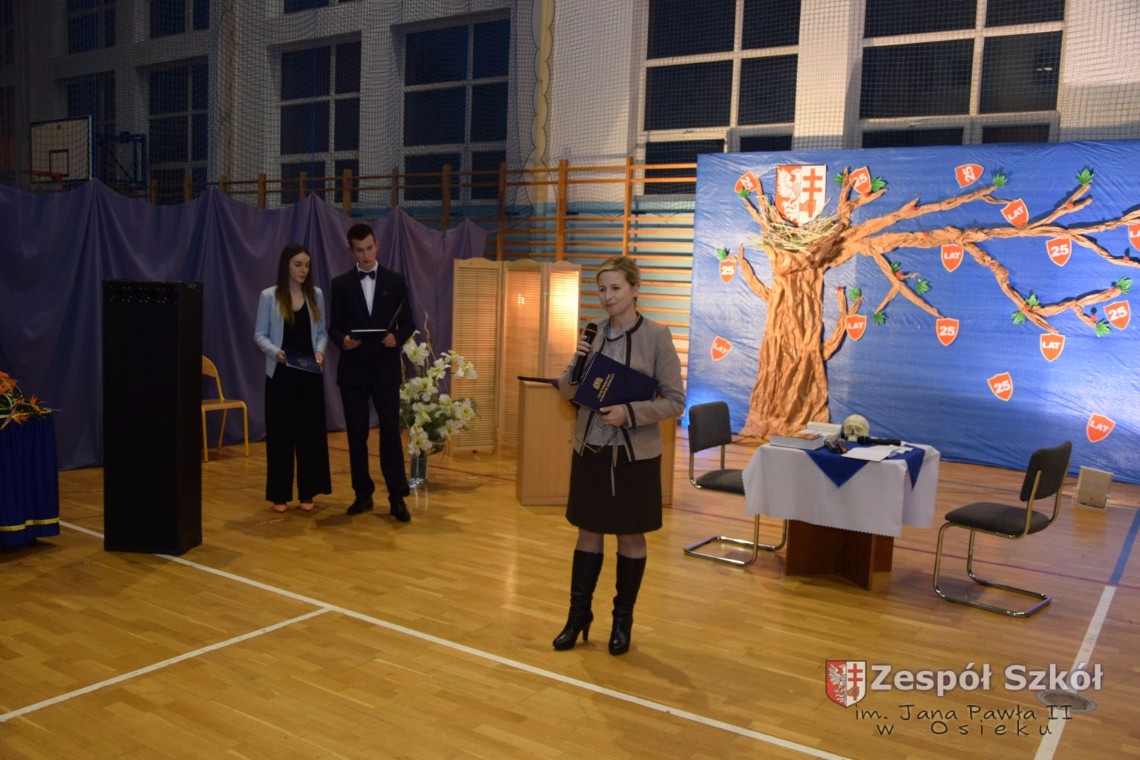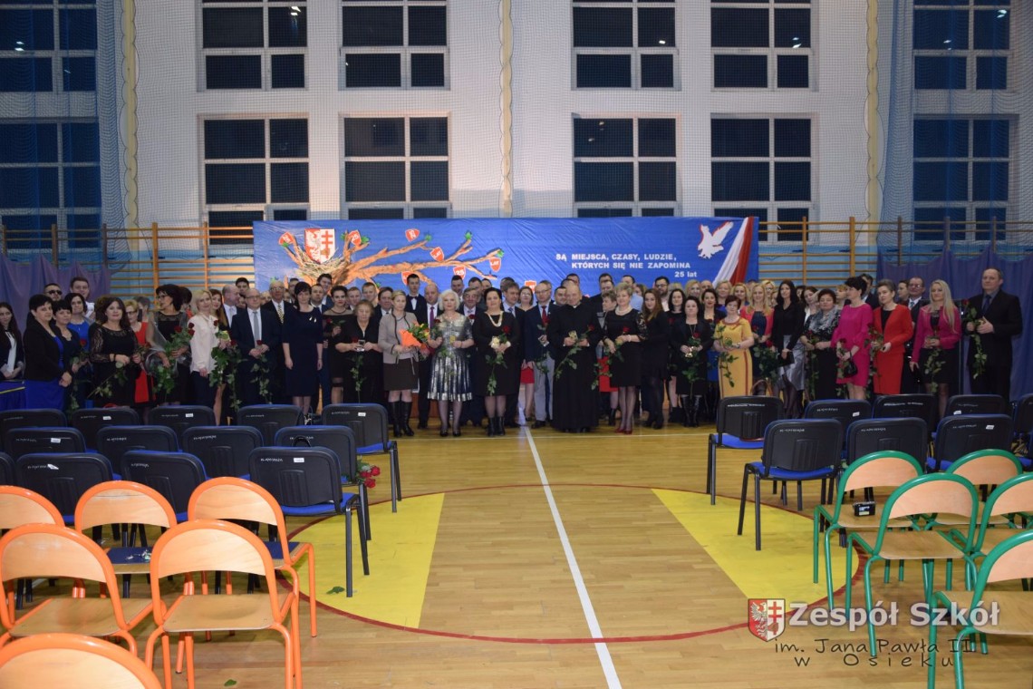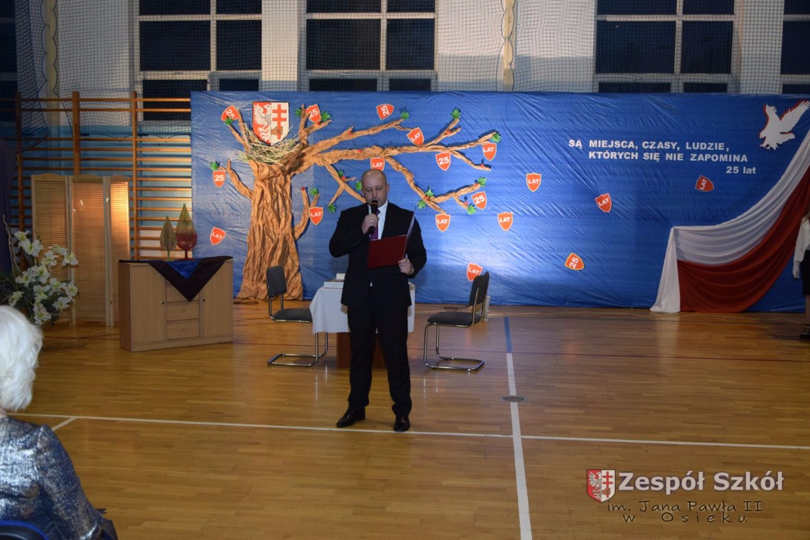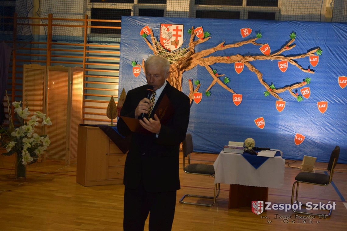 Obchody rozpoczęła msza święta w kościele parafialnym, po której uczestnicy na czele z pocztem sztandarowym przeszli do szkoły, gdzie odbyła się część oficjalna. Jako pierwsza głos zabrała dyrektor szkoły Małgorzata Kunowska, która powitała zaproszonych gości, a wśród nich: władze samorządowe, oświatowe, byłych dyrektorów, przedstawicieli Rady Rodziców, emerytowanych i czynnych nauczycieli oraz pracowników administracji i obsługi, a przede wszystkim absolwentów. Minutą ciszy uczestnicy wydarzenia uczcili pamięć pierwszego dyrektora szkoły Józefa Chmielowca, zmarłych pracowników i absolwentów. W swoim przemówieniu dyrektor Małgorzata Kunowska przywołała ćwierćwieczną historię Liceum Ogólnokształcącego, odwołując się do jego niepodważalnej roli w kształtowaniu klimatu małej ojczyzny. - Osieckie liceum nigdy nie było jedynie miejscem, instytucją dla środowiska lokalnego, ale przede wszystkim perełką, o którą należy dbać i którą należy rozwijać - mówiła dyrektor szkoły, która z dumą podkreśliła osiągnięcia uczniów i absolwentów. Po słowie wstępnym głos zabrali zaproszeni goście, a wśród nich między innymi burmistrz miasta i gminy Osiek Rafał Łysiak, który powiedział, że z wiarą patrzy w przyszłość liceum. Na uroczystości nie zabrakło poprzednich burmistrzów Osieka, którzy przybyli na uroczystość z pochlebnymi słowem dla szkoły i upominkami. Były burmistrz Jacenty Słodkowski przypomniał historię utworzenia i nadania imienia szkole, a Włodzimierz Wawrzkiewicz podziękował za zaproszenie i przekazał książki dla uczniów. Uczestnicy uroczystości z wielką nostalgią i wzruszeniem wsłuchiwali się we wspomnienia byłego dyrektora szkoły Stefana Nowaka. Następnie wizytator Anna Słoczyńska, skierowała słowa uznania dla nauczycieli i uczniów oraz odczytała list Świętokrzyskiego Kuratora Oświaty Kazimierza Mądzika. Wśród zabierających głos nie zabrakło przedstawicieli Rady Rodziców Marty Kicińskiej i Anety Kicińskiej oraz przedstawicieli absolwentów: Patrycji Obary, Mariusza Tworka, Dominika Ociepki, którzy na ręce Dyrektor Szkoły Pani Małgorzaty Kunowskiej złożyli wiązankę kwiatów oraz przekazali Pamiątkową Tablicę Jubileuszu 25 – lecia Liceum Ogólnokształcącego w Osieku z mottem: „To, co otrzymałem w latach szkolnych, do dzisiaj owocuje w moim życiu.” Jan Paweł II.