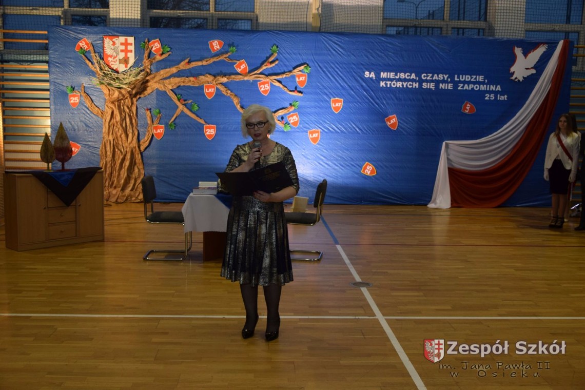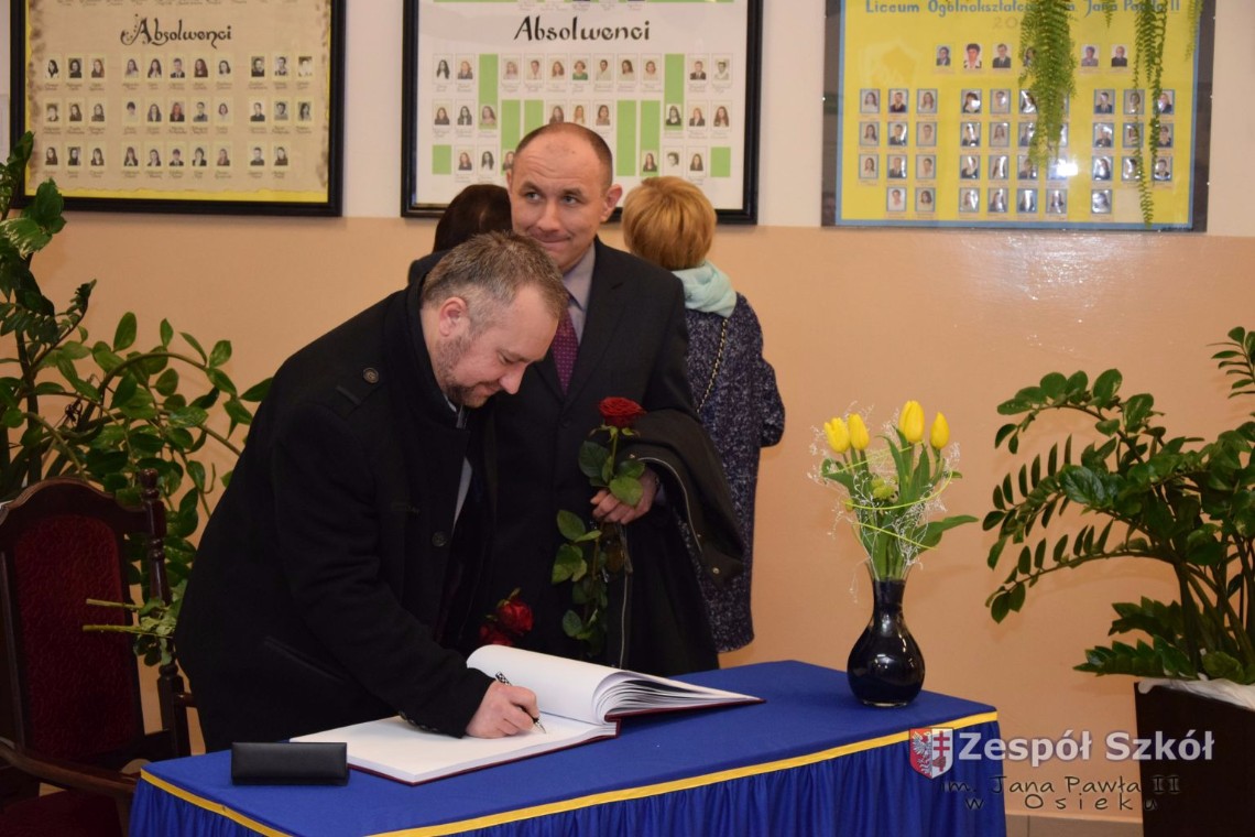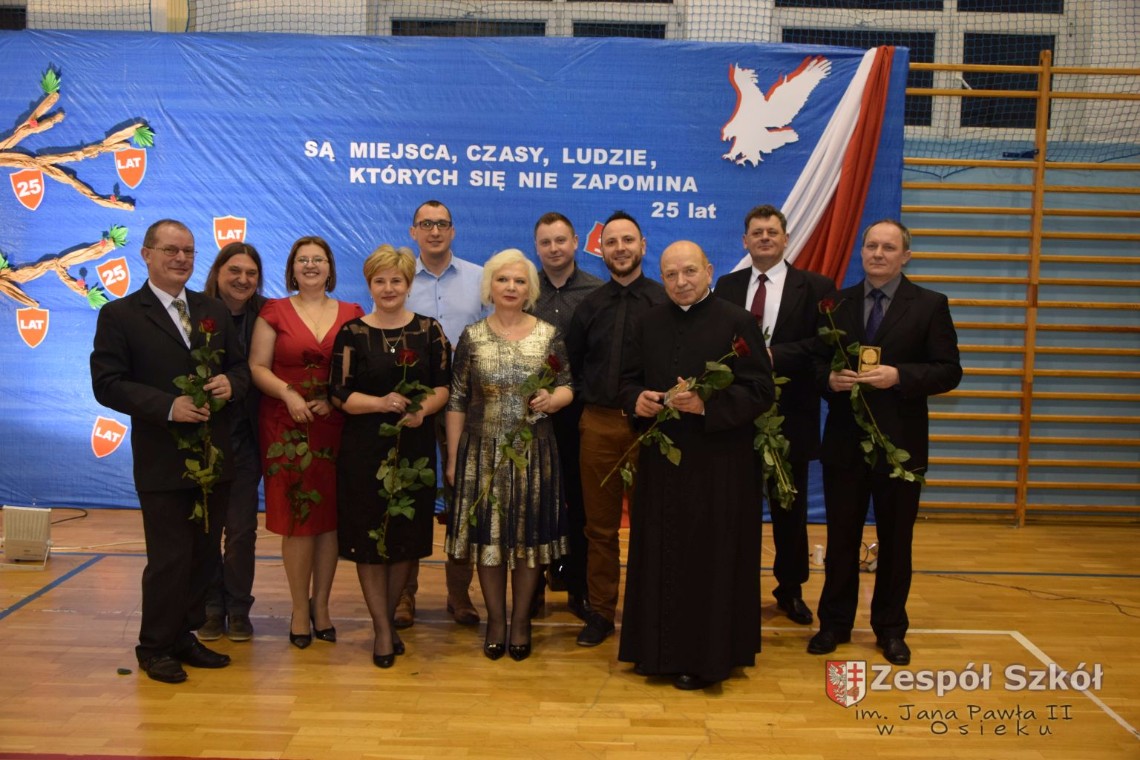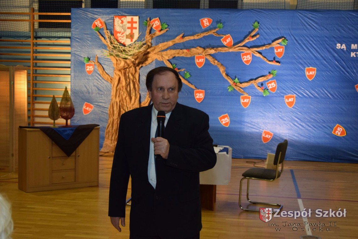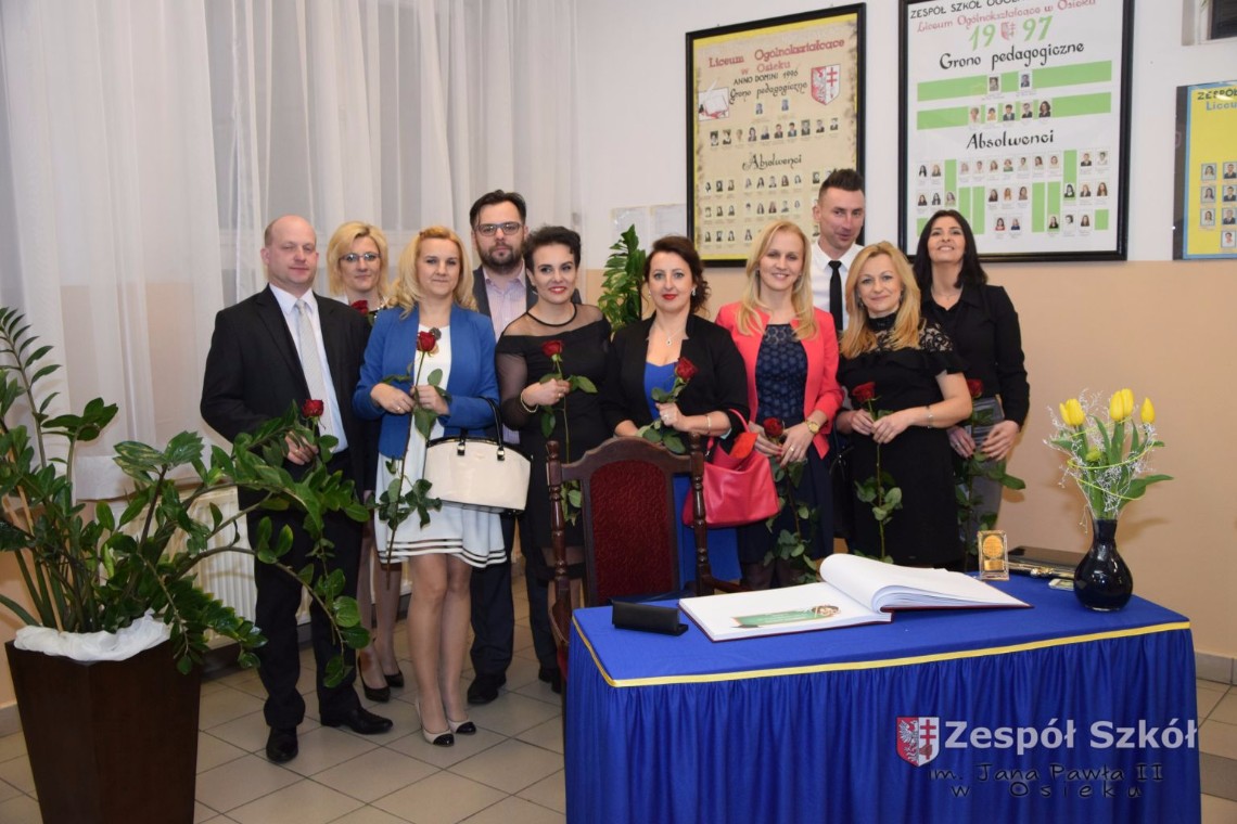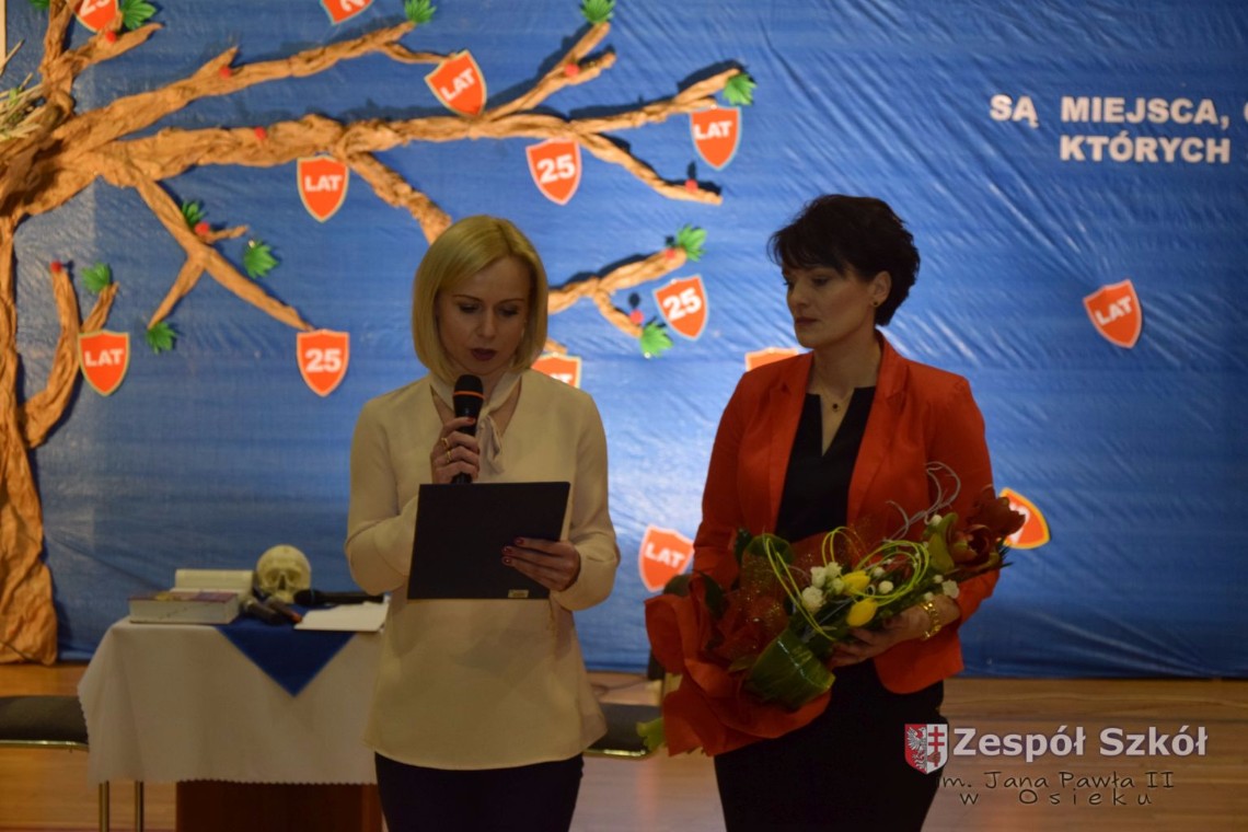 Obchody rozpoczęła msza święta w kościele parafialnym, po której uczestnicy na czele z pocztem sztandarowym przeszli do szkoły, gdzie odbyła się część oficjalna. Jako pierwsza głos zabrała dyrektor szkoły Małgorzata Kunowska, która powitała zaproszonych gości, a wśród nich: władze samorządowe, oświatowe, byłych dyrektorów, przedstawicieli Rady Rodziców, emerytowanych i czynnych nauczycieli oraz pracowników administracji i obsługi, a przede wszystkim absolwentów. Minutą ciszy uczestnicy wydarzenia uczcili pamięć pierwszego dyrektora szkoły Józefa Chmielowca, zmarłych pracowników i absolwentów. W swoim przemówieniu dyrektor Małgorzata Kunowska przywołała ćwierćwieczną historię Liceum Ogólnokształcącego, odwołując się do jego niepodważalnej roli w kształtowaniu klimatu małej ojczyzny. - Osieckie liceum nigdy nie było jedynie miejscem, instytucją dla środowiska lokalnego, ale przede wszystkim perełką, o którą należy dbać i którą należy rozwijać - mówiła dyrektor szkoły, która z dumą podkreśliła osiągnięcia uczniów i absolwentów. Po słowie wstępnym głos zabrali zaproszeni goście, a wśród nich między innymi burmistrz miasta i gminy Osiek Rafał Łysiak, który powiedział, że z wiarą patrzy w przyszłość liceum. Na uroczystości nie zabrakło poprzednich burmistrzów Osieka, którzy przybyli na uroczystość z pochlebnymi słowem dla szkoły i upominkami. Były burmistrz Jacenty Słodkowski przypomniał historię utworzenia i nadania imienia szkole, a Włodzimierz Wawrzkiewicz podziękował za zaproszenie i przekazał książki dla uczniów. Uczestnicy uroczystości z wielką nostalgią i wzruszeniem wsłuchiwali się we wspomnienia byłego dyrektora szkoły Stefana Nowaka. Następnie wizytator Anna Słoczyńska, skierowała słowa uznania dla nauczycieli i uczniów oraz odczytała list Świętokrzyskiego Kuratora Oświaty Kazimierza Mądzika. Wśród zabierających głos nie zabrakło przedstawicieli Rady Rodziców Marty Kicińskiej i Anety Kicińskiej oraz przedstawicieli absolwentów: Patrycji Obary, Mariusza Tworka, Dominika Ociepki, którzy na ręce Dyrektor Szkoły Pani Małgorzaty Kunowskiej złożyli wiązankę kwiatów oraz przekazali Pamiątkową Tablicę Jubileuszu 25 – lecia Liceum Ogólnokształcącego w Osieku z mottem: „To, co otrzymałem w latach szkolnych, do dzisiaj owocuje w moim życiu.” Jan Paweł II.