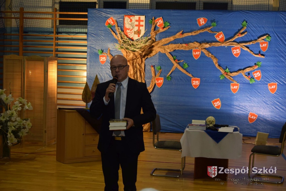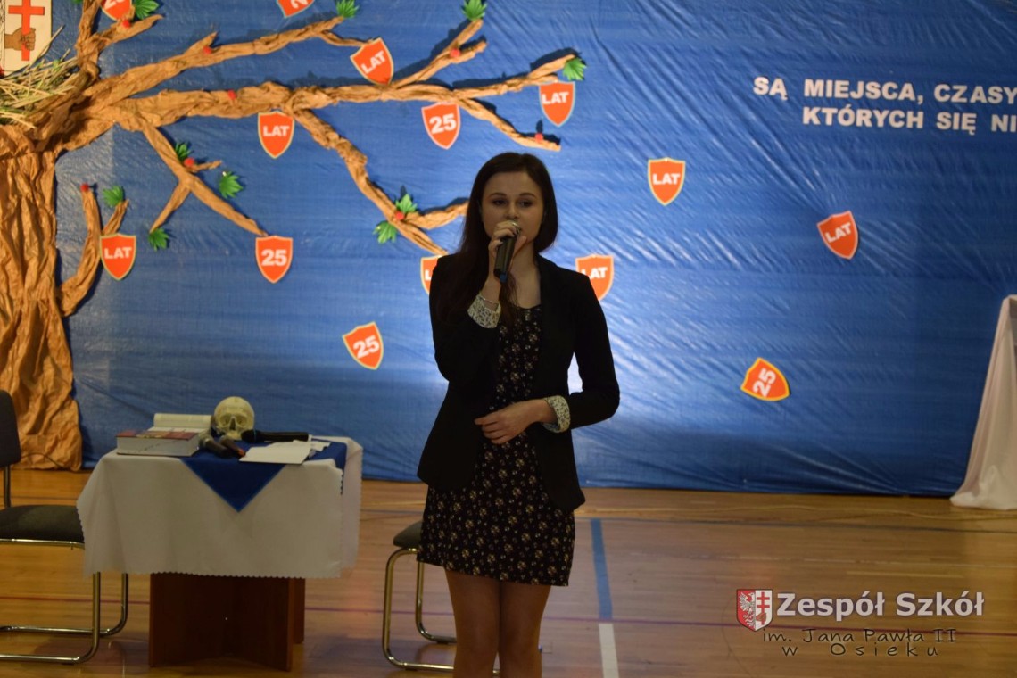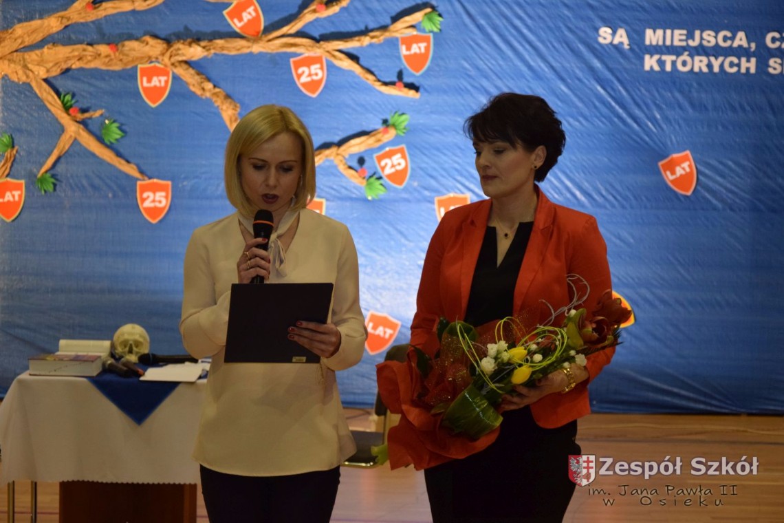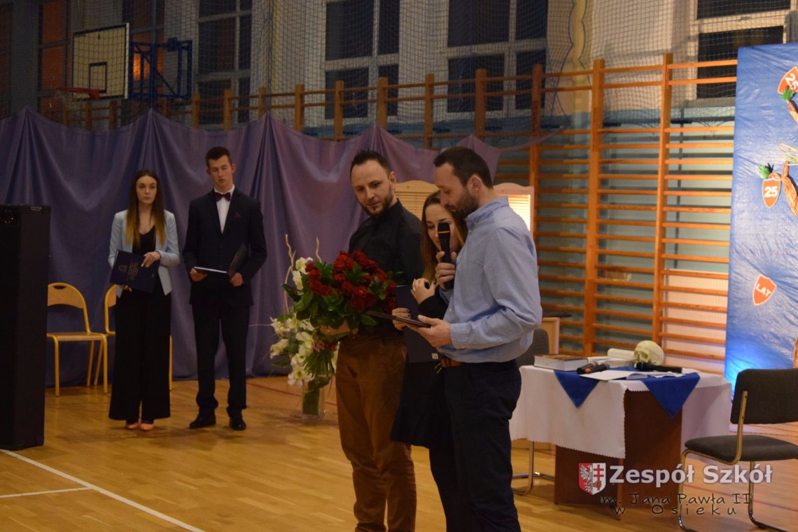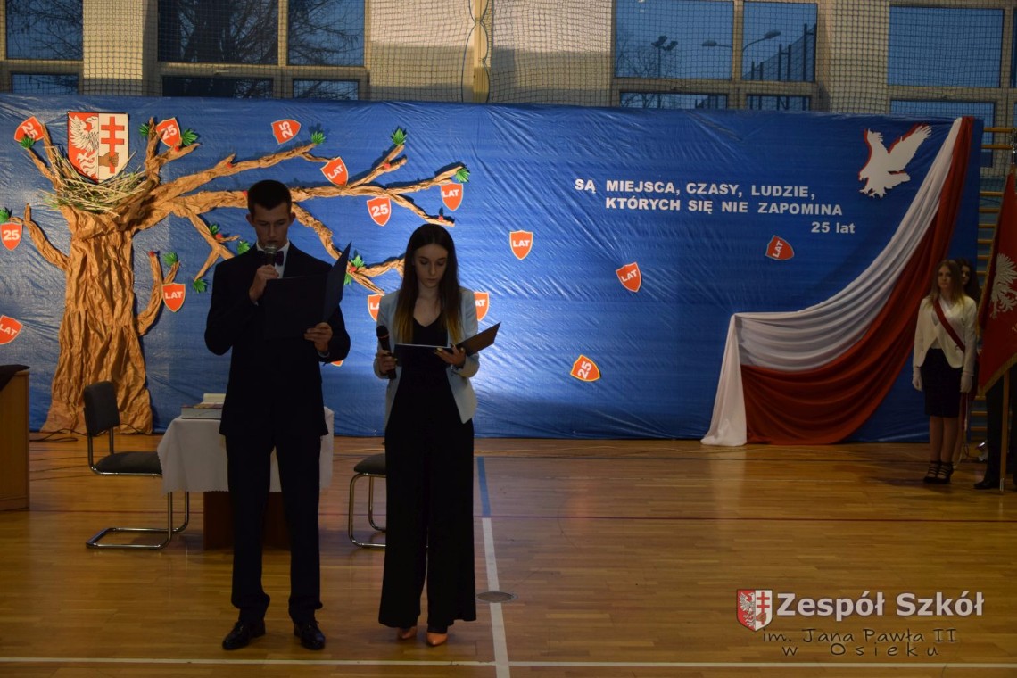 Obchody rozpoczęła msza święta w kościele parafialnym, po której uczestnicy na czele z pocztem sztandarowym przeszli do szkoły, gdzie odbyła się część oficjalna. Jako pierwsza głos zabrała dyrektor szkoły Małgorzata Kunowska, która powitała zaproszonych gości, a wśród nich: władze samorządowe, oświatowe, byłych dyrektorów, przedstawicieli Rady Rodziców, emerytowanych i czynnych nauczycieli oraz pracowników administracji i obsługi, a przede wszystkim absolwentów. Minutą ciszy uczestnicy wydarzenia uczcili pamięć pierwszego dyrektora szkoły Józefa Chmielowca, zmarłych pracowników i absolwentów. W swoim przemówieniu dyrektor Małgorzata Kunowska przywołała ćwierćwieczną historię Liceum Ogólnokształcącego, odwołując się do jego niepodważalnej roli w kształtowaniu klimatu małej ojczyzny. - Osieckie liceum nigdy nie było jedynie miejscem, instytucją dla środowiska lokalnego, ale przede wszystkim perełką, o którą należy dbać i którą należy rozwijać - mówiła dyrektor szkoły, która z dumą podkreśliła osiągnięcia uczniów i absolwentów. Po słowie wstępnym głos zabrali zaproszeni goście, a wśród nich między innymi burmistrz miasta i gminy Osiek Rafał Łysiak, który powiedział, że z wiarą patrzy w przyszłość liceum. Na uroczystości nie zabrakło poprzednich burmistrzów Osieka, którzy przybyli na uroczystość z pochlebnymi słowem dla szkoły i upominkami. Były burmistrz Jacenty Słodkowski przypomniał historię utworzenia i nadania imienia szkole, a Włodzimierz Wawrzkiewicz podziękował za zaproszenie i przekazał książki dla uczniów. Uczestnicy uroczystości z wielką nostalgią i wzruszeniem wsłuchiwali się we wspomnienia byłego dyrektora szkoły Stefana Nowaka. Następnie wizytator Anna Słoczyńska, skierowała słowa uznania dla nauczycieli i uczniów oraz odczytała list Świętokrzyskiego Kuratora Oświaty Kazimierza Mądzika. Wśród zabierających głos nie zabrakło przedstawicieli Rady Rodziców Marty Kicińskiej i Anety Kicińskiej oraz przedstawicieli absolwentów: Patrycji Obary, Mariusza Tworka, Dominika Ociepki, którzy na ręce Dyrektor Szkoły Pani Małgorzaty Kunowskiej złożyli wiązankę kwiatów oraz przekazali Pamiątkową Tablicę Jubileuszu 25 – lecia Liceum Ogólnokształcącego w Osieku z mottem: „To, co otrzymałem w latach szkolnych, do dzisiaj owocuje w moim życiu.” Jan Paweł II.