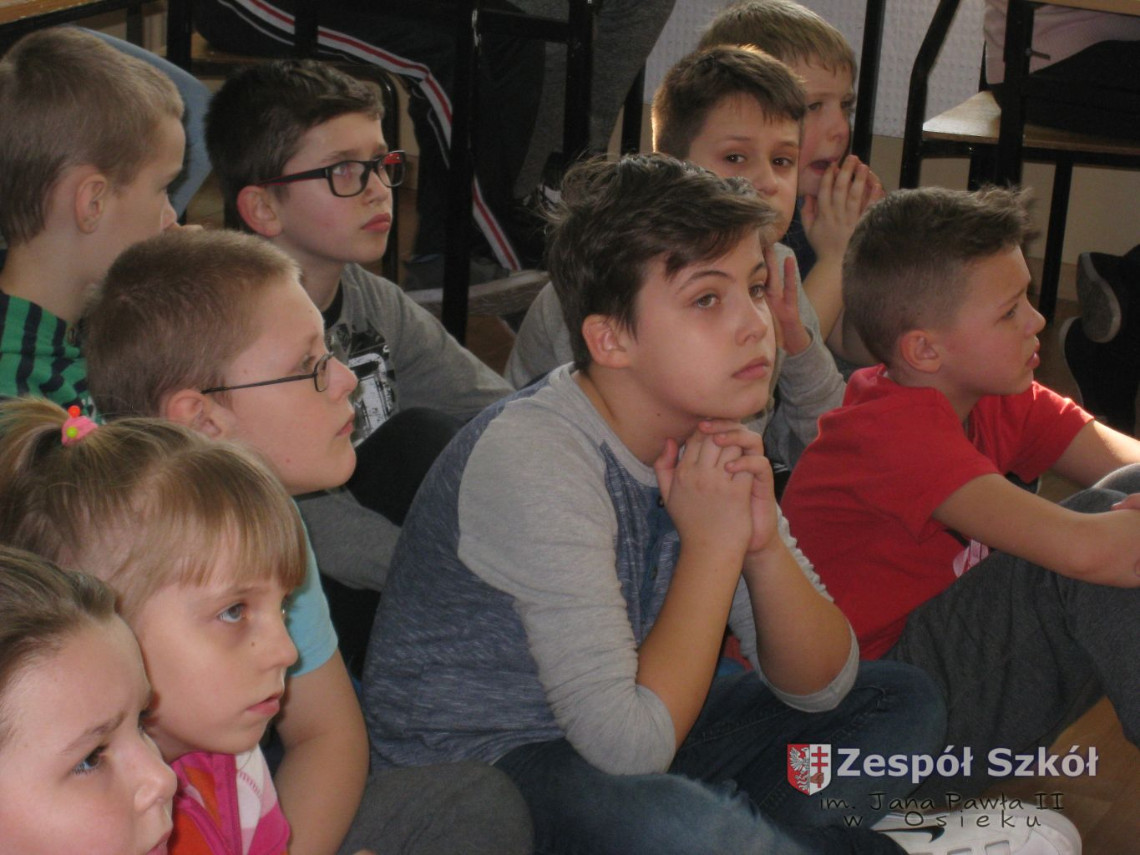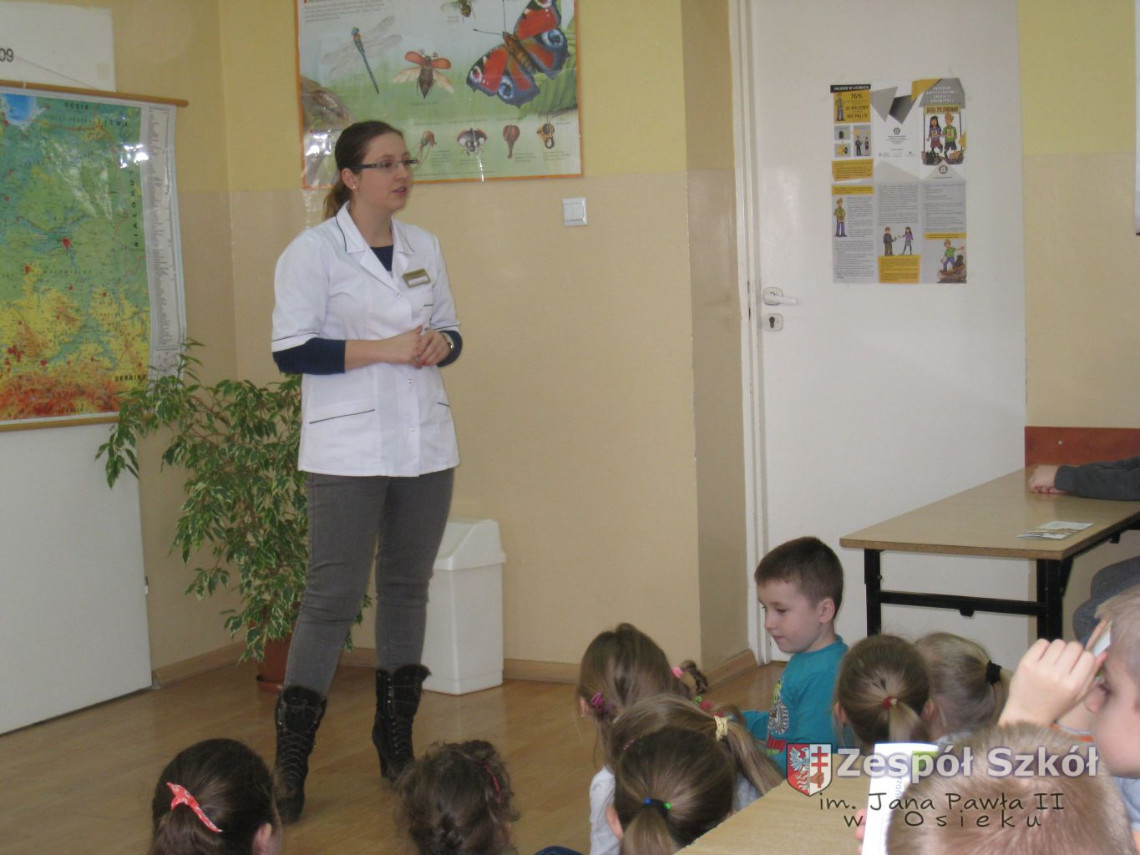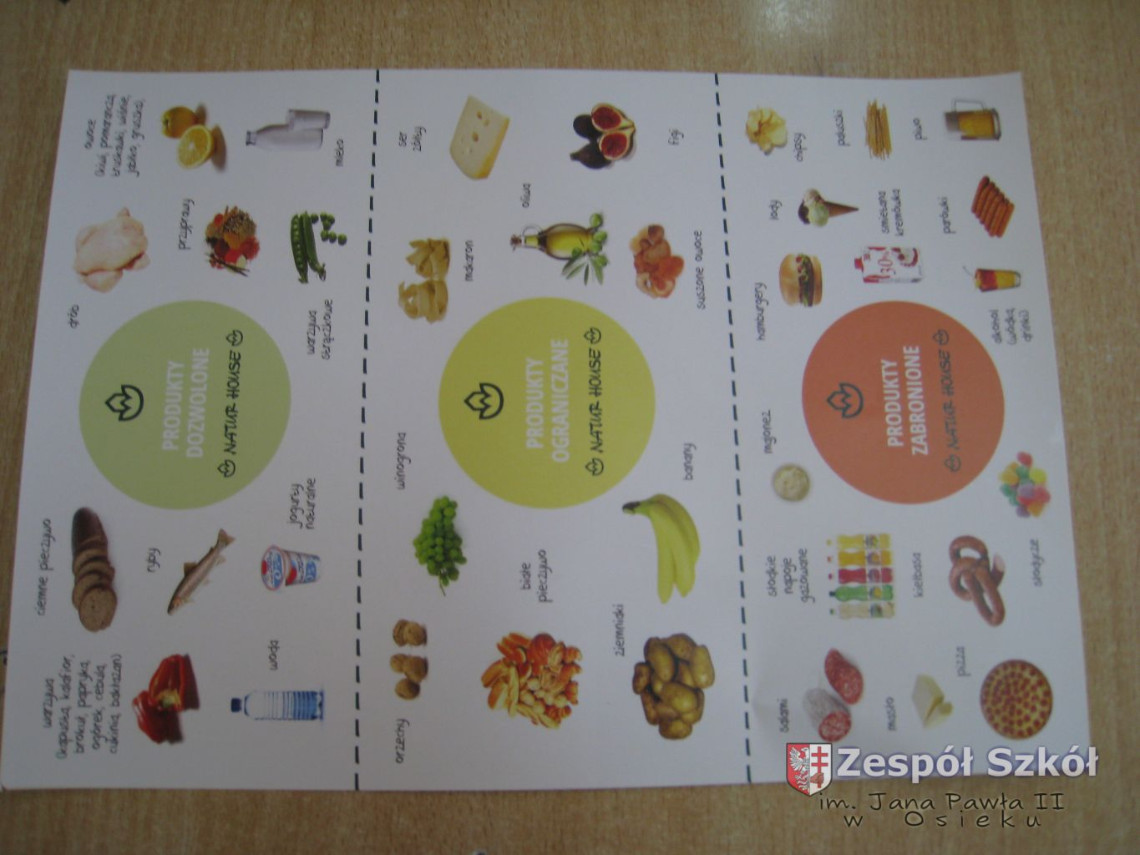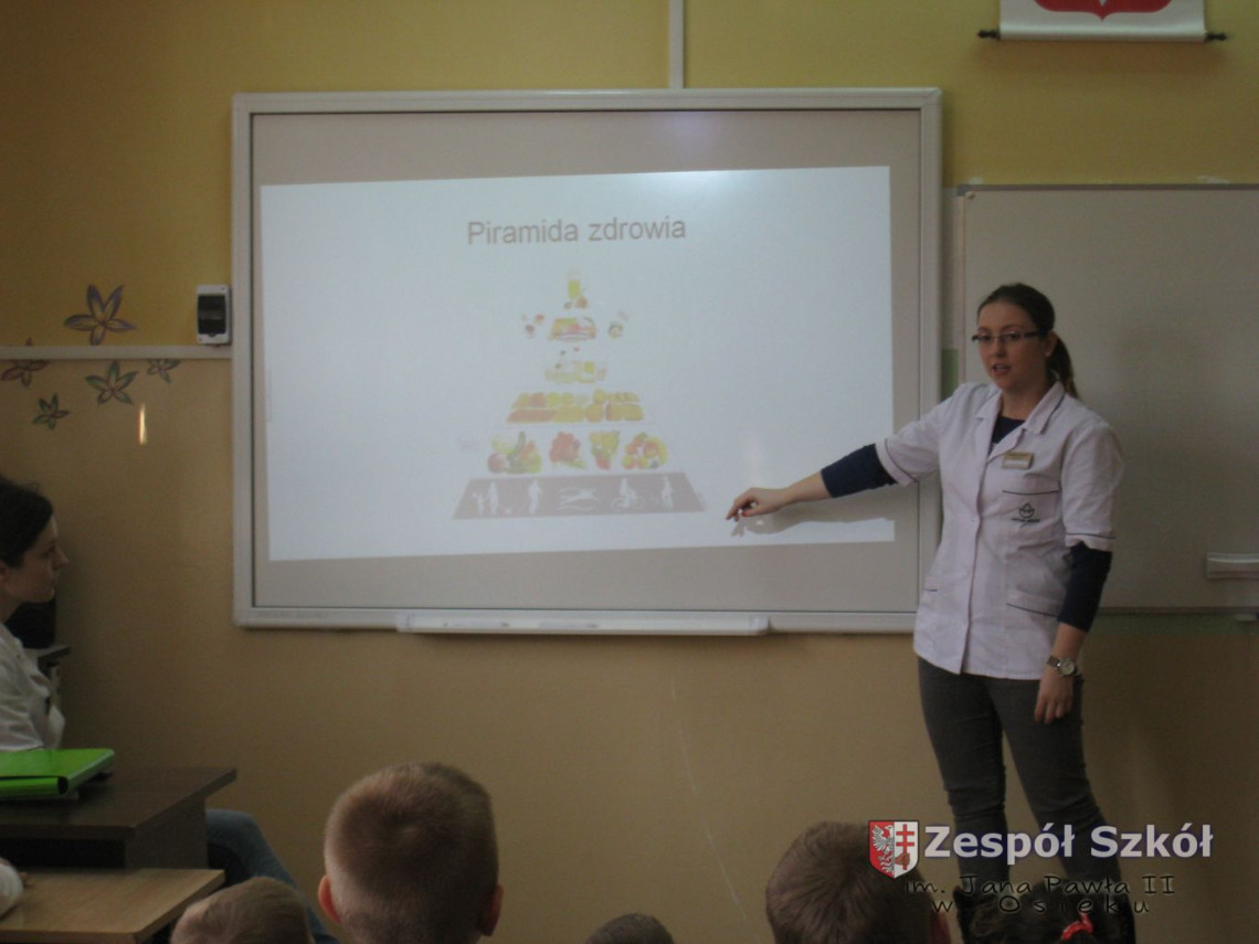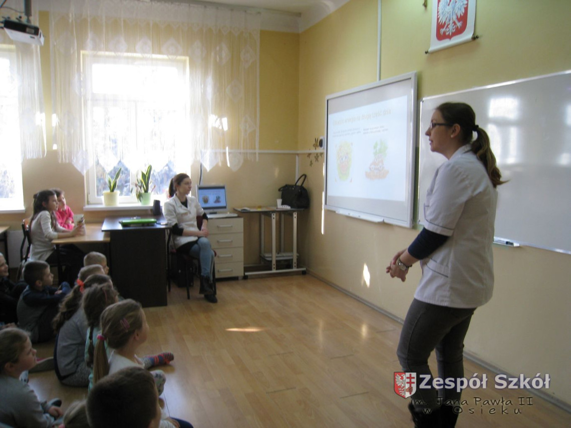 Formą zajęć był interesujący wykład połączony z prezentacją multimedialną i dyskusją na temat zasad prawidłowego odżywiania. Prowadzące omówiły główne błędy w naszej diecie, które prowadzą nie tylko do nadwagi i otyłości, ale również do wielu chorób. Uczestnicy spotkania dowiedzieli się, jak ważną rolę w jadłospisie odgrywa dobrze skomponowane śniadanie. Ten pierwszy posiłek dostarcza niezbędnej energii na początek dnia oraz odpowiednich składników do prawidłowego rozwoju młodego organizmu. Dzieci uzyskały informacje, co powinny ze sobą zabierać do szkoły na drugie śniadanie oraz jakich produktów powinny unikać lub je ograniczać, by długo cieszyć się witalnością i dobrym samopoczuciem. Specjaliści ds. żywienia przekazali w bardzo interesujący i przystępny sposób informacje, w jaki sposób zamieniać „złe" produkty na lepsze, małokaloryczne i zdrowe zamienniki. Uczniowie dowiedzieli się też, jak układać pełnowartościowy jadłospis, jak dużą wartość ma woda i ile powinniśmy jej wypijać. Uczniowie chętnie uczestniczyli w spotkaniu i wypowiadali się na temat zdrowego stylu życia.