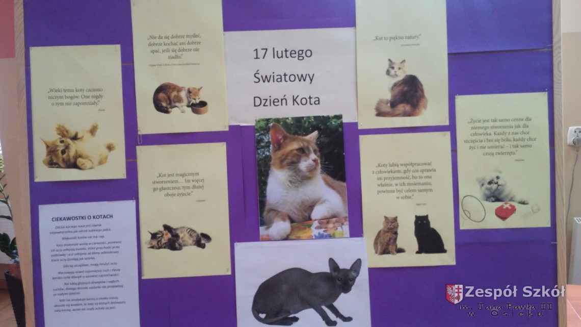 Wzorem Włochów, którzy już w 1900 roku zainicjowali obchody Światowego Dnia Kota, dokarmiając populację futrzaków zamieszkujących rzymskie Koloseum, uczniowie kl.II a również postanowili uczcić to święto. Dzieci po krótkim wprowadzeniu i wysłuchaniu bajki pt. „Kot i krawiec” wykonały piękne prace plastyczne. Obchody tego święta mają uczyć dzieci miłości i szacunku do zwierząt.