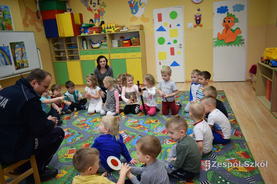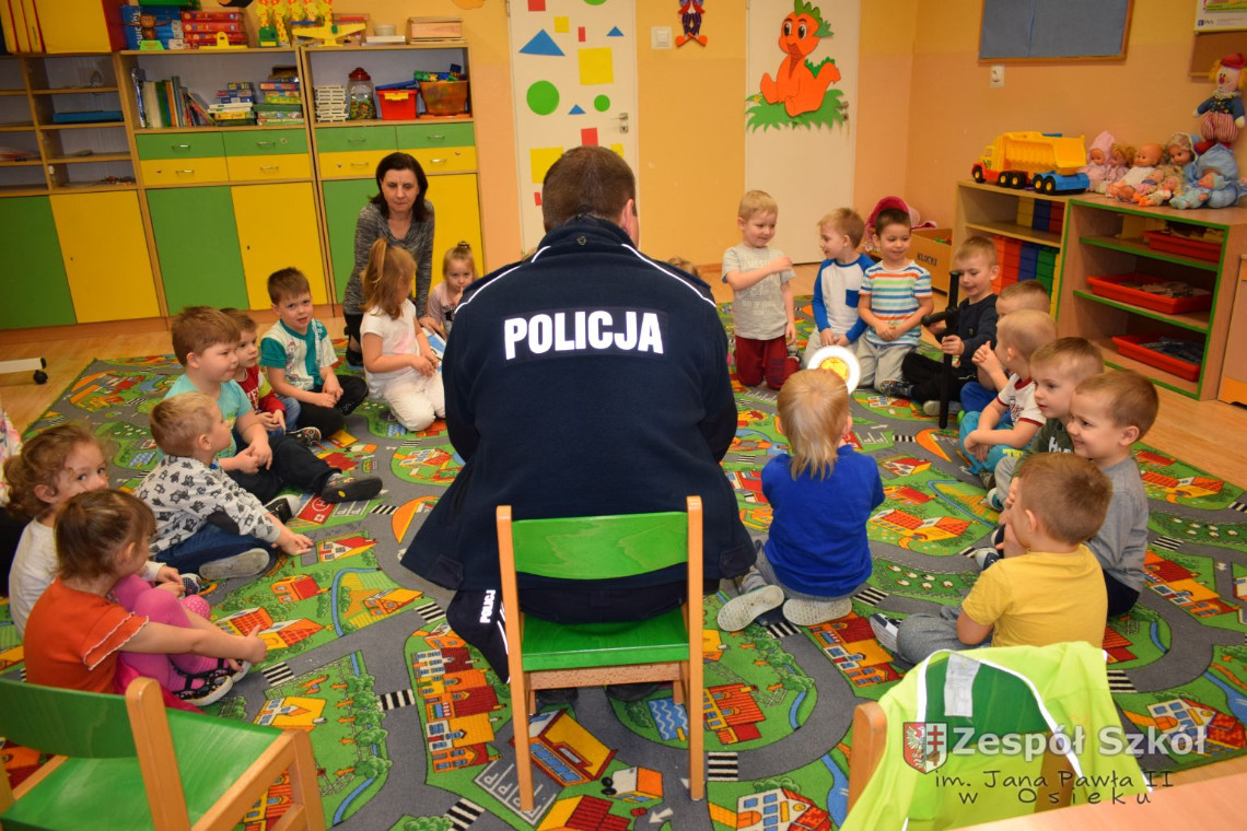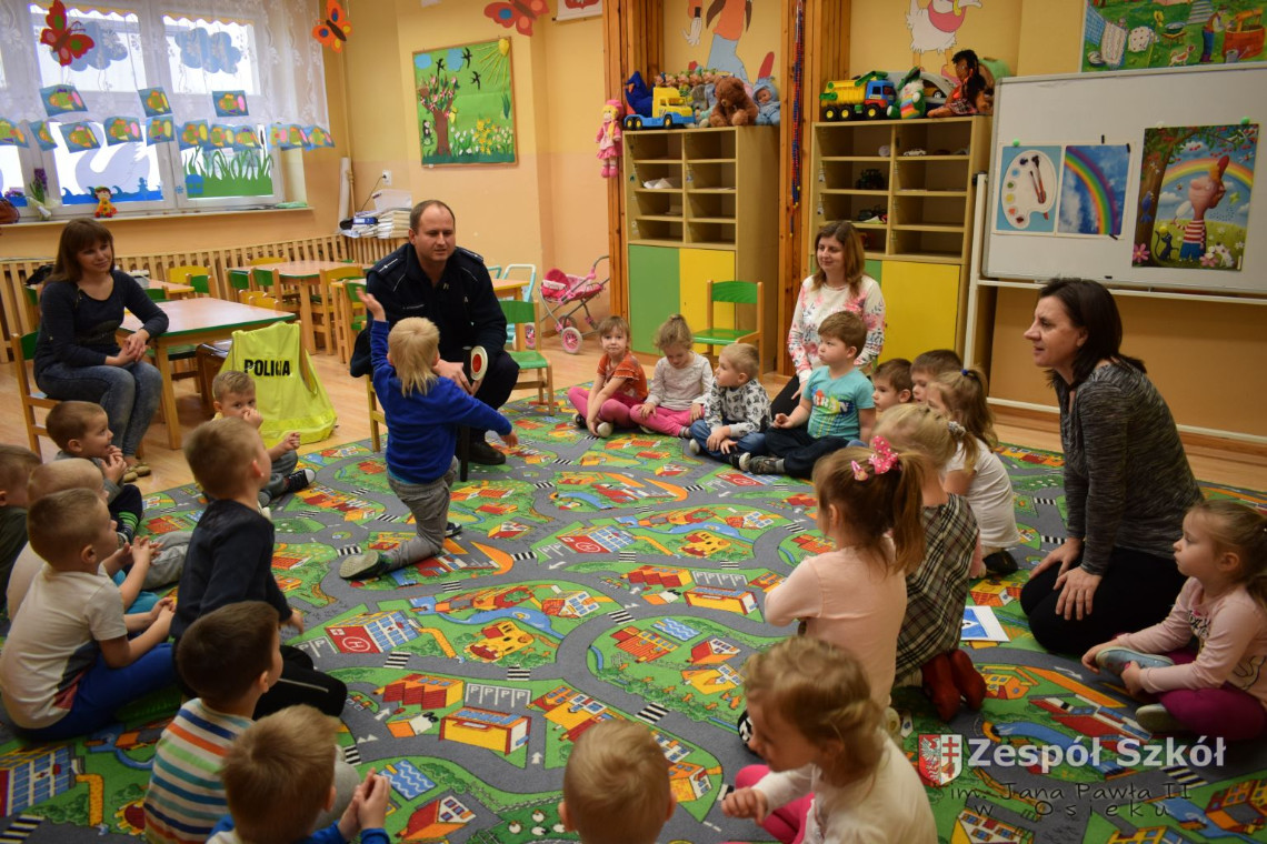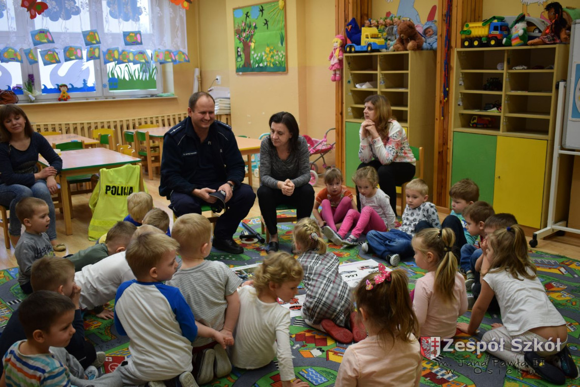 Dnia 13.03 2017 r. grupę 4- latków odwiedził pan policjant Rafał Wyrzykowski ,tata naszego Wiktorka. W związku z omawianą tematyką ,,Kim będę ,gdy dorosnę” przybliżył dzieciom zawód policjanta, a także omówił podstawowe zasady bezpiecznego poruszania się po drogach, przypomniał numery alarmowe i kiedy należy z nich korzystać. Jednak największym zainteresowaniem cieszyła się prezentacja wyposażenia policyjnego niezbędnego podczas wykonywania pracy policjanta. Przedszkolaki nie bały się zadawać pytań, a także dzieliły się swoimi doświadczeniami, wykazały się także wiedzą podczas zabawy ,,Prawda- fałsz”. W podziękowaniu zaśpiewały piosenki o ruchu drogowym.