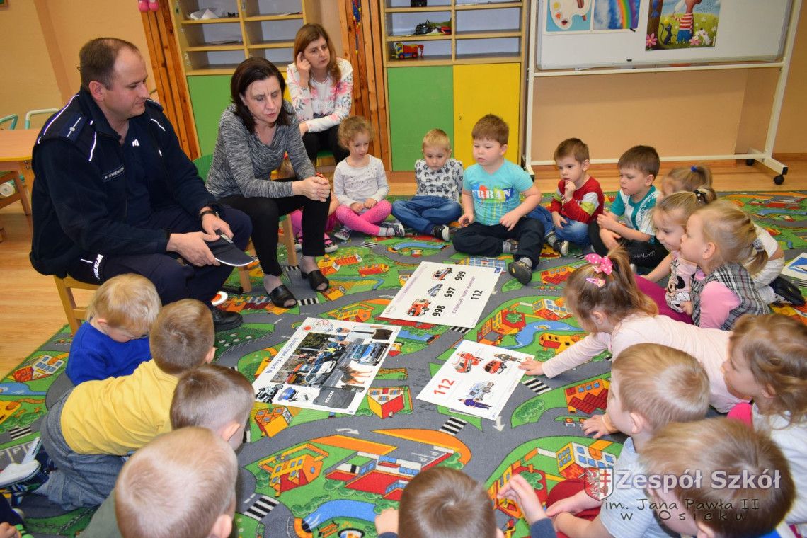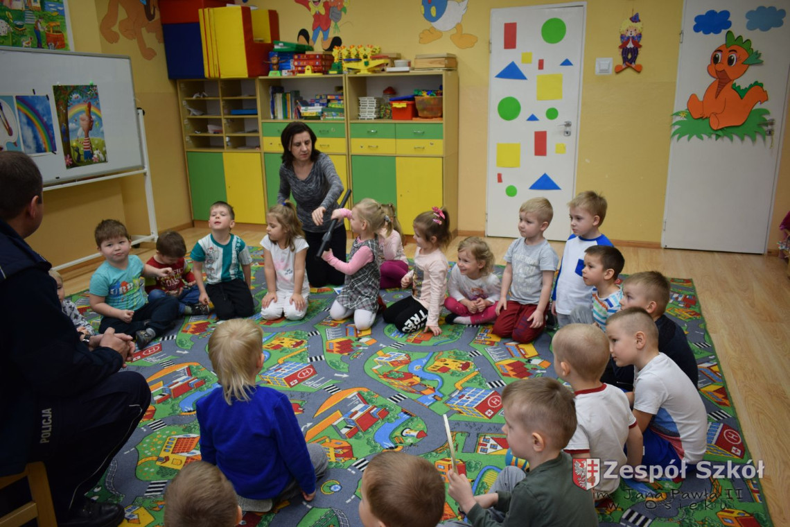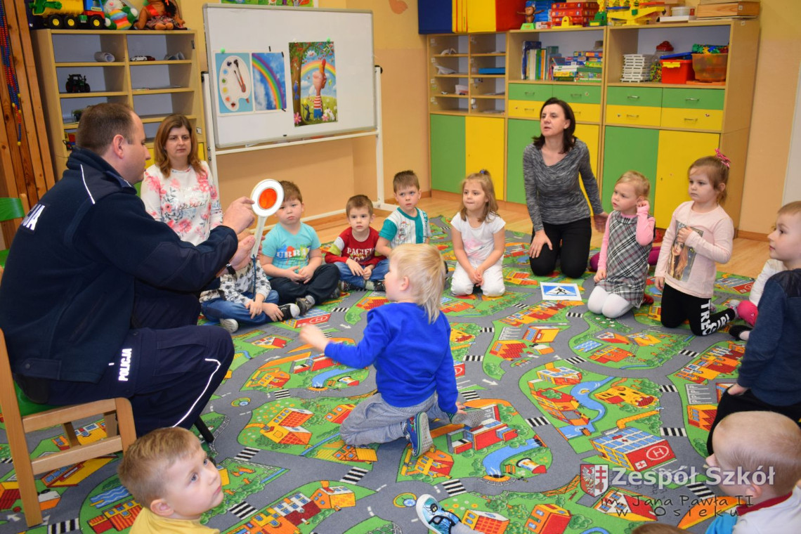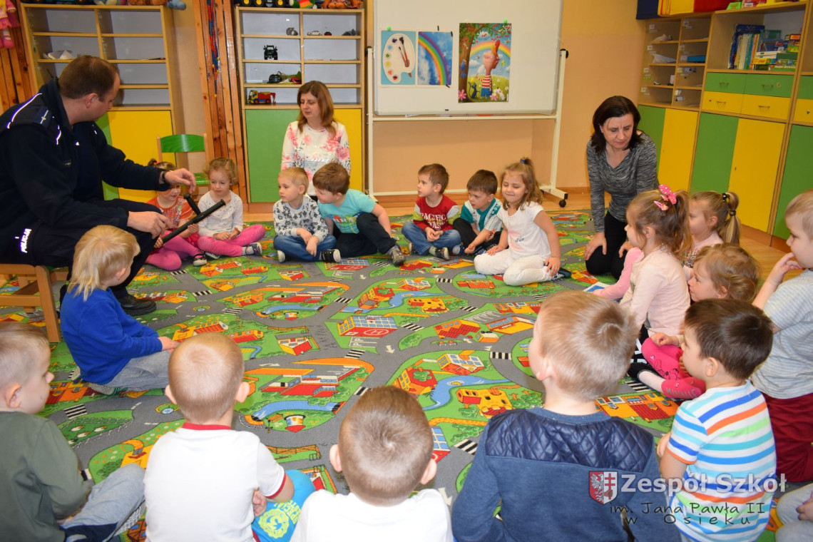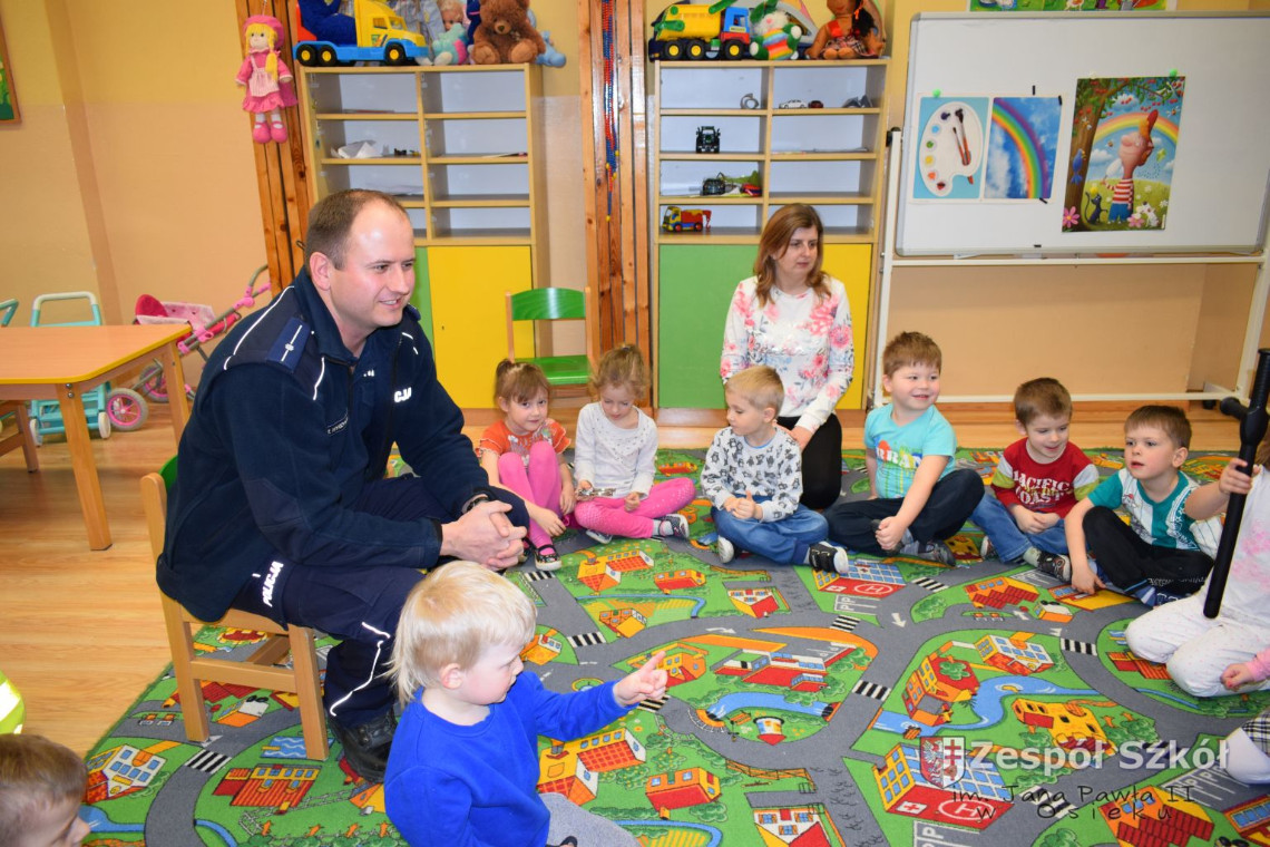 Dnia 13.03 2017 r. grupę 4- latków odwiedził pan policjant Rafał Wyrzykowski ,tata naszego Wiktorka. W związku z omawianą tematyką ,,Kim będę ,gdy dorosnę” przybliżył dzieciom zawód policjanta, a także omówił podstawowe zasady bezpiecznego poruszania się po drogach, przypomniał numery alarmowe i kiedy należy z nich korzystać. Jednak największym zainteresowaniem cieszyła się prezentacja wyposażenia policyjnego niezbędnego podczas wykonywania pracy policjanta. Przedszkolaki nie bały się zadawać pytań, a także dzieliły się swoimi doświadczeniami, wykazały się także wiedzą podczas zabawy ,,Prawda- fałsz”. W podziękowaniu zaśpiewały piosenki o ruchu drogowym.