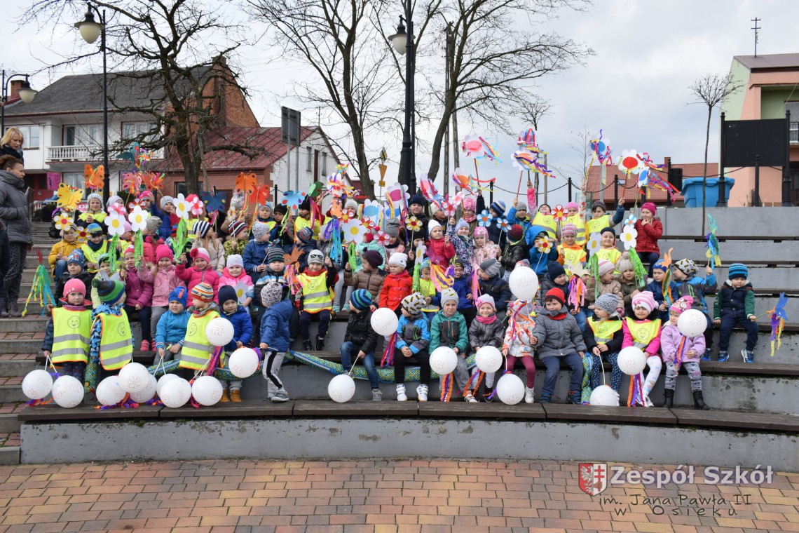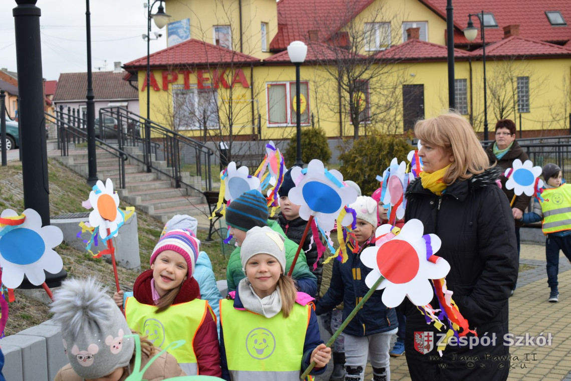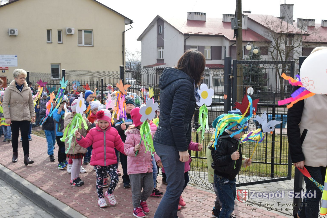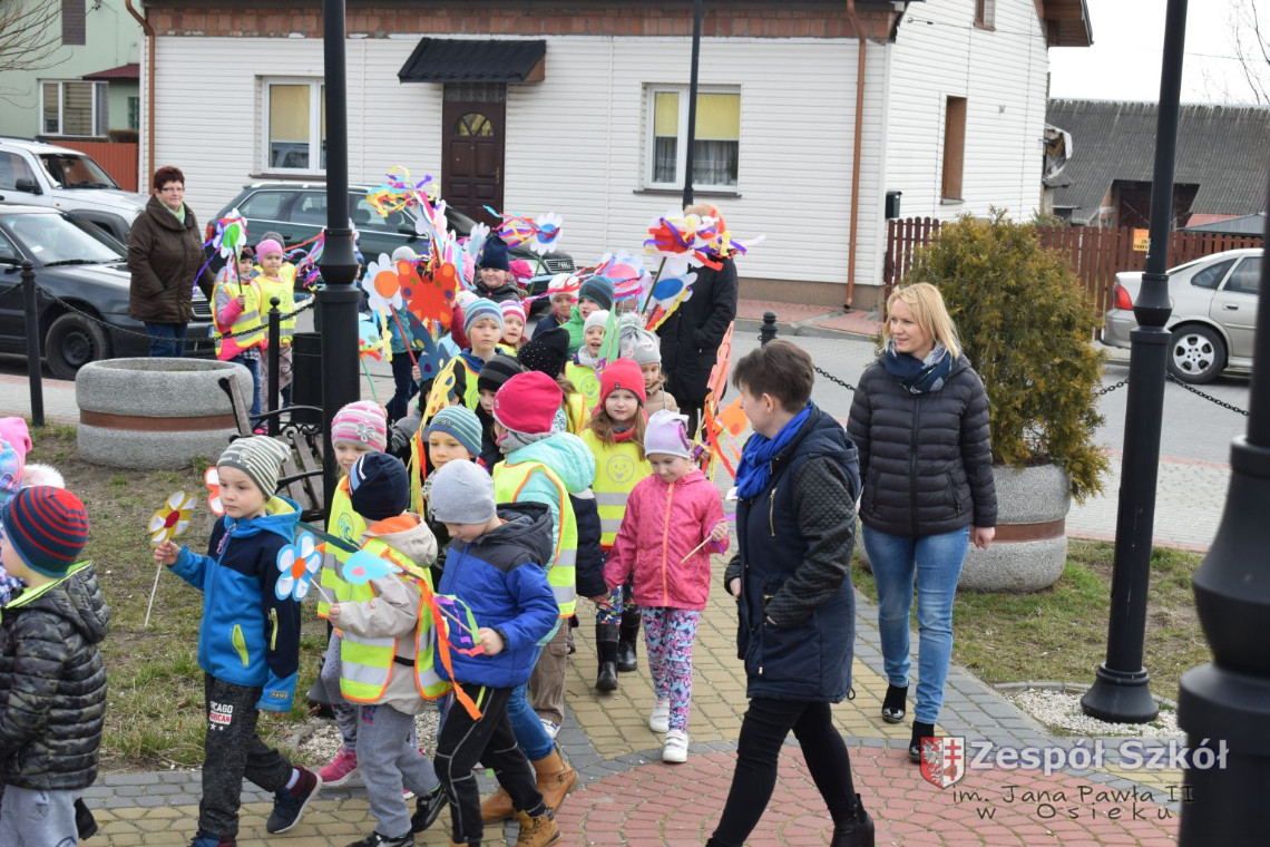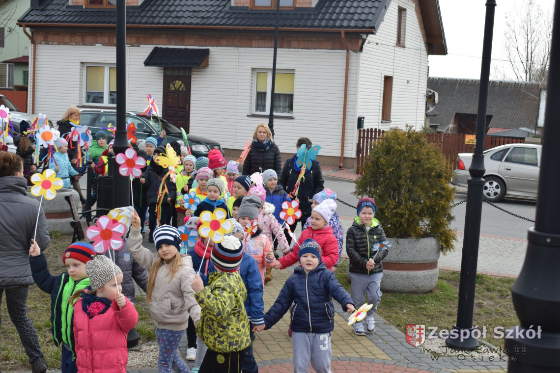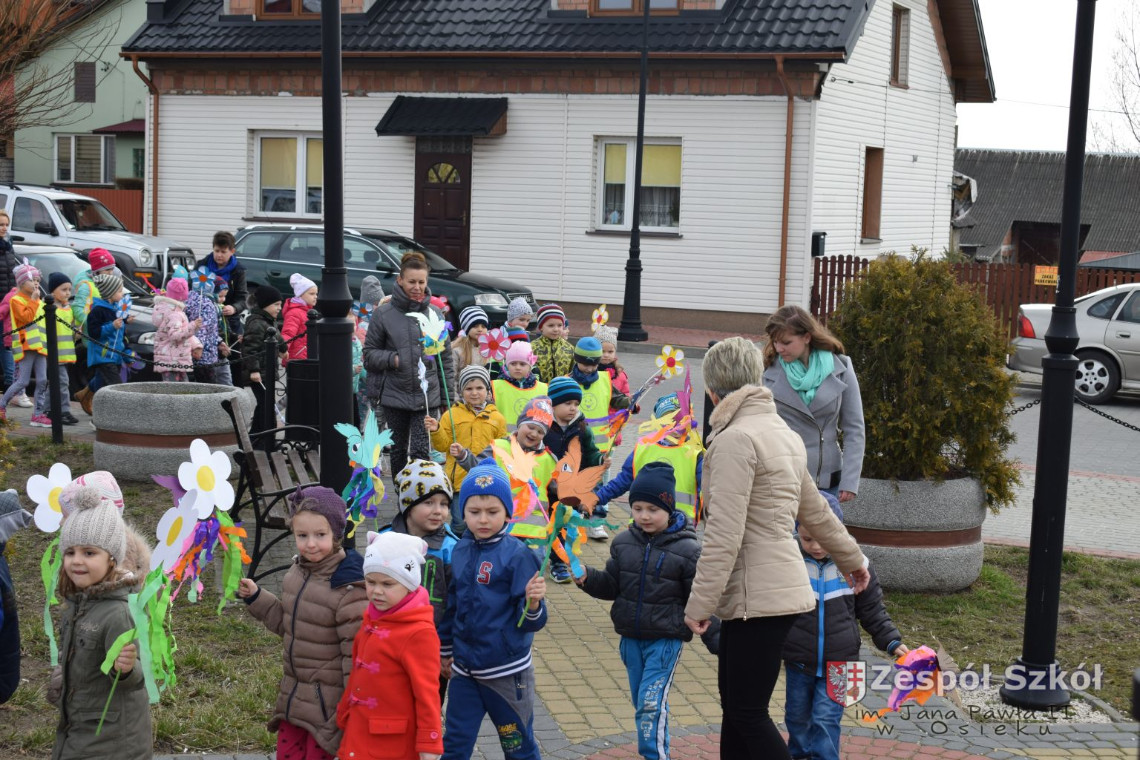 We wtorek 21.03 2017 r. wszystkie przedszkolaki z Publicznego Przedszkola w Osieku przywitały pierwszy dzień kalendarzowej wiosny kolorowo i wesoło. O godz.9.30 wyruszyły barwnym pochodem ulicami miasta trzymając w rękach wiosenne emblematy: kolorowe motylki, kwiatki, ptaszki, balony. Radosnymi okrzykami, piosenką i wesołą zabawą na świeżym powietrzu dzieci powitały długo oczekiwaną wiosnę.