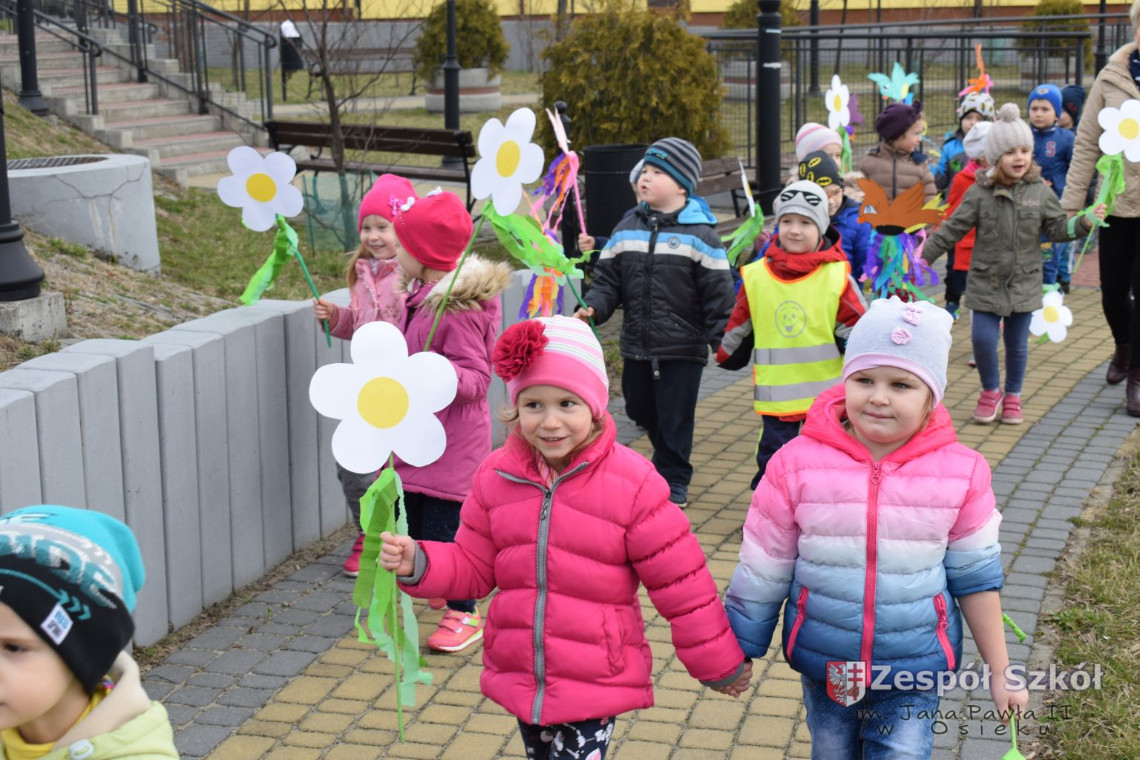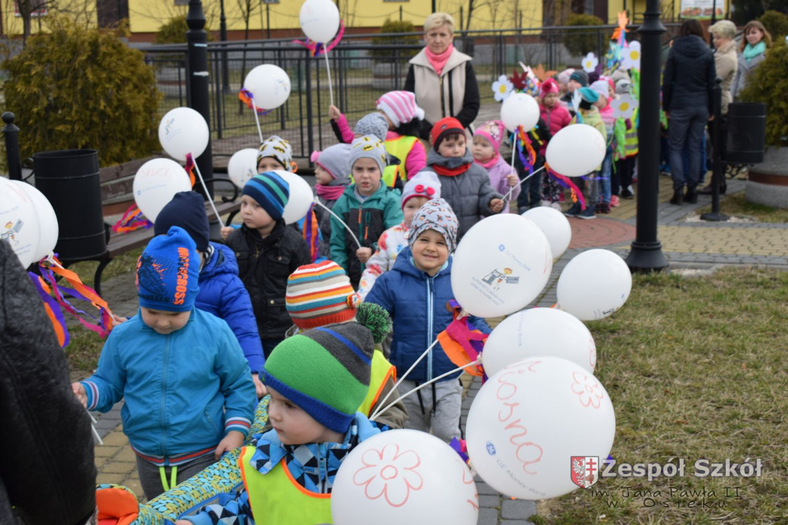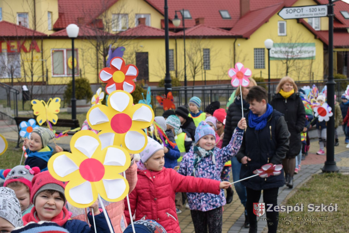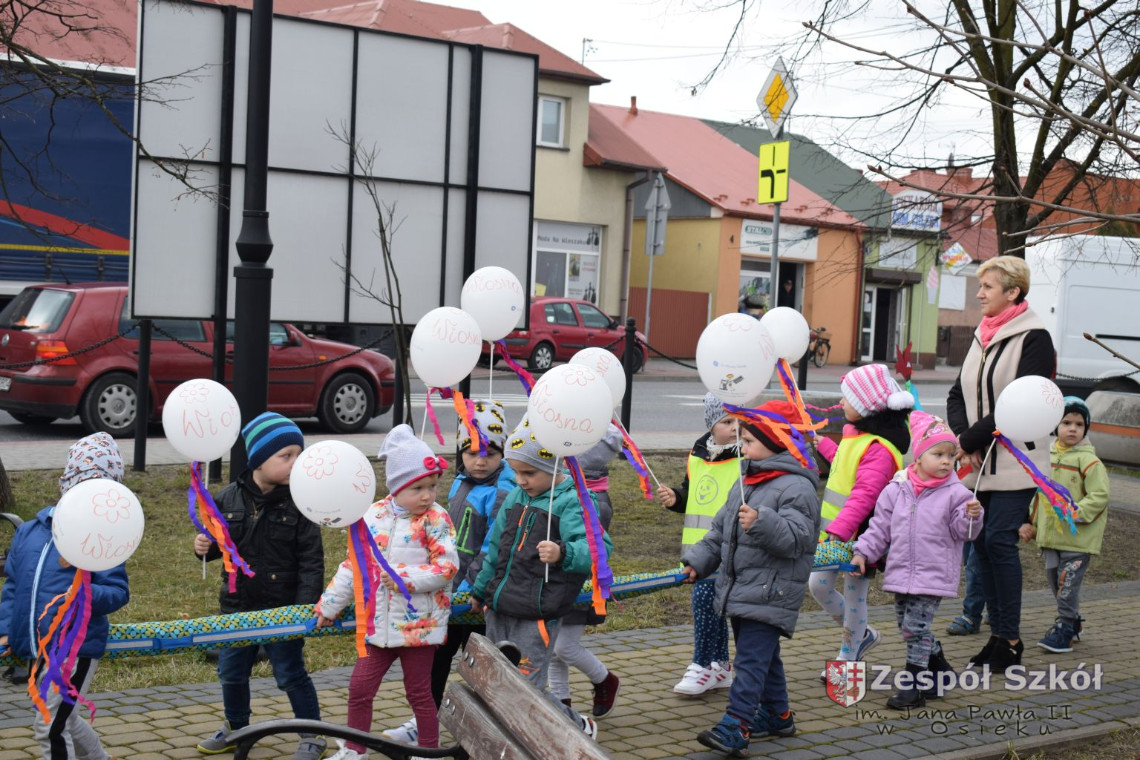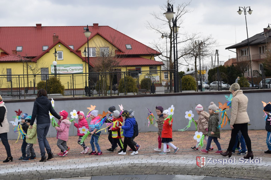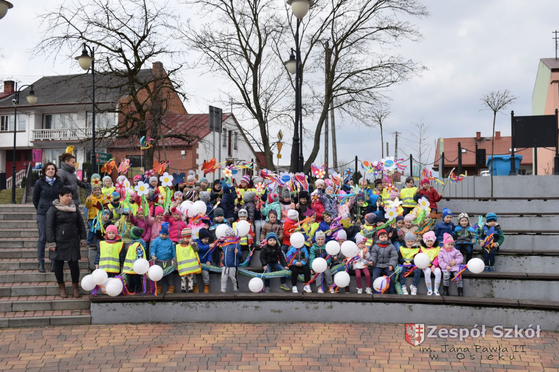 We wtorek 21.03 2017 r. wszystkie przedszkolaki z Publicznego Przedszkola w Osieku przywitały pierwszy dzień kalendarzowej wiosny kolorowo i wesoło. O godz.9.30 wyruszyły barwnym pochodem ulicami miasta trzymając w rękach wiosenne emblematy: kolorowe motylki, kwiatki, ptaszki, balony. Radosnymi okrzykami, piosenką i wesołą zabawą na świeżym powietrzu dzieci powitały długo oczekiwaną wiosnę.