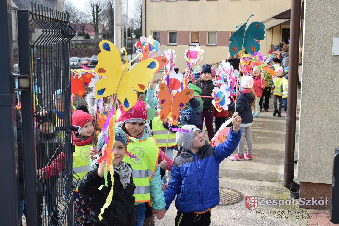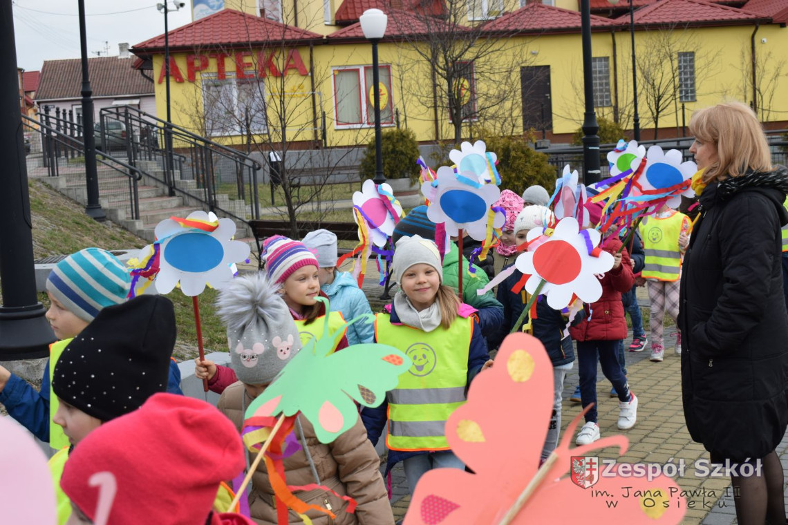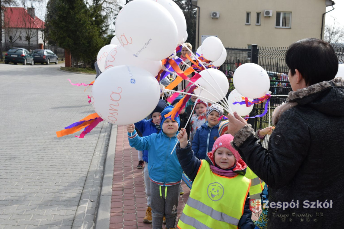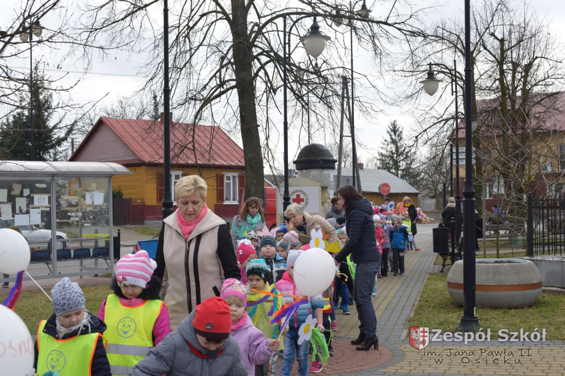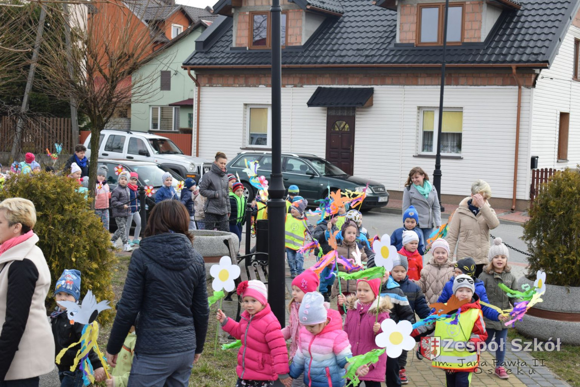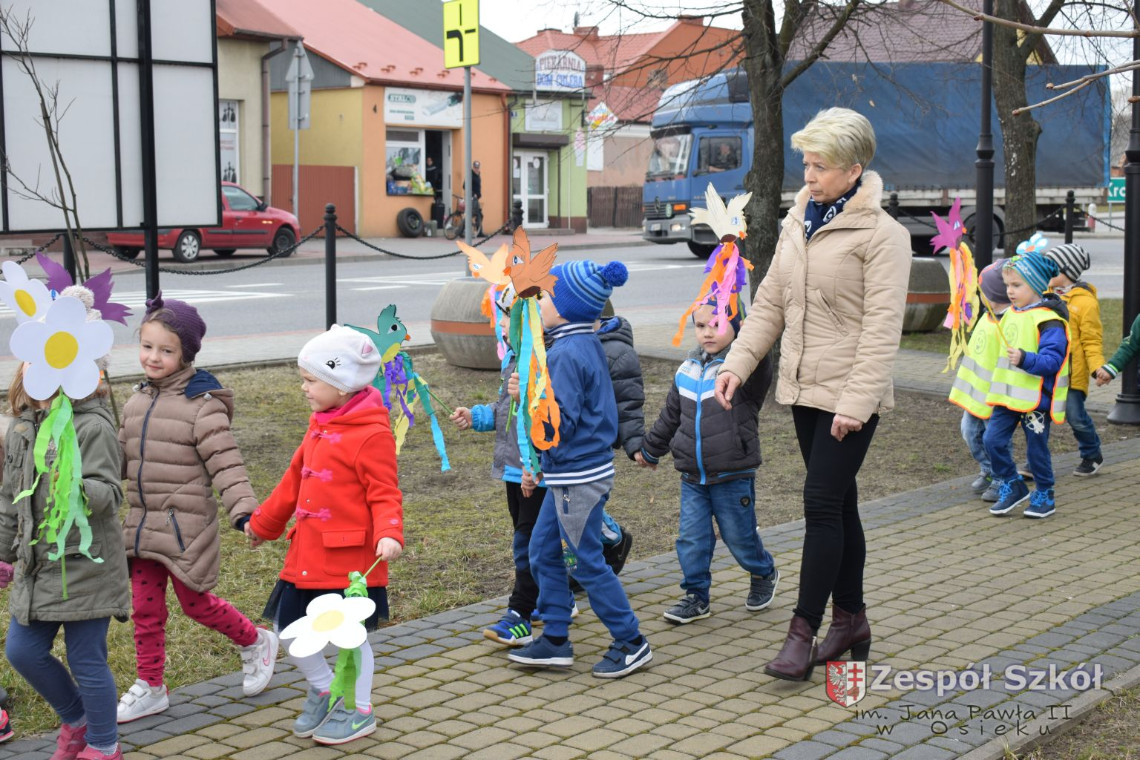 We wtorek 21.03 2017 r. wszystkie przedszkolaki z Publicznego Przedszkola w Osieku przywitały pierwszy dzień kalendarzowej wiosny kolorowo i wesoło. O godz.9.30 wyruszyły barwnym pochodem ulicami miasta trzymając w rękach wiosenne emblematy: kolorowe motylki, kwiatki, ptaszki, balony. Radosnymi okrzykami, piosenką i wesołą zabawą na świeżym powietrzu dzieci powitały długo oczekiwaną wiosnę.