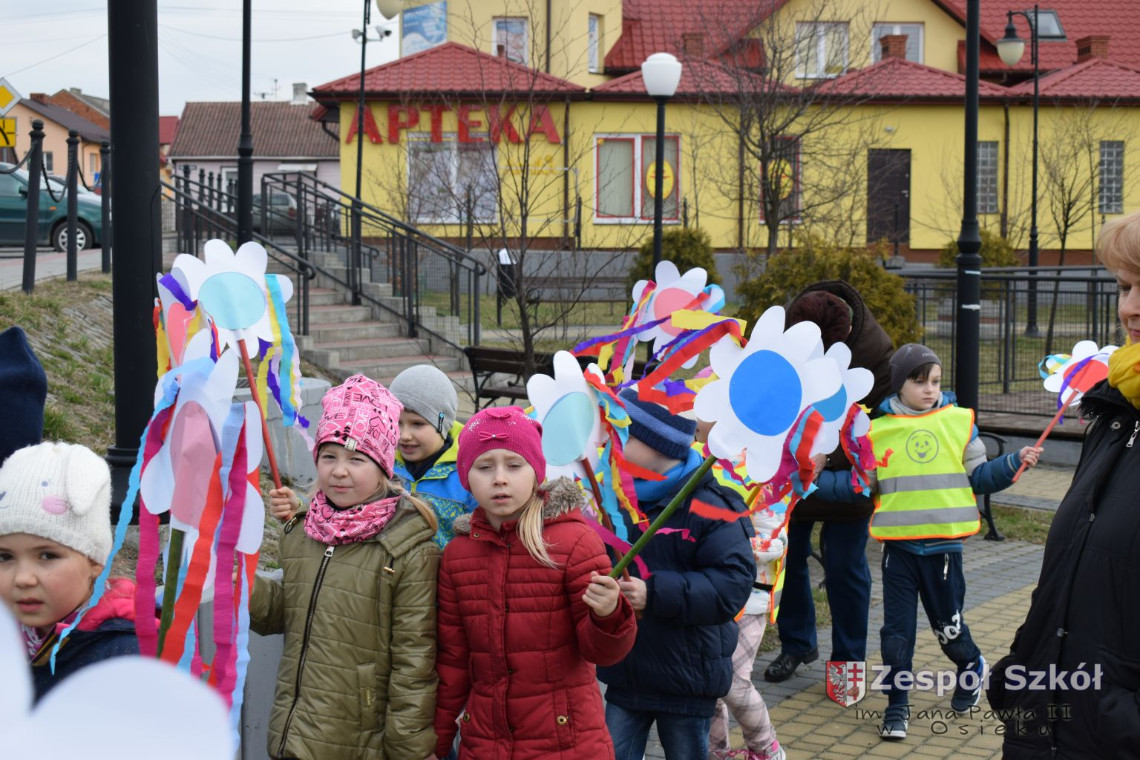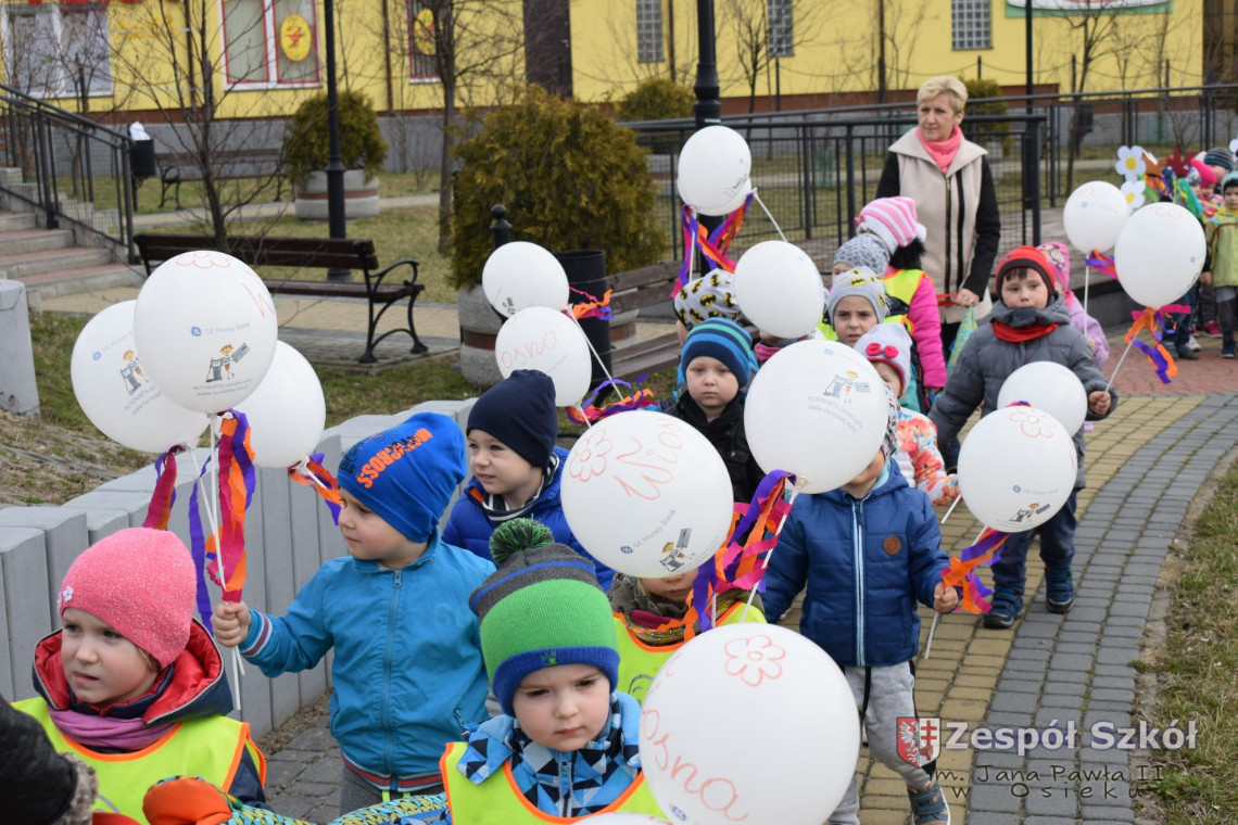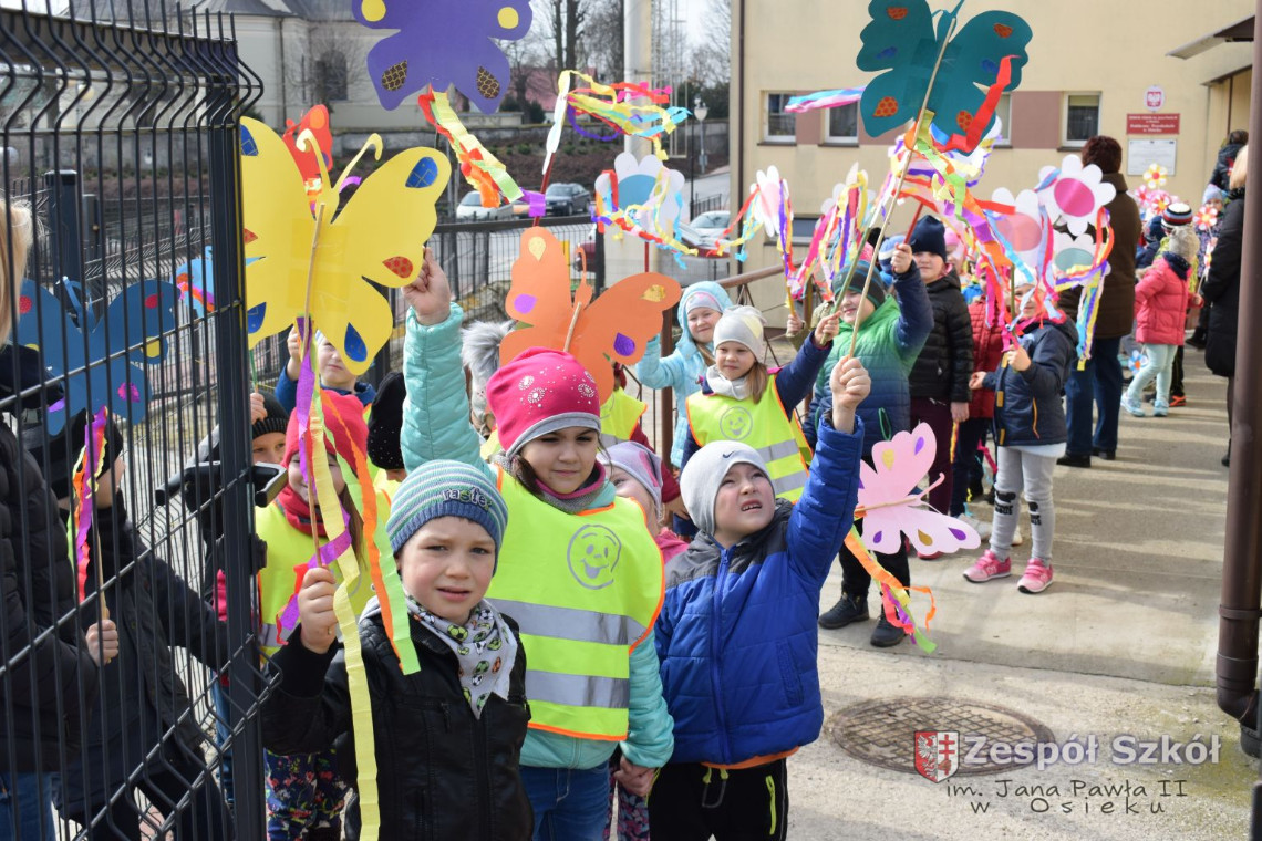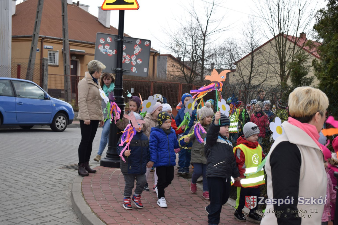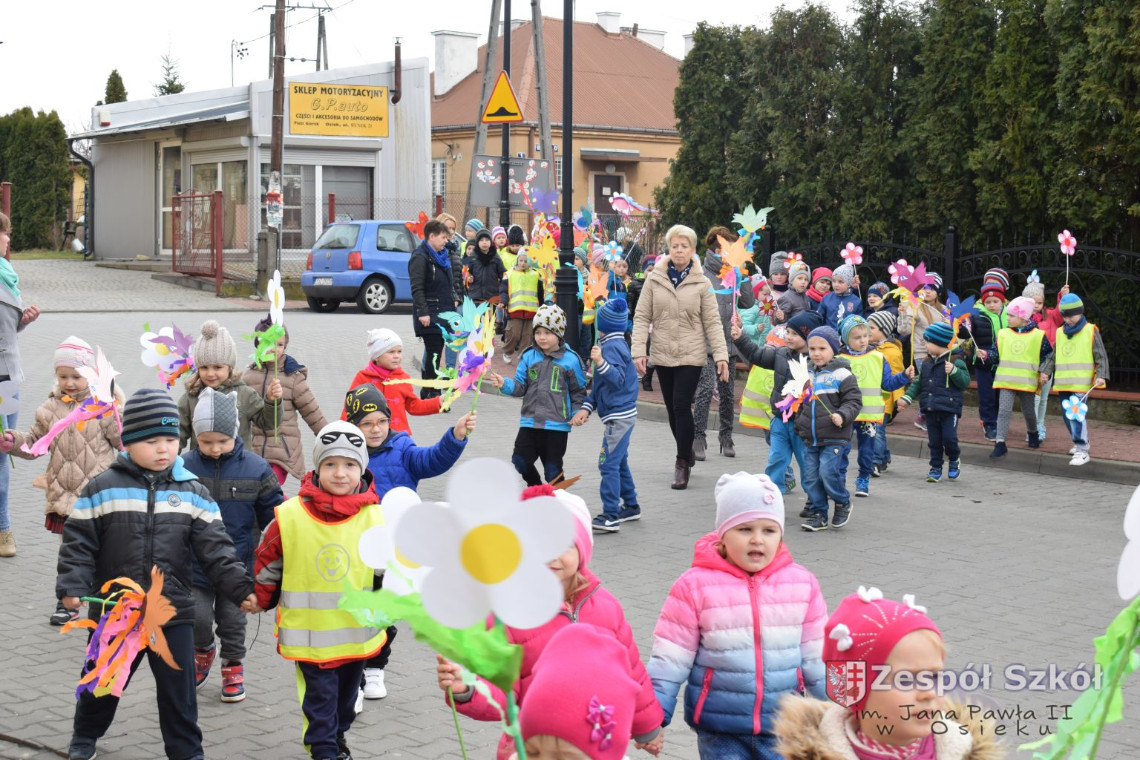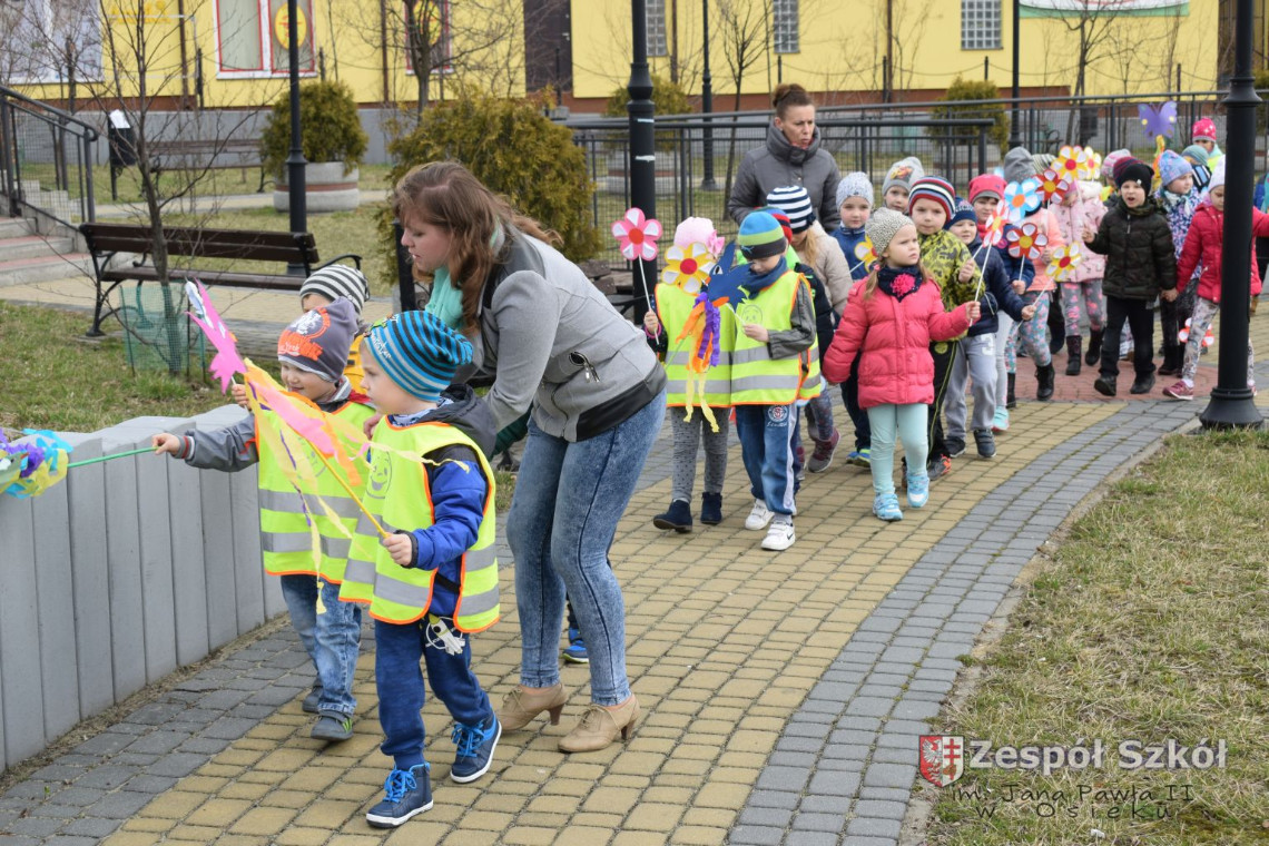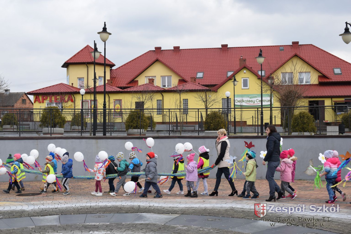 We wtorek 21.03 2017 r. wszystkie przedszkolaki z Publicznego Przedszkola w Osieku przywitały pierwszy dzień kalendarzowej wiosny kolorowo i wesoło. O godz.9.30 wyruszyły barwnym pochodem ulicami miasta trzymając w rękach wiosenne emblematy: kolorowe motylki, kwiatki, ptaszki, balony. Radosnymi okrzykami, piosenką i wesołą zabawą na świeżym powietrzu dzieci powitały długo oczekiwaną wiosnę.