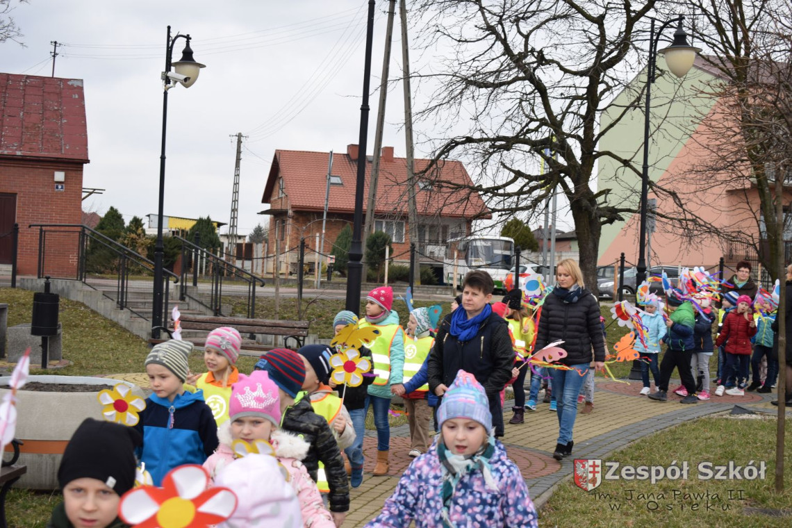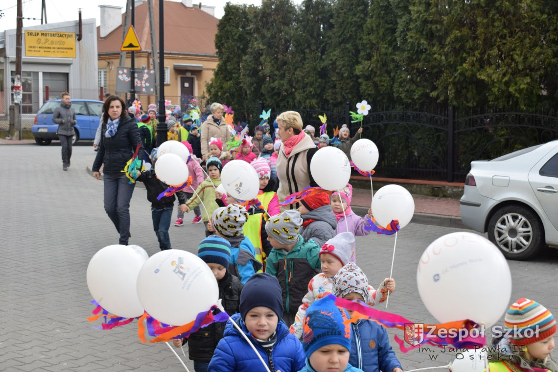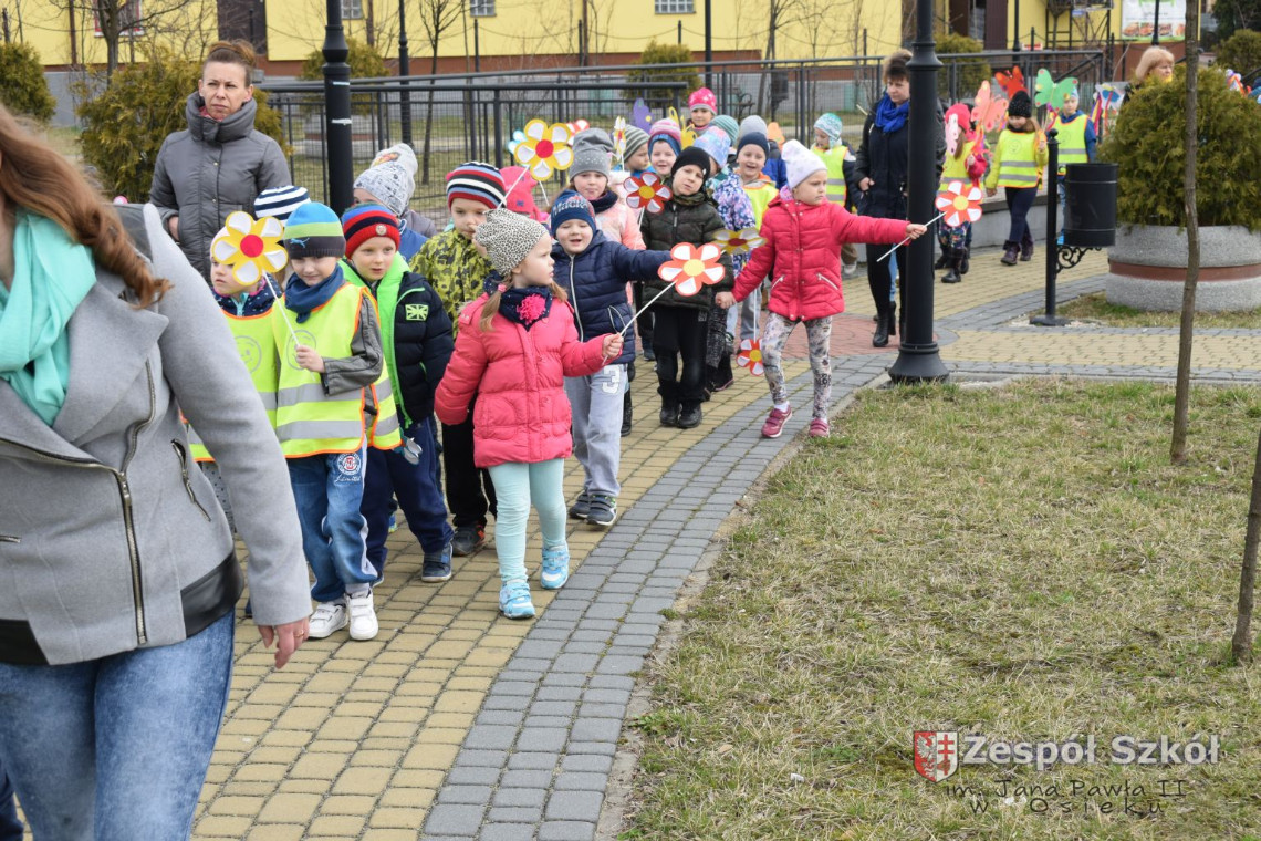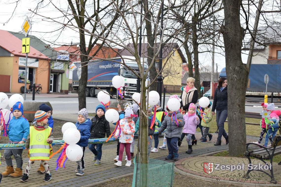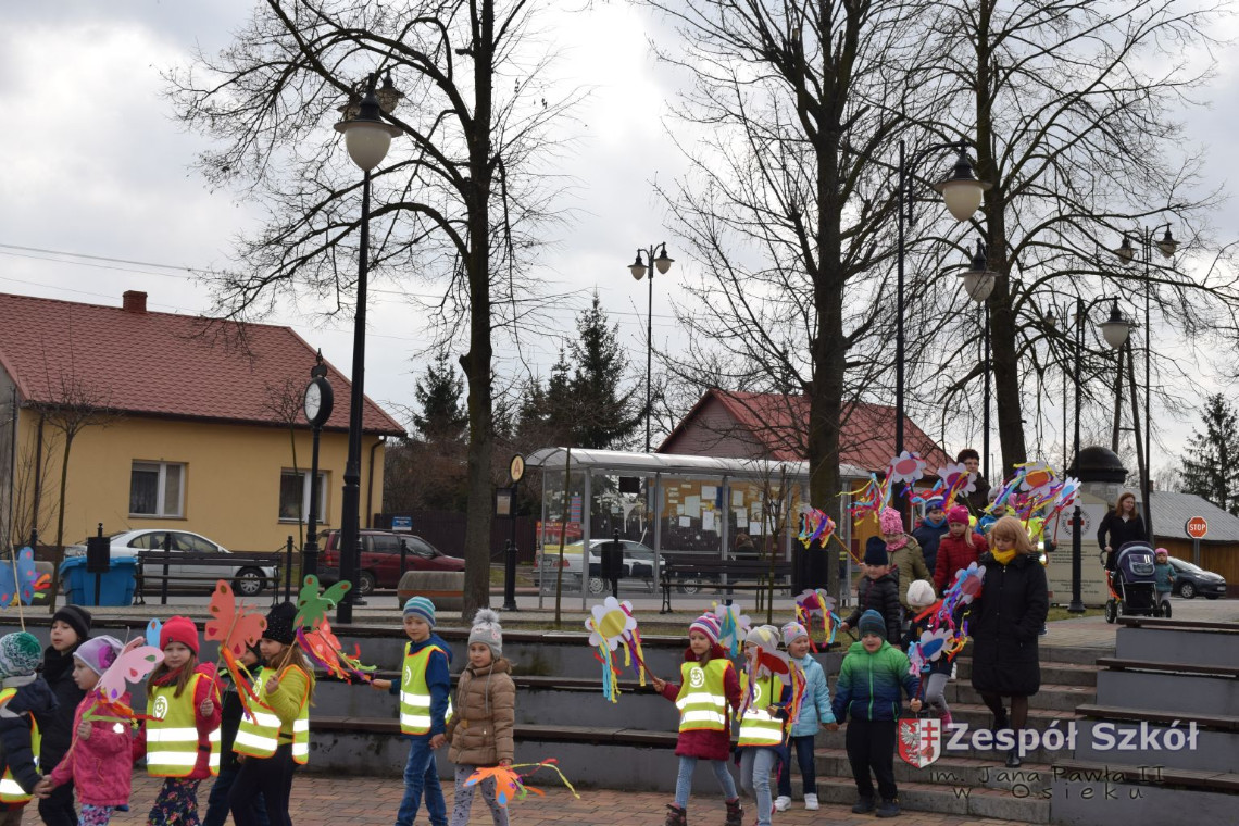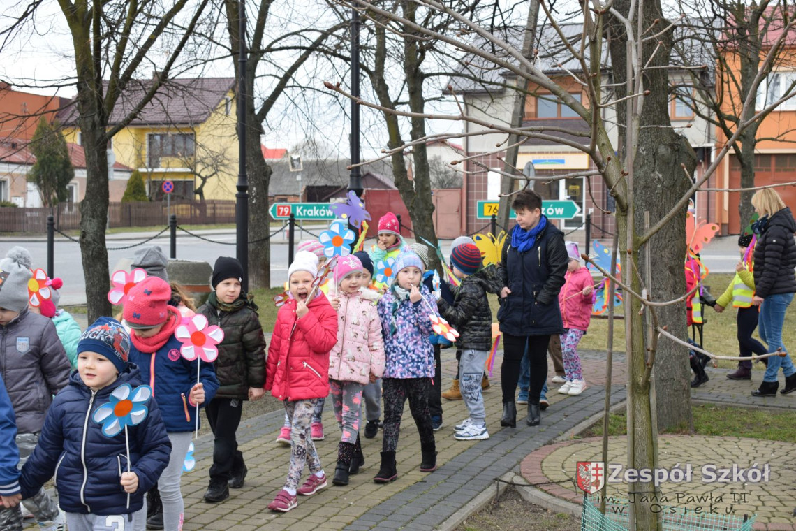 We wtorek 21.03 2017 r. wszystkie przedszkolaki z Publicznego Przedszkola w Osieku przywitały pierwszy dzień kalendarzowej wiosny kolorowo i wesoło. O godz.9.30 wyruszyły barwnym pochodem ulicami miasta trzymając w rękach wiosenne emblematy: kolorowe motylki, kwiatki, ptaszki, balony. Radosnymi okrzykami, piosenką i wesołą zabawą na świeżym powietrzu dzieci powitały długo oczekiwaną wiosnę.
