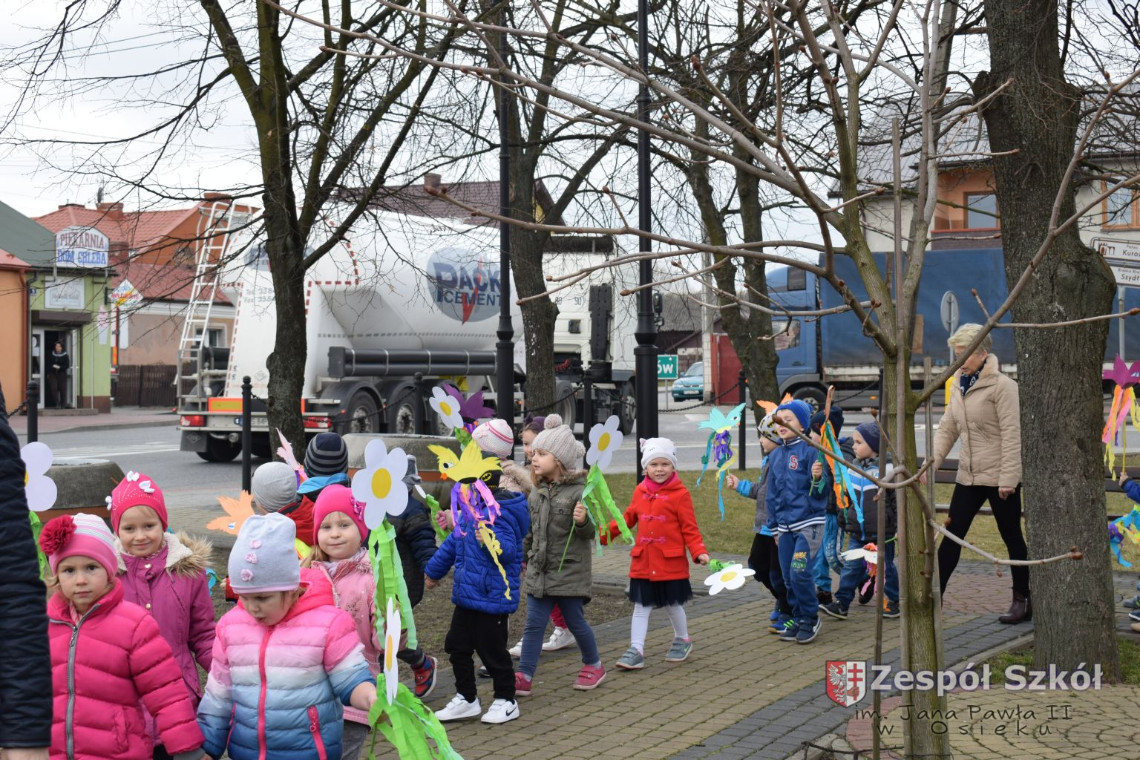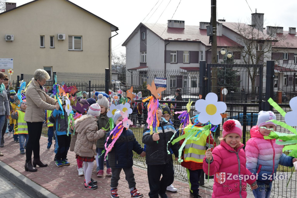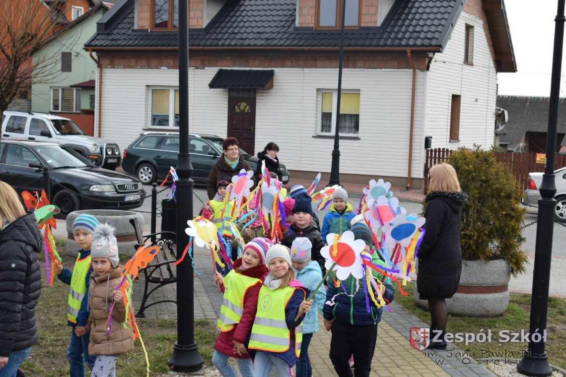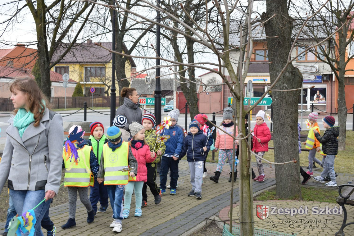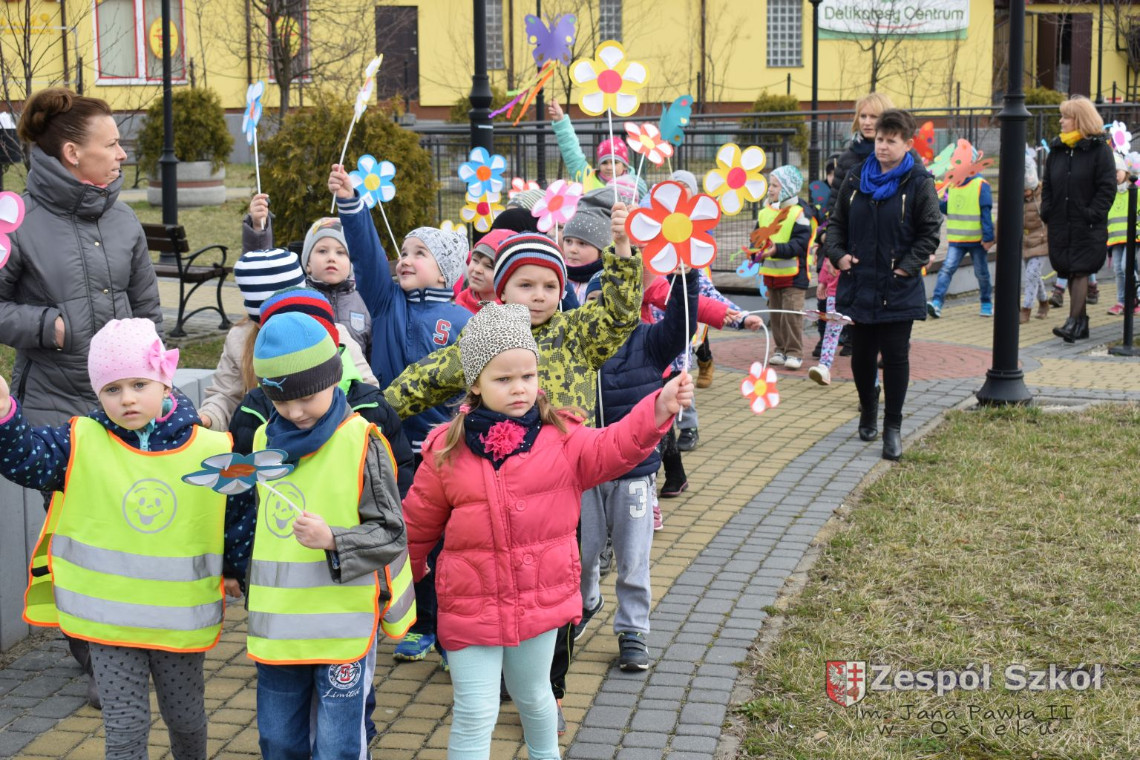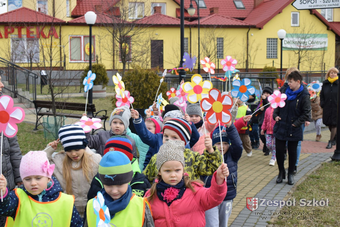 We wtorek 21.03 2017 r. wszystkie przedszkolaki z Publicznego Przedszkola w Osieku przywitały pierwszy dzień kalendarzowej wiosny kolorowo i wesoło. O godz.9.30 wyruszyły barwnym pochodem ulicami miasta trzymając w rękach wiosenne emblematy: kolorowe motylki, kwiatki, ptaszki, balony. Radosnymi okrzykami, piosenką i wesołą zabawą na świeżym powietrzu dzieci powitały długo oczekiwaną wiosnę.
