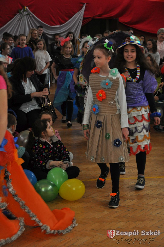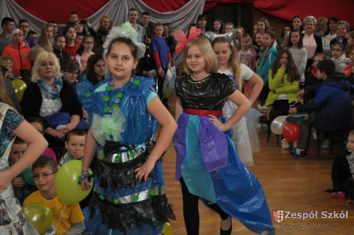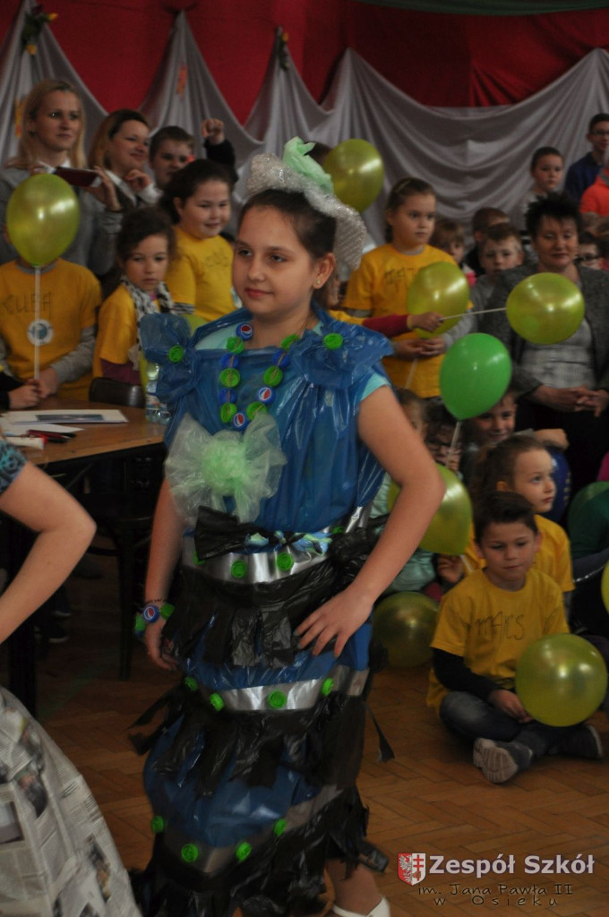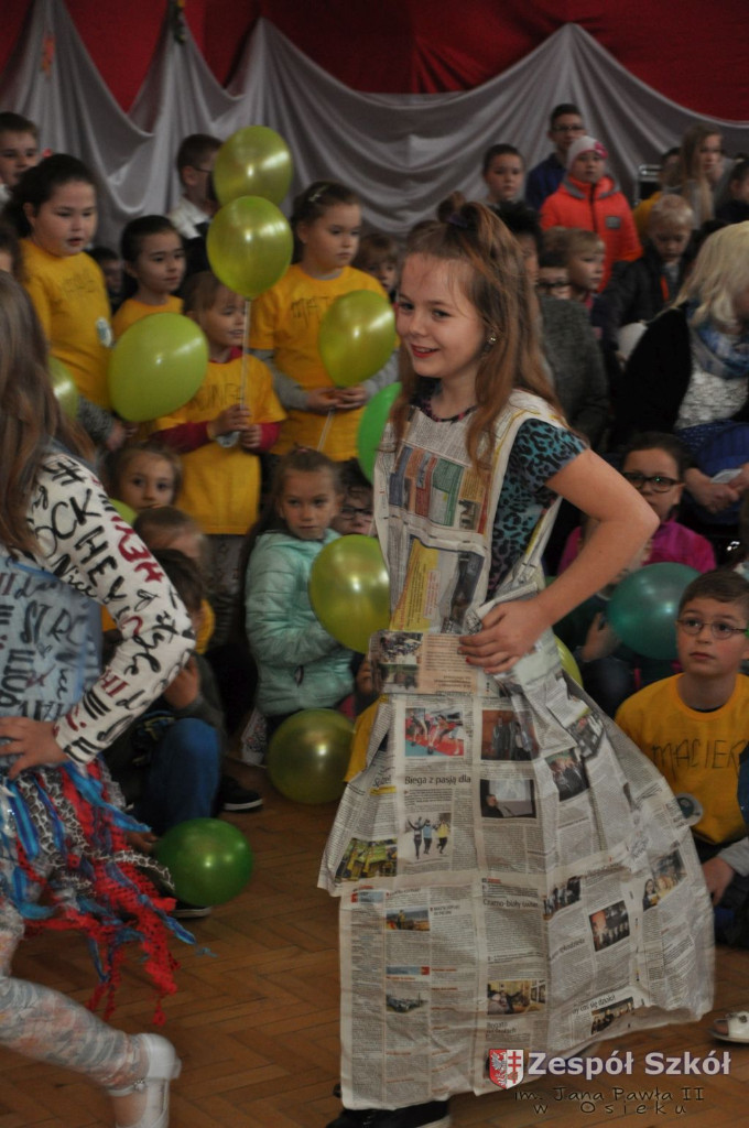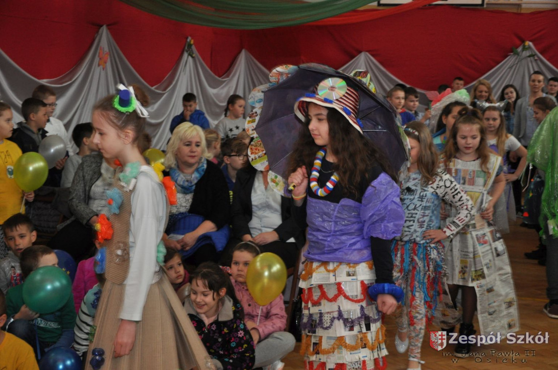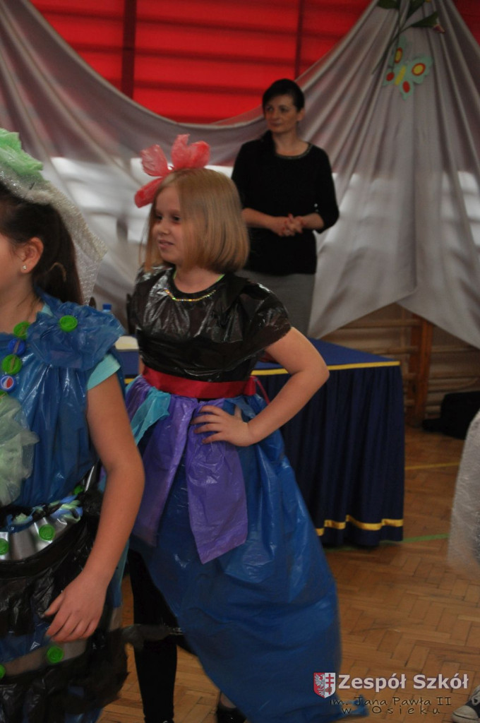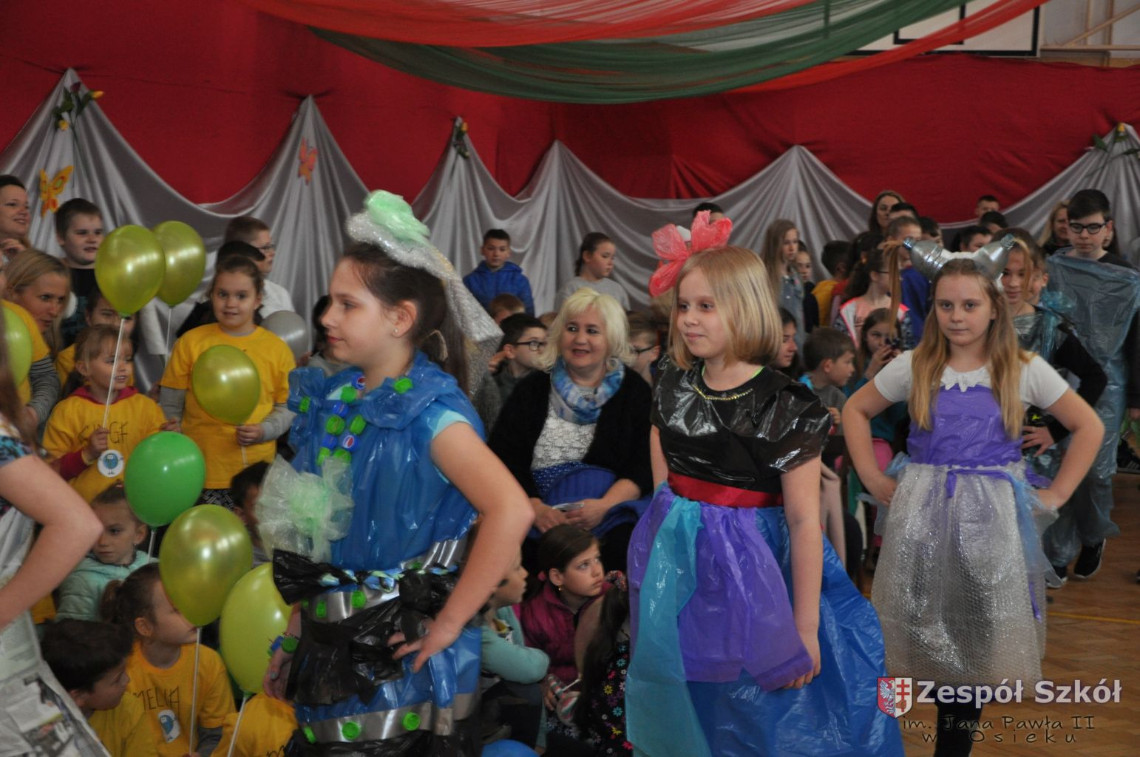 Po happeningu, w Miejsko-Gminnym Ośrodku Kultury odbyły się występy o charakterze artystyczno – rozrywkowym w wykonaniu uczniów klas IV-VI PSP w Osieku. Uczniowie naszej szkoły pięknie zaprezentowali się wykonując piosenki o tematyce ekologicznej i zsynchronizowany taniec grupowy. Największą atrakcją był Pokaz Mody Ekologicznej. Piękne, oryginalne stroje z surowców wtórnych zaprojektowane przez samych uczniów, zachwycały publiczność. Kreacje wykonane były z materiałów odpadowych – butelek, gazet, reklamówek, korków, papieru, worków na śmieci, itp. Modelki i modele prezentowali kolekcję mody ekologicznej w rytm muzyki. Zaprezentowane kreacje były naprawdę wyjątkowe, a dzieci w rolach modelek i modeli sprawdzili się doskonale! Gorący aplauz ze strony widowni był najlepszą nagrodą za pracę włożoną w wykonanie strojów oraz ich prezentację na scenie.