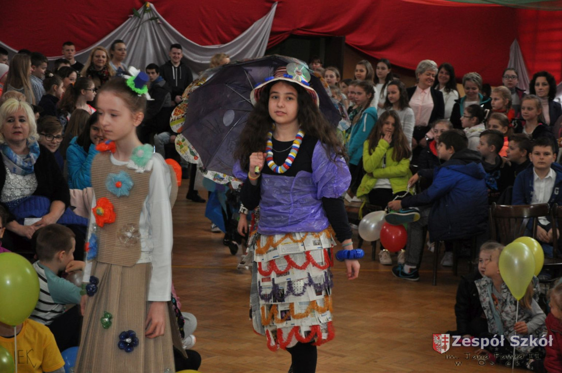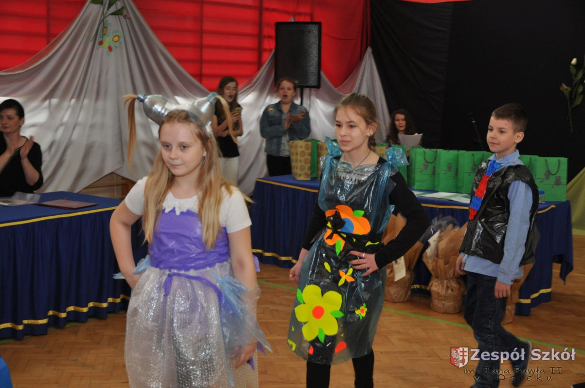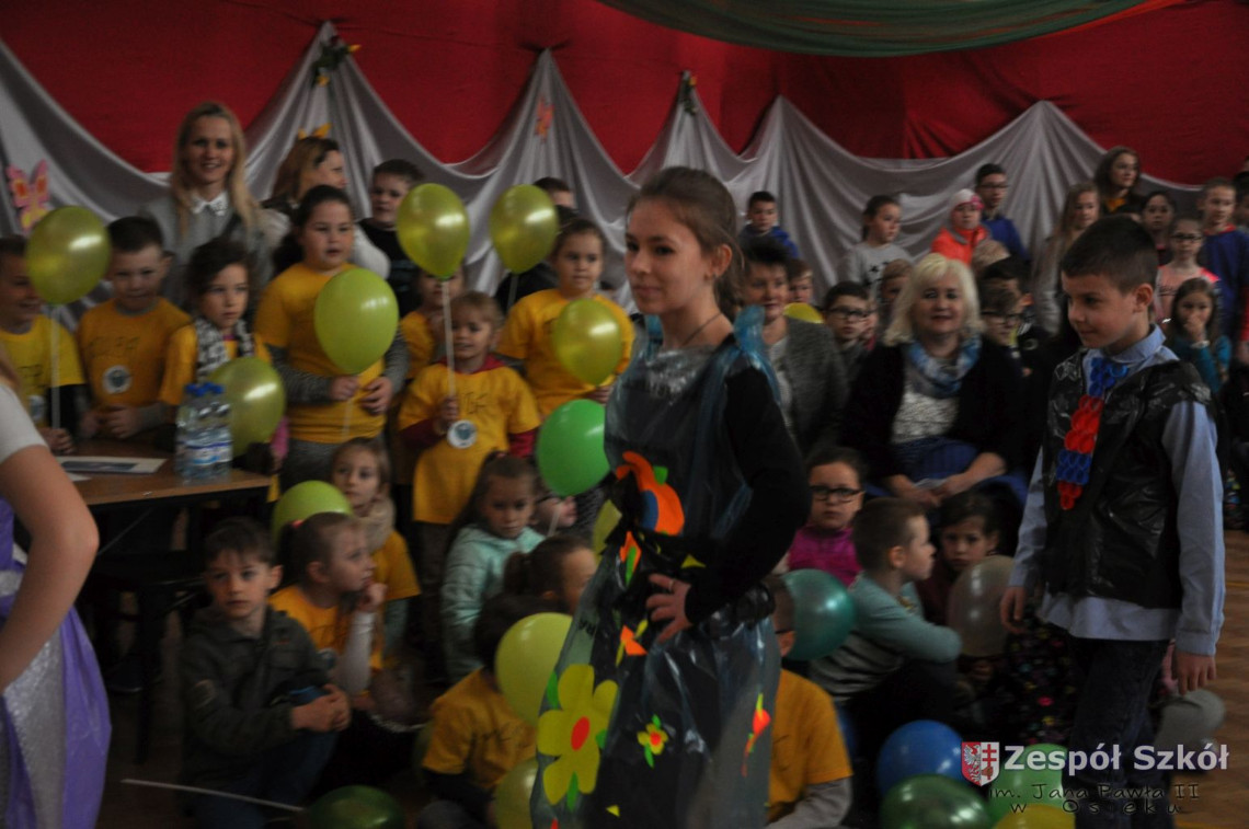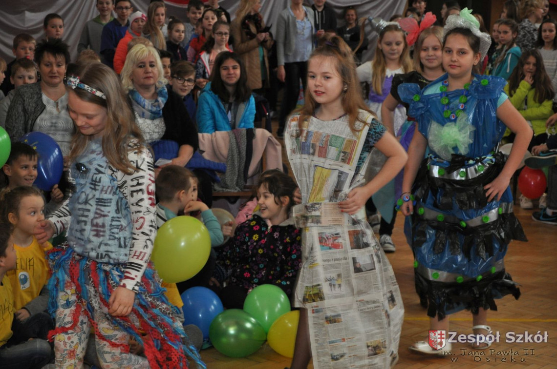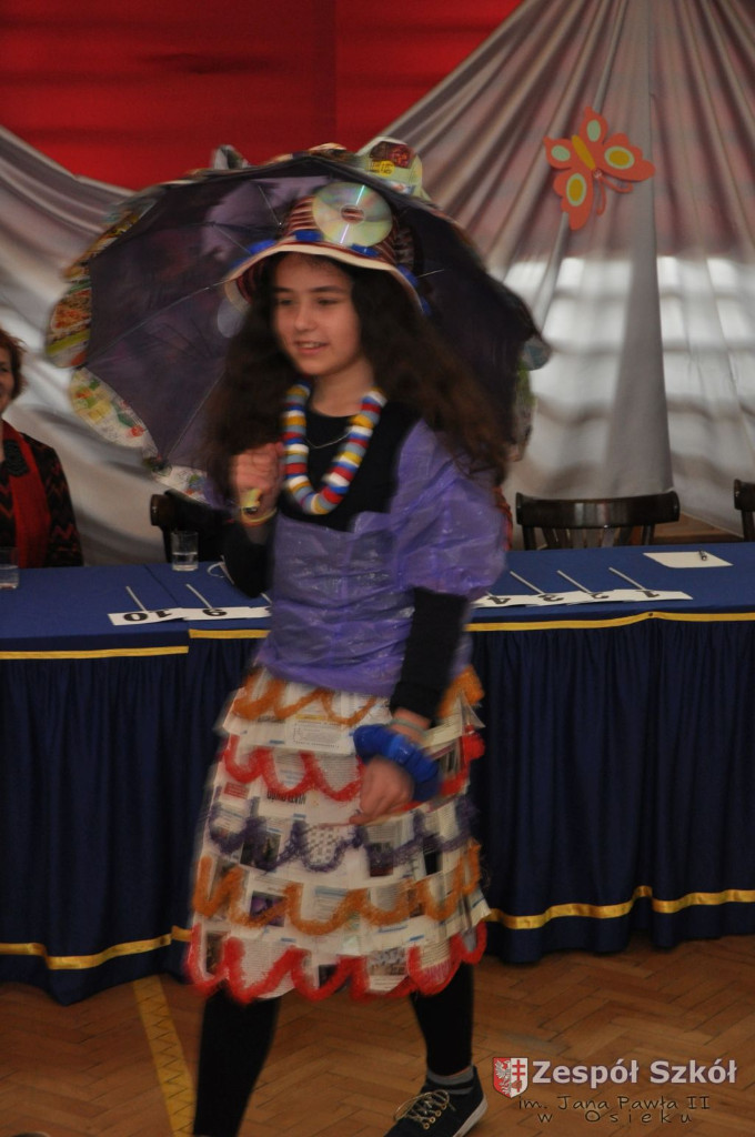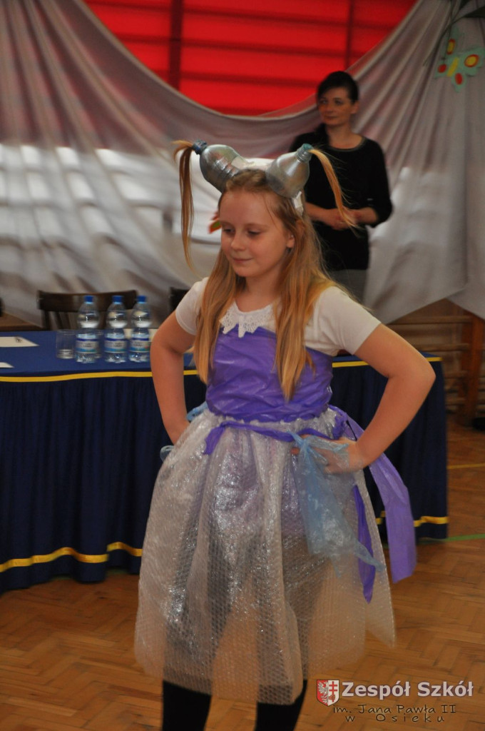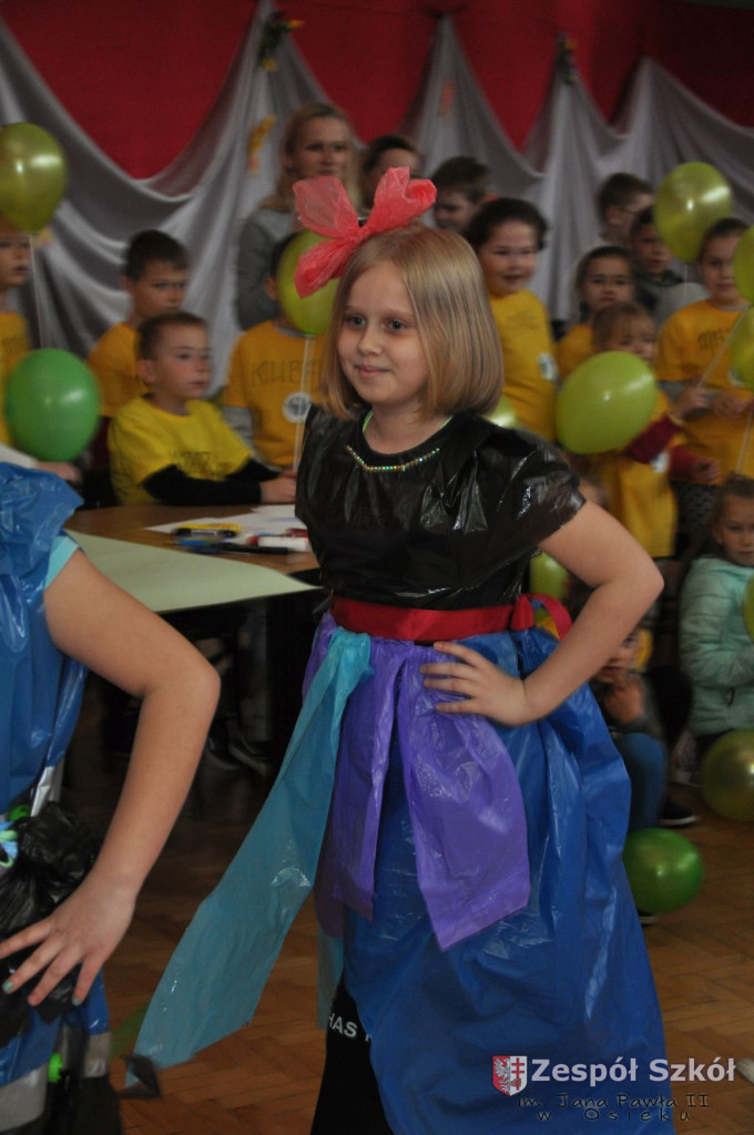 Po happeningu, w Miejsko-Gminnym Ośrodku Kultury odbyły się występy o charakterze artystyczno – rozrywkowym w wykonaniu uczniów klas IV-VI PSP w Osieku. Uczniowie naszej szkoły pięknie zaprezentowali się wykonując piosenki o tematyce ekologicznej i zsynchronizowany taniec grupowy. Największą atrakcją był Pokaz Mody Ekologicznej. Piękne, oryginalne stroje z surowców wtórnych zaprojektowane przez samych uczniów, zachwycały publiczność. Kreacje wykonane były z materiałów odpadowych – butelek, gazet, reklamówek, korków, papieru, worków na śmieci, itp. Modelki i modele prezentowali kolekcję mody ekologicznej w rytm muzyki. Zaprezentowane kreacje były naprawdę wyjątkowe, a dzieci w rolach modelek i modeli sprawdzili się doskonale! Gorący aplauz ze strony widowni był najlepszą nagrodą za pracę włożoną w wykonanie strojów oraz ich prezentację na scenie.