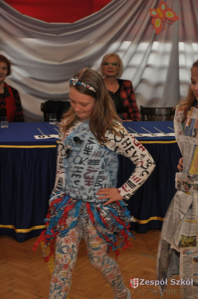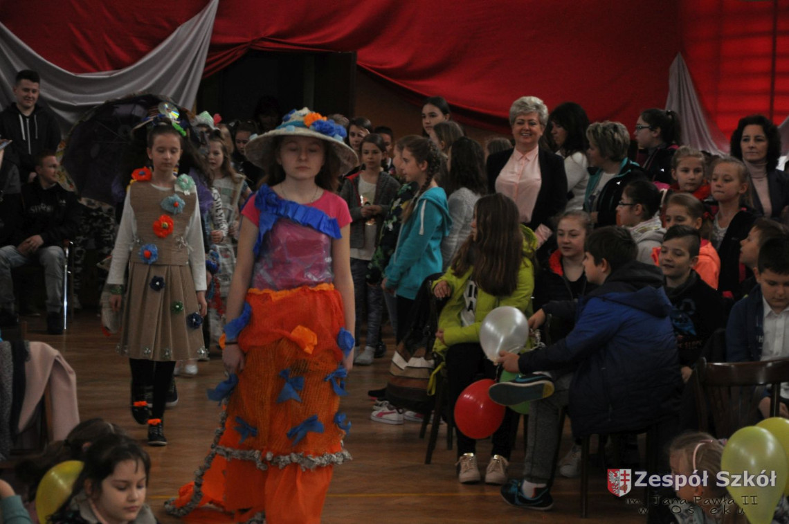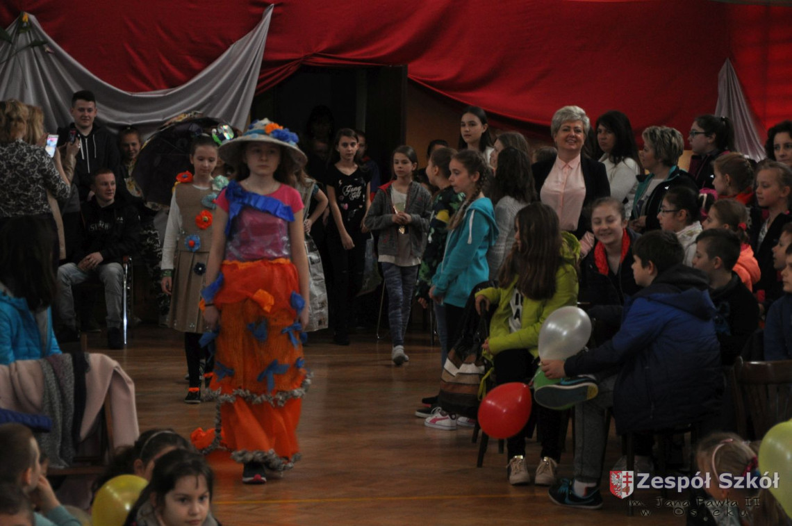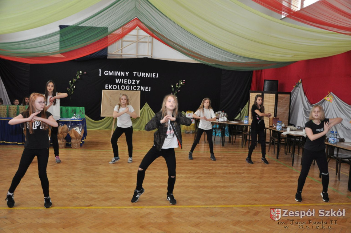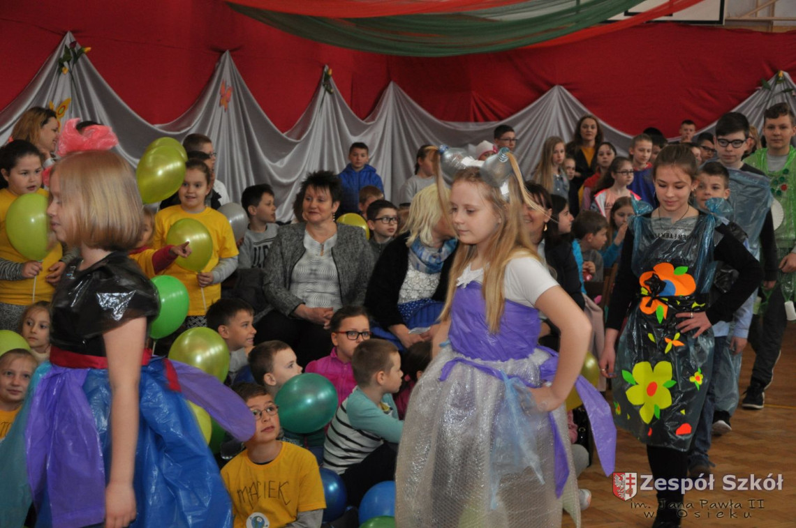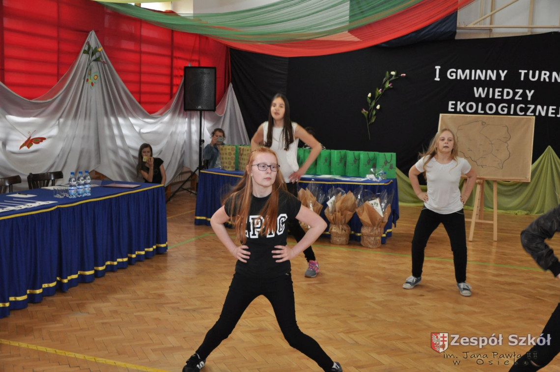 Po happeningu, w Miejsko-Gminnym Ośrodku Kultury odbyły się występy o charakterze artystyczno – rozrywkowym w wykonaniu uczniów klas IV-VI PSP w Osieku. Uczniowie naszej szkoły pięknie zaprezentowali się wykonując piosenki o tematyce ekologicznej i zsynchronizowany taniec grupowy. Największą atrakcją był Pokaz Mody Ekologicznej. Piękne, oryginalne stroje z surowców wtórnych zaprojektowane przez samych uczniów, zachwycały publiczność. Kreacje wykonane były z materiałów odpadowych – butelek, gazet, reklamówek, korków, papieru, worków na śmieci, itp. Modelki i modele prezentowali kolekcję mody ekologicznej w rytm muzyki. Zaprezentowane kreacje były naprawdę wyjątkowe, a dzieci w rolach modelek i modeli sprawdzili się doskonale! Gorący aplauz ze strony widowni był najlepszą nagrodą za pracę włożoną w wykonanie strojów oraz ich prezentację na scenie.