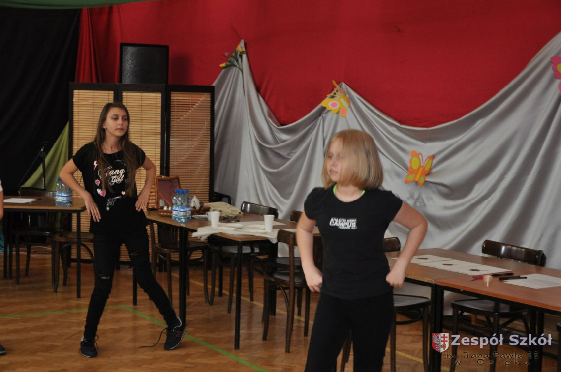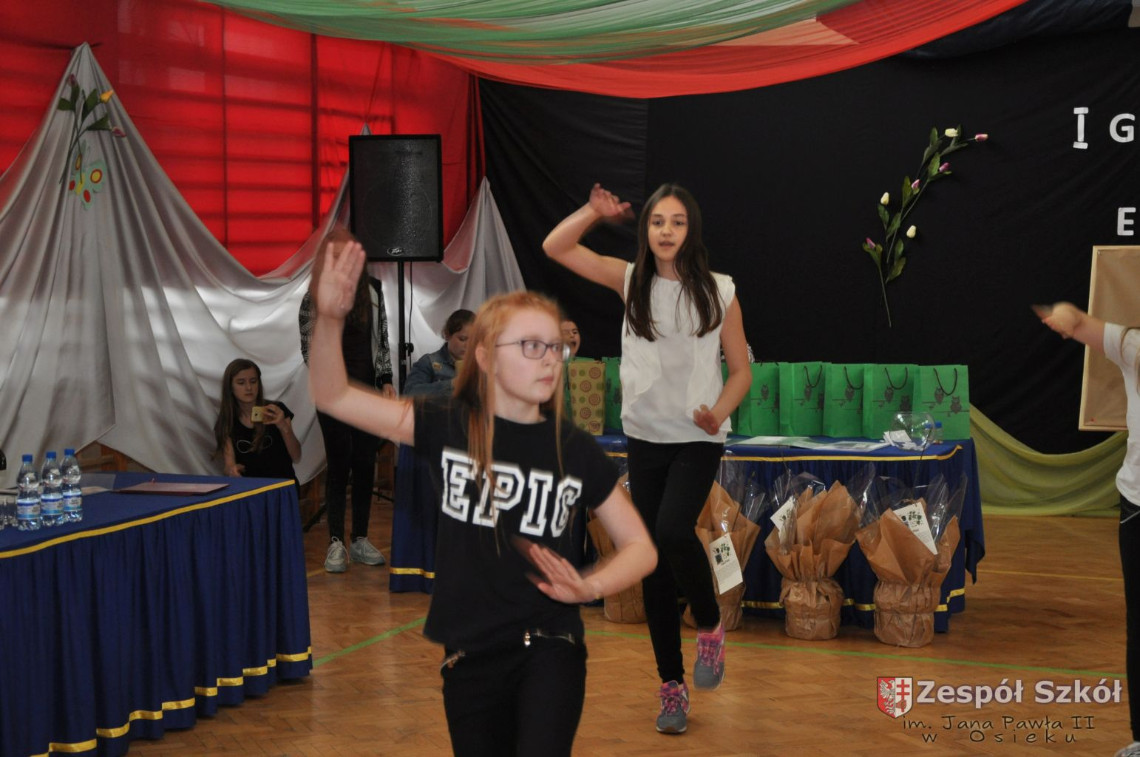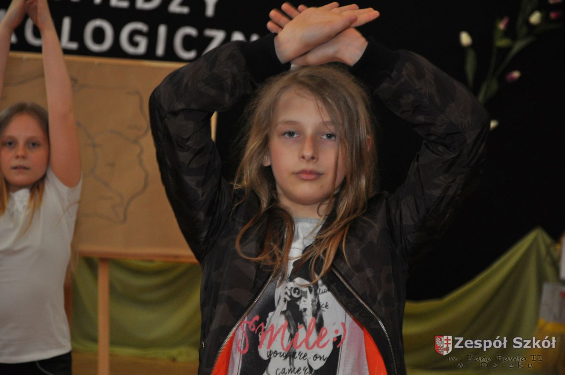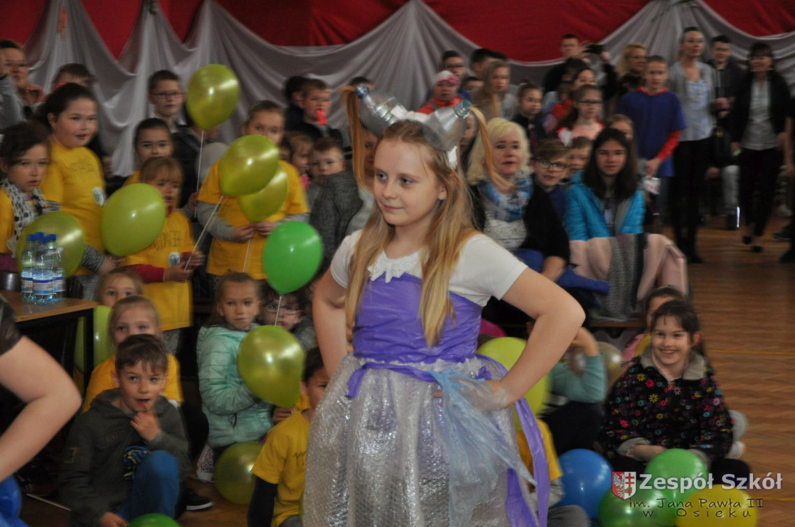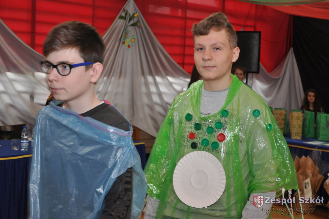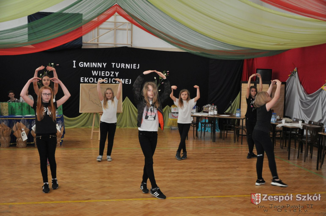 Po happeningu, w Miejsko-Gminnym Ośrodku Kultury odbyły się występy o charakterze artystyczno – rozrywkowym w wykonaniu uczniów klas IV-VI PSP w Osieku. Uczniowie naszej szkoły pięknie zaprezentowali się wykonując piosenki o tematyce ekologicznej i zsynchronizowany taniec grupowy. Największą atrakcją był Pokaz Mody Ekologicznej. Piękne, oryginalne stroje z surowców wtórnych zaprojektowane przez samych uczniów, zachwycały publiczność. Kreacje wykonane były z materiałów odpadowych – butelek, gazet, reklamówek, korków, papieru, worków na śmieci, itp. Modelki i modele prezentowali kolekcję mody ekologicznej w rytm muzyki. Zaprezentowane kreacje były naprawdę wyjątkowe, a dzieci w rolach modelek i modeli sprawdzili się doskonale! Gorący aplauz ze strony widowni był najlepszą nagrodą za pracę włożoną w wykonanie strojów oraz ich prezentację na scenie.