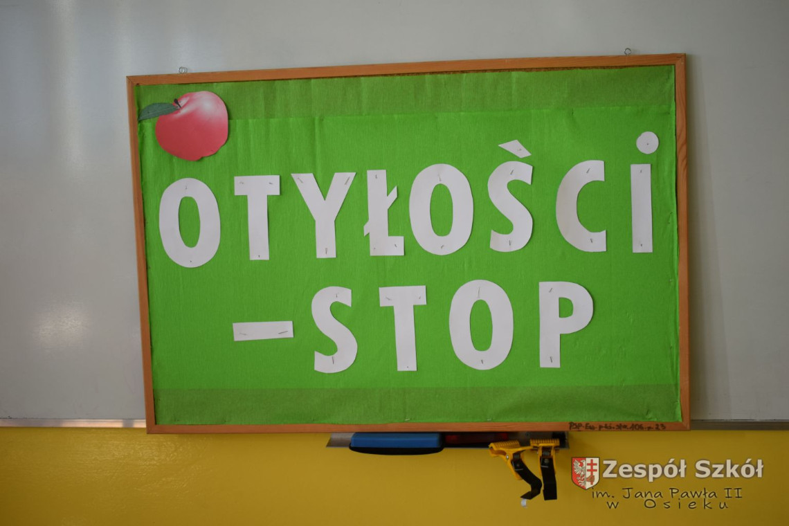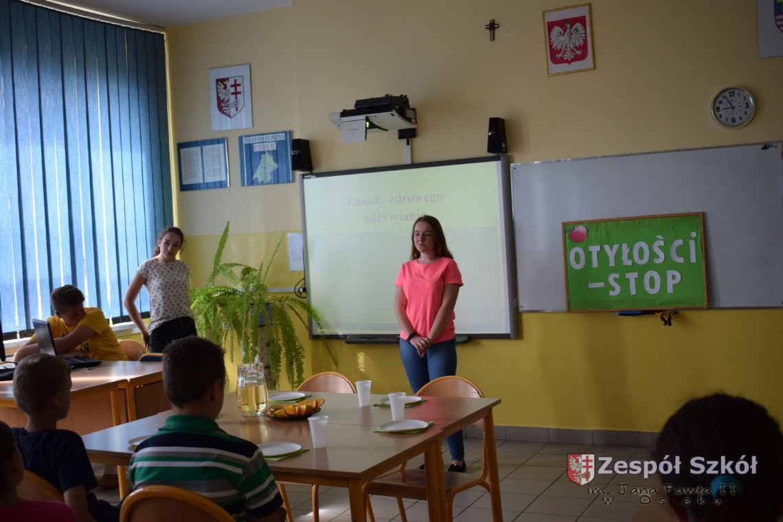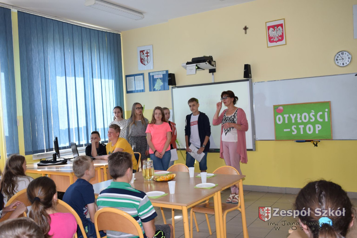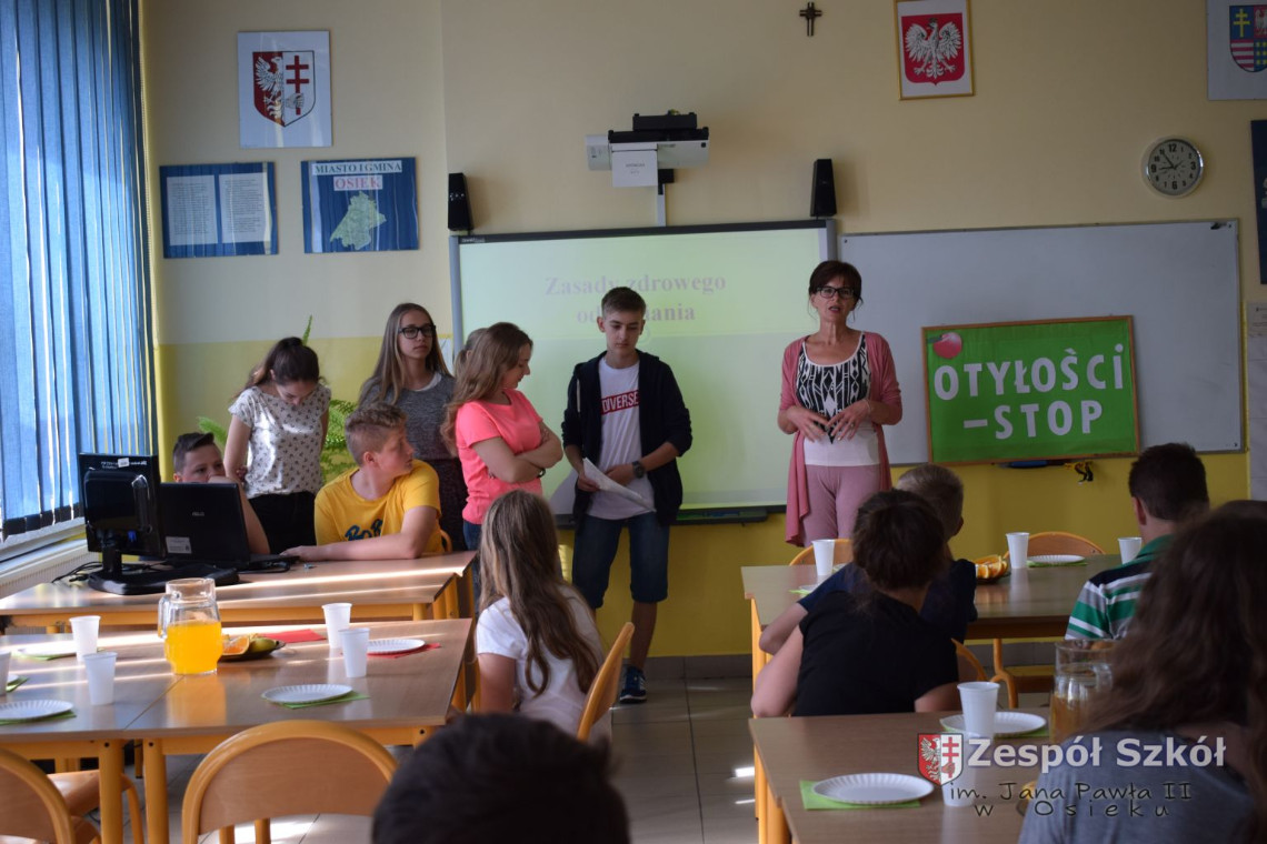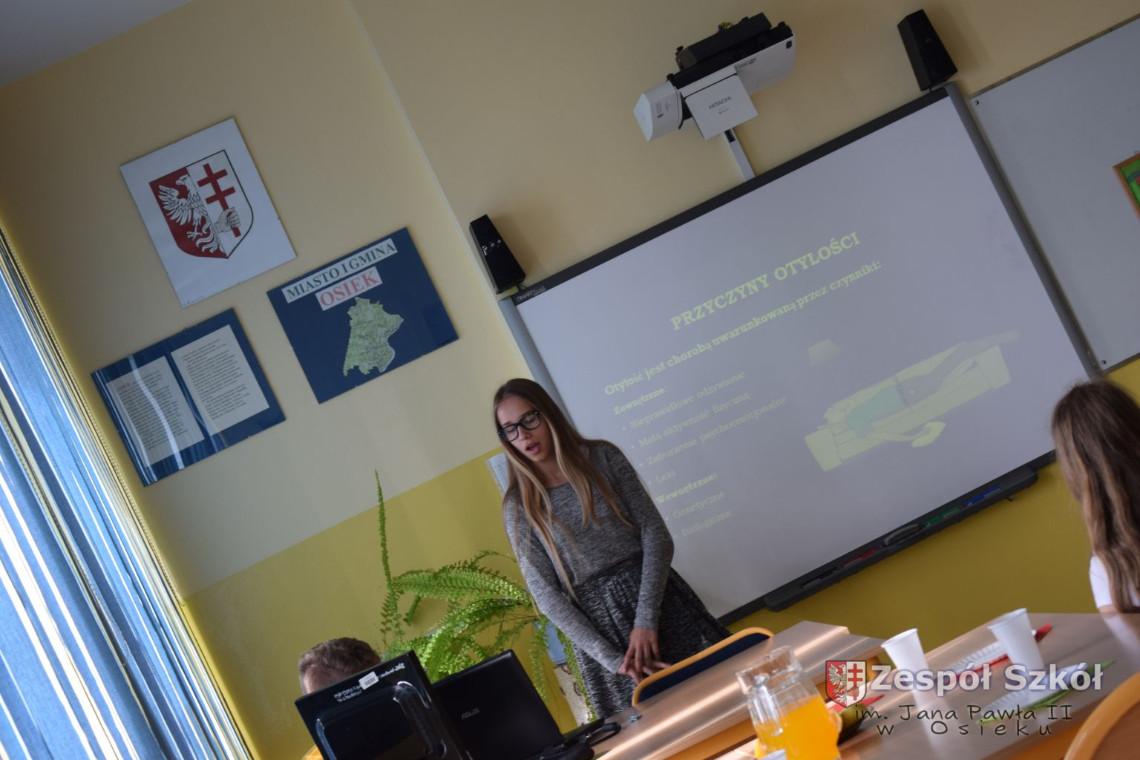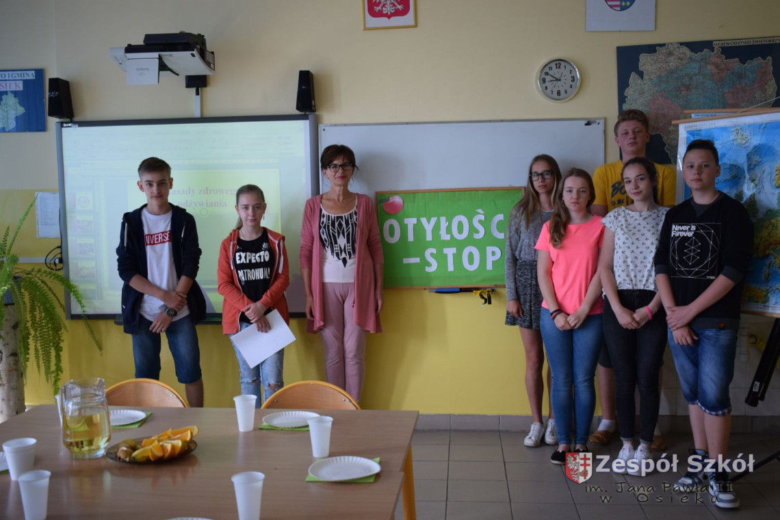 Grupa projektowa uczniów klasy IIa, IIb gimnazjum podzieliła się informacjami opracowanymi przez siebie na temat: Otyłości – Stop z uczniami klasy VI szkoły podstawowej. Przedstawili prezentację multimedialną, poster - promujące prawidłowe, zbilansowane odżywianie połączone z regularną aktywnością fizyczną, opracowali prawidłowe jadłospisy, przeprowadzili ankietę.