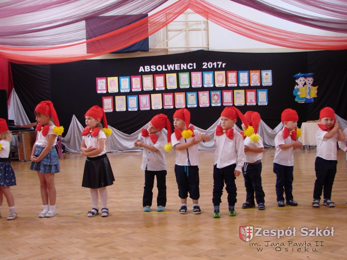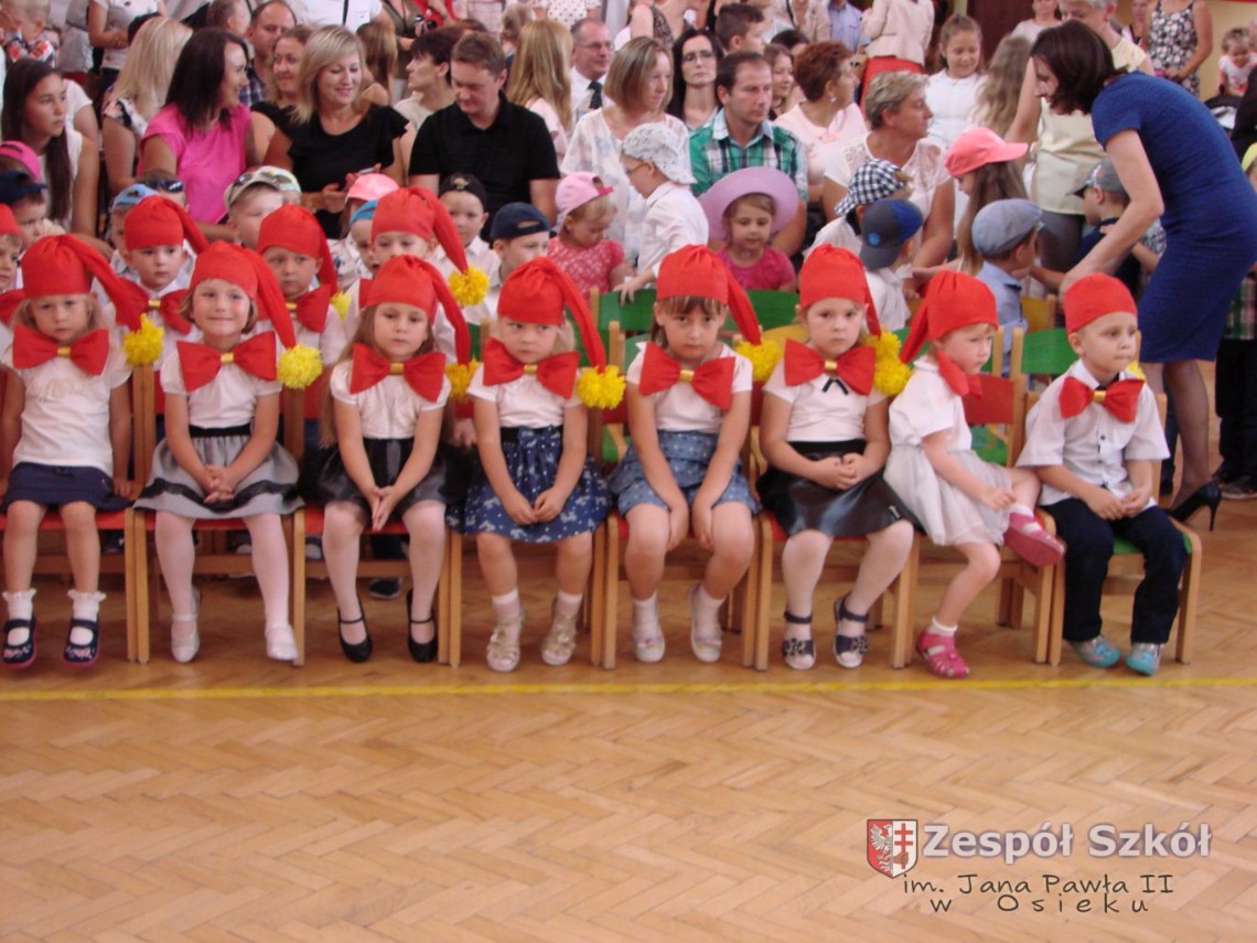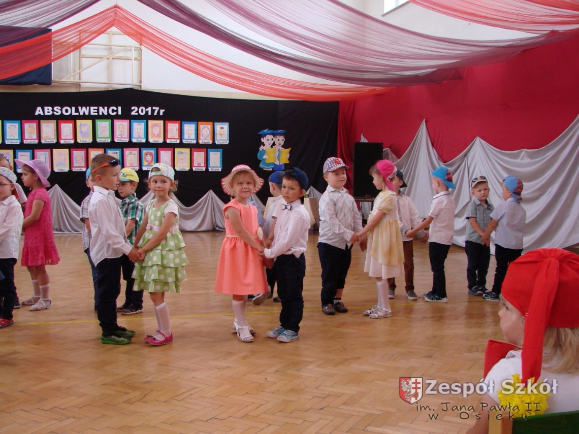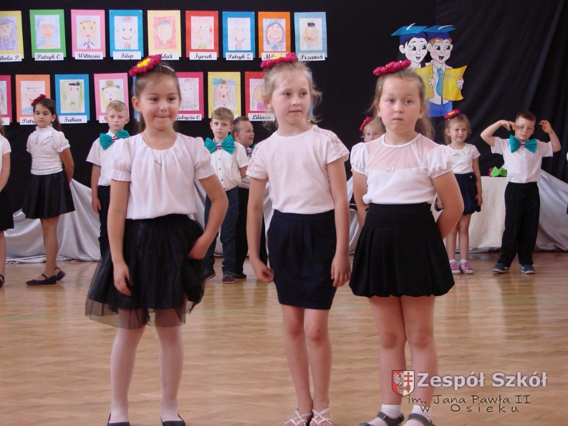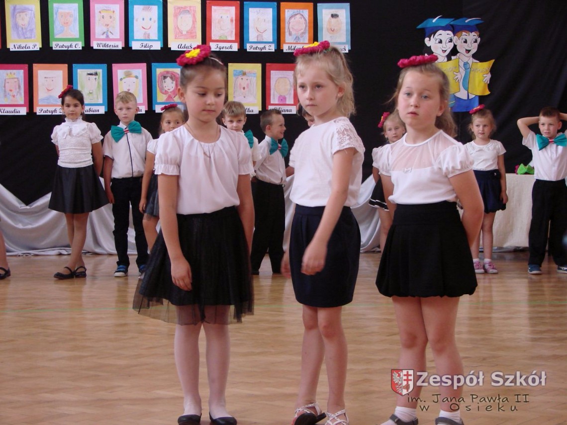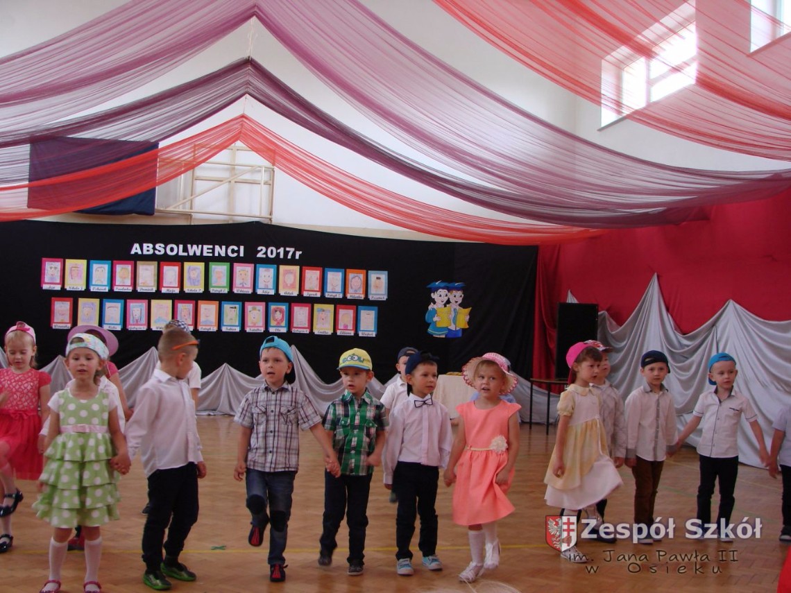 Uroczystość rozpoczęła dyrektor Zespołu Szkół im. Jana Pawła II Małgorzata Kunowska. Najstarsze dzieci 6- latki A i B przygotowane przez wychowawczynie Alicję Błąk i Magdalenę Kos przedstawiły pożegnalny program artystyczny, prezentując wiersze, tańce i piosenki. Dzieci 3,4,5 -letnie zaprezentowały układy wokalno- taneczne.
