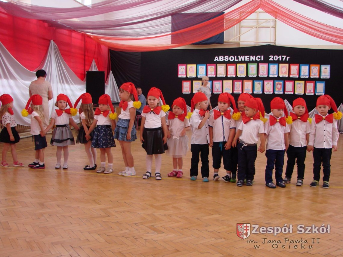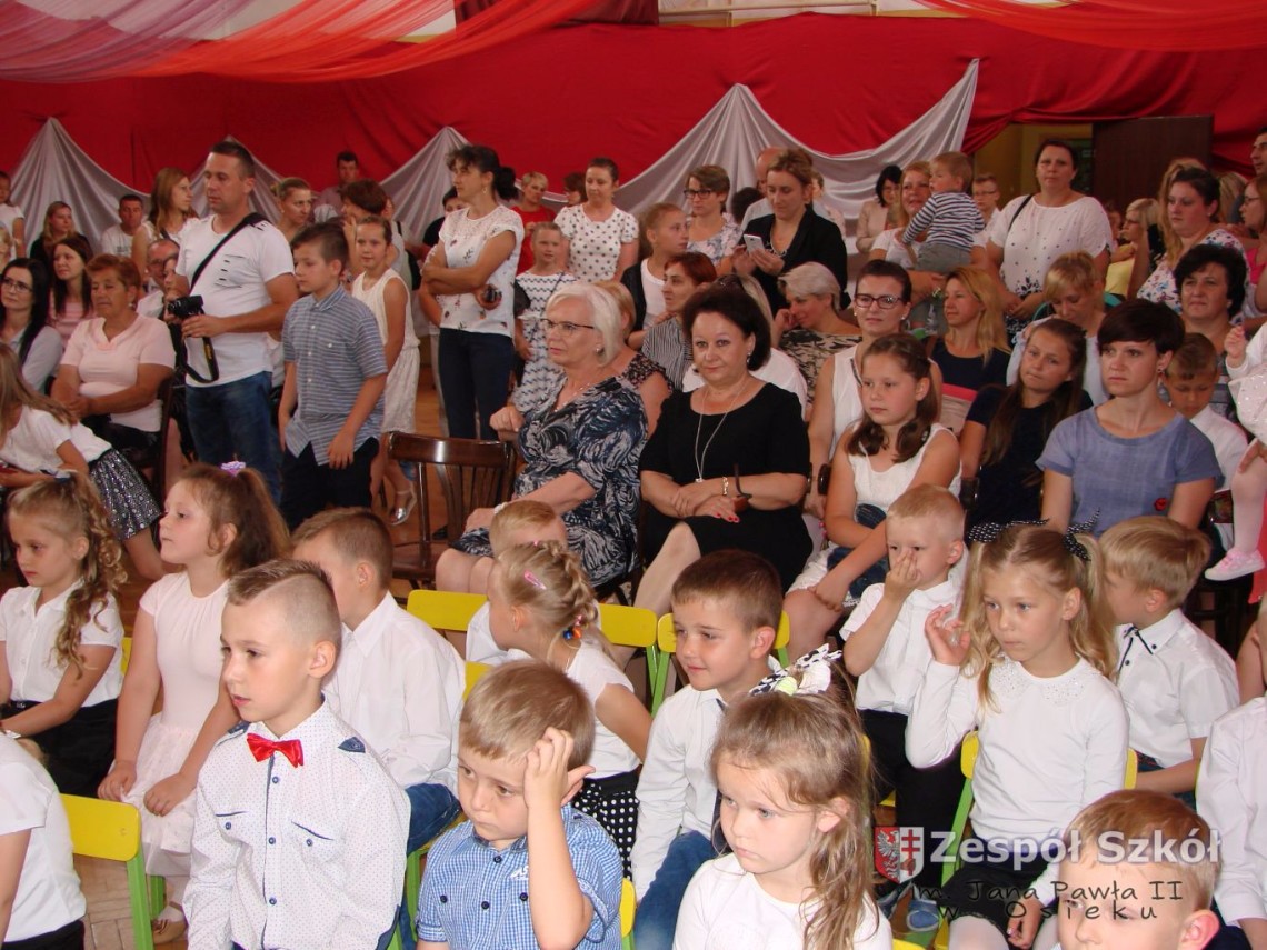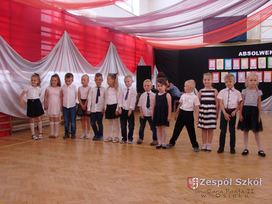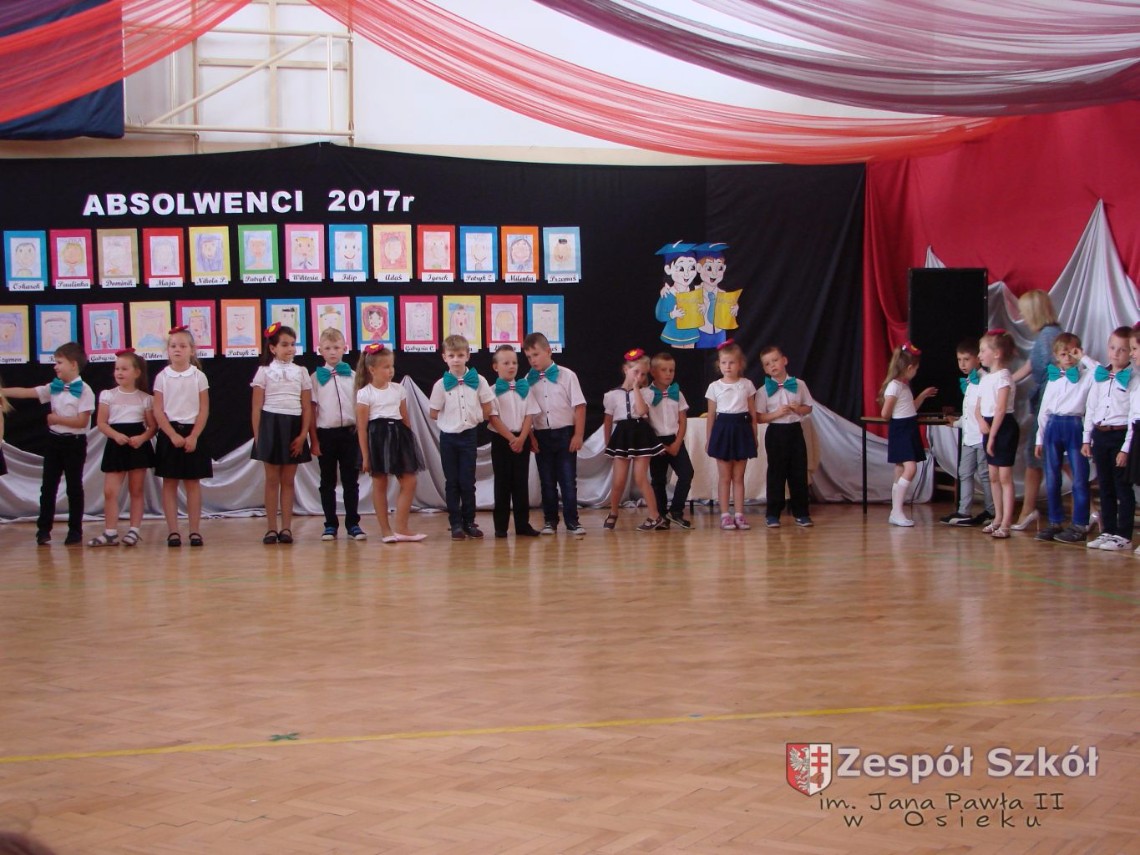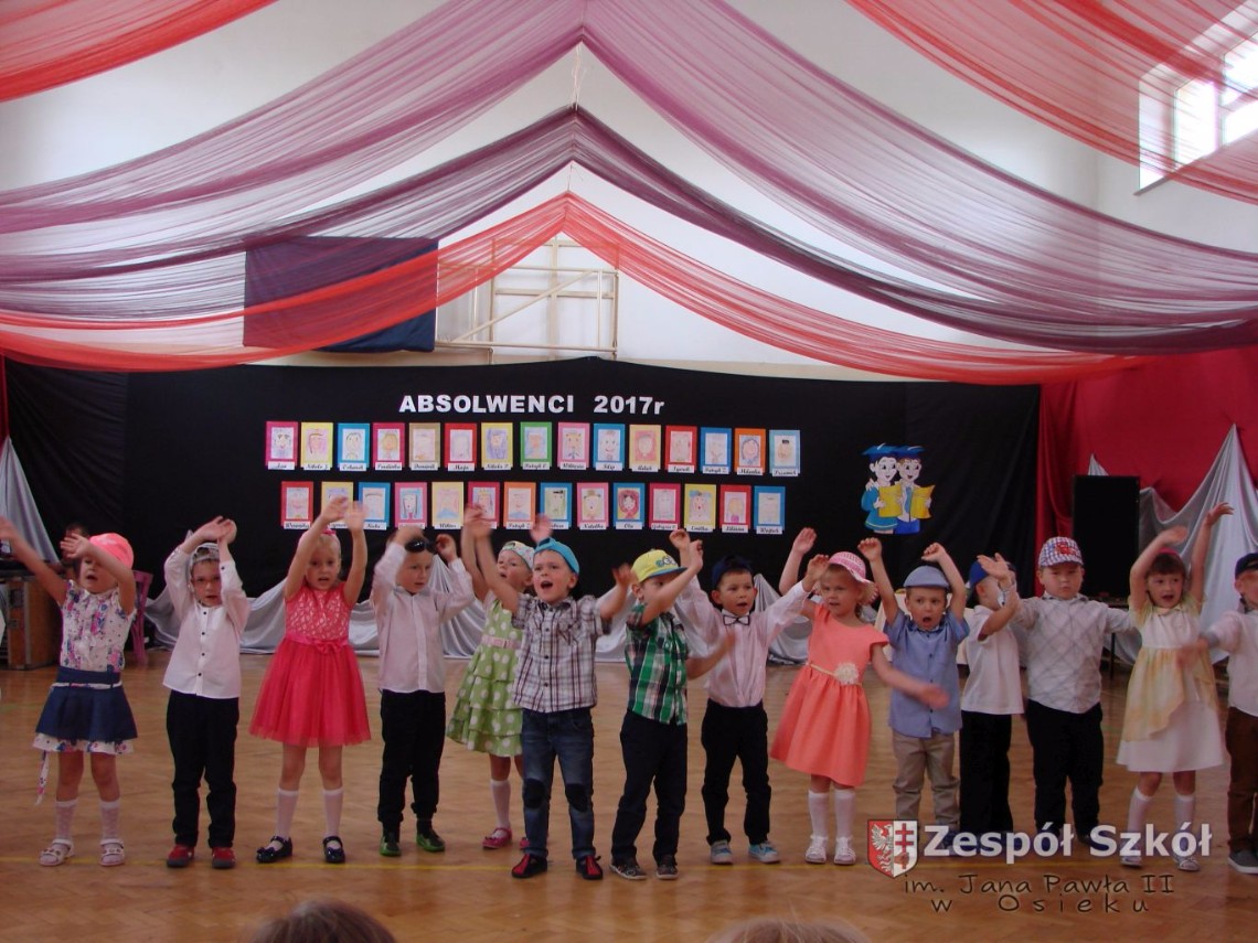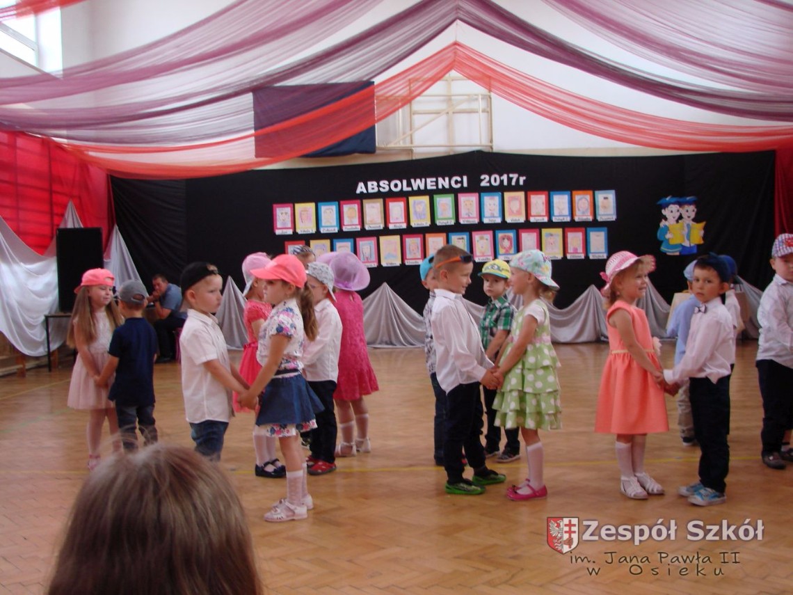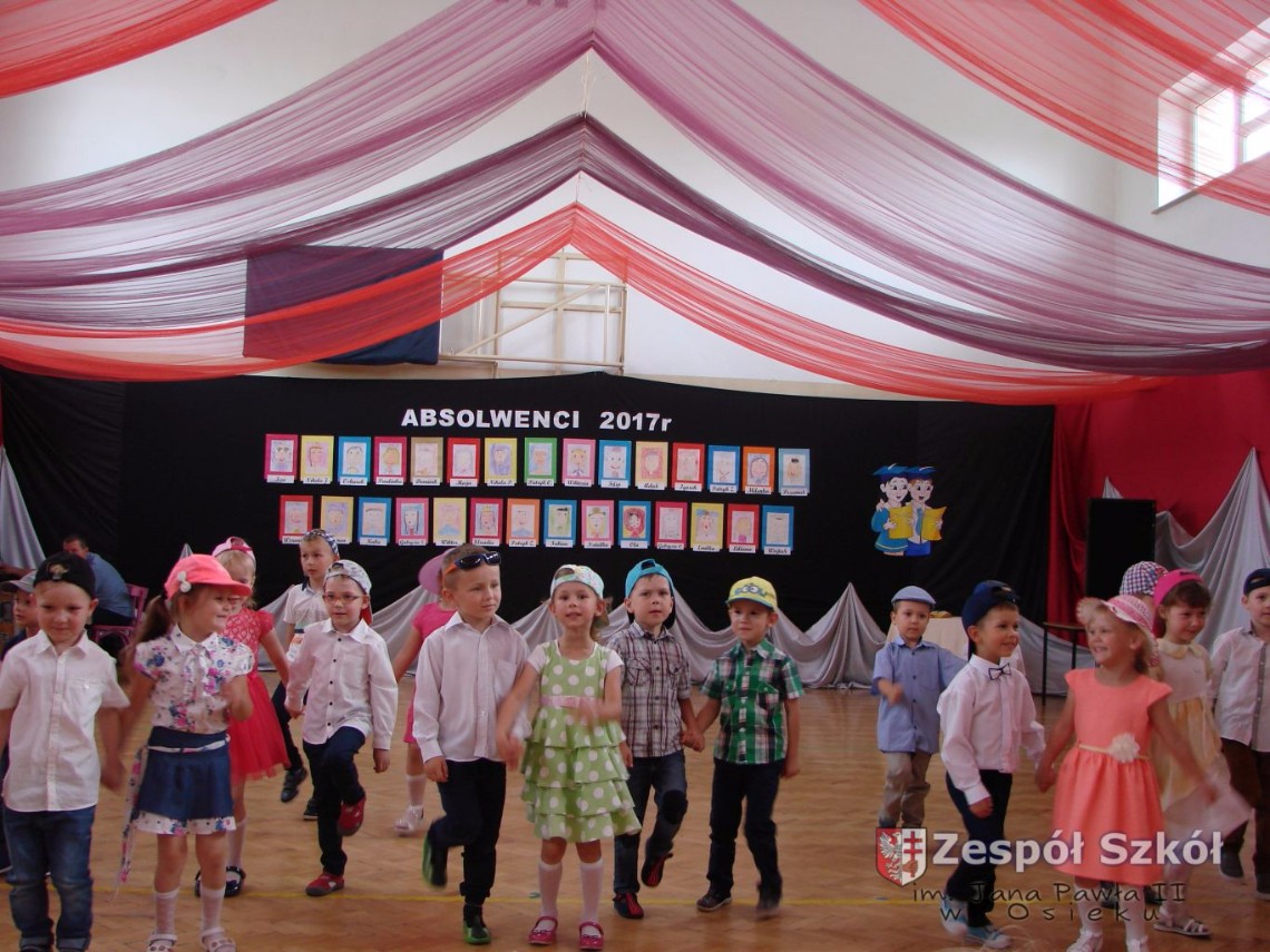 Uroczystość rozpoczęła dyrektor Zespołu Szkół im. Jana Pawła II Małgorzata Kunowska. Najstarsze dzieci 6- latki A i B przygotowane przez wychowawczynie Alicję Błąk i Magdalenę Kos przedstawiły pożegnalny program artystyczny, prezentując wiersze, tańce i piosenki. Dzieci 3,4,5 -letnie zaprezentowały układy wokalno- taneczne.