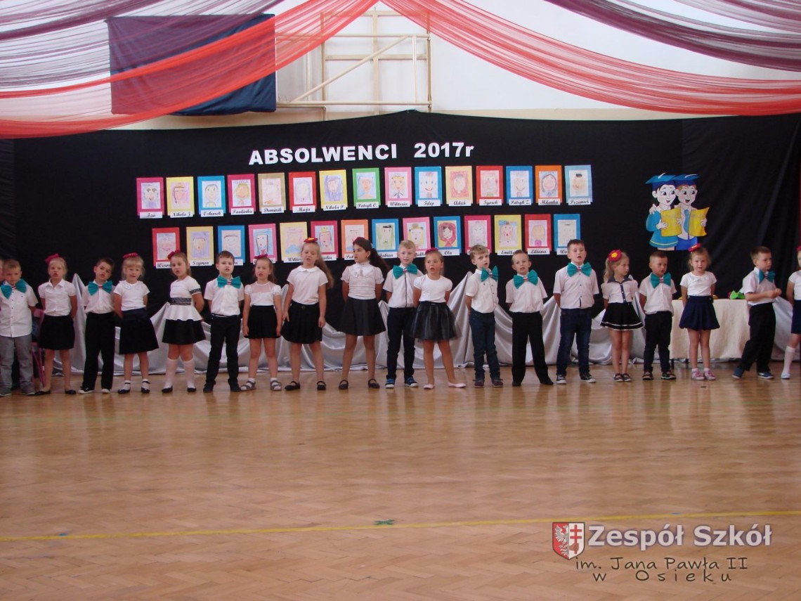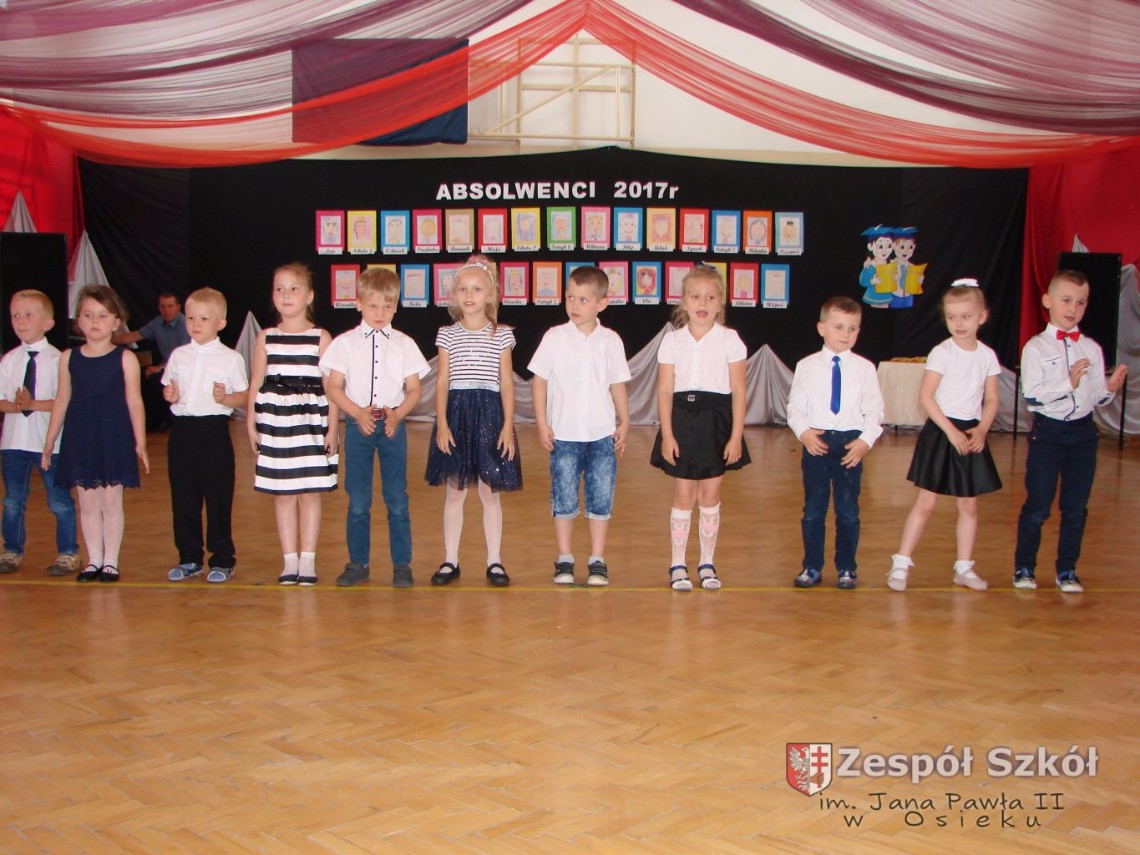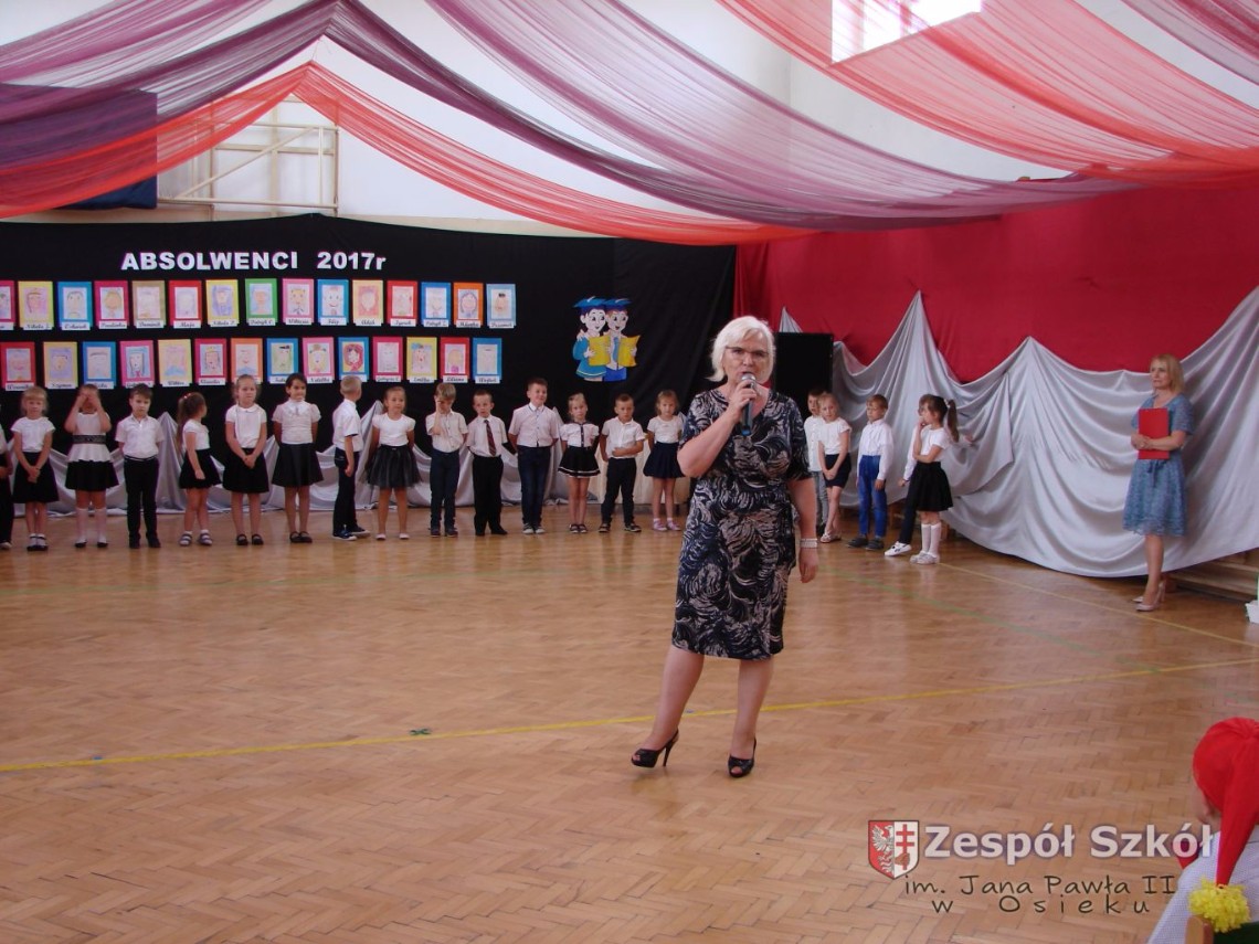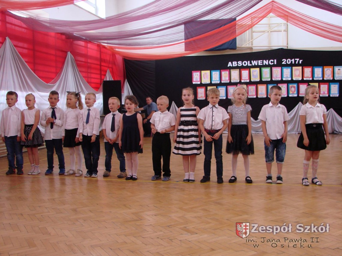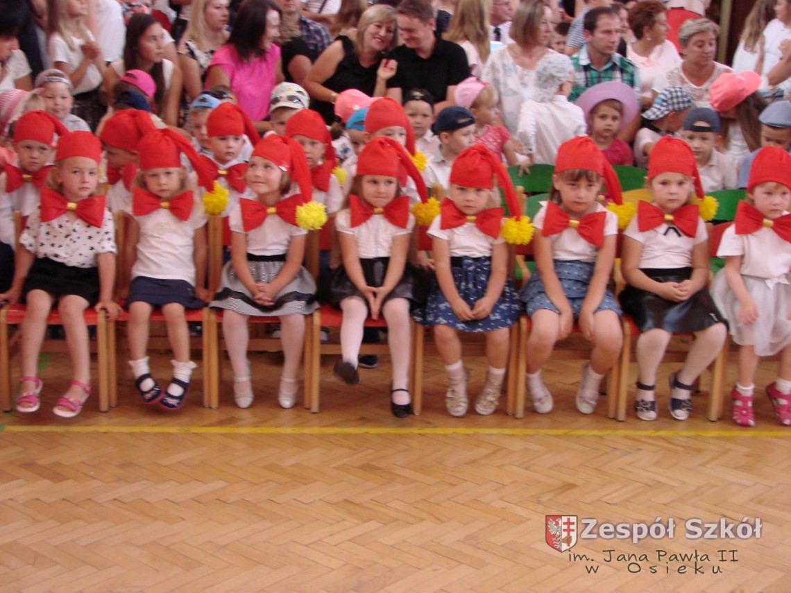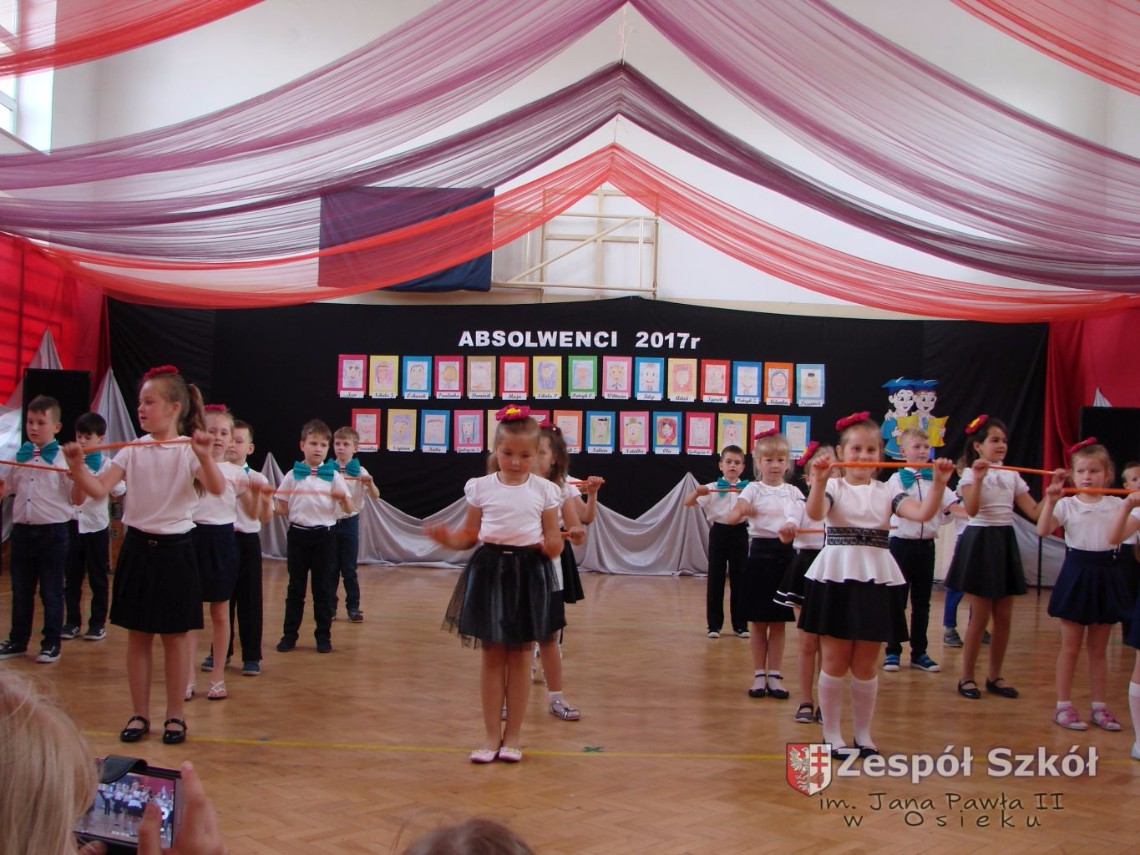 Uroczystość rozpoczęła dyrektor Zespołu Szkół im. Jana Pawła II Małgorzata Kunowska. Najstarsze dzieci 6- latki A i B przygotowane przez wychowawczynie Alicję Błąk i Magdalenę Kos przedstawiły pożegnalny program artystyczny, prezentując wiersze, tańce i piosenki. Dzieci 3,4,5 -letnie zaprezentowały układy wokalno- taneczne.
