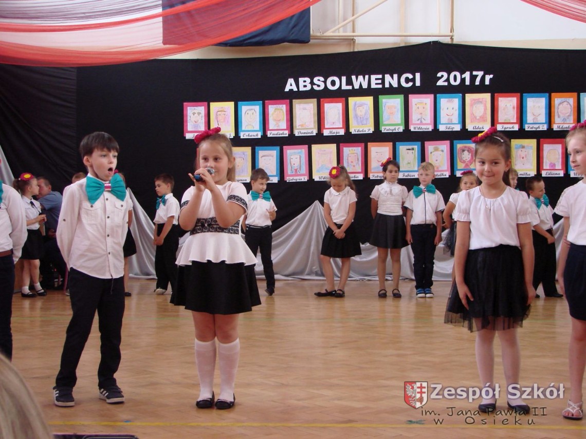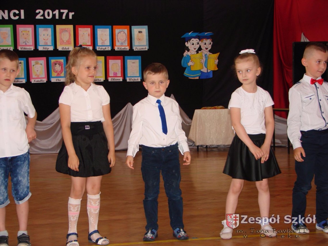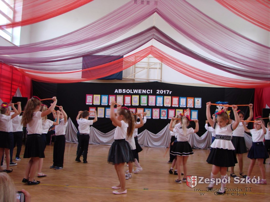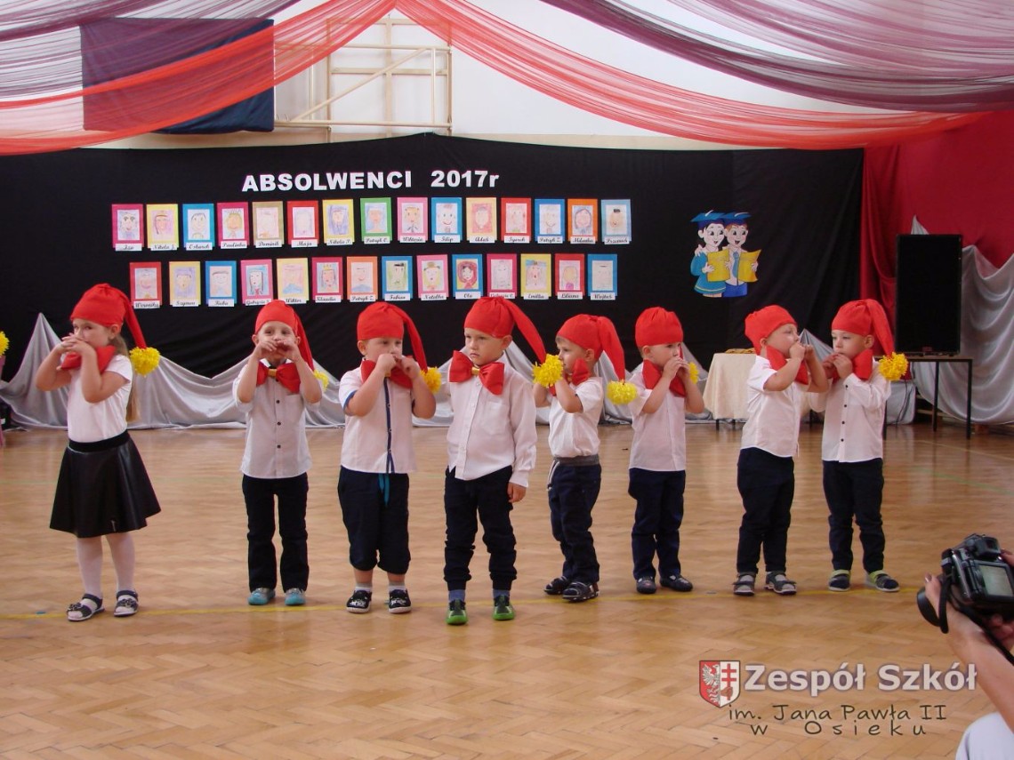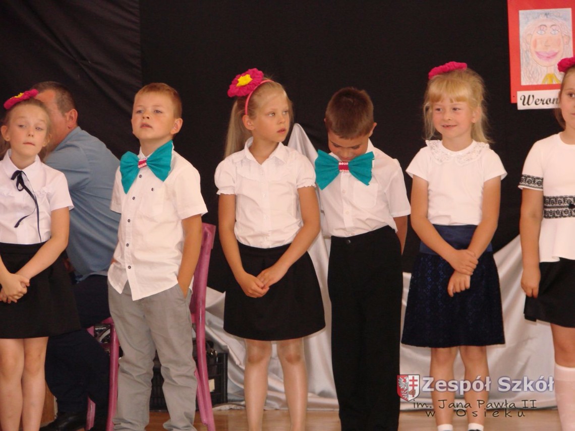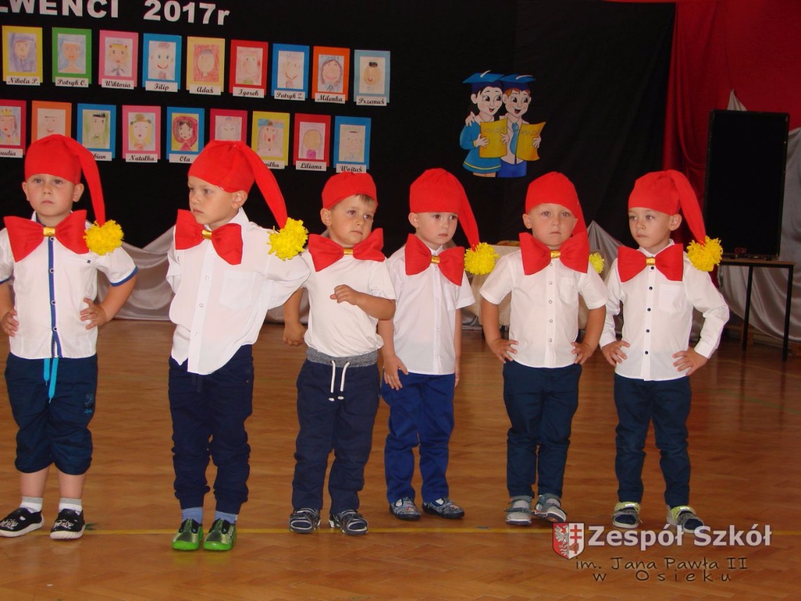 Uroczystość rozpoczęła dyrektor Zespołu Szkół im. Jana Pawła II Małgorzata Kunowska. Najstarsze dzieci 6- latki A i B przygotowane przez wychowawczynie Alicję Błąk i Magdalenę Kos przedstawiły pożegnalny program artystyczny, prezentując wiersze, tańce i piosenki. Dzieci 3,4,5 -letnie zaprezentowały układy wokalno- taneczne.