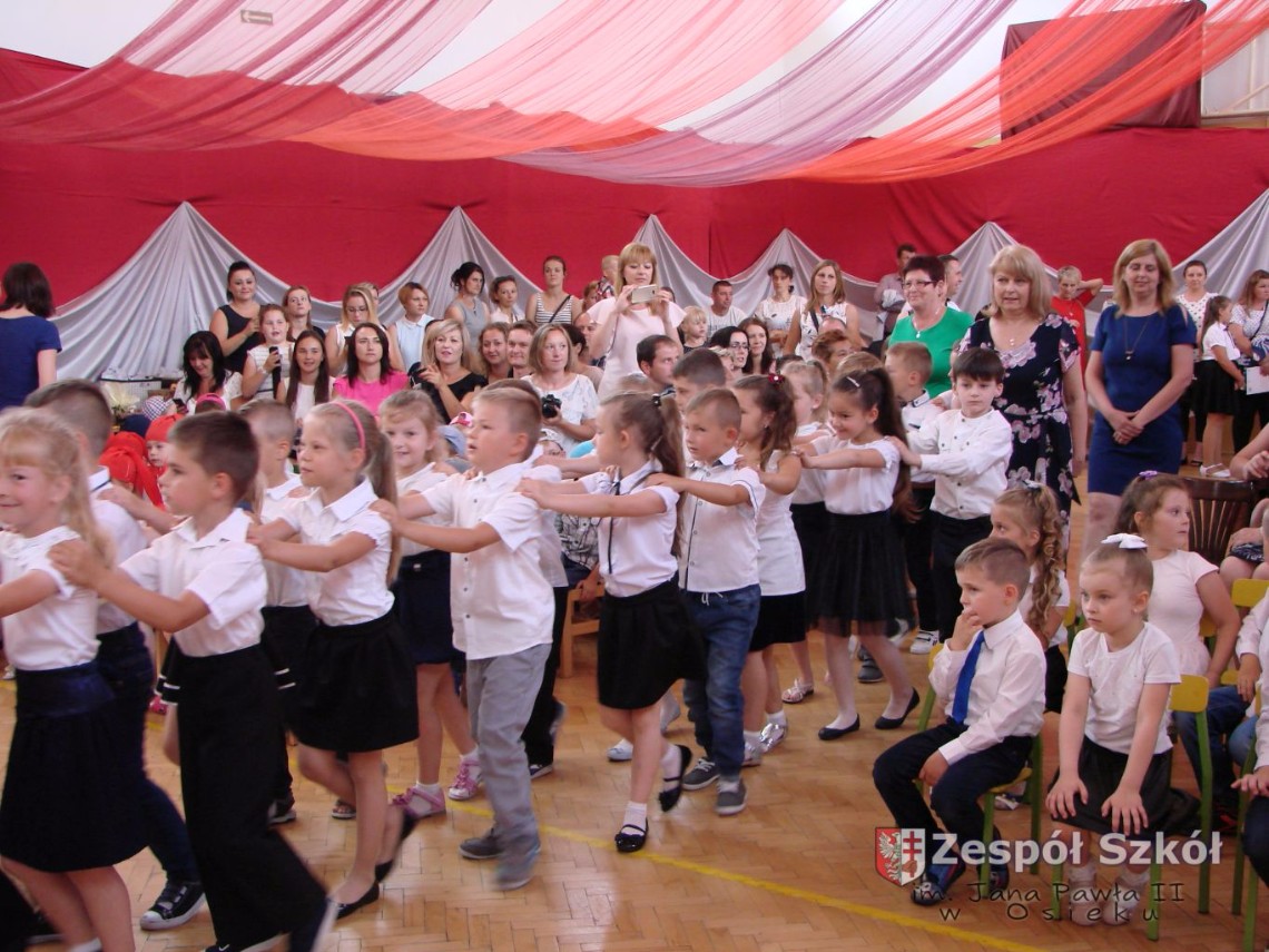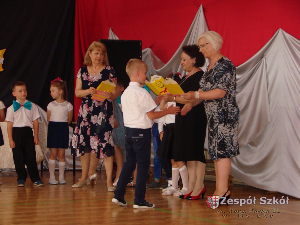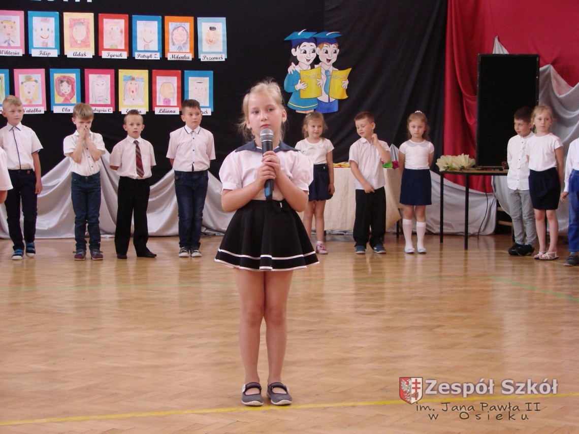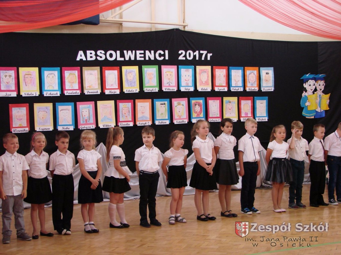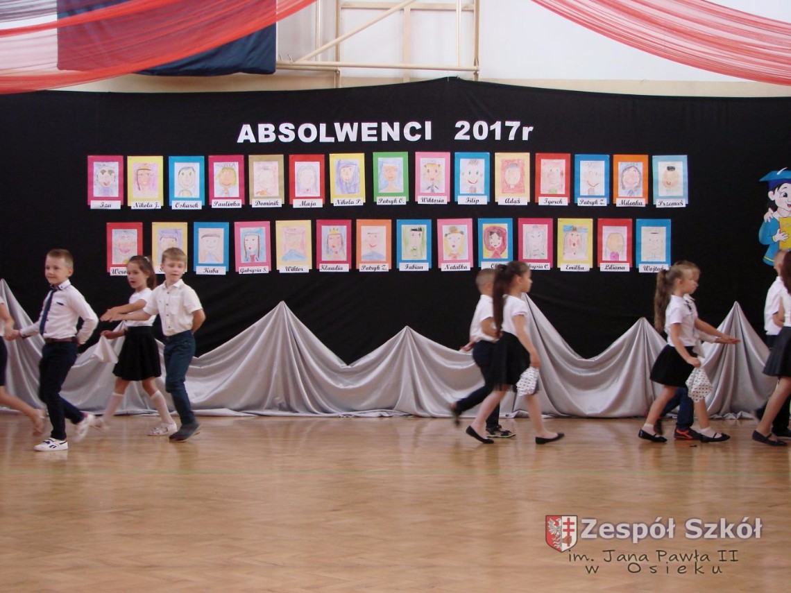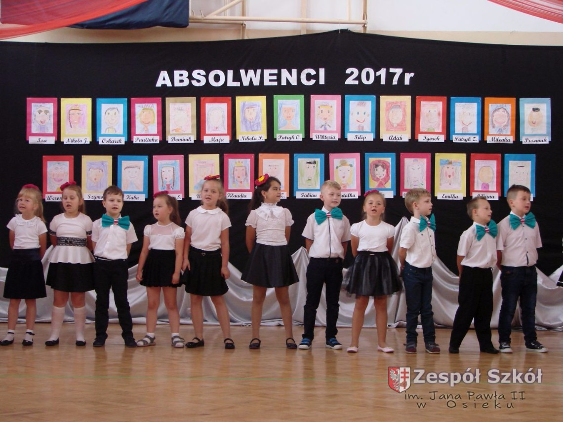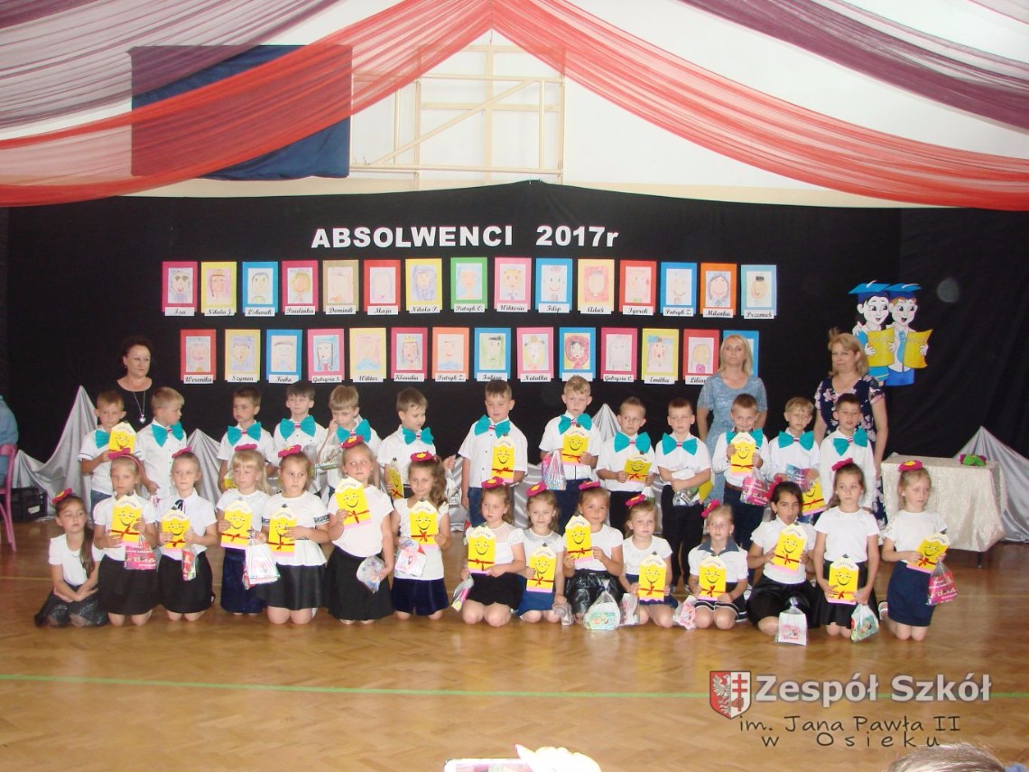 Uroczystość rozpoczęła dyrektor Zespołu Szkół im. Jana Pawła II Małgorzata Kunowska. Najstarsze dzieci 6- latki A i B przygotowane przez wychowawczynie Alicję Błąk i Magdalenę Kos przedstawiły pożegnalny program artystyczny, prezentując wiersze, tańce i piosenki. Dzieci 3,4,5 -letnie zaprezentowały układy wokalno- taneczne.